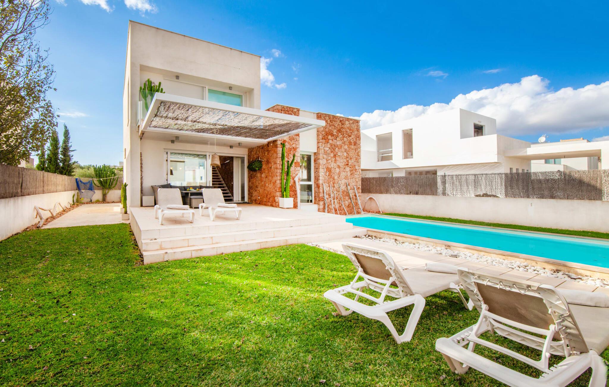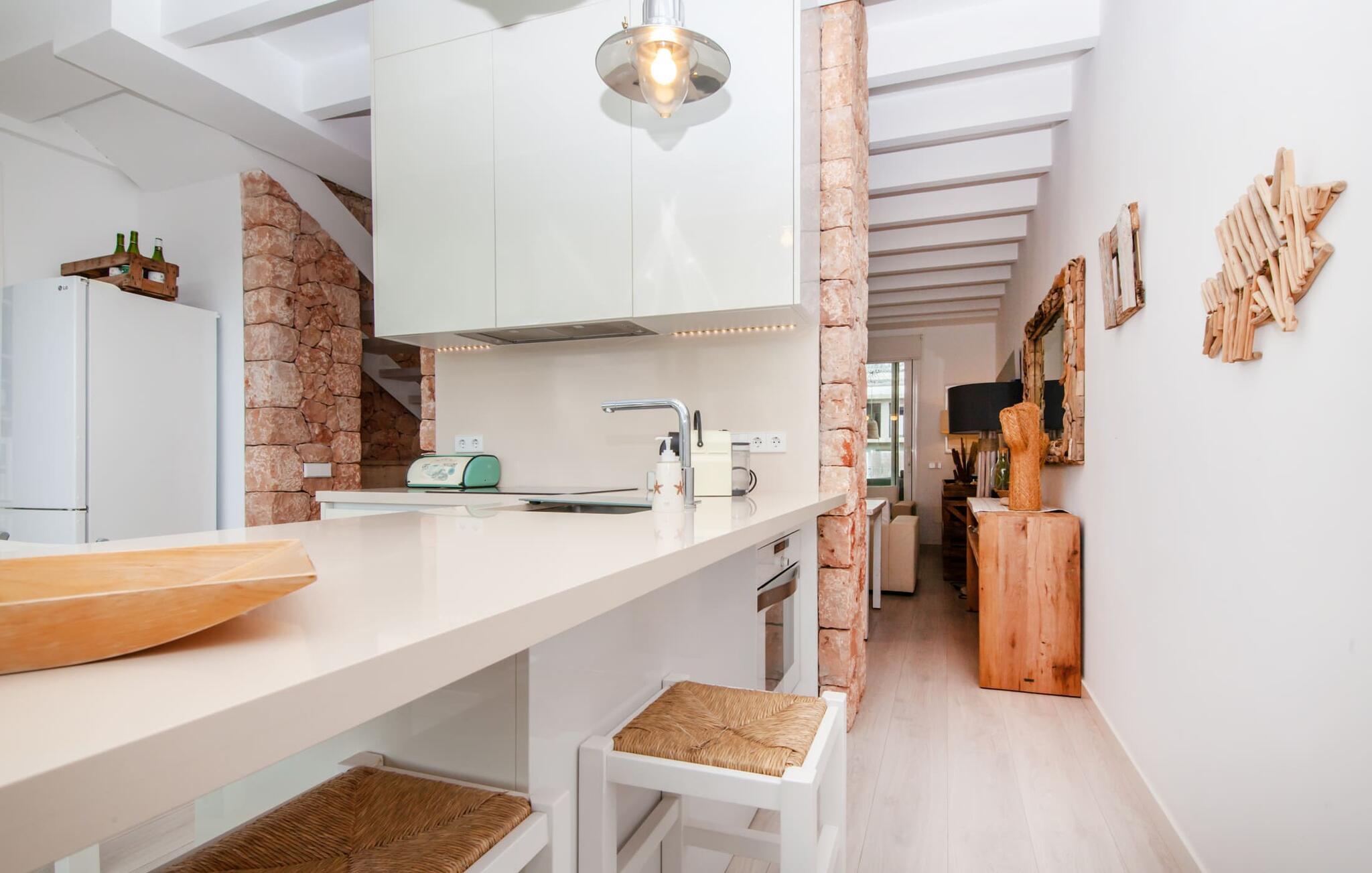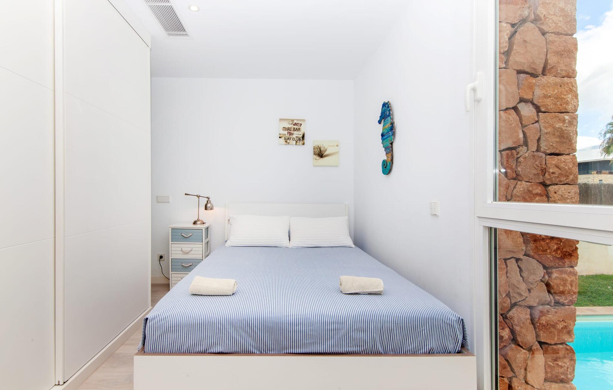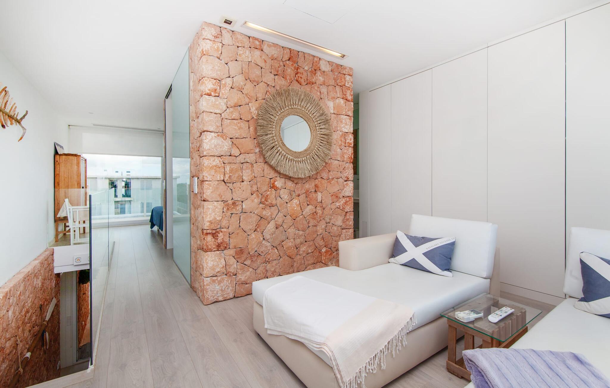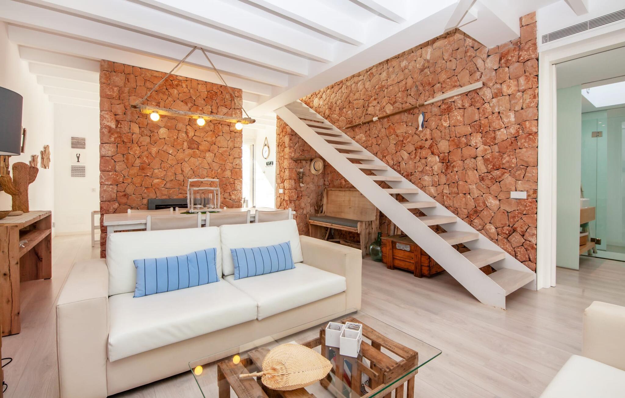 Denne kubeformede bondegård på Mallorca er et vidunderligt sted for ubekymrede ferier ved havet. Den umiddelbart iøjnefaldende tilbygning med naturstensfacade kendetegner det stilrene hjem, som sigter mod at være én ting frem for alt: Individuelt. Plæner og en væg med privatlivsskærme præger udendørsområdet, hvis centrum er den aflange pool. Det lover vidunderlig afkøling på varme dage og er meget let at nå via trapper. Komfortable liggestole fås til alle soldyrkere, som blot kan placeres på jeres yndlingssted, og hvorfra I kan nyde ferielivet i fulde drag. Den let hævede terrasse direkte ved huset har en indbydende chill-out lounge med udsigt til haven og poolen. På den anden side af huset byder en anden veranda på et tilsvarende hyggeligt sted, i dette tilfælde bekvemt placeret direkte foran køkkenet. Et originalt udtænkt og designet interiør byder jer velkommen, når I træder ind i den behageligt lyse villa "Can Bosquerro". Den solide, rødligt glitrende natursten fortsætter her og sætter både effektive og æstetiske accenter i rummenes vidunderlige maritime flair. Stue-spisestue og køkken smelter sammen i en halvåben planløsning, der skaber en flydende overgang mellem brugsområderne. Komfort og funktionalitet er lige vigtige. Alle mulige unikke detaljer forstærker denne individuelle, moderne atmosfære yderligere. To hyggelige soveværelser - et med dobbeltseng og et med køjeseng - samt et brusebad (installeret i det største af de to soveværelser) fuldender stueetagen. Den øverste etage er domineret af et rummeligt soveværelse med opholdsstue og privat badeværelse. Herfra har I udgang til den skønne altan, hvor jeres første kaffe om morgenen med sikkerhed smager lige så lækkert som en solnedgang. Denne villa på Mallorca er et sandt lykketræf for alle, der ønsker at tilbringe deres ferie tæt på stranden, æstetisk og af høj kvalitet. Dette æstetiske feriehus på Mallorca scorer med sin attraktive beliggenhed tæt ved havet - stranden og havnen ligger i gåafstand. Den originalt designede villa ligger desuden bekvemt direkte på en lille stille gade og er derfor ideelt forbundet med forskellige udflugtsmål. Sa Ràpita har en attraktiv infrastruktur med restauranter og indkøbsmuligheder. Nærheden til andre smukke strande, herunder Es Trenc eller Ses Covetes, afrunder beliggenhedsfordelene.