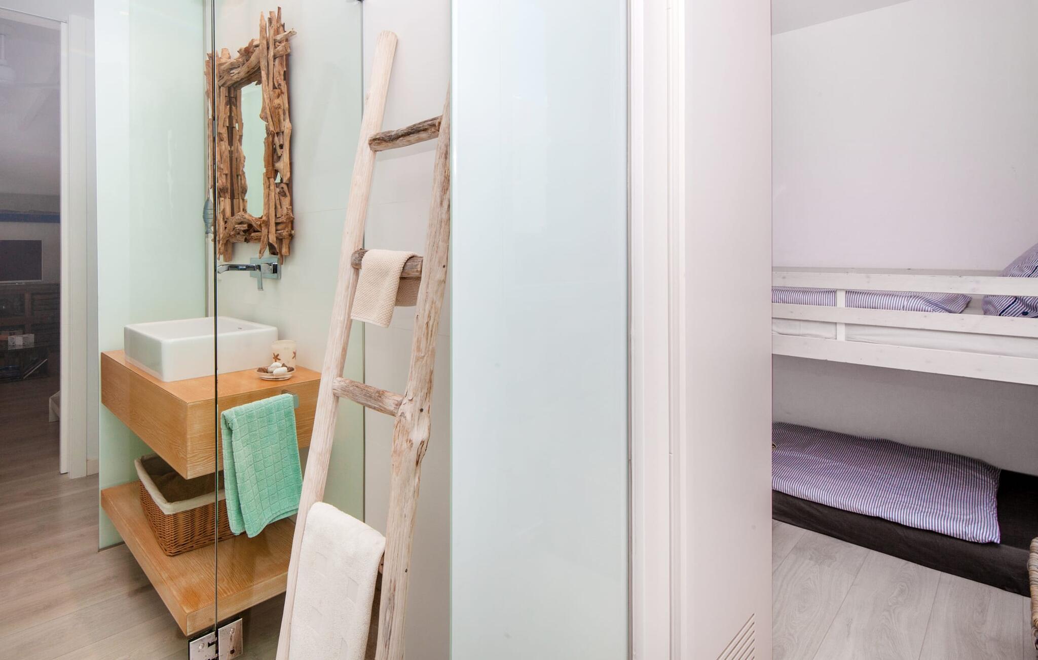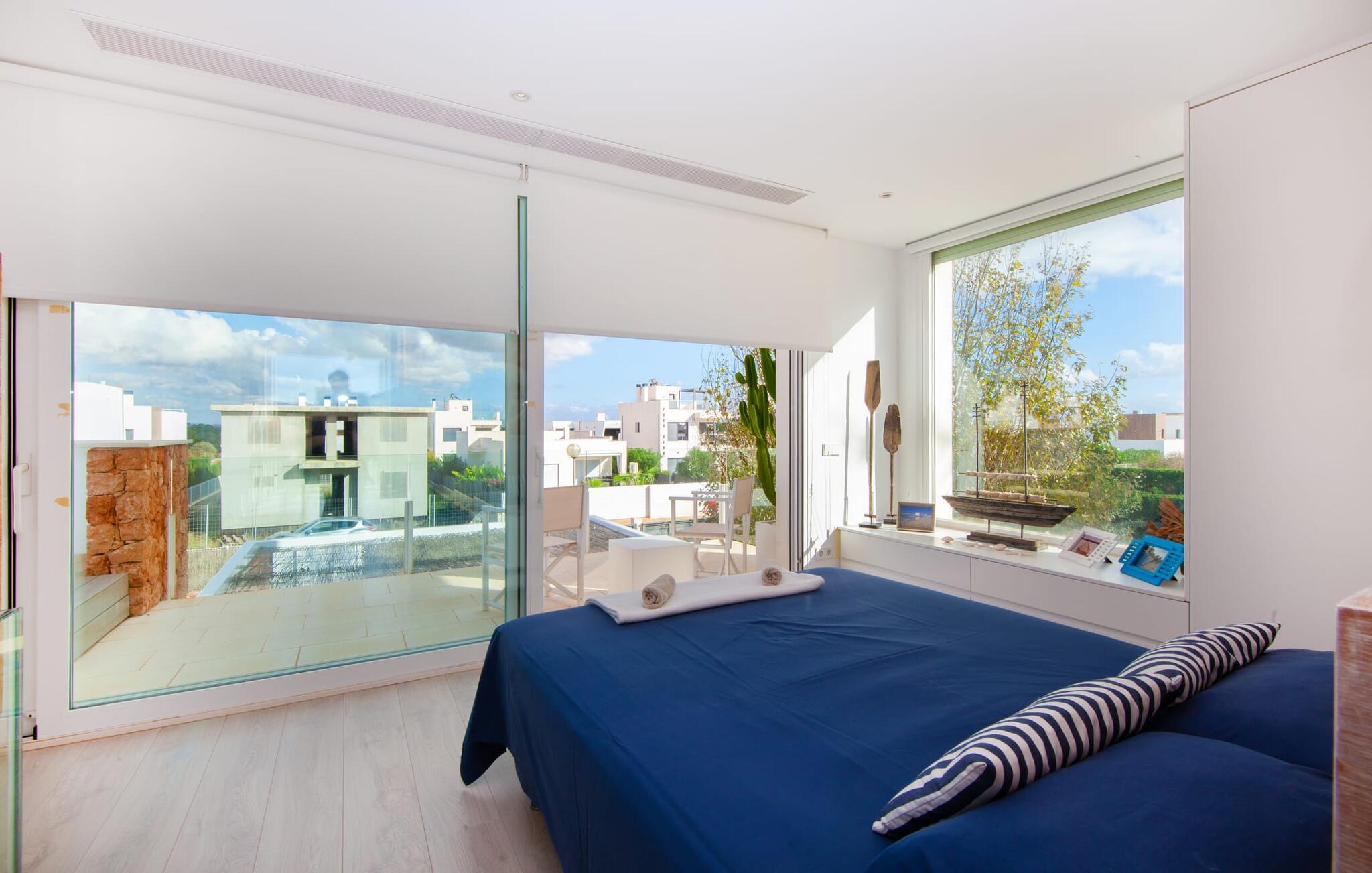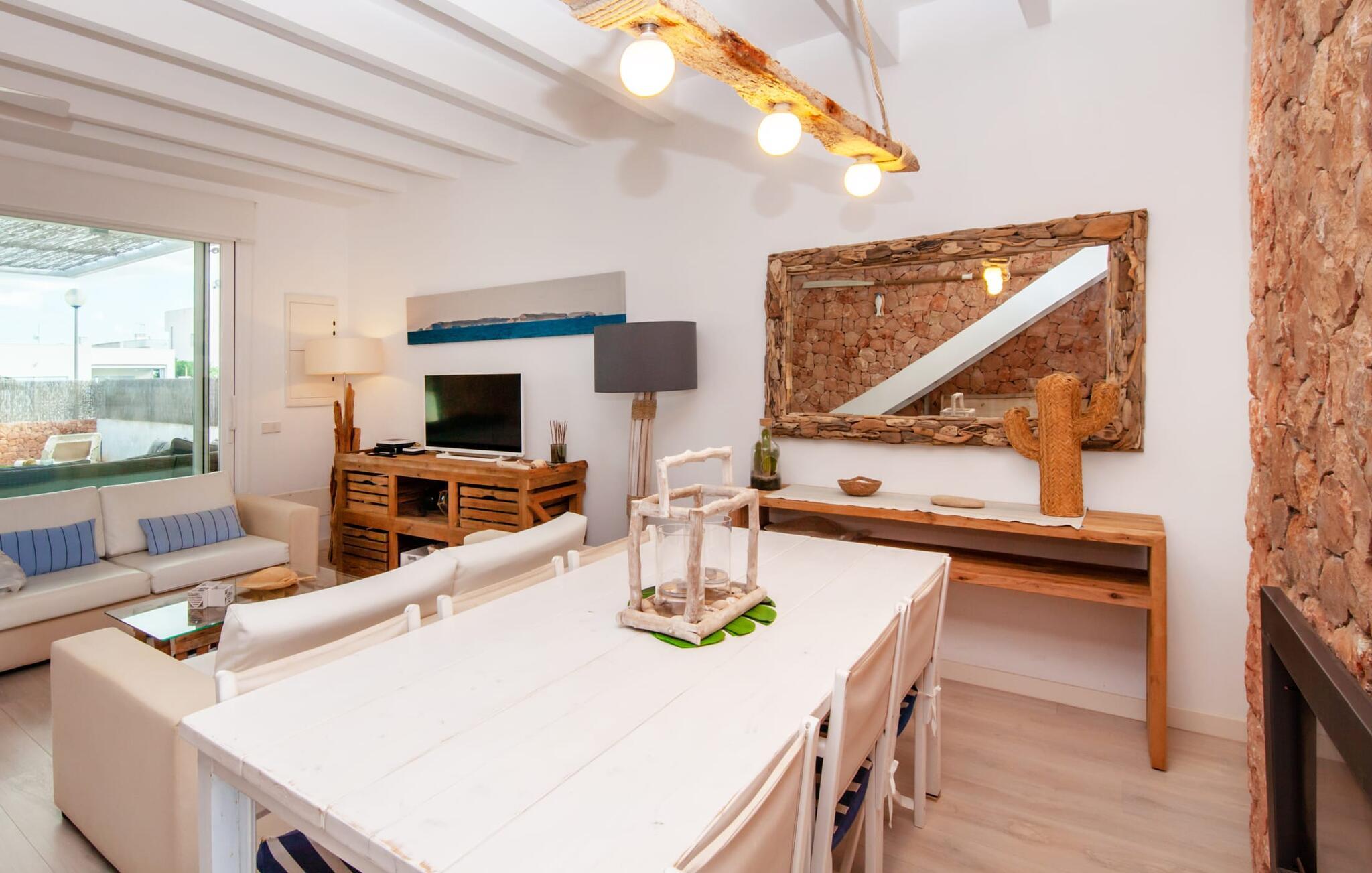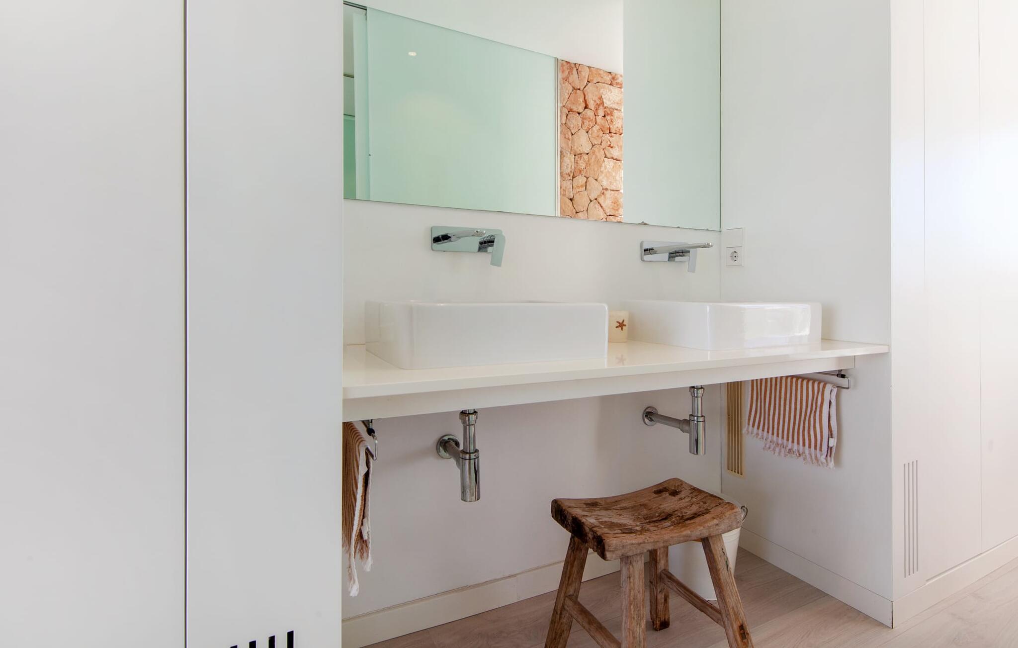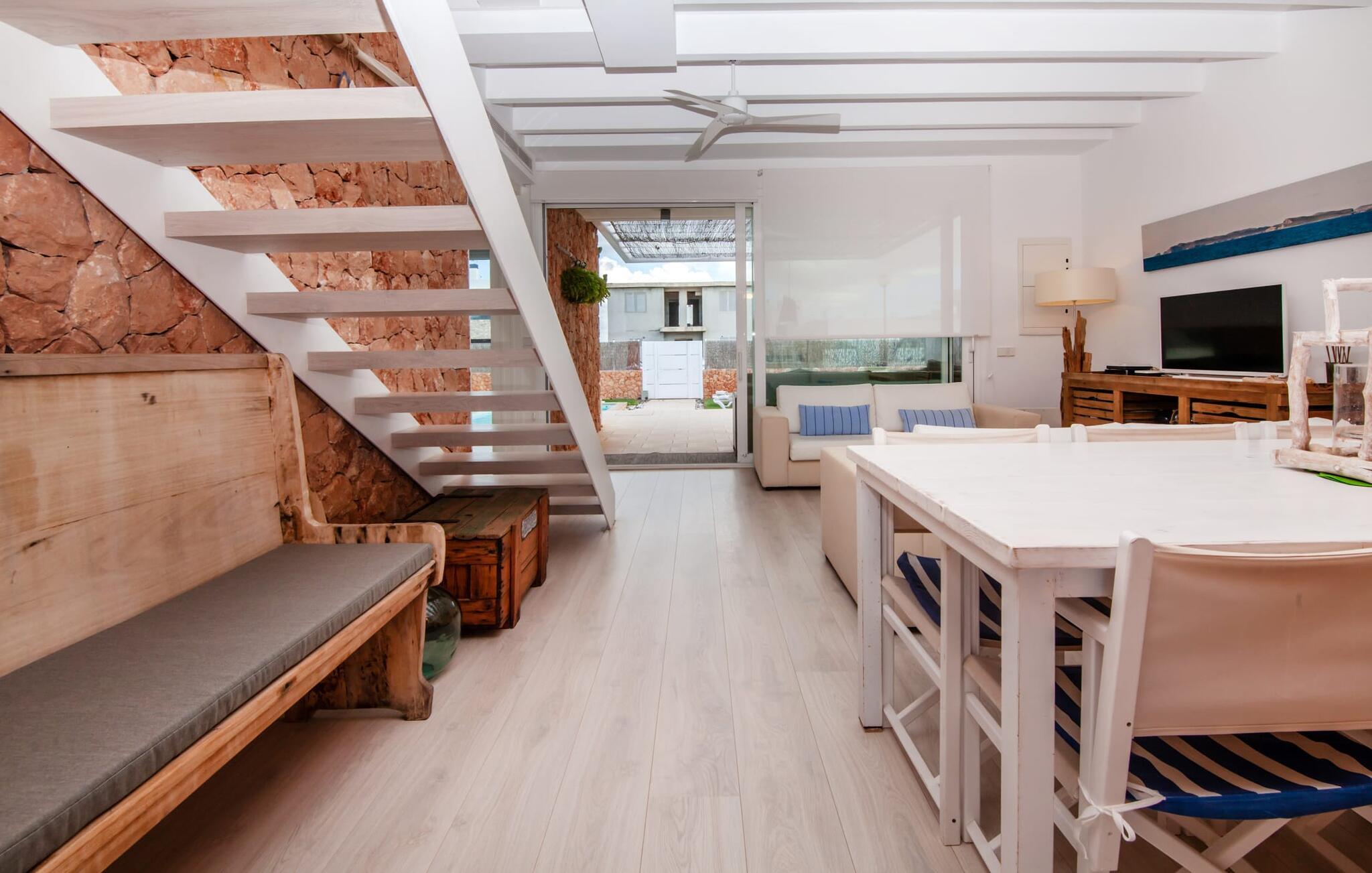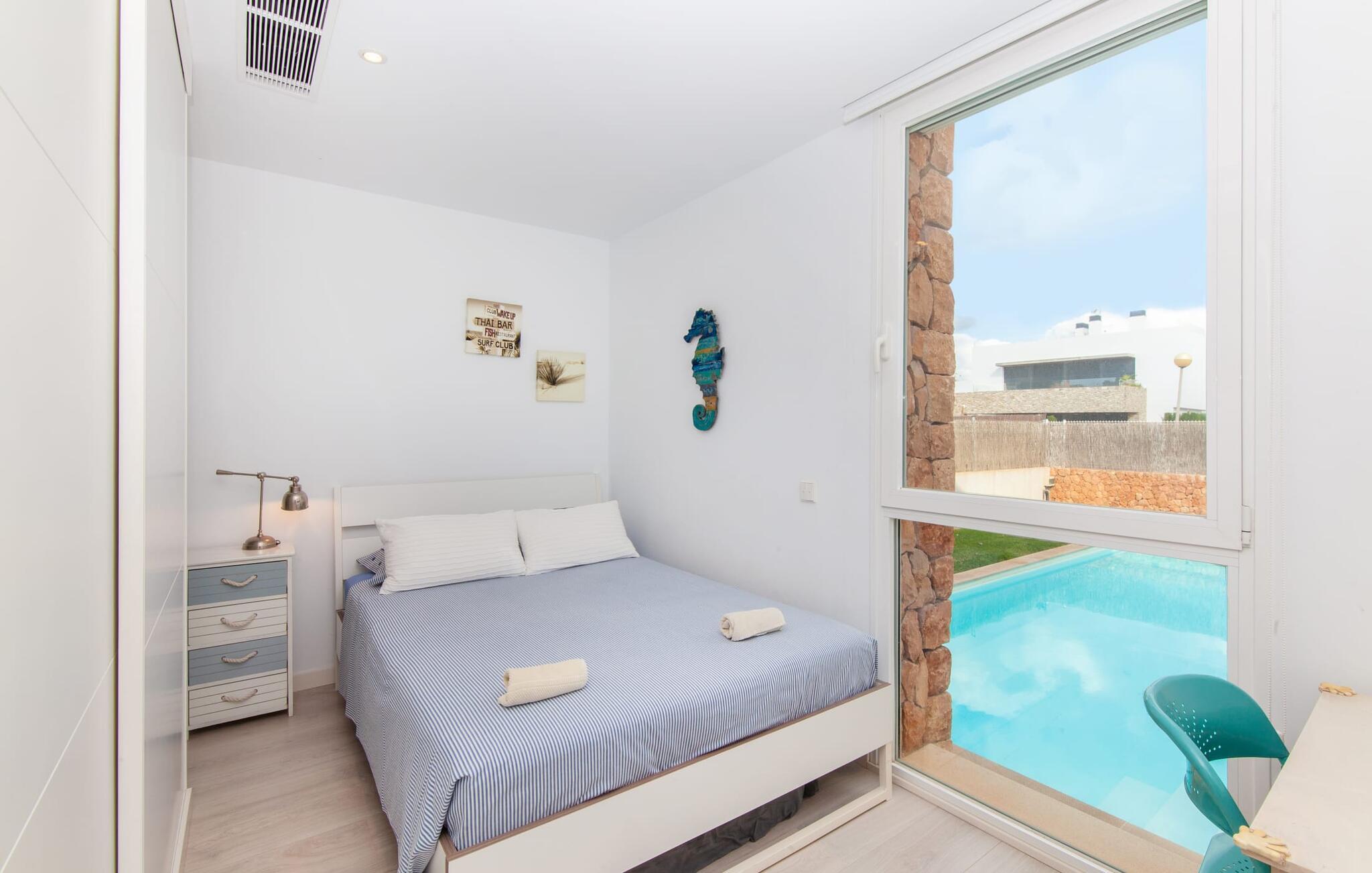 Denne kubeformede bondegård på Mallorca er et vidunderligt sted for ubekymrede ferier ved havet. Den umiddelbart iøjnefaldende tilbygning med naturstensfacade kendetegner det stilrene hjem, som sigter mod at være én ting frem for alt: Individuelt. Plæner og en væg med privatlivsskærme præger udendørsområdet, hvis centrum er den aflange pool. Det lover vidunderlig afkøling på varme dage og er meget let at nå via trapper. Komfortable liggestole fås til alle soldyrkere, som blot kan placeres på jeres yndlingssted, og hvorfra I kan nyde ferielivet i fulde drag. Den let hævede terrasse direkte ved huset har en indbydende chill-out lounge med udsigt til haven og poolen. På den anden side af huset byder en anden veranda på et tilsvarende hyggeligt sted, i dette tilfælde bekvemt placeret direkte foran køkkenet. Et originalt udtænkt og designet interiør byder jer velkommen, når I træder ind i den behageligt lyse villa "Can Bosquerro". Den solide, rødligt glitrende natursten fortsætter her og sætter både effektive og æstetiske accenter i rummenes vidunderlige maritime flair. Stue-spisestue og køkken smelter sammen i en halvåben planløsning, der skaber en flydende overgang mellem brugsområderne. Komfort og funktionalitet er lige vigtige. Alle mulige unikke detaljer forstærker denne individuelle, moderne atmosfære yderligere. To hyggelige soveværelser - et med dobbeltseng og et med køjeseng - samt et brusebad (installeret i det største af de to soveværelser) fuldender stueetagen. Den øverste etage er domineret af et rummeligt soveværelse med opholdsstue og privat badeværelse. Herfra har I udgang til den skønne altan, hvor jeres første kaffe om morgenen med sikkerhed smager lige så lækkert som en solnedgang. Denne villa på Mallorca er et sandt lykketræf for alle, der ønsker at tilbringe deres ferie tæt på stranden, æstetisk og af høj kvalitet. Dette æstetiske feriehus på Mallorca scorer med sin attraktive beliggenhed tæt ved havet - stranden og havnen ligger i gåafstand. Den originalt designede villa ligger desuden bekvemt direkte på en lille stille gade og er derfor ideelt forbundet med forskellige udflugtsmål. Sa Ràpita har en attraktiv infrastruktur med restauranter og indkøbsmuligheder. Nærheden til andre smukke strande, herunder Es Trenc eller Ses Covetes, afrunder beliggenhedsfordelene.