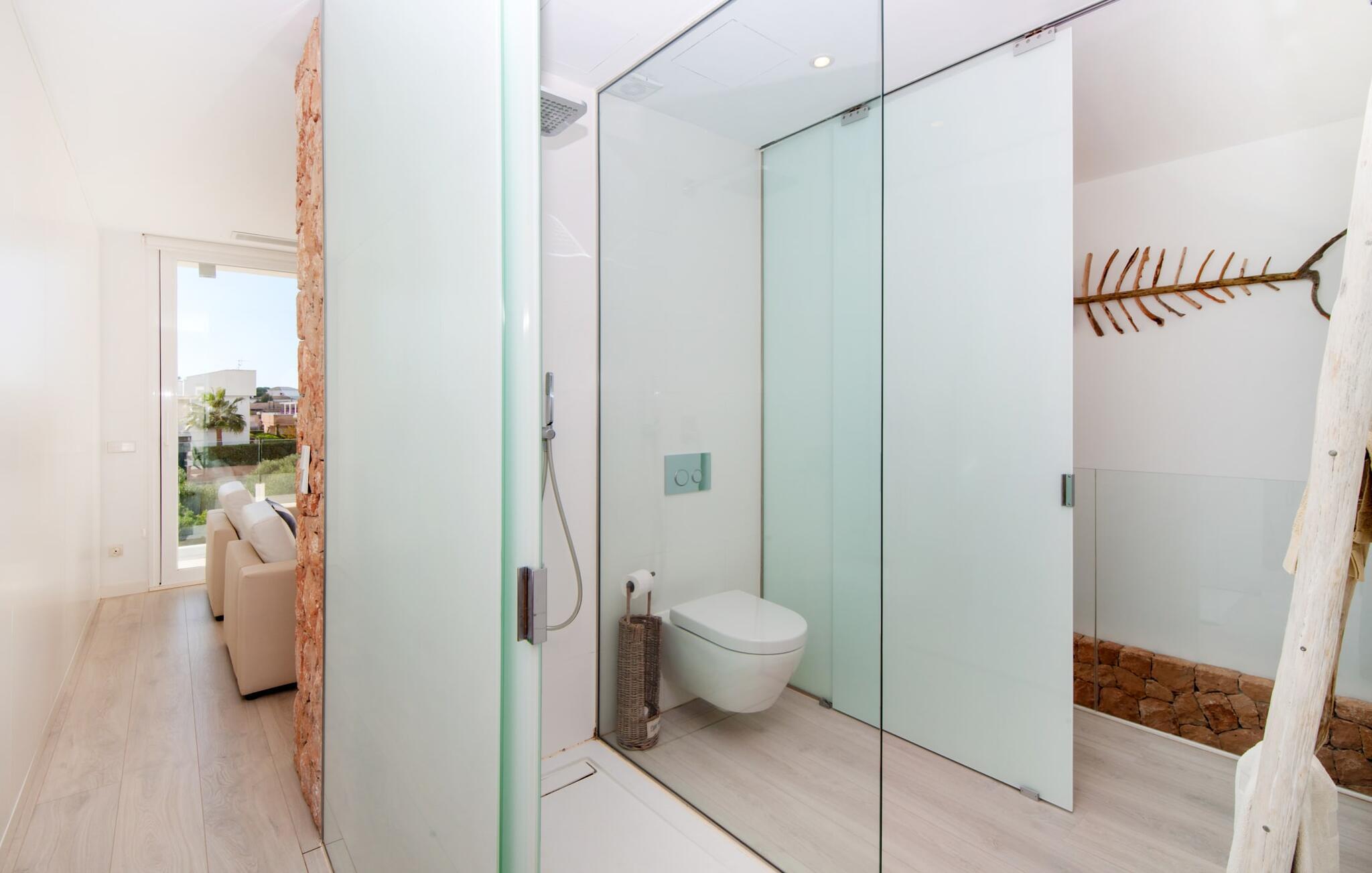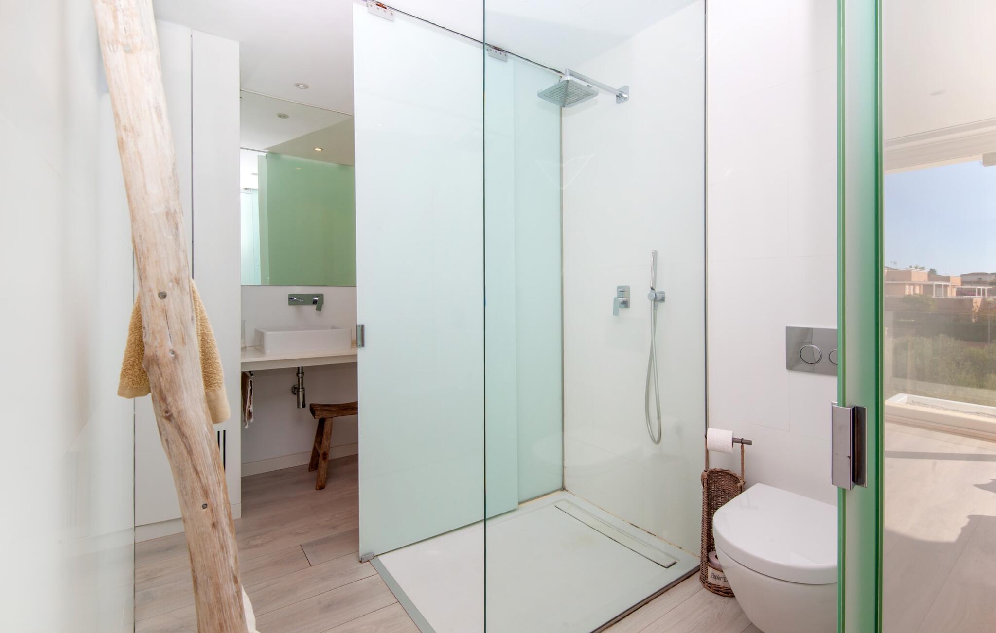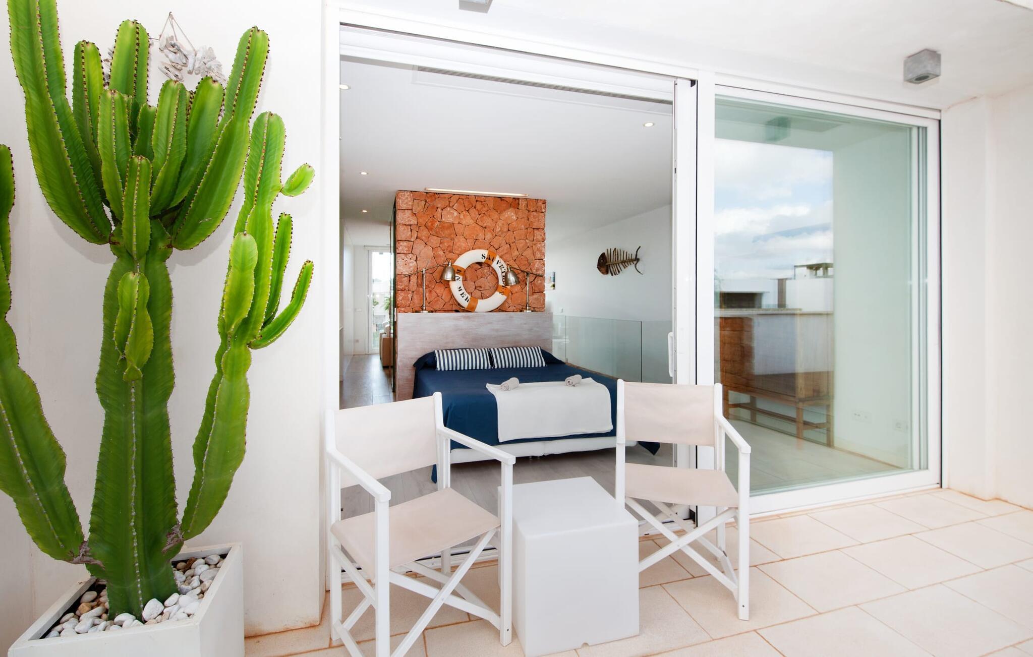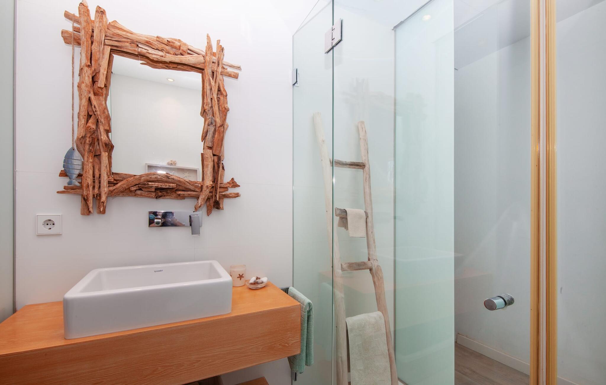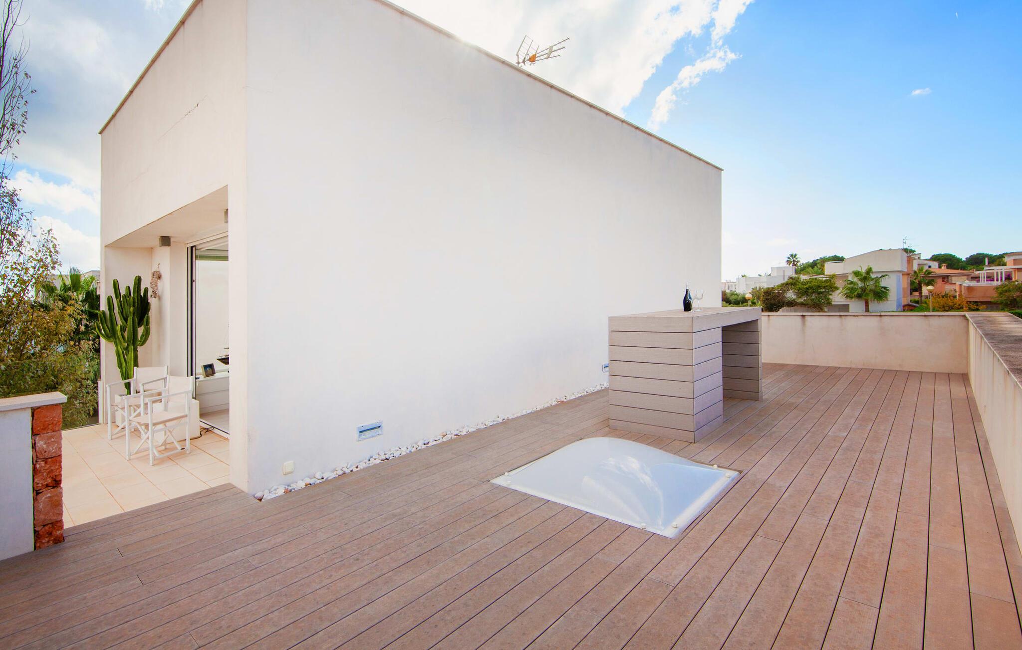 Denne kubeformede bondegård på Mallorca er et vidunderligt sted for ubekymrede ferier ved havet. Den umiddelbart iøjnefaldende tilbygning med naturstensfacade kendetegner det stilrene hjem, som sigter mod at være én ting frem for alt: Individuelt. Plæner og en væg med privatlivsskærme præger udendørsområdet, hvis centrum er den aflange pool. Det lover vidunderlig afkøling på varme dage og er meget let at nå via trapper. Komfortable liggestole fås til alle soldyrkere, som blot kan placeres på jeres yndlingssted, og hvorfra I kan nyde ferielivet i fulde drag. Den let hævede terrasse direkte ved huset har en indbydende chill-out lounge med udsigt til haven og poolen. På den anden side af huset byder en anden veranda på et tilsvarende hyggeligt sted, i dette tilfælde bekvemt placeret direkte foran køkkenet. Et originalt udtænkt og designet interiør byder jer velkommen, når I træder ind i den behageligt lyse villa "Can Bosquerro". Den solide, rødligt glitrende natursten fortsætter her og sætter både effektive og æstetiske accenter i rummenes vidunderlige maritime flair. Stue-spisestue og køkken smelter sammen i en halvåben planløsning, der skaber en flydende overgang mellem brugsområderne. Komfort og funktionalitet er lige vigtige. Alle mulige unikke detaljer forstærker denne individuelle, moderne atmosfære yderligere. To hyggelige soveværelser - et med dobbeltseng og et med køjeseng - samt et brusebad (installeret i det største af de to soveværelser) fuldender stueetagen. Den øverste etage er domineret af et rummeligt soveværelse med opholdsstue og privat badeværelse. Herfra har I udgang til den skønne altan, hvor jeres første kaffe om morgenen med sikkerhed smager lige så lækkert som en solnedgang. Denne villa på Mallorca er et sandt lykketræf for alle, der ønsker at tilbringe deres ferie tæt på stranden, æstetisk og af høj kvalitet. Dette æstetiske feriehus på Mallorca scorer med sin attraktive beliggenhed tæt ved havet - stranden og havnen ligger i gåafstand. Den originalt designede villa ligger desuden bekvemt direkte på en lille stille gade og er derfor ideelt forbundet med forskellige udflugtsmål. Sa Ràpita har en attraktiv infrastruktur med restauranter og indkøbsmuligheder. Nærheden til andre smukke strande, herunder Es Trenc eller Ses Covetes, afrunder beliggenhedsfordelene.