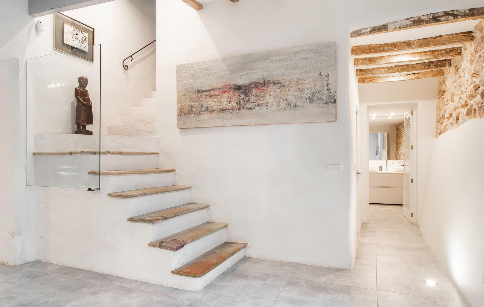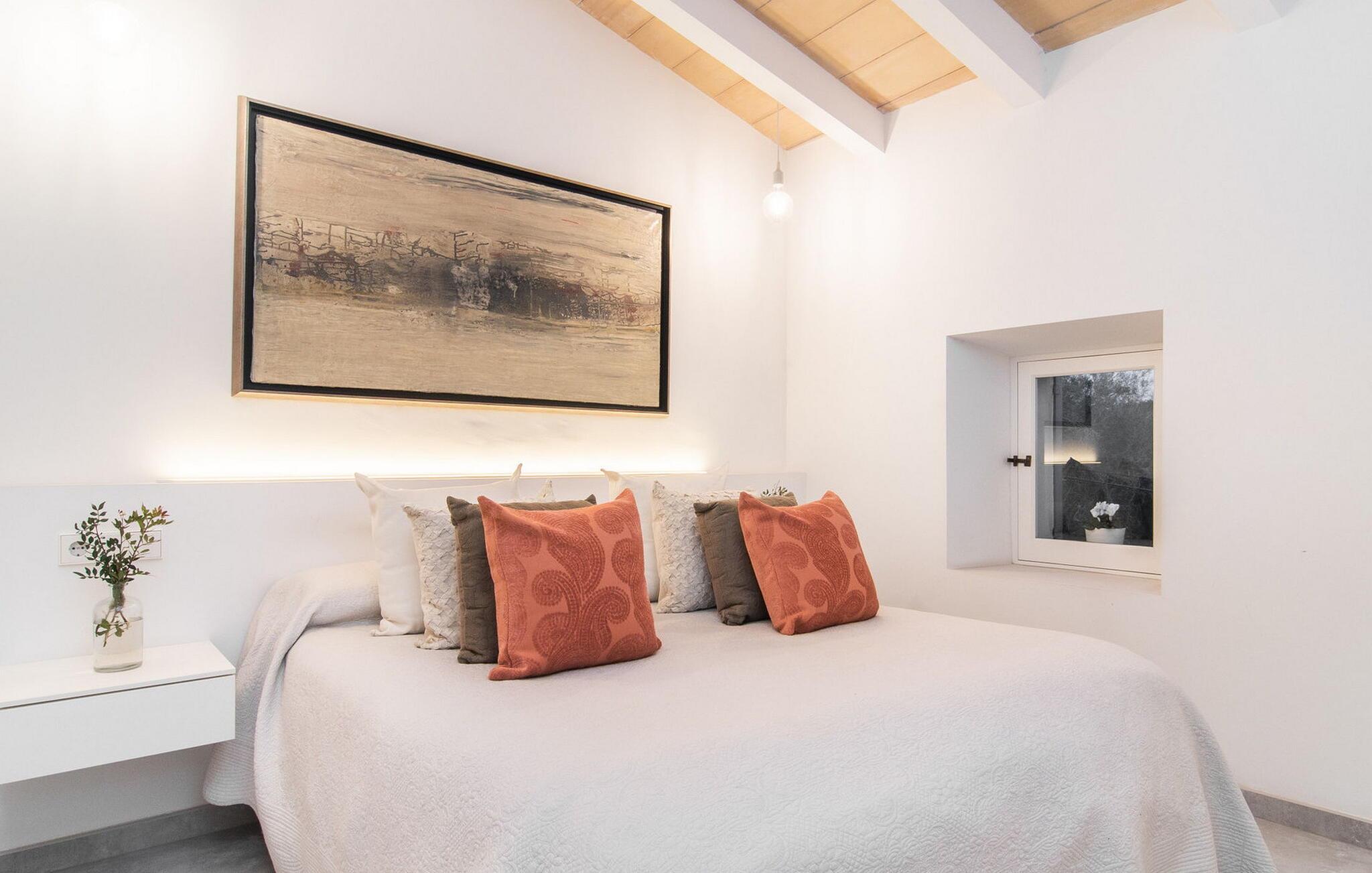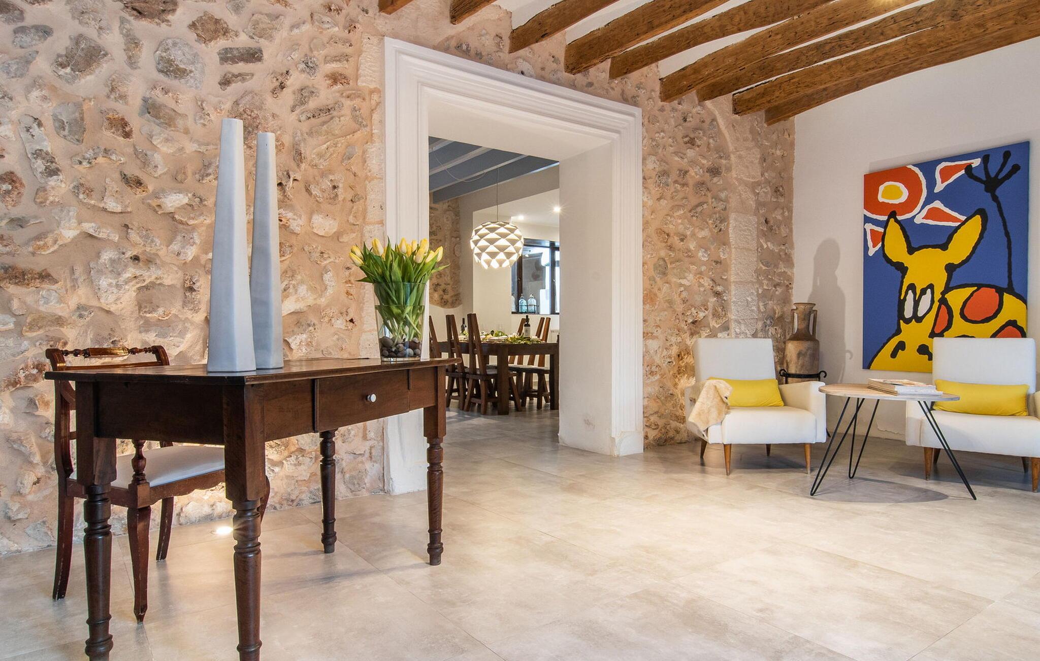 Det stilfuldt designede udendørsområde i dette rækkehus inviterer jer til at tilbringe lange timer under middelhavshimlen. Den moderne pool, som nemt kan nås via en bred trappe, lover en vidunderlig måde at køle af på varme dage. På den tilstødende terrasse er der et spisebord, hvor I kan nyde jeres måltider sammen. Om aftenen inviterer gasgrillen jer til at tilberede lækre middelhavsdelikatesser. Komfortable liggestole inviterer jer til at solbade i vid udstrækning. Dette rækkehus på Mallorca er også ideelt for cyklister, da det ligger på en cykelrute og har parkeringsmuligheder. Der er også en ladestation til elbiler. Husets indretning er cool og absolut trendy, hvilket giver et meget komfortabelt og rummeligt midlertidigt hjem for op til ti gæster. Store gulvfliser, lyse hvide vægge med naturstenselementer og original belysning skaber en meget æstetisk atmosfære. Slap af i den store sofa i afslapningsområdet eller nyd et lækkert måltid i spisestuen. Dette er åbent til det moderne, fuldt udstyret køkken med kogeø. På samme etage er der desuden et stort badeværelse med bruseniche og et vaskerum med vaskemaskine og tørretumbler. En anden smuk stue med store vinduer er ovenpå. Der er også fire soveværelser med dobbeltsenge og to badeværelser med bruser. Det femte dobbeltværelse og et brusebad er i kælderen. Rækkehuset "Can Caragol de Sineu" med en smuk privat have ligger ved indgangen til Sineu i centrum af Mallorca. Butikker og restauranter ligger delvist inden for gåafstand. Alcúdia-bugten kan nås på cirka 30 minutter i bil.