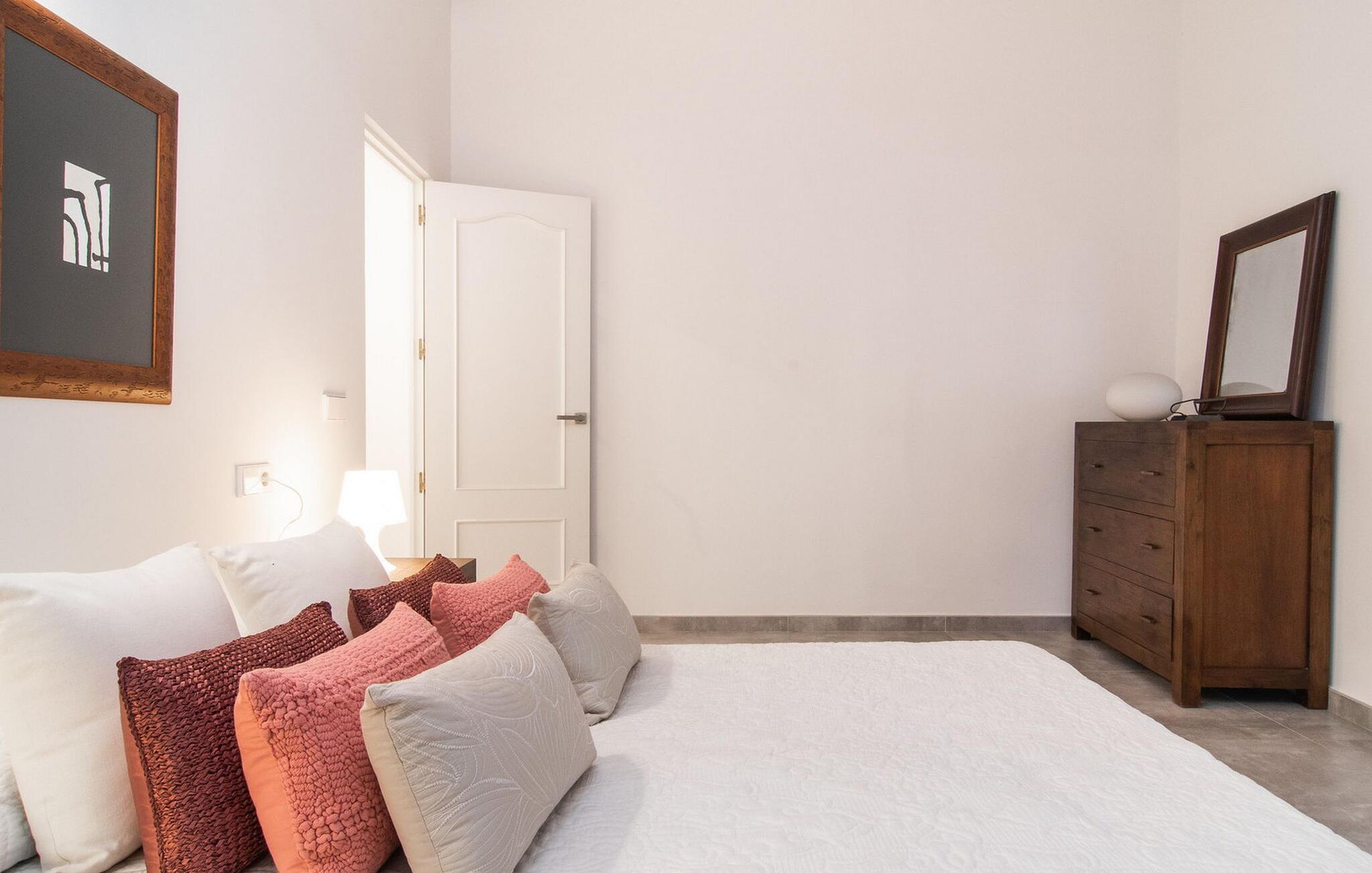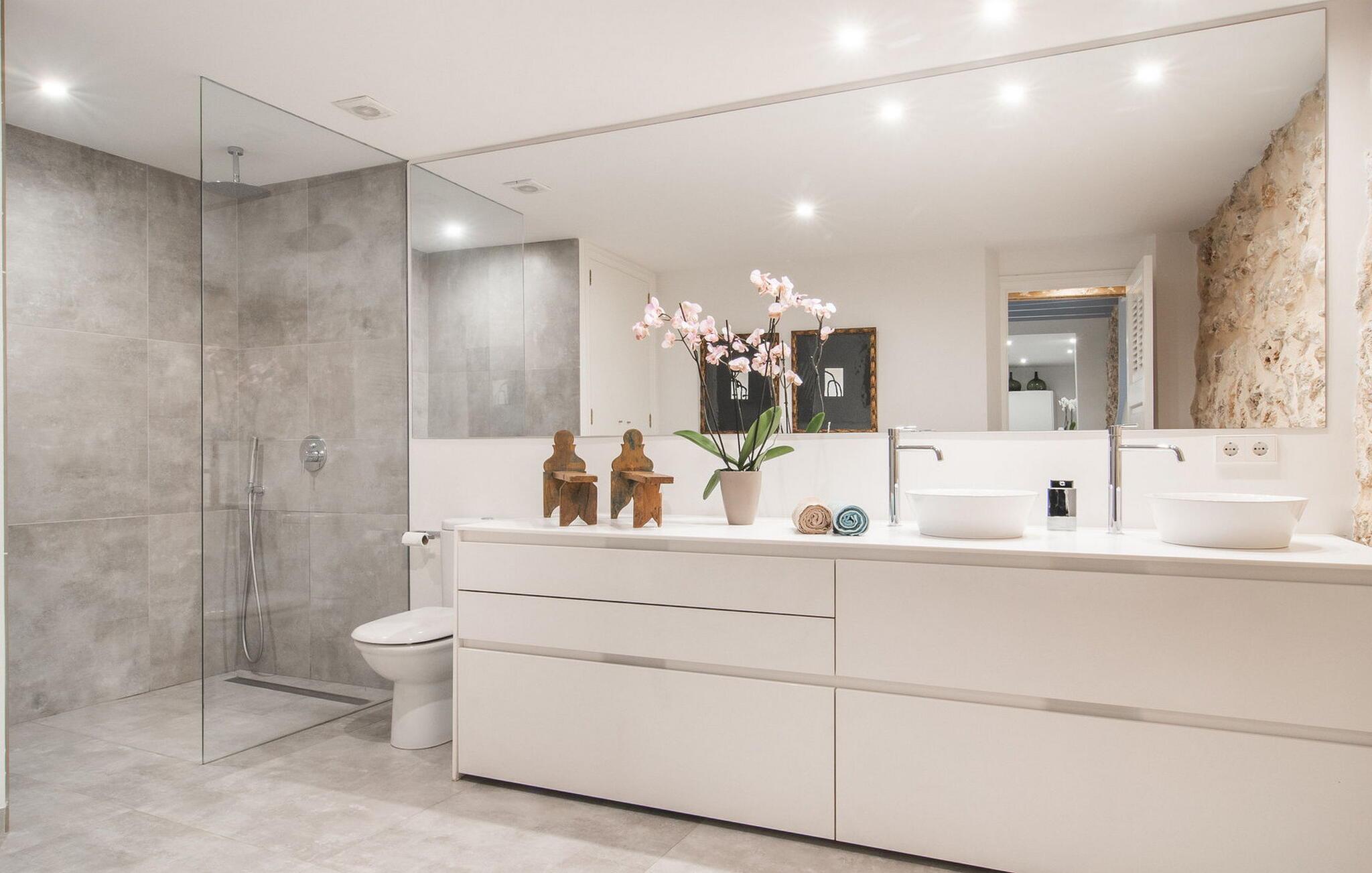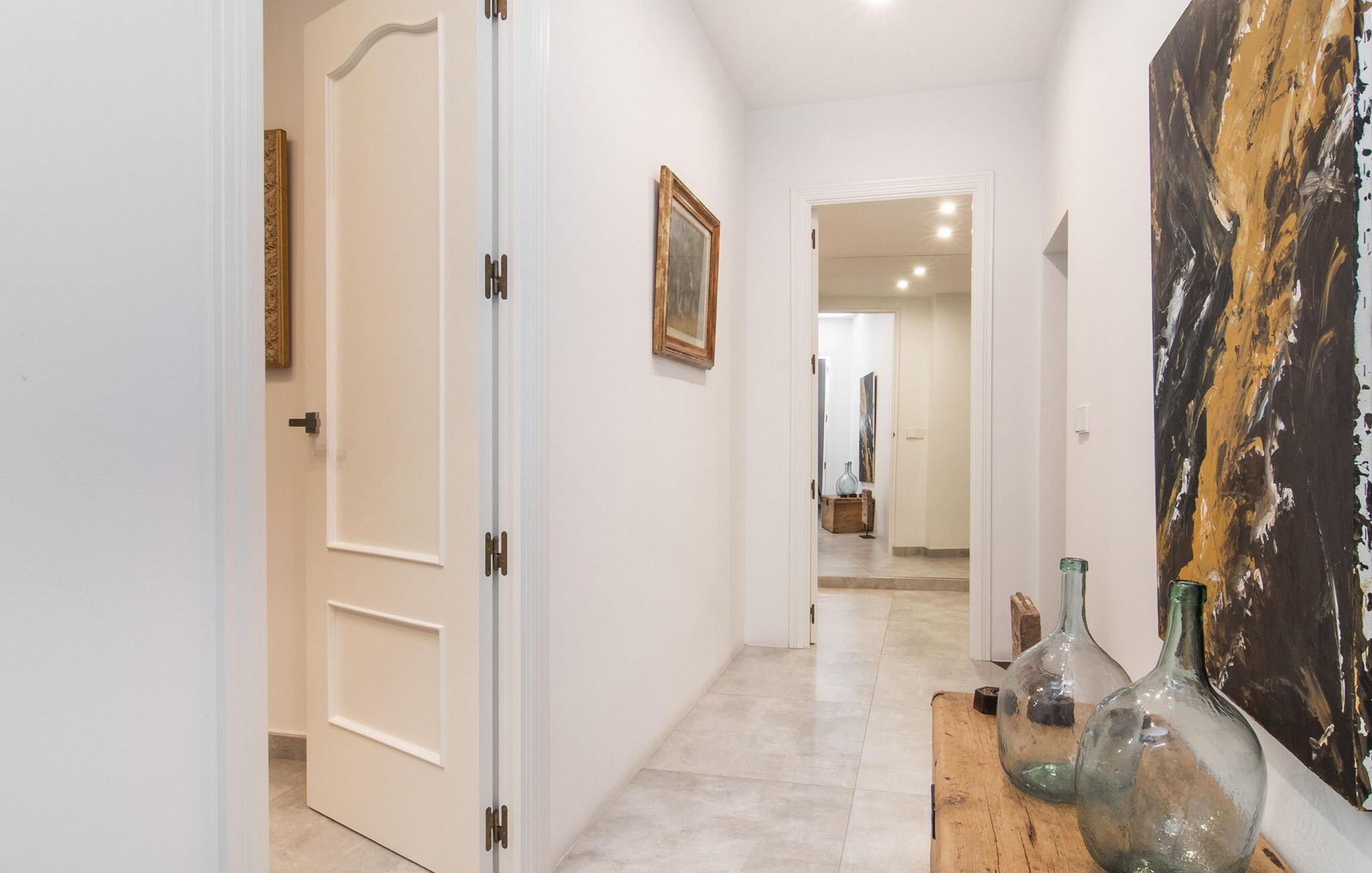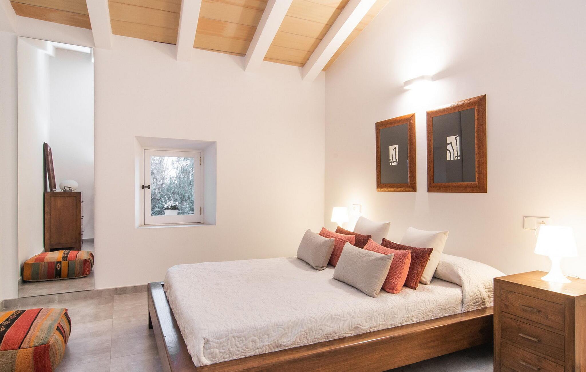Det stilfuldt designede udendørsområde i dette rækkehus inviterer jer til at tilbringe lange timer under middelhavshimlen. Den moderne pool, som nemt kan nås via en bred trappe, lover en vidunderlig måde at køle af på varme dage. På den tilstødende terrasse er der et spisebord, hvor I kan nyde jeres måltider sammen. Om aftenen inviterer gasgrillen jer til at tilberede lækre middelhavsdelikatesser. Komfortable liggestole inviterer jer til at solbade i vid udstrækning. Dette rækkehus på Mallorca er også ideelt for cyklister, da det ligger på en cykelrute og har parkeringsmuligheder. Der er også en ladestation til elbiler. Husets indretning er cool og absolut trendy, hvilket giver et meget komfortabelt og rummeligt midlertidigt hjem for op til ti gæster. Store gulvfliser, lyse hvide vægge med naturstenselementer og original belysning skaber en meget æstetisk atmosfære. Slap af i den store sofa i afslapningsområdet eller nyd et lækkert måltid i spisestuen. Dette er åbent til det moderne, fuldt udstyret køkken med kogeø. På samme etage er der desuden et stort badeværelse med bruseniche og et vaskerum med vaskemaskine og tørretumbler. En anden smuk stue med store vinduer er ovenpå. Der er også fire soveværelser med dobbeltsenge og to badeværelser med bruser. Det femte dobbeltværelse og et brusebad er i kælderen. Rækkehuset "Can Caragol de Sineu" med en smuk privat have ligger ved indgangen til Sineu i centrum af Mallorca. Butikker og restauranter ligger delvist inden for gåafstand. Alcúdia-bugten kan nås på cirka 30 minutter i bil.