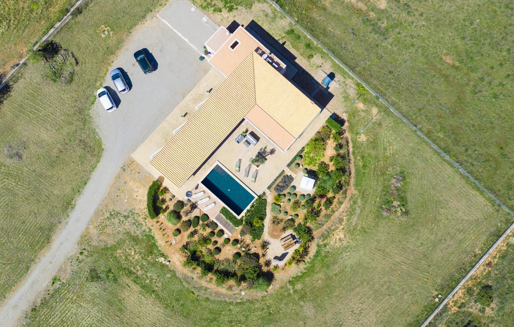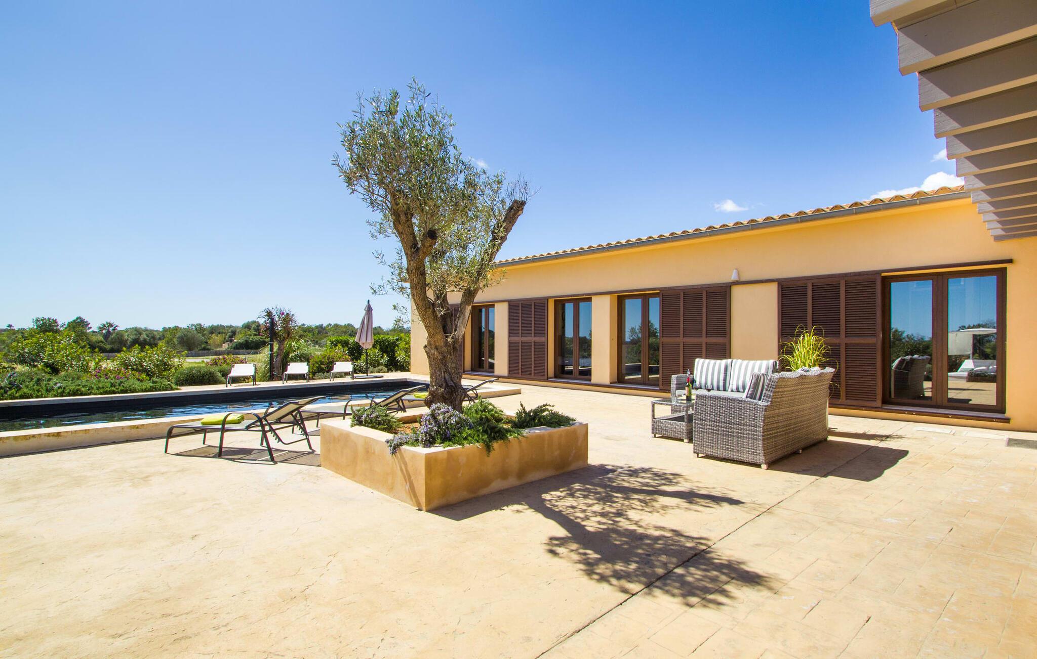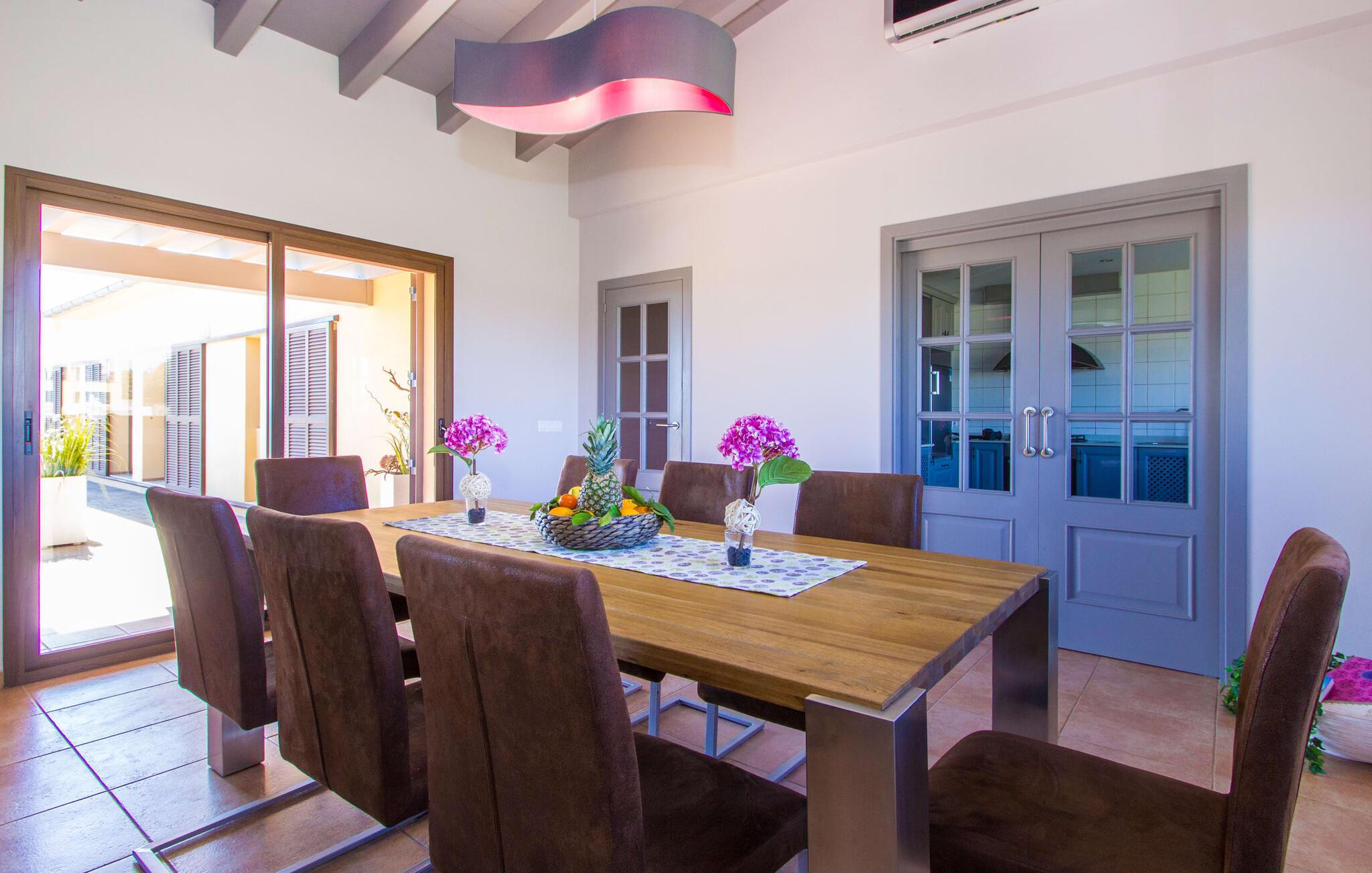 Denne en-etagers L-formede villa med integreret poolterrasse tiltrækker øjeblikkelig entusiasme og er kærligt kendt som "Can Cariño". Og der er faktisk meget at forelske sig i ved første blik, når I kører op ad den lange indkørsel. Den rummelige, velholdte og alligevel næsten naturlige ejendom giver jer mulighed for at nyde udsigten og lade tankerne vandre i det fjerne. Ikke kun picnicområdet med grill, men også en luftig Bali seng er gemt i den fortryllende have; På varme sommernætter vil en gæst med pude og tæppe under armen formentlig vandre ind i udendørs soveværelset om morgenen og hoppe i poolen i stedet for bruseren. Talrige komfortable liggestole, maritime polyrattan lounge sofaer og et stort bord gør opholdet i solen eller skyggen meget behageligt, så alle kan finde deres yndlingssted - deres lugarfavorit. Og hvis I har lyst til en strandstol, er der også en af dem. Som en ny besøgende i huset meget passende skrev i gæstebogen: "Mange kan indrette et hus, men kun få formår at skabe et hjem." I finder også kærlige detaljer i interiøret, som er endnu mere fremhævet af det moderne indretningsstil. Hvad med det knaldrøde æblebord i stue og spisestue eller fjernsynet, der har væggen for sig selv og tiltrækker alles opmærksomhed som et stort biograflærred? Og passer den blå Loriot-sofa ikke virkelig til det enorme, moderne køkken? Hvad synes I om den elegante løsning med en dobbeltdør med udsigt, der adskiller spisepladsen og brændeovnen og samtidig bevare en luftig forbindelse? Vaskemaskine og tørretumbler er også anbragt separat her. Passer de små sengelamper ikke perfekt til massivtræssengene i et elegant design? Alle fire soveværelser i næsten samme størrelse - hvoraf det ene har eget badeværelse og walk-in closet - har aircondition og åbner direkte ud til terrassen. En ting er dog sikkert: alle vil skændes om at prøve et bestemt brusebad... Små ture fra landskabet til byen og længere ture til eller over havet eller ud i naturen kan nemt klares fra "Can Cariño": I middelalderen I den lille by Campos kan I slappe af i timevis med espresso og mandelkage og der er selvfølgelig også nogle gode restauranter. En varm drik med sin egen mallorcanske historie kan findes i den historiske Café Colón i Llucmajor. Vandrere og cyklister vil opdage deres paradis med vilde vandløb og orkideer i naturparken Mondragó, mens svømmere kan prøve nogle af de smukkeste strande - fra Es Trenc (kaldet "Caribbean of Mallorca") til Cala Pí til den børnevenlige Platja de sa Rápita. Steder i syd som Santanyí, Ses Salines og Colònia de Sant Jordi byder på sol og salt, tapas og vin, bådture (f.eks. til gedeøen Cabrera) og vandrestier langs kysten med et fyrtårn - der er meget mere. "Cariños" at opdage landligt, roligt beliggende mellem enge og marker og alligevel kun 10 minutter i bil fra charmerende Campos og dets butikker og restauranter ligger "Can Cariño": en klart struktureret villa med frit udsyn til det grønne og en hælder mod! Bauhaus-stilen Den let tilgængelige Ma-19 garanterer frihed på den ene side, den fører forbi Llucmajor og El Arenal til Palma, på den anden side til Santanyí og nær Mondragó-naturreservatet, strande med caribisk flair som Es Trenc, Platja de. sa Rápita og Es Carbó (inden for en radius af ca. 15 km) lover afslappende dage ved havet, bådture og vandsport.