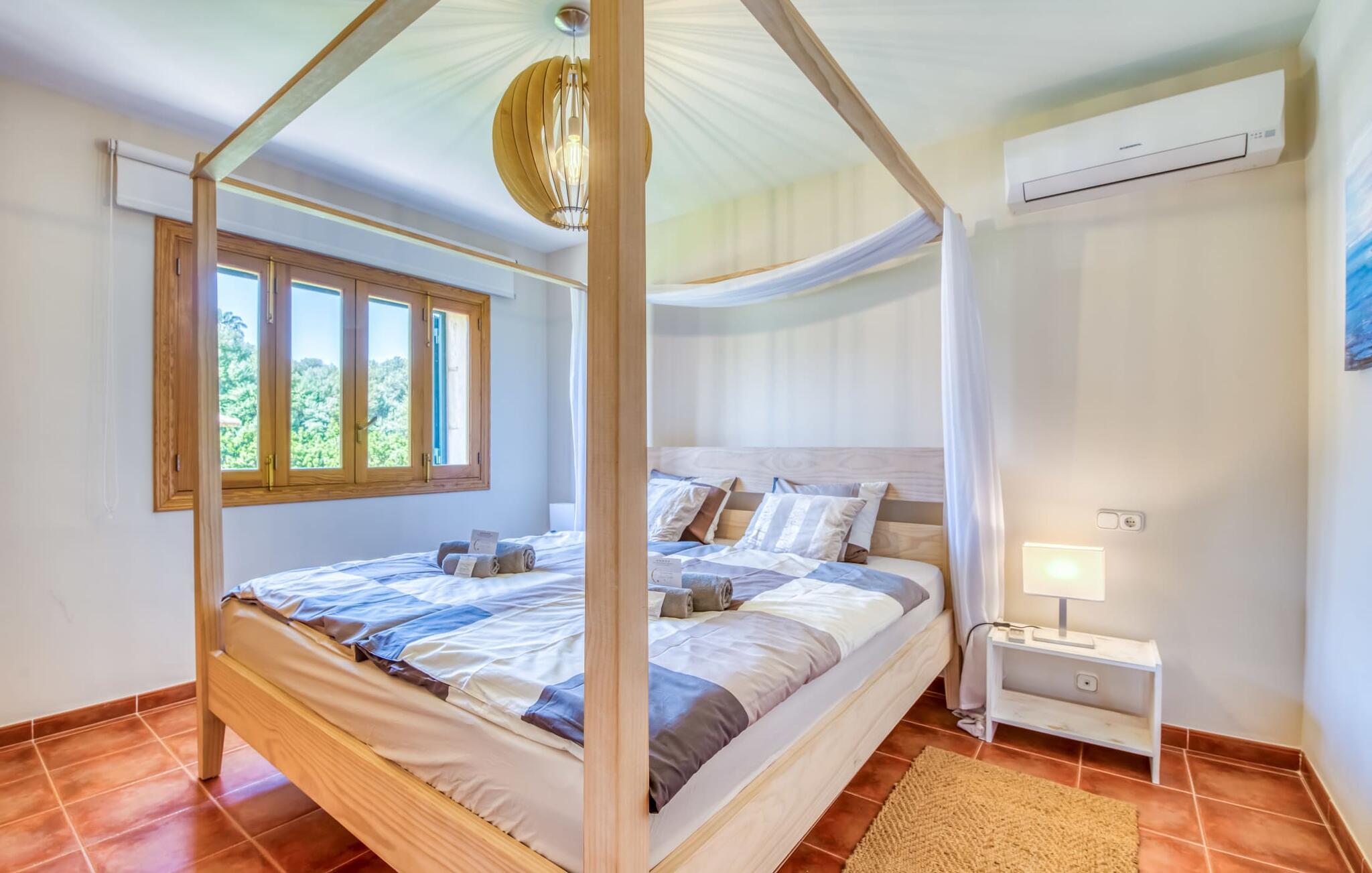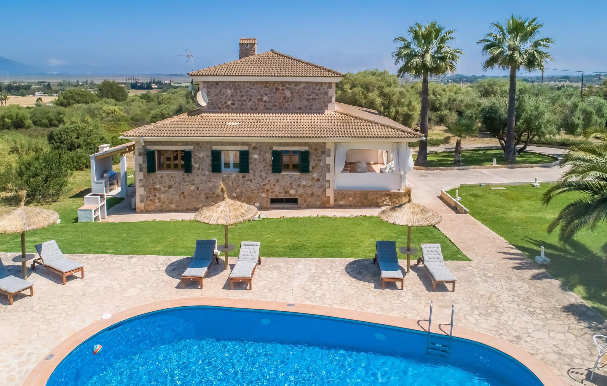 Den rummelige og lyse finca "Can Carmina" ligger på en rummelig grund med vid udsigt over landskabet til Tramuntana-bjergene. Poolområdet omfatter en overdækket pergola med daybeds og en udendørs pool. Naturgræsset indbyder til leg, ligesom legehuset, som er specielt designet til de mindste. Det rummelige interiør er lyst og venligt. En udendørs stue og også en spisestue på den overdækkede terrasse giver plads til alle. Er det for koldt for jer eller vil I tilbringe en hyggelig aften med at se tv i sofaen, er der behagelige sofaer og lænestole. En spisestue og et stort køkken fuldender opholdsområdet. De lyst møblerede værelser lover en afslappende søvn. Badeværelserne er også store. 5 km vest for kystbyen Can Picafort er fincaen "Can Carmina" et vidunderligt udgangspunkt for jeres udflugter: Alcúdia-bugten i øst, bjergene i nord, interessante byer og forskellige bugter i syd og vest. . Der er mange tilbud til enhver form for sport og fritid, populære cykelruter starter tæt på fincaen.