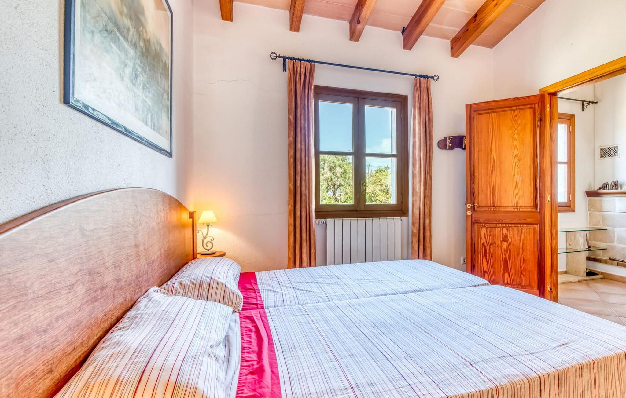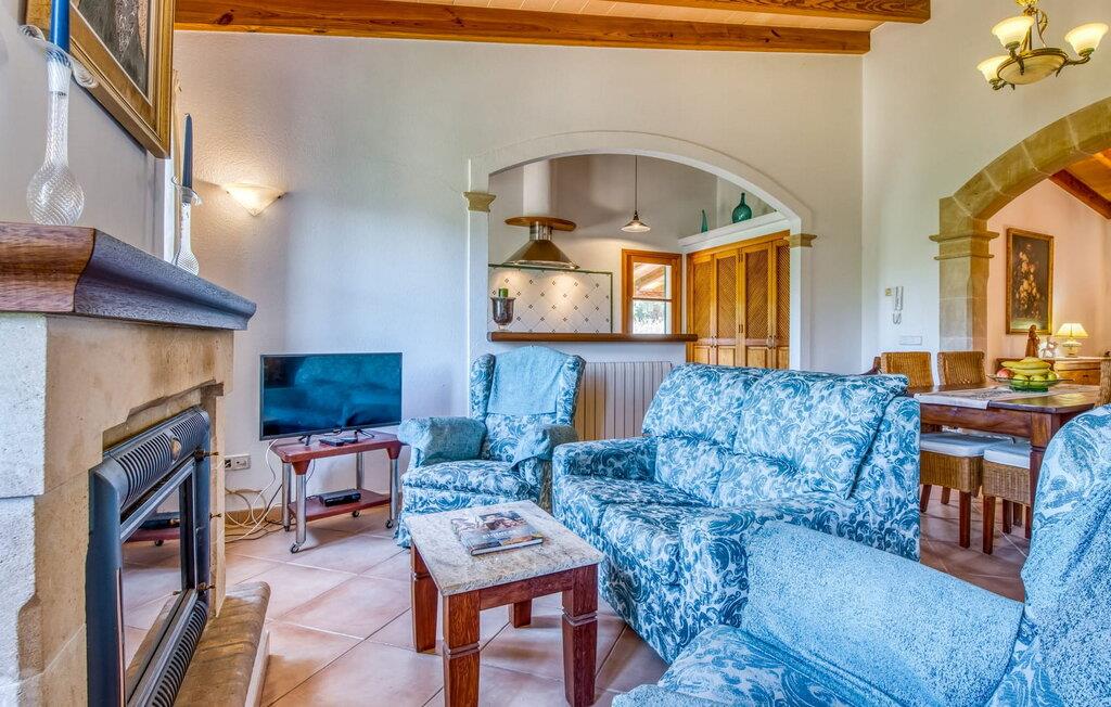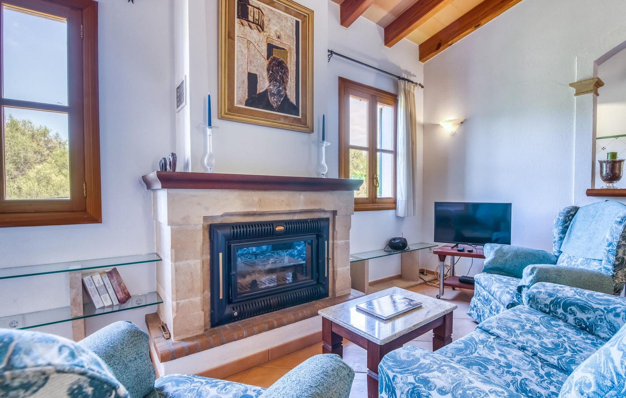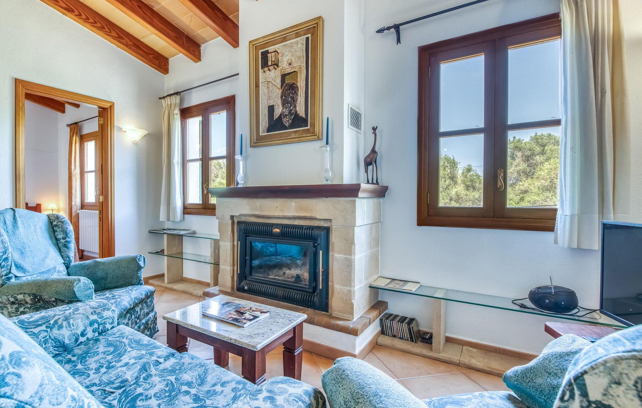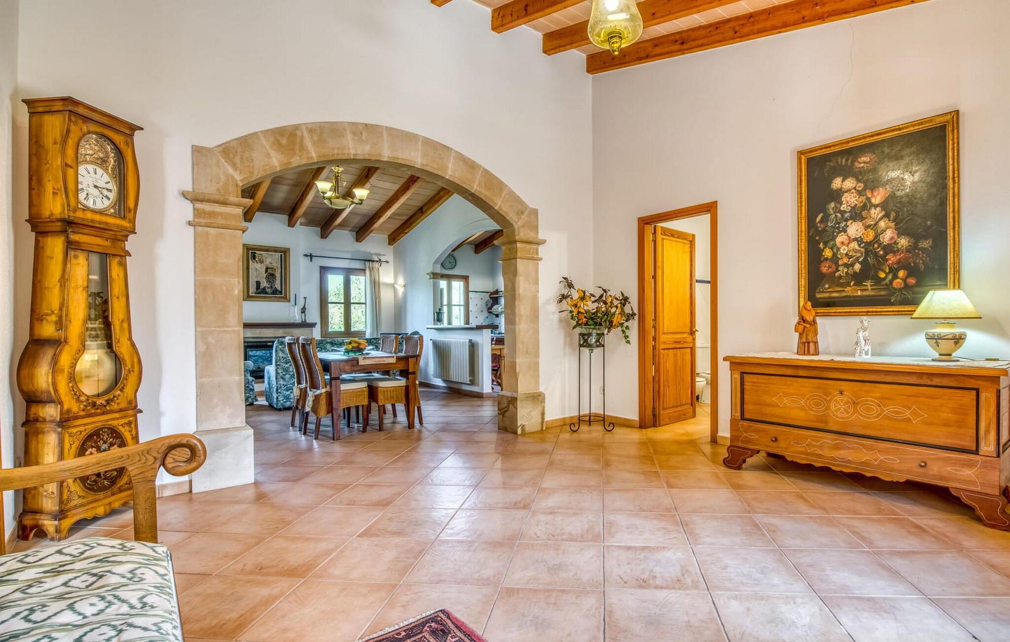 Denne bondegård i det smukke østlige Mallorca er et helt igennem idyllisk sted. Det er et ideelt hjem for alle, der elsker privatliv og nærhed til naturen og ønsker at være væk fra stress og jag på ferien. Et rustikt, delvist naturligt miljø skaber den atmosfære, hvor det er nemt at ankomme og slappe af. Åbne og overdækkede terrasseområder inviterer til at blive hængende. Afhængig af solens position kan jeres yndlingssteder ændre sig i løbet af dagen, og om aftenen inviterer grillen til at nyde en solid grill og en stemningsfuld afslutning. Den charmerende indretning af dette feriehus på Mallorca kan beskrives som værdigt og ret klassisk. Alle boligarealer er i ét plan og tilbyder fire feriegæster et rummeligt midlertidigt hjem. Den åbne stue-spisestue med integreret, fuldt udstyret køkken rummer forskellige behov og aktiviteter på samme tid og skaber en dejlig fællesskabsfølelse. På kølige aftener kan I sidde komfortabelt i sofa-lænestolsområdet foran pejsen eller se en god film i fjernsynet. Indendørs måltider kan også fejres sammen i det åbne rum - afstanden til køkkenet, hvorfra der er praktisk udgang til det fri, er behageligt kort. To hyggelige soveværelser med et badeværelse imellem skaber vidunderlige oaser af fred. Endnu et badeværelse fuldender boligkomforten i dette bondehus, som kan opvarmes til en behagelig temperatur året rundt. Bondegården "Can Carrio s'Estepar" er omgivet af bølgende bakker og ligger mindre end 3 km fra centrum af Son Serveras. I kan gøre jeres daglige indkøb i landsbyen og købe frisk mad på markedet om fredagen. På cirka 10 minutter i bil er I ved Costa del Pins, hvor I enten kan tilbringe en skøn dag ved havet eller spille golf. Den maleriske by Artà ligger 7,6 km derfra, hvor I kan slentre gennem smukke gader og få en bid mad på indbydende caféer og restauranter.