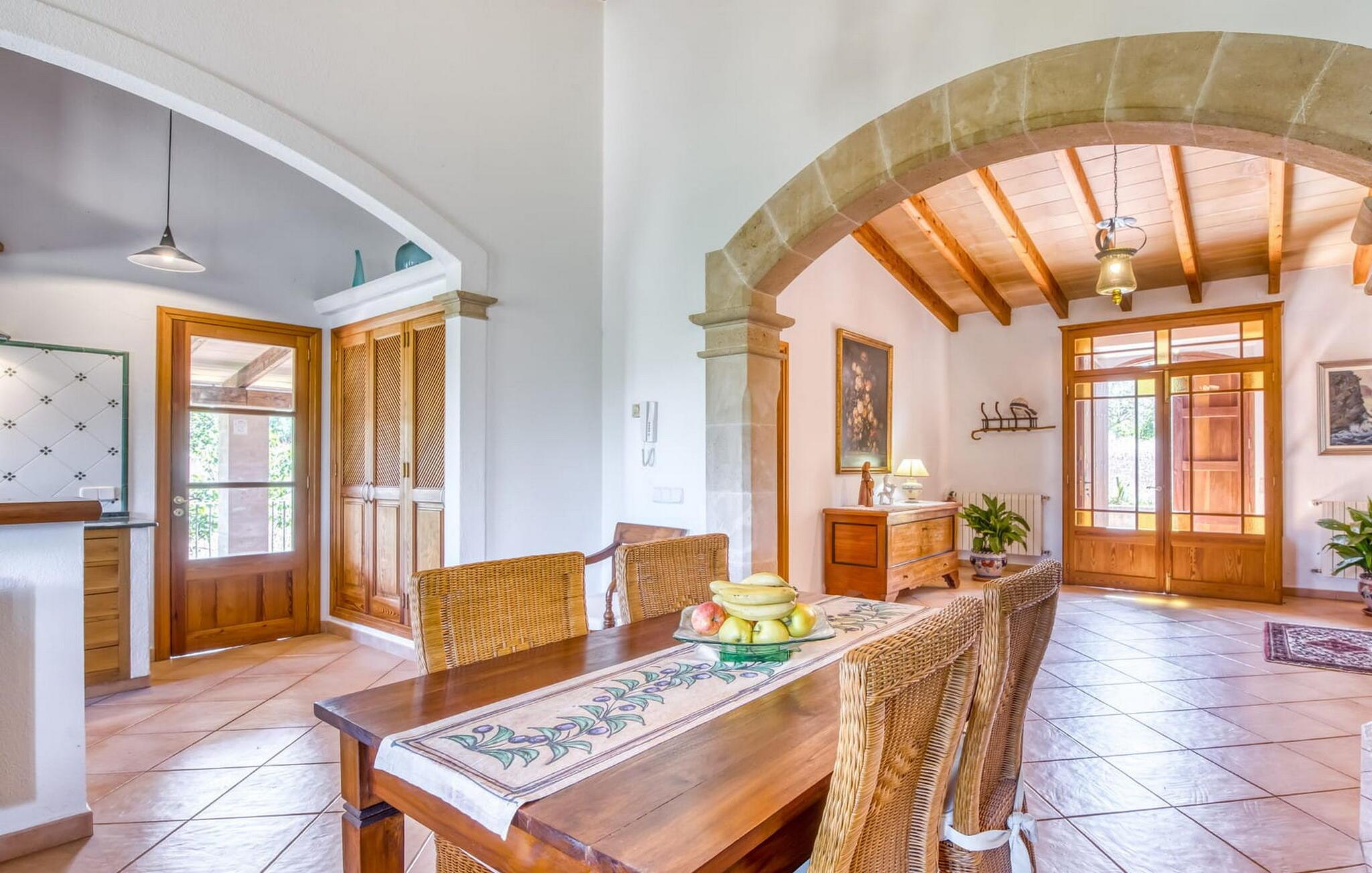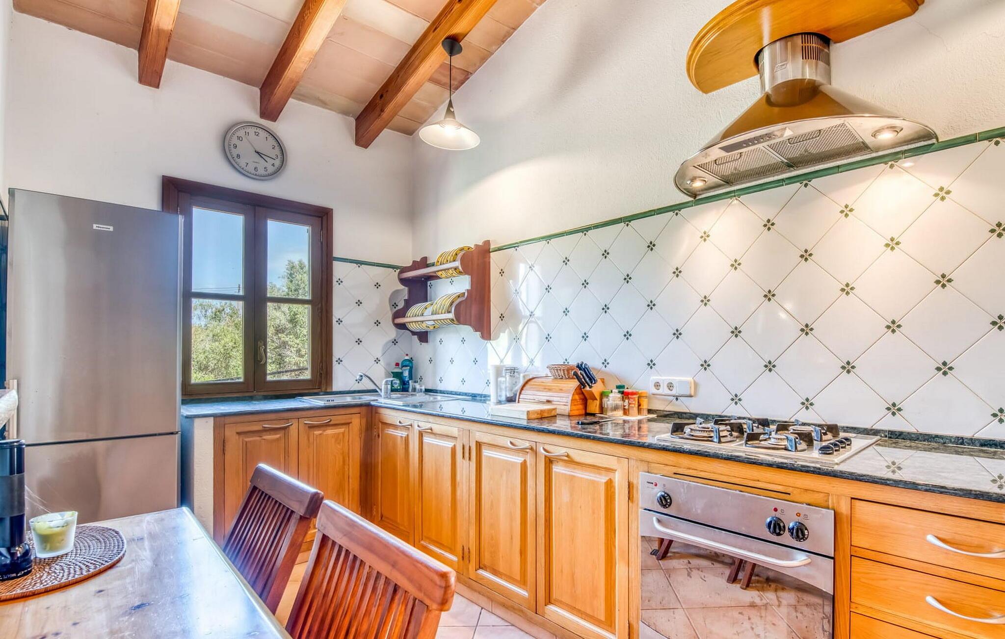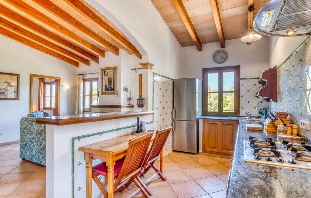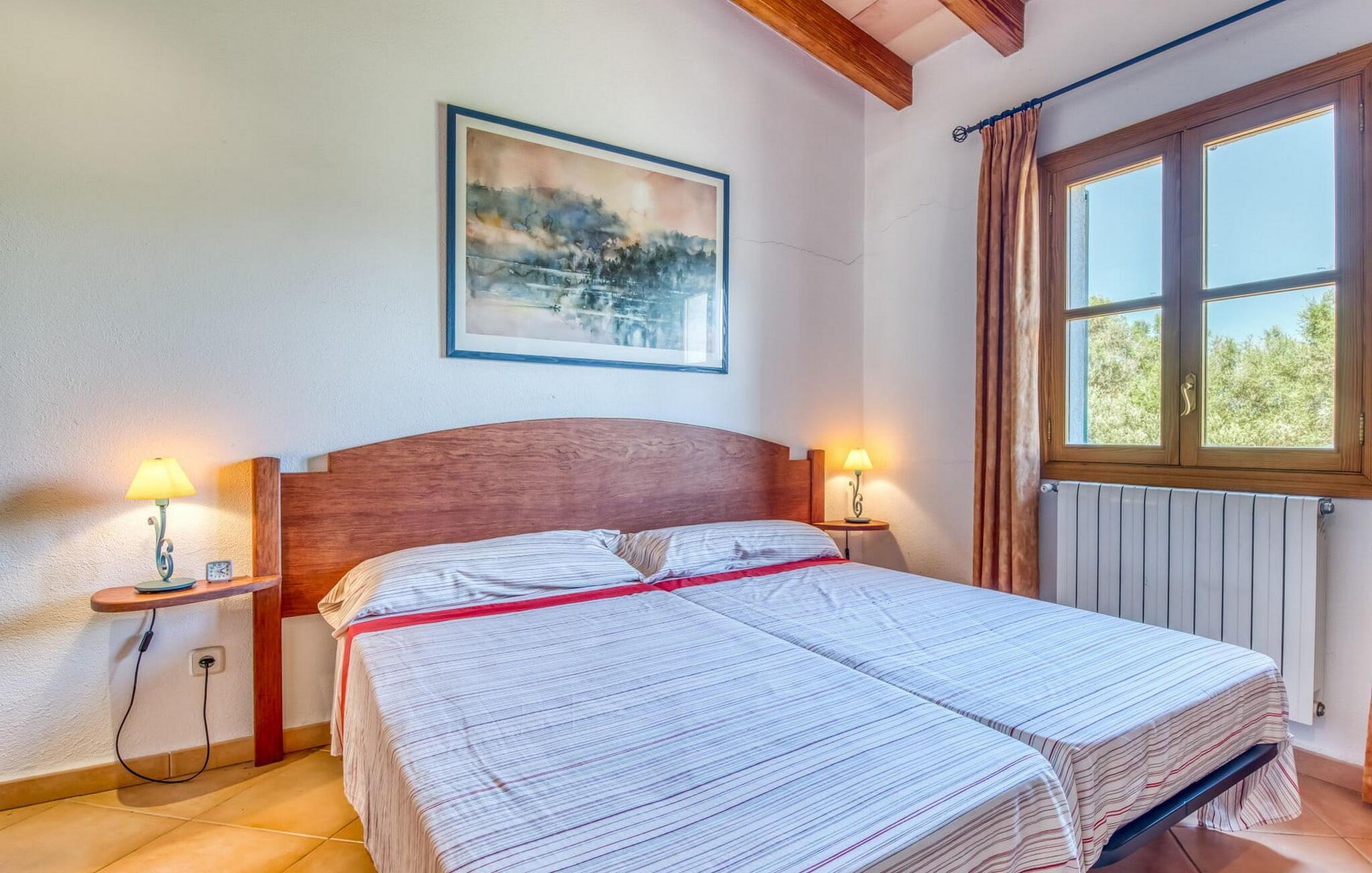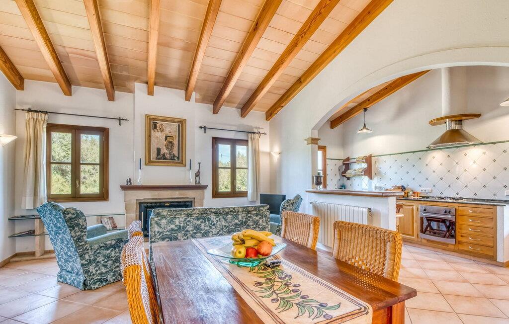 Denne bondegård i det smukke østlige Mallorca er et helt igennem idyllisk sted. Det er et ideelt hjem for alle, der elsker privatliv og nærhed til naturen og ønsker at være væk fra stress og jag på ferien. Et rustikt, delvist naturligt miljø skaber den atmosfære, hvor det er nemt at ankomme og slappe af. Åbne og overdækkede terrasseområder inviterer til at blive hængende. Afhængig af solens position kan jeres yndlingssteder ændre sig i løbet af dagen, og om aftenen inviterer grillen til at nyde en solid grill og en stemningsfuld afslutning. Den charmerende indretning af dette feriehus på Mallorca kan beskrives som værdigt og ret klassisk. Alle boligarealer er i ét plan og tilbyder fire feriegæster et rummeligt midlertidigt hjem. Den åbne stue-spisestue med integreret, fuldt udstyret køkken rummer forskellige behov og aktiviteter på samme tid og skaber en dejlig fællesskabsfølelse. På kølige aftener kan I sidde komfortabelt i sofa-lænestolsområdet foran pejsen eller se en god film i fjernsynet. Indendørs måltider kan også fejres sammen i det åbne rum - afstanden til køkkenet, hvorfra der er praktisk udgang til det fri, er behageligt kort. To hyggelige soveværelser med et badeværelse imellem skaber vidunderlige oaser af fred. Endnu et badeværelse fuldender boligkomforten i dette bondehus, som kan opvarmes til en behagelig temperatur året rundt. Bondegården "Can Carrio s'Estepar" er omgivet af bølgende bakker og ligger mindre end 3 km fra centrum af Son Serveras. I kan gøre jeres daglige indkøb i landsbyen og købe frisk mad på markedet om fredagen. På cirka 10 minutter i bil er I ved Costa del Pins, hvor I enten kan tilbringe en skøn dag ved havet eller spille golf. Den maleriske by Artà ligger 7,6 km derfra, hvor I kan slentre gennem smukke gader og få en bid mad på indbydende caféer og restauranter.