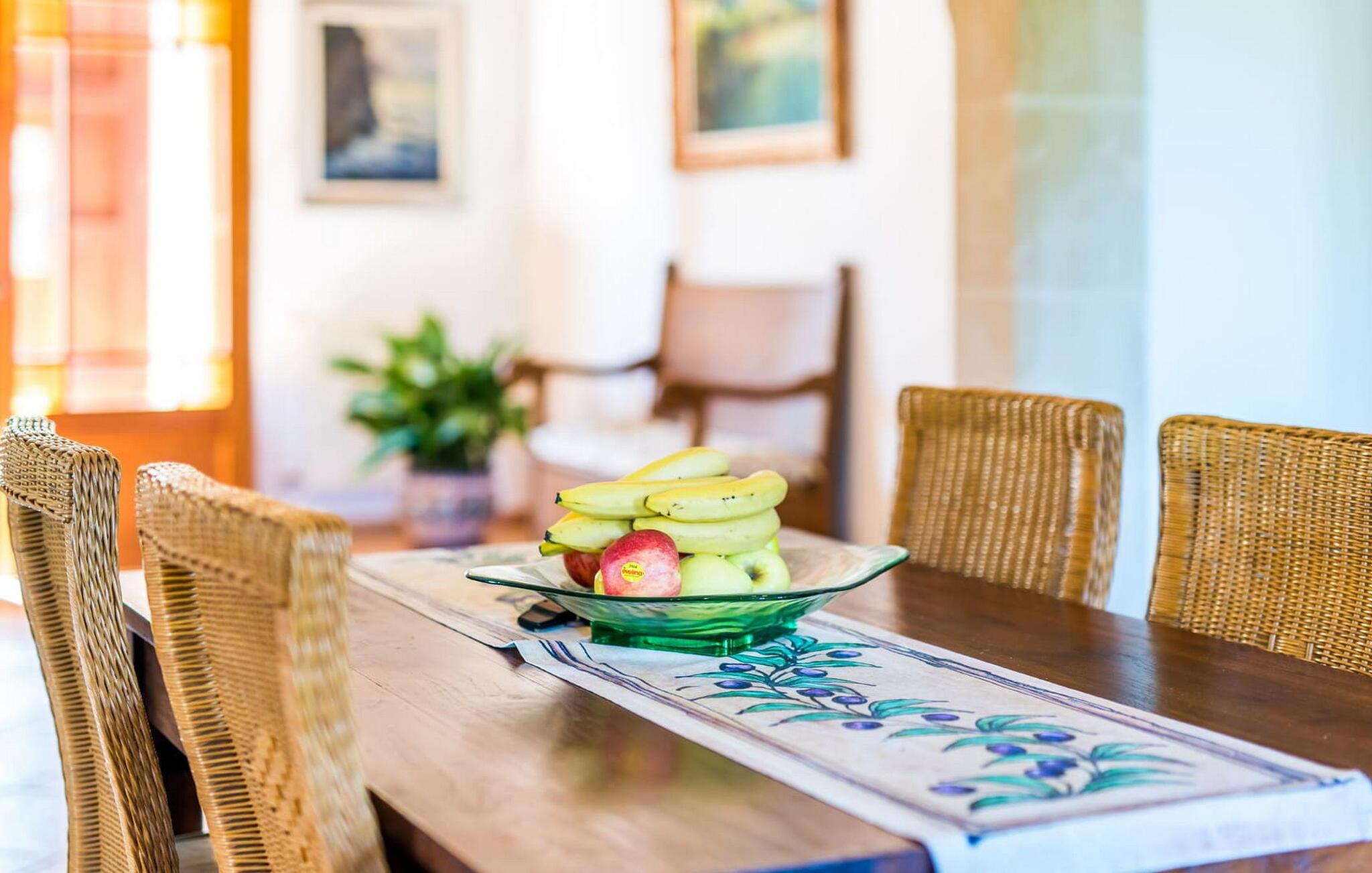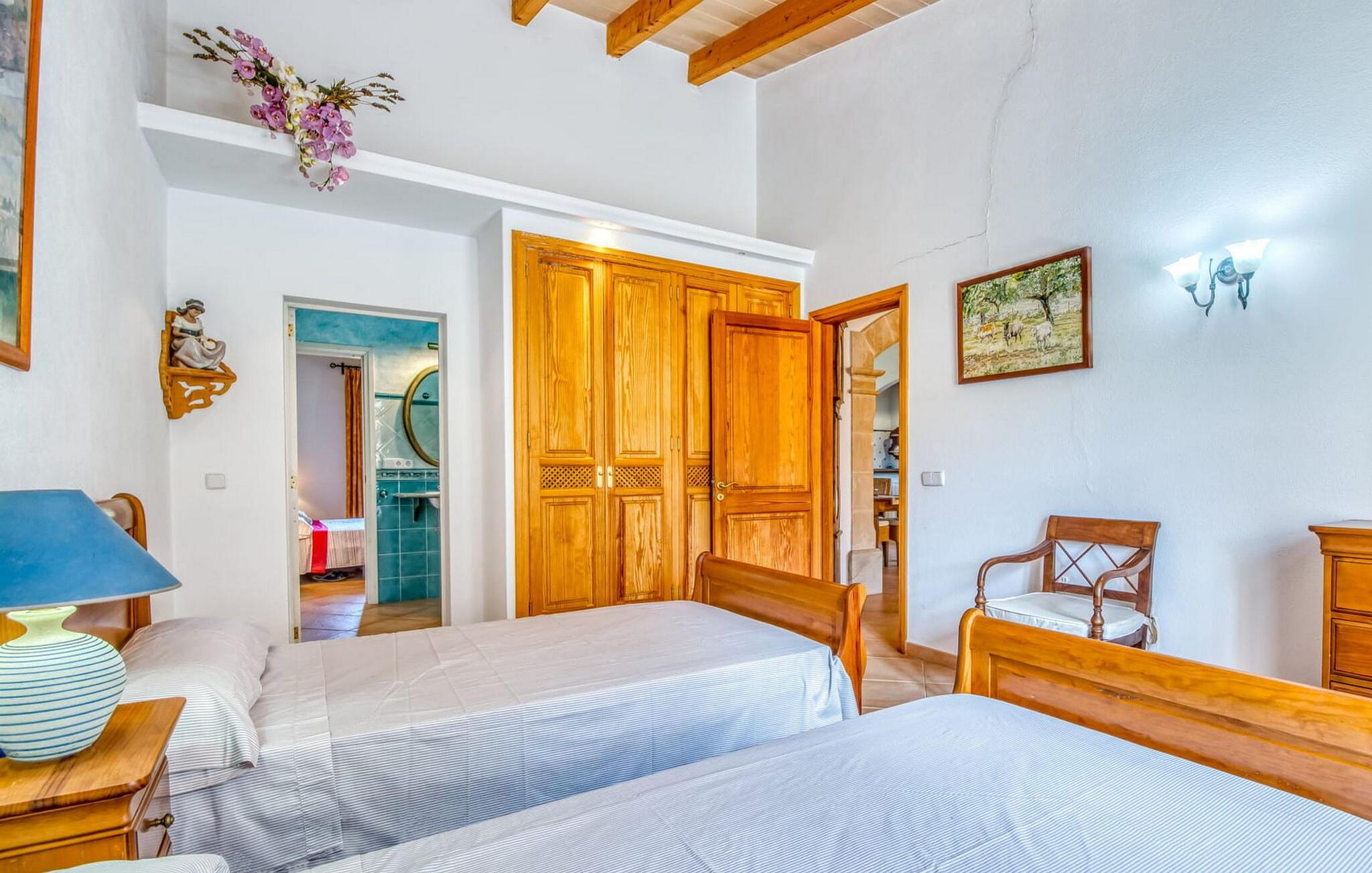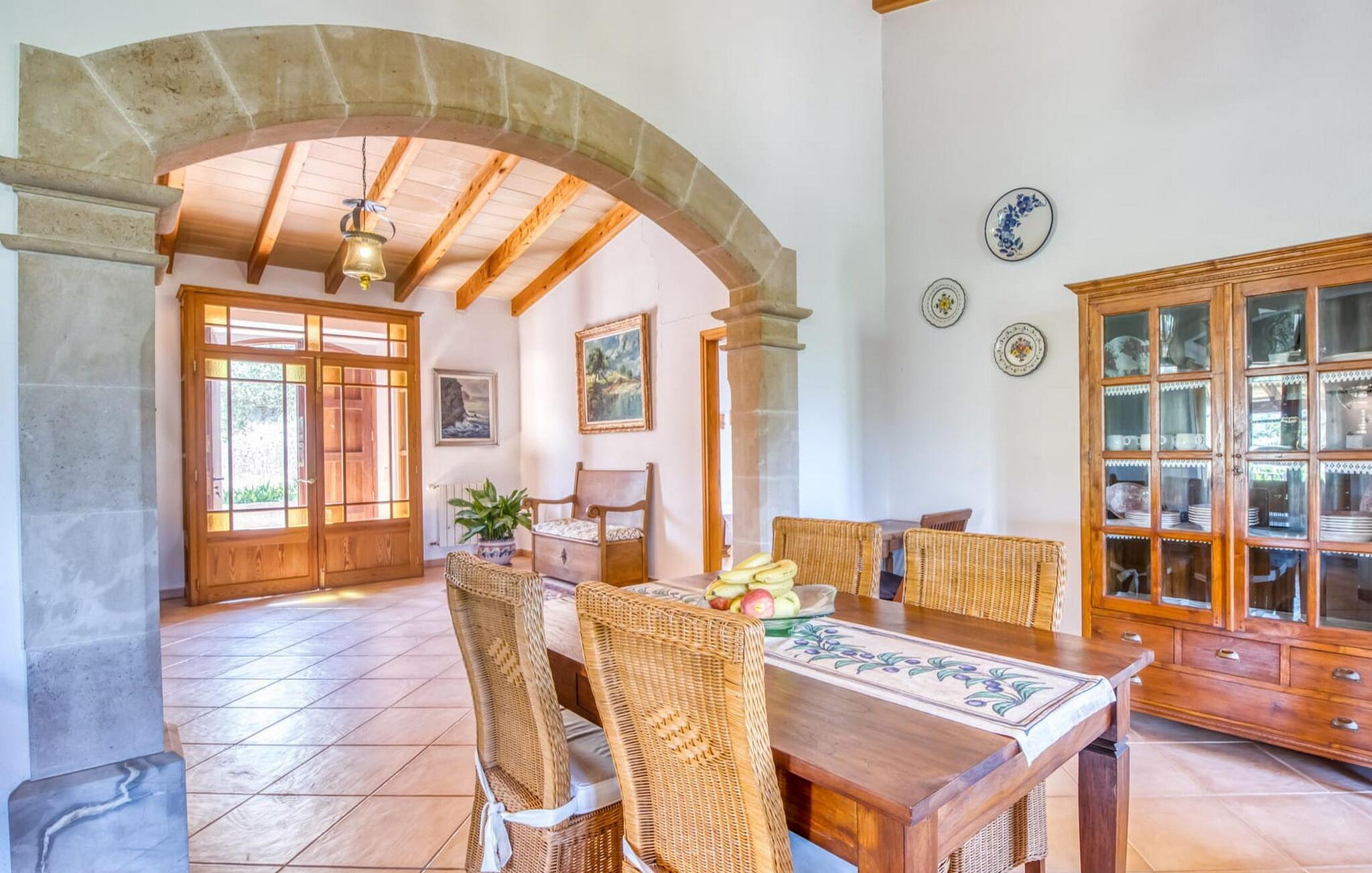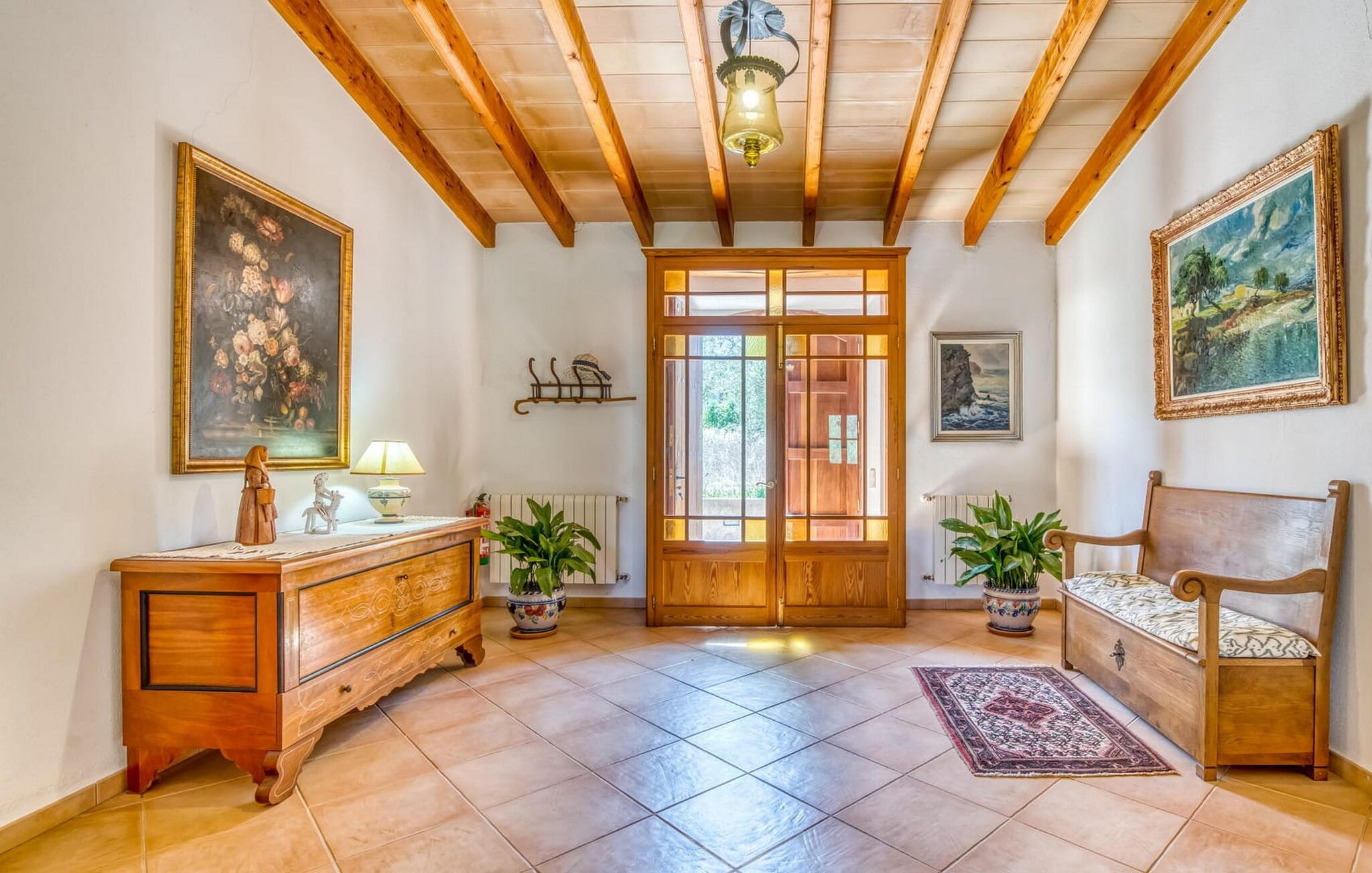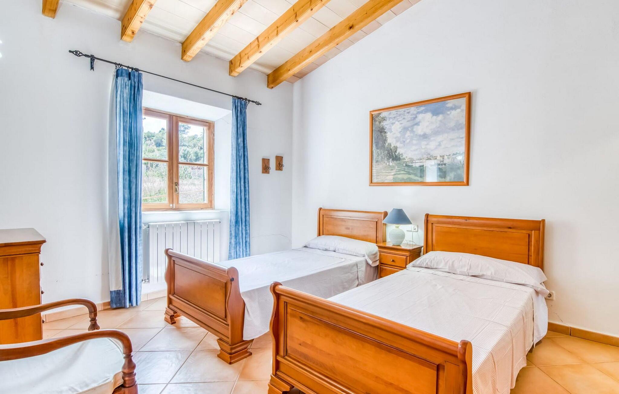 Denne bondegård i det smukke østlige Mallorca er et helt igennem idyllisk sted. Det er et ideelt hjem for alle, der elsker privatliv og nærhed til naturen og ønsker at være væk fra stress og jag på ferien. Et rustikt, delvist naturligt miljø skaber den atmosfære, hvor det er nemt at ankomme og slappe af. Åbne og overdækkede terrasseområder inviterer til at blive hængende. Afhængig af solens position kan jeres yndlingssteder ændre sig i løbet af dagen, og om aftenen inviterer grillen til at nyde en solid grill og en stemningsfuld afslutning. Den charmerende indretning af dette feriehus på Mallorca kan beskrives som værdigt og ret klassisk. Alle boligarealer er i ét plan og tilbyder fire feriegæster et rummeligt midlertidigt hjem. Den åbne stue-spisestue med integreret, fuldt udstyret køkken rummer forskellige behov og aktiviteter på samme tid og skaber en dejlig fællesskabsfølelse. På kølige aftener kan I sidde komfortabelt i sofa-lænestolsområdet foran pejsen eller se en god film i fjernsynet. Indendørs måltider kan også fejres sammen i det åbne rum - afstanden til køkkenet, hvorfra der er praktisk udgang til det fri, er behageligt kort. To hyggelige soveværelser med et badeværelse imellem skaber vidunderlige oaser af fred. Endnu et badeværelse fuldender boligkomforten i dette bondehus, som kan opvarmes til en behagelig temperatur året rundt. Bondegården "Can Carrio s'Estepar" er omgivet af bølgende bakker og ligger mindre end 3 km fra centrum af Son Serveras. I kan gøre jeres daglige indkøb i landsbyen og købe frisk mad på markedet om fredagen. På cirka 10 minutter i bil er I ved Costa del Pins, hvor I enten kan tilbringe en skøn dag ved havet eller spille golf. Den maleriske by Artà ligger 7,6 km derfra, hvor I kan slentre gennem smukke gader og få en bid mad på indbydende caféer og restauranter.