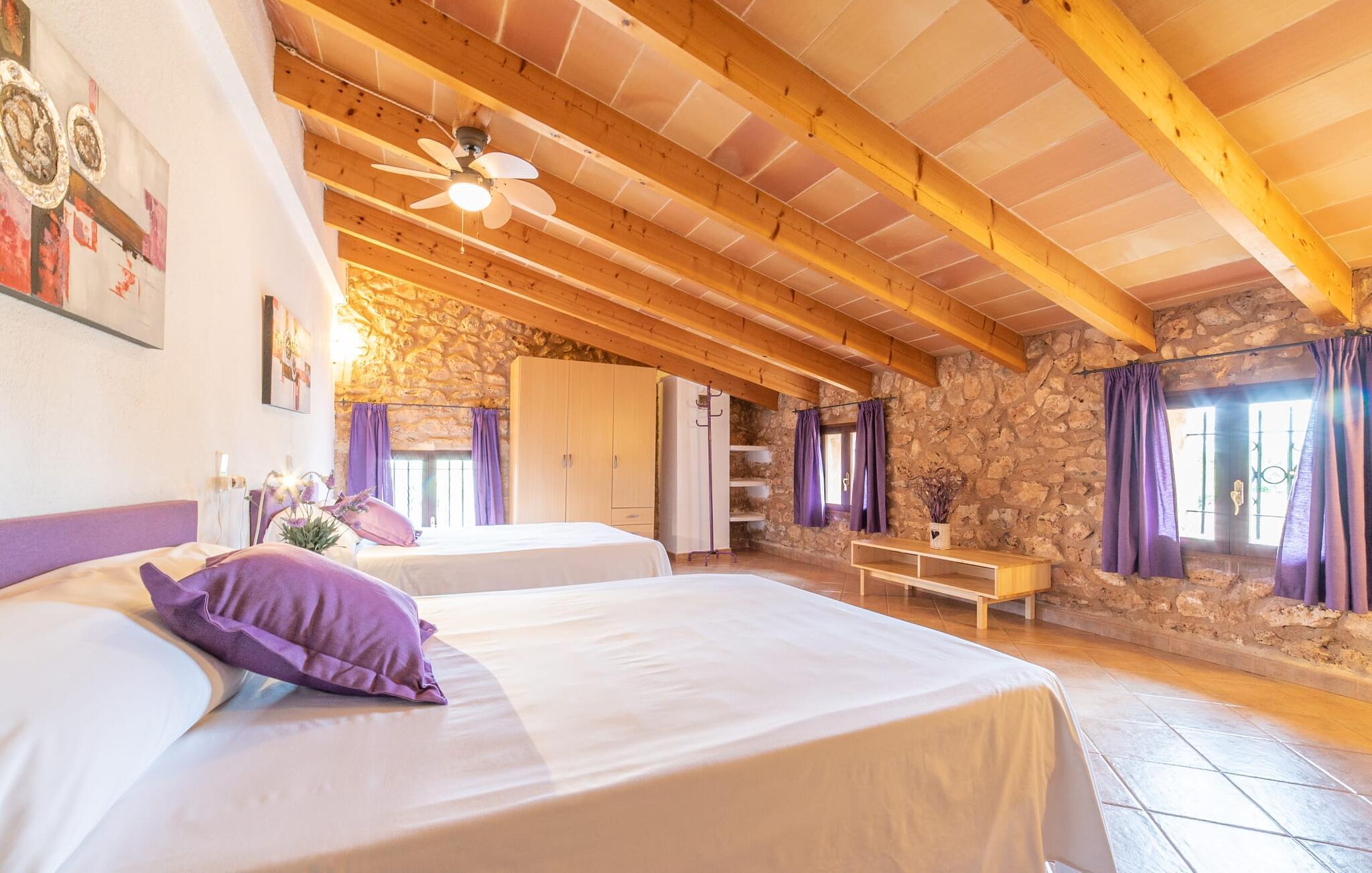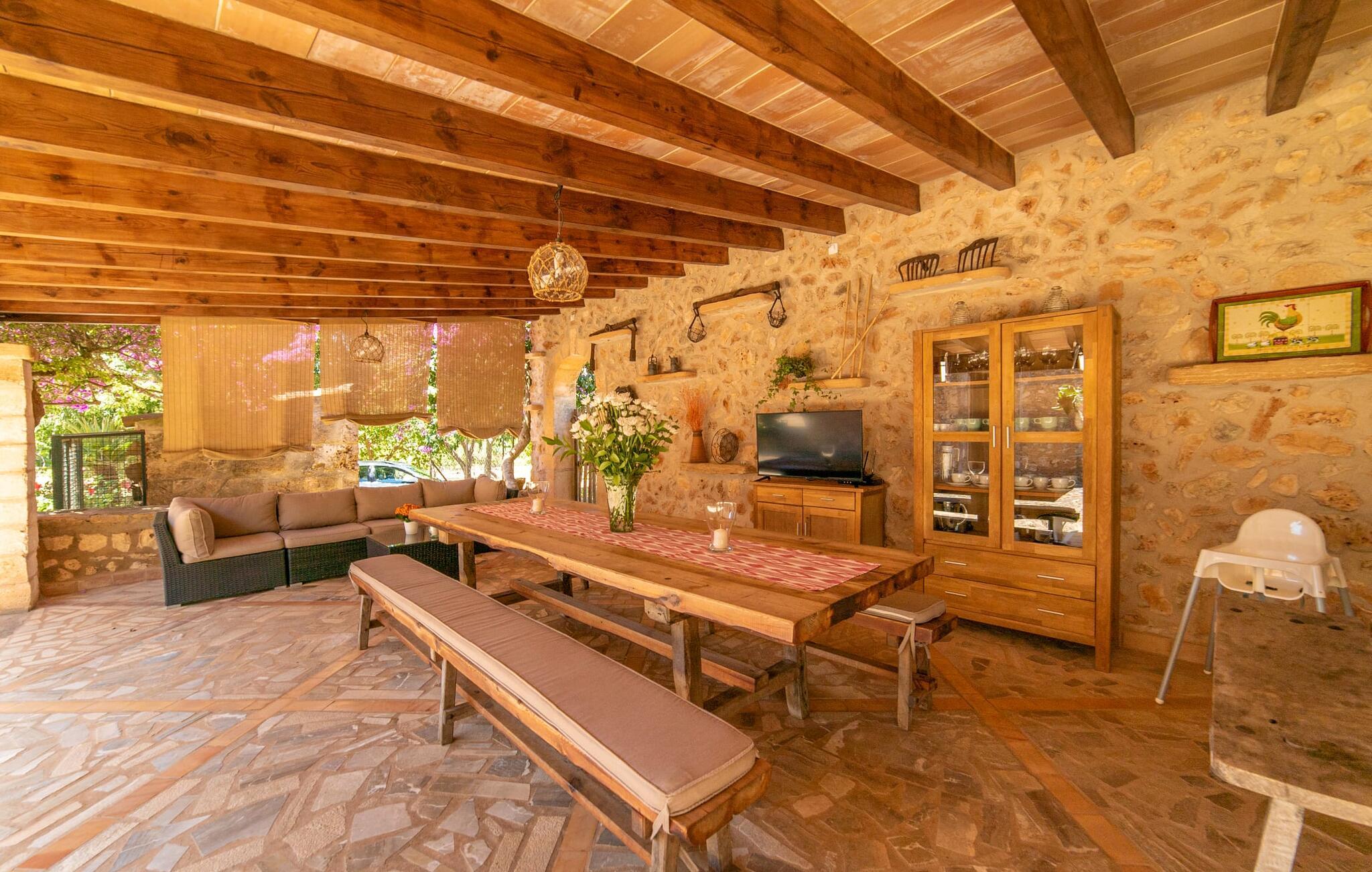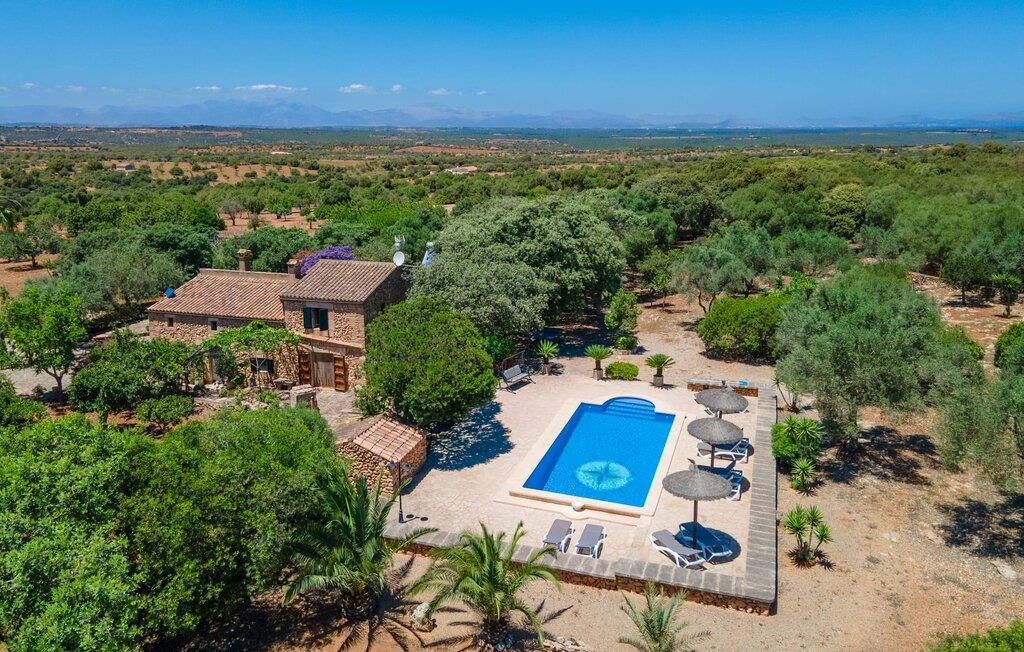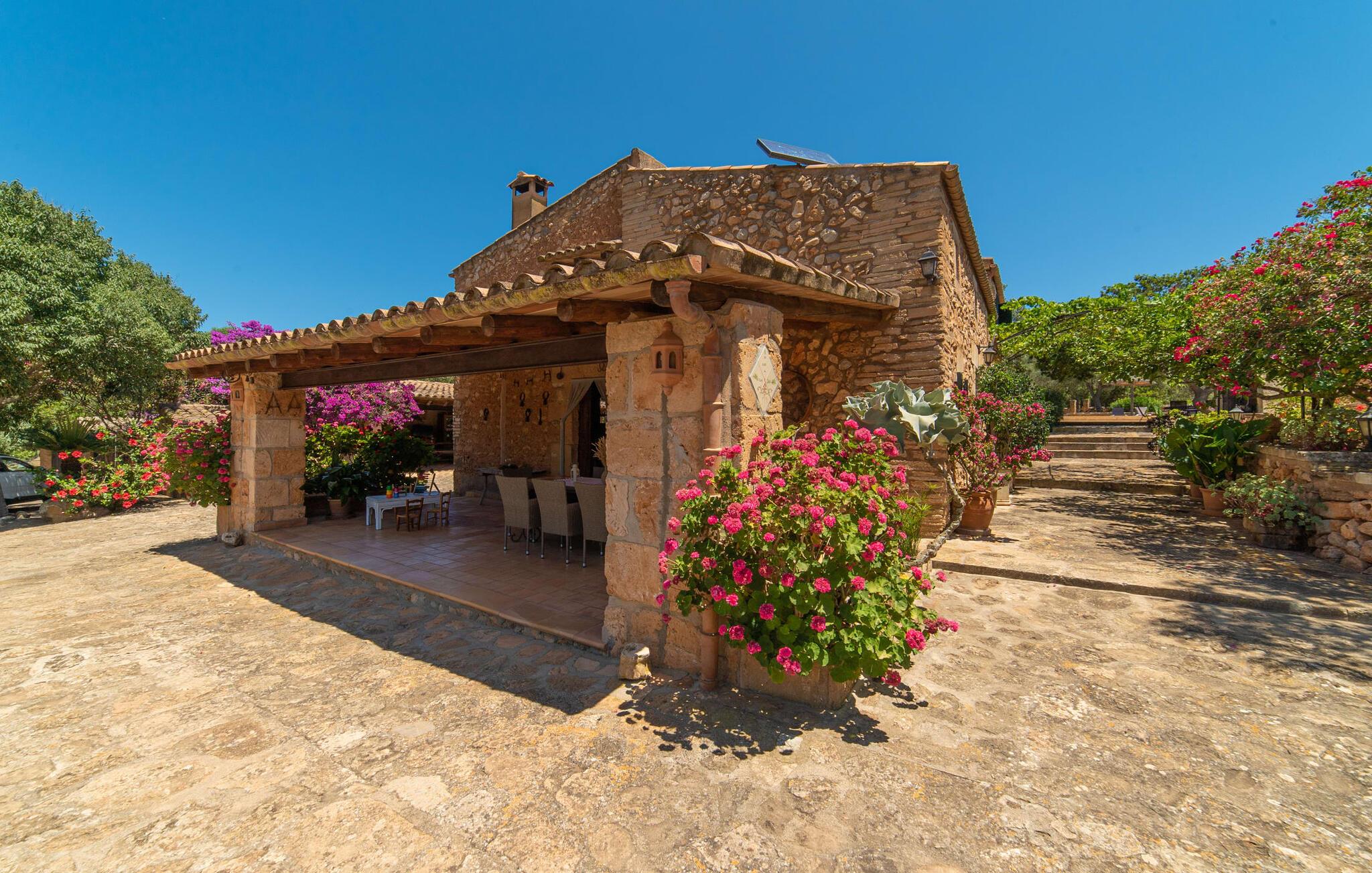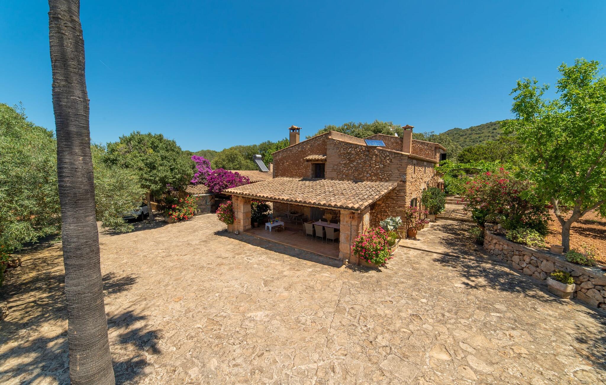 Velkommen til "Can Comes"-ejendommen, som er en afspejling af det ofte citerede "rigtige Mallorca". Murværket i den ærværdige bygning afslører den tidligere landbrugsmæssige anvendelse af villaen, som blev nænsomt omdannet til et moderne landsted af den venlige ejer. Ikke desto mindre "skinner fortidens fortryllende tradition igennem" i ejendommens design og indretningen med antikke memorabilia. Størrelsen af ejendommen alene er betagende: 140.000 m² jord - for besøgende betyder det absolut fred og den luksus at kunne tilbringe deres ferie med venner eller familie uden at skulle bekymre sig om naboer. Majestætiske oliventræer og forskellige frugttræer, hvis skygge giver dejlige siddepladser, omgiver huset med dets store grund, som omfatter en legeplads og en volleyballbane. Desuden skaber får, geder, høns, skildpadder og en hest - altid passet godt af ejeren - en vidunderlig landlig atmosfære. Ved siden af huset ligger et smukt designet poolområde, bestående af en stor pool med gennemarbejdede indlæg og en solterrasse med fast monterede bambusparasoller, som skaber et strejf af caribisk følelse, mens de sover på de ergonomisk formede liggestole. Der er i alt to overdækkede terrasser. Den ene ligger lige ved siden af huset og er indrettet med flotte kurvemøbler og vintage borde. Her kan I bruge en eftermiddag på at lege blandt de duftende bougainvilleaer. Det absolutte højdepunkt for udendørsfans er nok udekøkkenet af høj kvalitet, som er nyindrettet og endda har fjernsyn. Her kan I sidde i den kølige lounge eller ved det lange spisebord og nyde retterne tilberedt på murstensgrillen. Dette store sommerkøkken vil formentlig være omdrejningspunktet for alle rejsende, hvor I kan mødes når som helst på dagen, spise sammen, sludre og nyde et afslappet glas vin eller en kold øl. Husets stilfulde ydre giver allerede en idé om, hvad der venter jer inde i det mallorcanske bondehus: masser af atmosfære med synlige stenbrud, gamle træbjælker, nogle antikke møbler og dekorative genstande, der suppleres af nye. En lounge med tilhørende spiseplads skaber en meget hyggelig atmosfære, som I kan nyde i det lyse sofahjørne foran pejsen. Det rustikke køkken er ligeledes smagfuldt præsenteret og har bevaret sit autentiske flair med en original keramisk vask, en tidligere åben pejs og håndmalede klinker. Trods den rustikke karakter finder I her også moderne komfort, hvilket det store gaskomfur blot er et eksempel på. Huset byder på i alt 5 soveværelser i huset, som er fordelt på to plan. Nogle af dem har et jordisk præg, der passer til husets alder. Der er tre ultramoderne soveværelser ovenpå. Sengestørrelserne varierer mellem enkelt- og dobbeltsenge og er mellem 90 og 110 cm og i det franske format 135 og endda 150 cm. Attraktivt designede badeværelser med badekar eller bruser giver den hyggelige indretning i det smukke bondehus et behageligt, naturligt udseende. Placeringen af villaen er fænomenal, da den er tæt på Manacor, en af de største byer på øen, hvis navn oversættes som "hånd på hjertet". Dette er et vidunderligt sted at shoppe, ikke kun til jeres daglige behov, men også til aftengrillen. På den anden side kan I nyde nærheden til de smukke sandstrande i Alcúdia-bugten. På grund af sin centrale beliggenhed er "Can Comes" et vidunderligt udgangspunkt for en varieret ferie, og selv efter hjemkomsten fra udflugter, vil I altid sætte pris på den autentiske ejendoms absolutte fred og ro. Det efterlod et varigt indtryk på Fincallorca-holdet. Den charmerende, traditionelle ejendom Villa "Can Comes" er beliggende i en smuk naturlig beliggenhed mellem Manacor og fiskerlandsbyen Colonia de Sant Pere. Manacor, øens tredjestørste by, byder på shoppingmuligheder, herunder et farverigt ugentligt marked om mandagen. Kystbyen Colonia St. Pere med dens bystrand og en lille strandpromenade med restauranter ligger også kun 13 km væk. Smukkere sandstrande kan findes langs den 16 km lange Alcúdia-bugt.