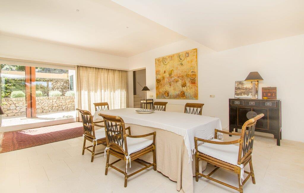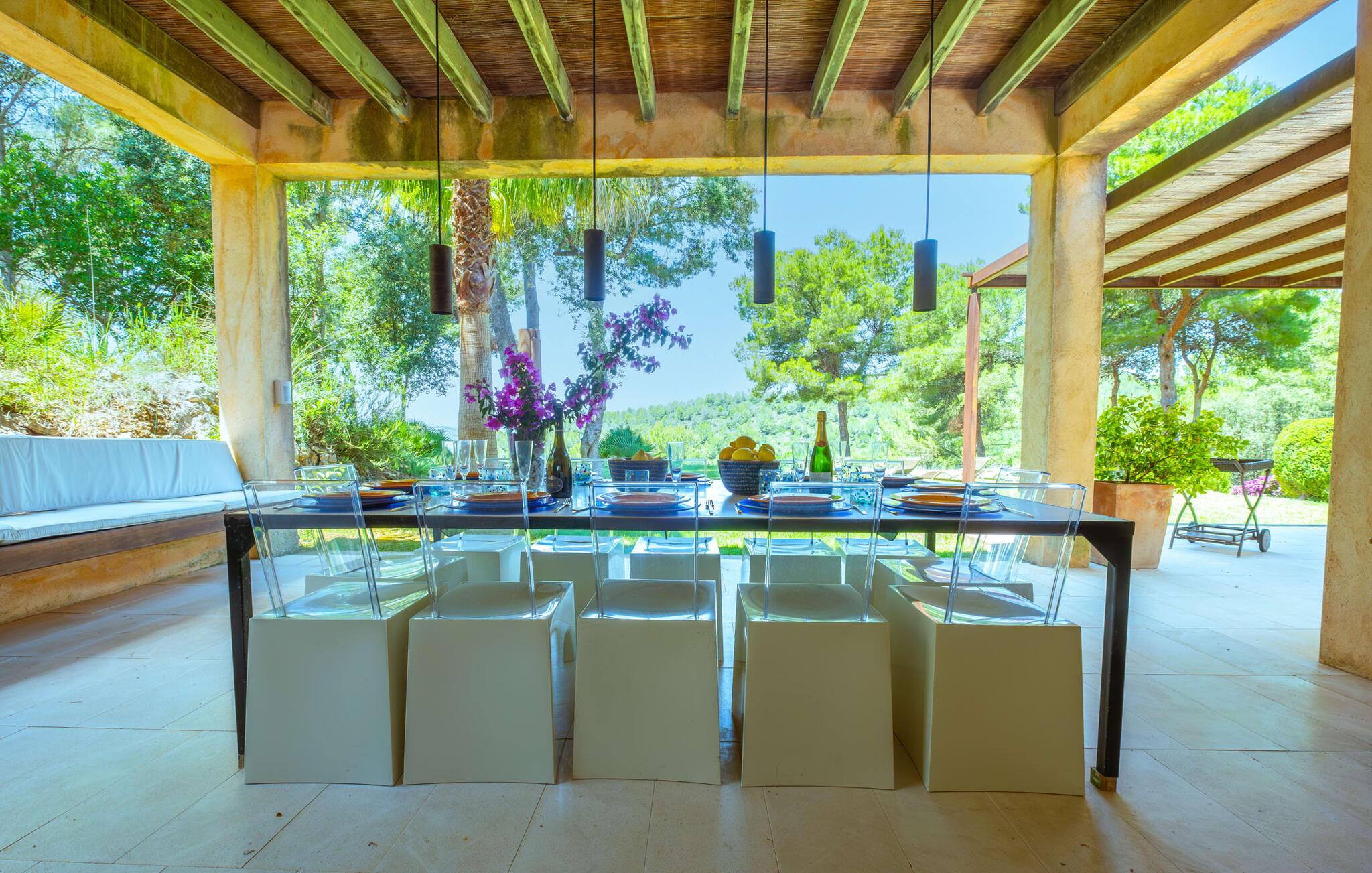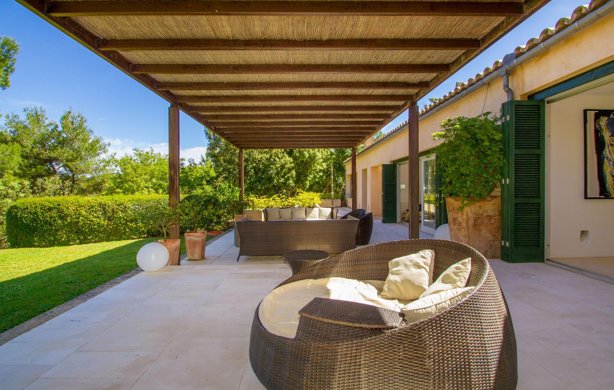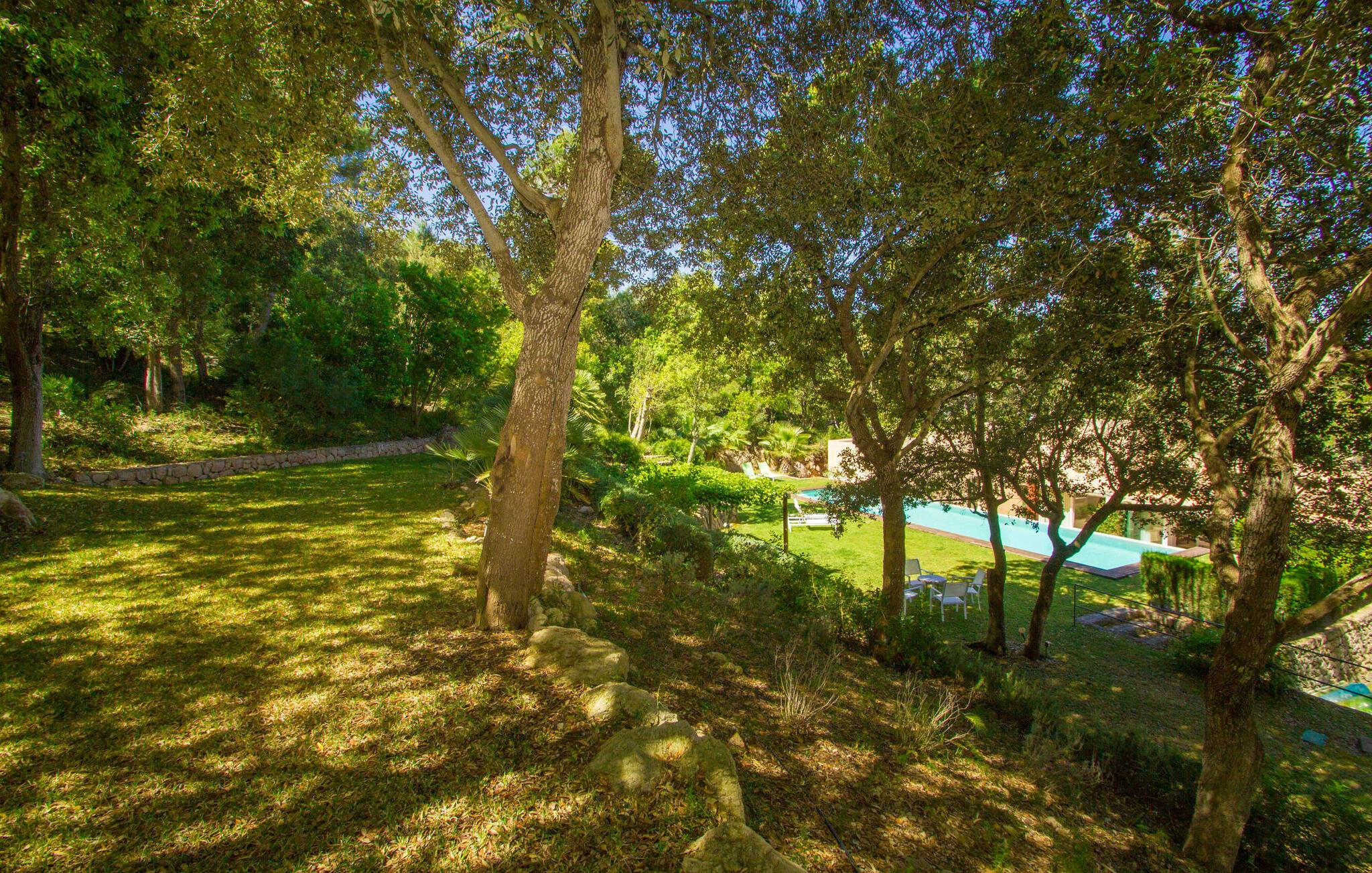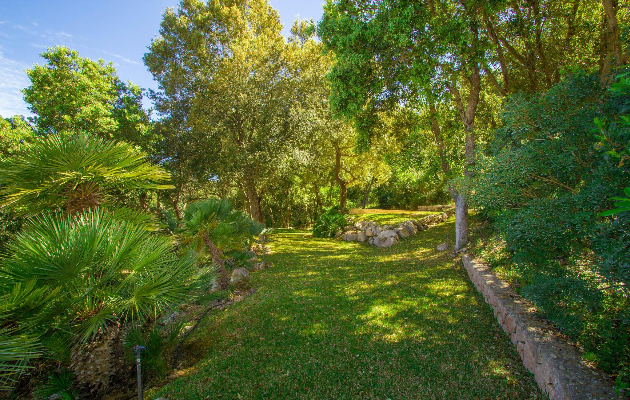 Den vildt romantiske villa "Can Eretat" med sin særligt rummelige have er et absolut højdepunkt i vores program: Små landeveje fører jer til den store ejendom, som er omgivet af bølgende bakker og vidunderligt duftende fyrreskove. Loungeterrasselandskabet er uden sidestykke: lige ved siden af huset kan I slappe af af hjertens lyst på komfortable møbler og nyde udsigten til græsplænen, vegetationen bagved og det smukke landskab. Fra dette plateau når man et lavere niveau via gamle stentrappe, hvor der er en have med et bordtennisbord foran soveværelserne. Den indre gårdhave er også meget flot udformet med en markant okkerfarvet stele, som i kombination med den moderne husfacade giver dette område stemningen af et stilrent kunstmuseum. Små træer skaber også en hyggelig atmosfære. Lige så attraktiv er poolen, som også er indlejret i frodige græsplæner og også er velegnet til ambitiøse svømmere på grund af sine generøse dimensioner. Foran middelhavsskovens kulisse med klippeformationer kan I svømme jeres omgange i fred og ro og derefter slappe af på en af liggestolene. Eller I kan placere jer på trækanten af poolen og lade benene dingle i det forfriskende vand for en stund. Det varierede udeareal indbyder til kortere barfodsture – en fest for sanserne. I kan også toppe det med grillen. Husets indretning på stejlt terræn er lige så rummelig og delvist overdådig: Værelserne byder på meget plads, hvilket har en positiv effekt på atmosfæren. Her har jeres tanker plads til at udfolde sig. Det udsøgte kunstværk, inklusive moderne malerier og statuer, vil løfte jeres humør og oplive de samtaler, I kan have i denne ekstravagante stue. Pejsen er åben på begge sider, så I kan nyde ildens hyggelige knitren fra en af de rummelige sofaer samt ved spisebordet. Herfra kan I komme til husets bibliotek og det ultramoderne køkken, som lever op til de højeste standarder, via en trappe. Det muntre skær fra et gult kunstværk stråler ind i rummet og varmer jeres hjerte og sjæl tidligt om morgenen under morgenmaden i køkkenets siddeområde. I har endda jeres eget vaskerum. Et stort dobbeltværelse med baldakin, walk-in-closet og en-suite badeværelse er også placeret på denne etage, og besøgende kan også forfriske sig på et gæstetoilet. De fire resterende soveværelser ligger en etage under: Her kan I forvente tre dobbeltværelser - hvoraf det ene har eget badeværelse. Soveværelserne er for det meste indrettet i hvidt og har desuden hyggelige detaljer som et skrivebord, så I kan føle, at I er på et eksklusivt hotel under hele jeres ophold. Badeværelset på soveplan har også badekar. Det har en golf driving range, og ejeren vil give jer et sæt golfkøller til gratis træning. Villaen "Can Eretat", som ligger i den nordøstlige del af øen, giver jer et område, hvor I kan rave om smukke bugter. som den omkring 8 km væk inviterer "Cala Mesquida" jer. Ikke alene udstråler Capdepera en fremragende middelhavsatmosfære med sit livlige marked om onsdagen, de små gader er også perfekte til at slentre og udforske. I kan nå middelalderbyen Artà med jeres lejebil på cirka femten minutter; Der kan I for eksempel besøge de imponerende drypstenshuler "Coves des Artà". Den pulserende kystby Cala Ratjada er det rigtige sted for jer, hvis I vil feste til langt ud på natten. Når I vender tilbage til Villa "Can Eretat", vil I sætte endnu mere pris på den vidunderlige stilhed, der omgiver jer. Beliggende midt i det grønne, tilbyder villaen "Can Eretat" de bedste betingelser for en afslappende ferie: en gåtur gennem frodige grønne bakker tager jer til havet, kun 2 km væk. Middelalderbyen Capdepera, hvor I kan tage en rundtur på det majestætiske slot, ligger kun 3 km væk. Derfra er der kun et stenkast til det pulserende Cala Ratjada, hvor vandrere og natugler får noget for pengene.