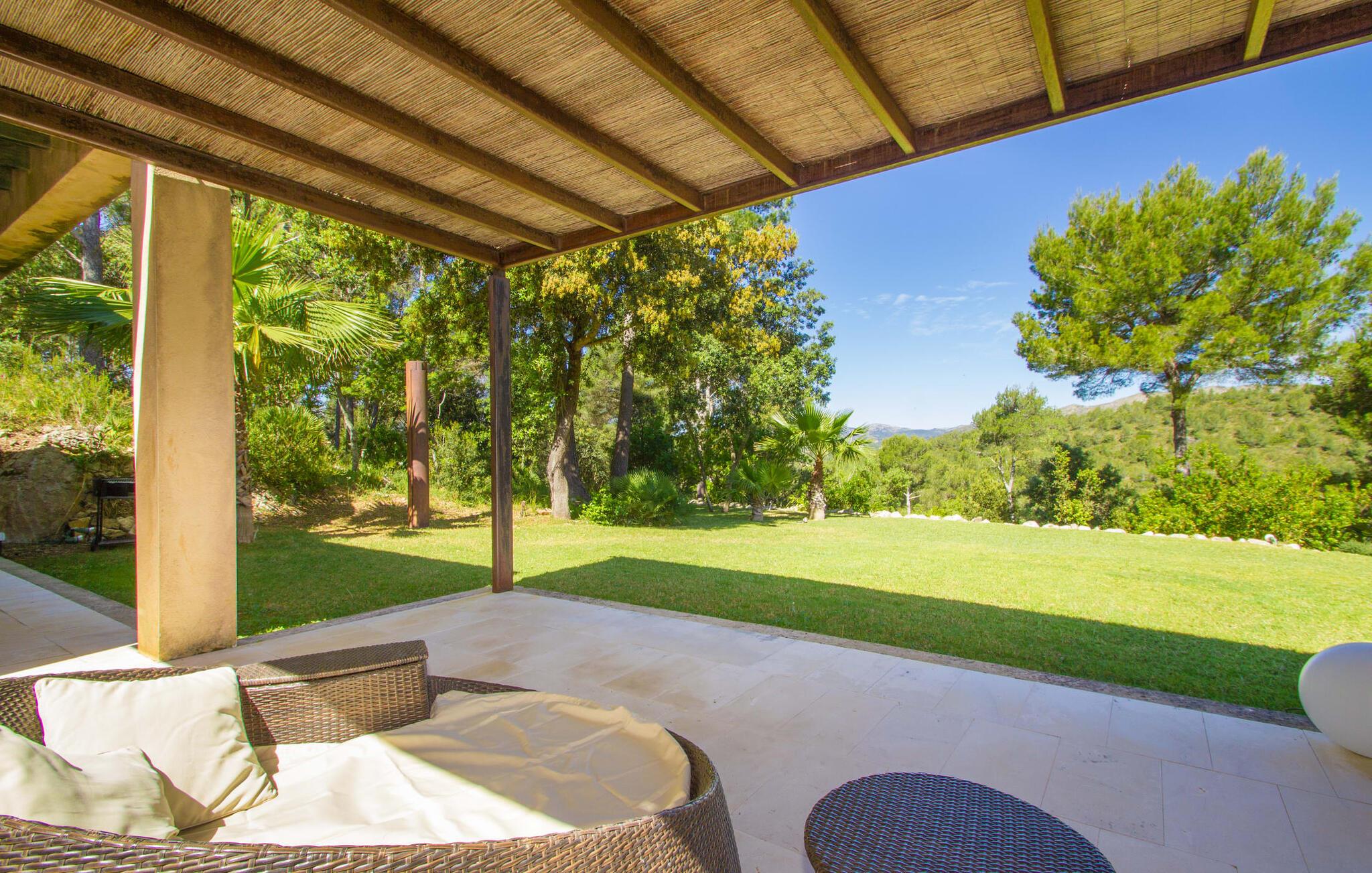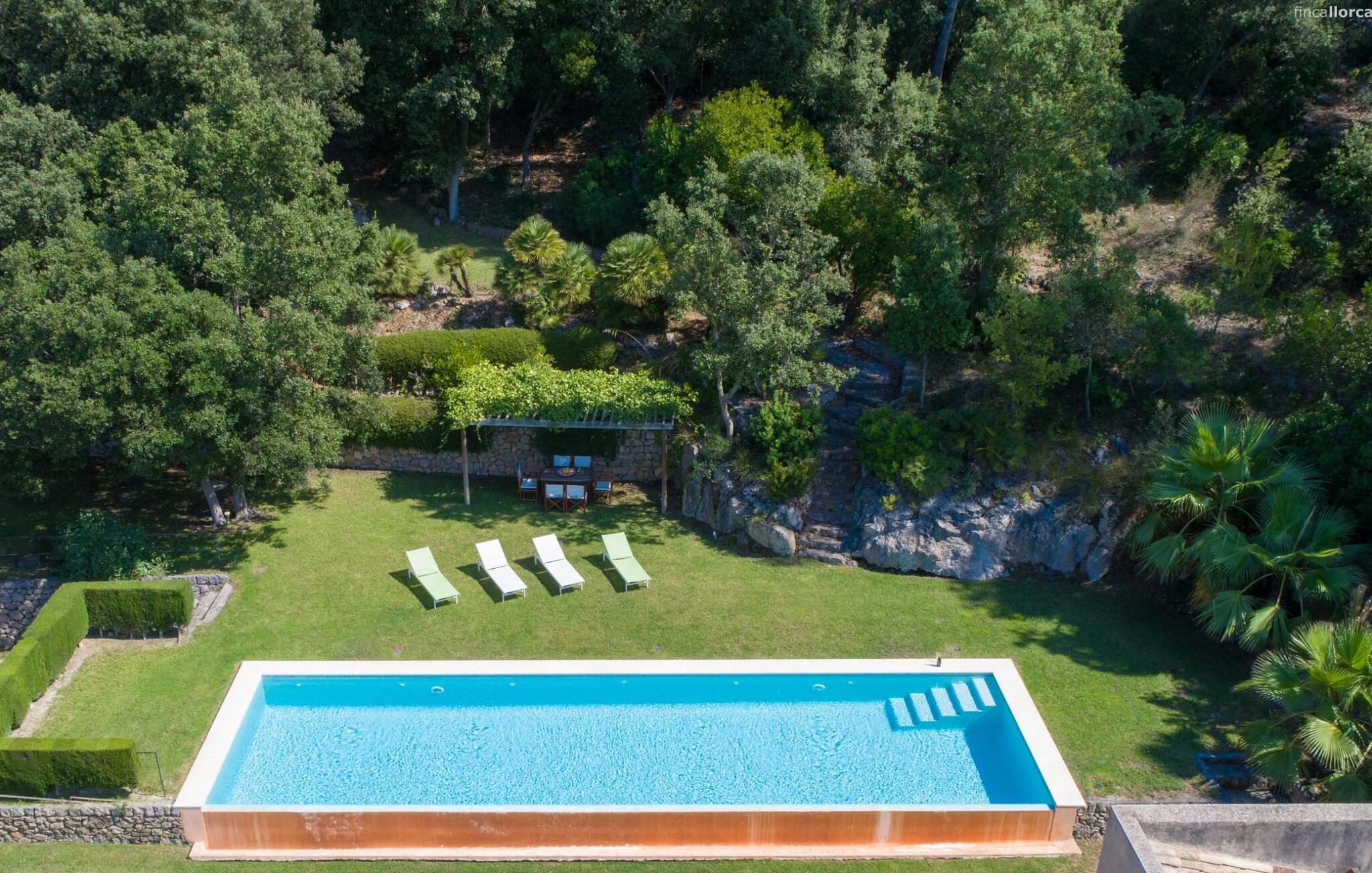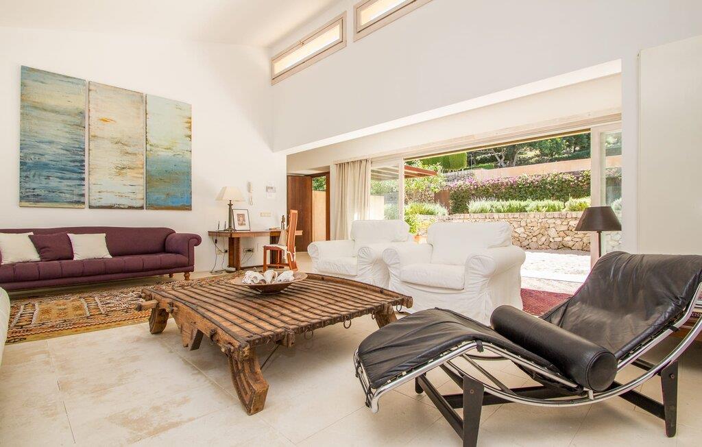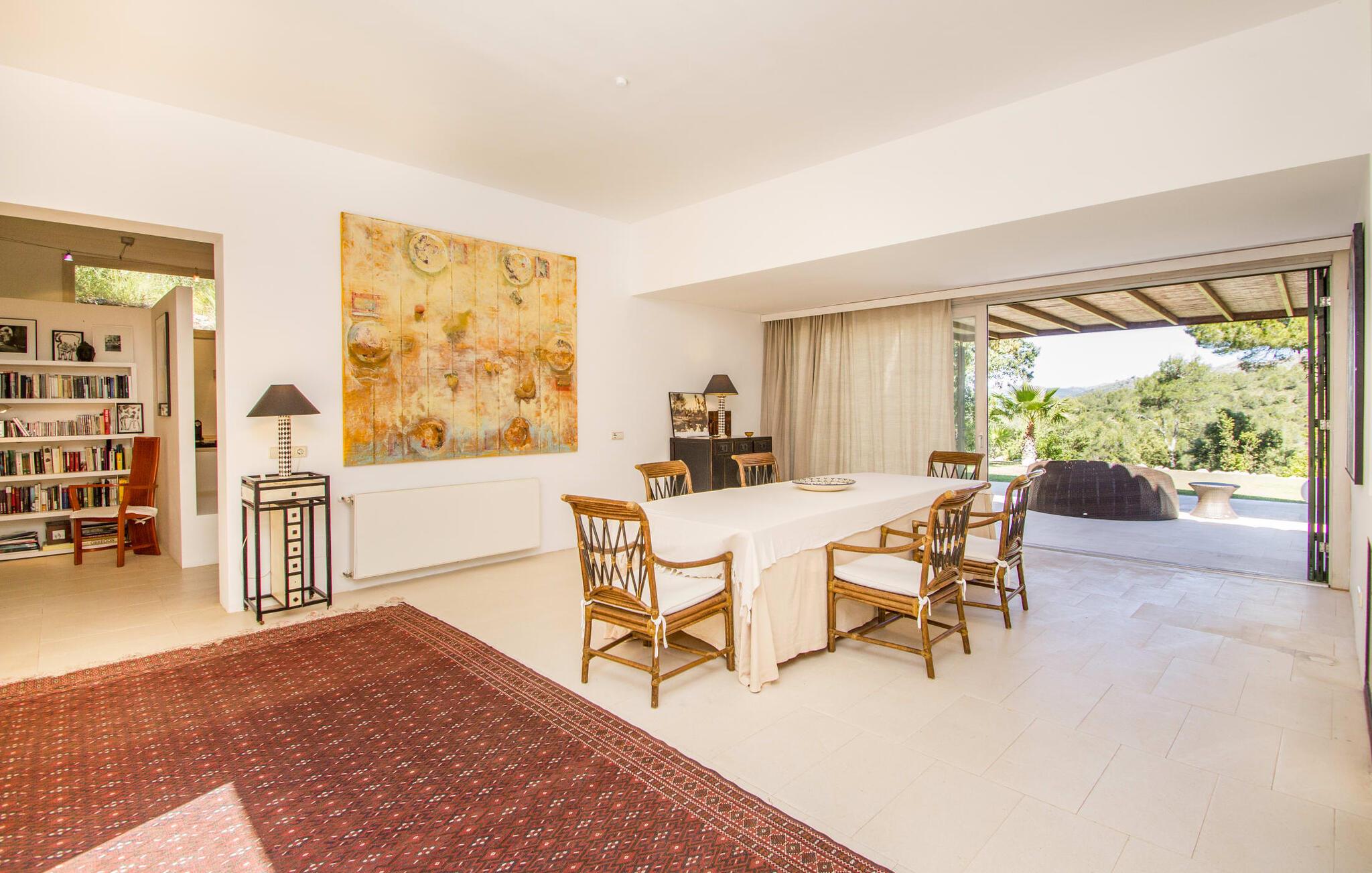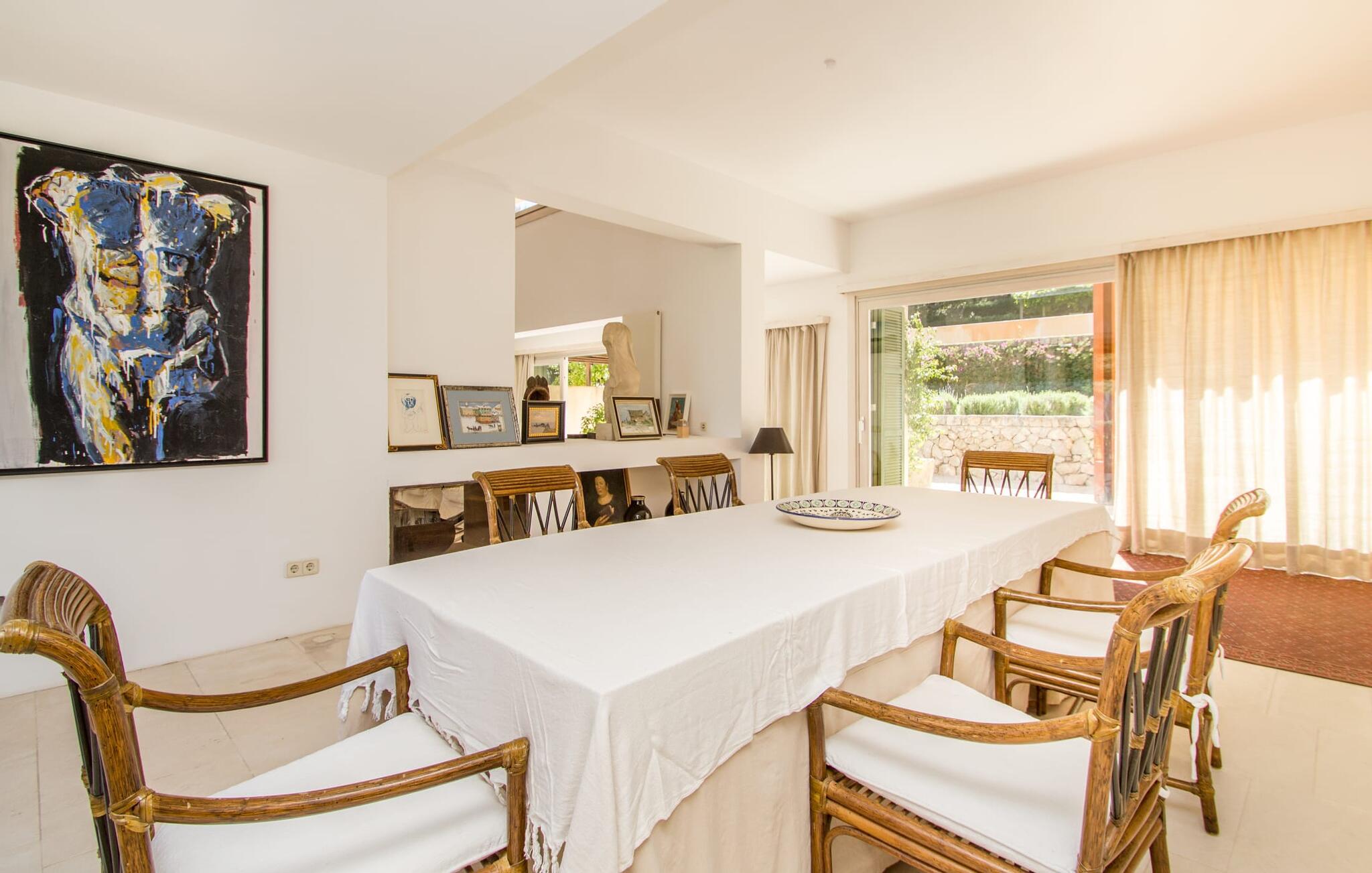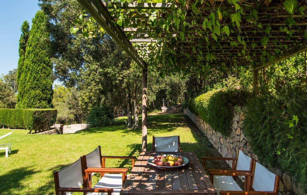 Den vildt romantiske villa "Can Eretat" med sin særligt rummelige have er et absolut højdepunkt i vores program: Små landeveje fører jer til den store ejendom, som er omgivet af bølgende bakker og vidunderligt duftende fyrreskove. Loungeterrasselandskabet er uden sidestykke: lige ved siden af huset kan I slappe af af hjertens lyst på komfortable møbler og nyde udsigten til græsplænen, vegetationen bagved og det smukke landskab. Fra dette plateau når man et lavere niveau via gamle stentrappe, hvor der er en have med et bordtennisbord foran soveværelserne. Den indre gårdhave er også meget flot udformet med en markant okkerfarvet stele, som i kombination med den moderne husfacade giver dette område stemningen af et stilrent kunstmuseum. Små træer skaber også en hyggelig atmosfære. Lige så attraktiv er poolen, som også er indlejret i frodige græsplæner og også er velegnet til ambitiøse svømmere på grund af sine generøse dimensioner. Foran middelhavsskovens kulisse med klippeformationer kan I svømme jeres omgange i fred og ro og derefter slappe af på en af liggestolene. Eller I kan placere jer på trækanten af poolen og lade benene dingle i det forfriskende vand for en stund. Det varierede udeareal indbyder til kortere barfodsture – en fest for sanserne. I kan også toppe det med grillen. Husets indretning på stejlt terræn er lige så rummelig og delvist overdådig: Værelserne byder på meget plads, hvilket har en positiv effekt på atmosfæren. Her har jeres tanker plads til at udfolde sig. Det udsøgte kunstværk, inklusive moderne malerier og statuer, vil løfte jeres humør og oplive de samtaler, I kan have i denne ekstravagante stue. Pejsen er åben på begge sider, så I kan nyde ildens hyggelige knitren fra en af de rummelige sofaer samt ved spisebordet. Herfra kan I komme til husets bibliotek og det ultramoderne køkken, som lever op til de højeste standarder, via en trappe. Det muntre skær fra et gult kunstværk stråler ind i rummet og varmer jeres hjerte og sjæl tidligt om morgenen under morgenmaden i køkkenets siddeområde. I har endda jeres eget vaskerum. Et stort dobbeltværelse med baldakin, walk-in-closet og en-suite badeværelse er også placeret på denne etage, og besøgende kan også forfriske sig på et gæstetoilet. De fire resterende soveværelser ligger en etage under: Her kan I forvente tre dobbeltværelser - hvoraf det ene har eget badeværelse. Soveværelserne er for det meste indrettet i hvidt og har desuden hyggelige detaljer som et skrivebord, så I kan føle, at I er på et eksklusivt hotel under hele jeres ophold. Badeværelset på soveplan har også badekar. Det har en golf driving range, og ejeren vil give jer et sæt golfkøller til gratis træning. Villaen "Can Eretat", som ligger i den nordøstlige del af øen, giver jer et område, hvor I kan rave om smukke bugter. som den omkring 8 km væk inviterer "Cala Mesquida" jer. Ikke alene udstråler Capdepera en fremragende middelhavsatmosfære med sit livlige marked om onsdagen, de små gader er også perfekte til at slentre og udforske. I kan nå middelalderbyen Artà med jeres lejebil på cirka femten minutter; Der kan I for eksempel besøge de imponerende drypstenshuler "Coves des Artà". Den pulserende kystby Cala Ratjada er det rigtige sted for jer, hvis I vil feste til langt ud på natten. Når I vender tilbage til Villa "Can Eretat", vil I sætte endnu mere pris på den vidunderlige stilhed, der omgiver jer. Beliggende midt i det grønne, tilbyder villaen "Can Eretat" de bedste betingelser for en afslappende ferie: en gåtur gennem frodige grønne bakker tager jer til havet, kun 2 km væk. Middelalderbyen Capdepera, hvor I kan tage en rundtur på det majestætiske slot, ligger kun 3 km væk. Derfra er der kun et stenkast til det pulserende Cala Ratjada, hvor vandrere og natugler får noget for pengene.