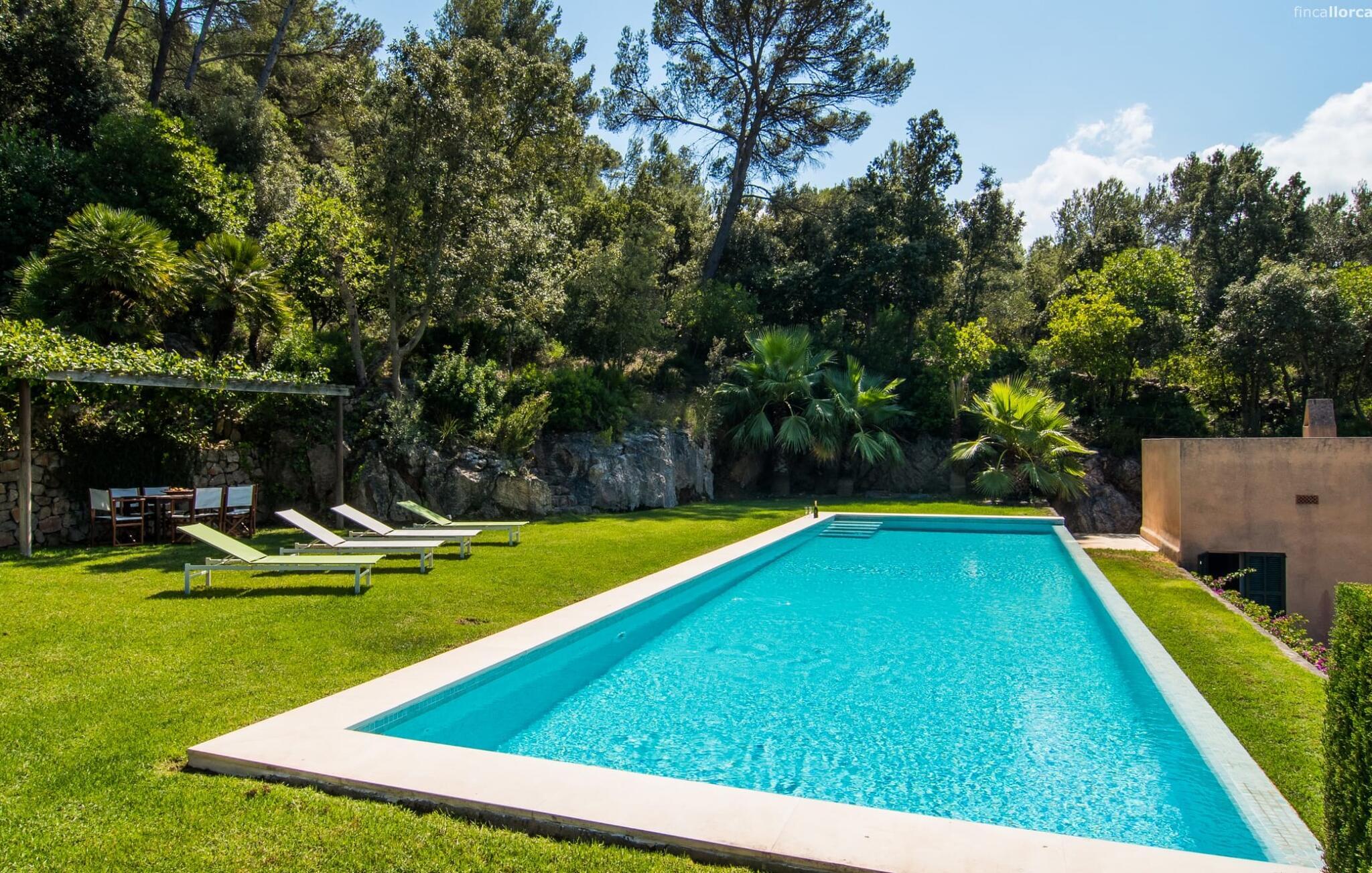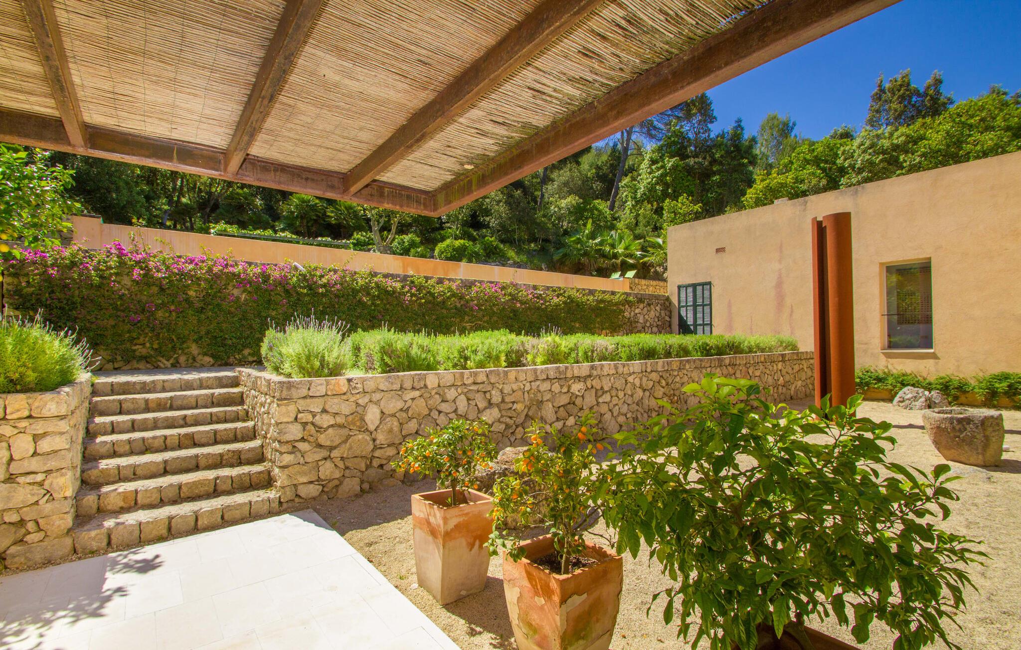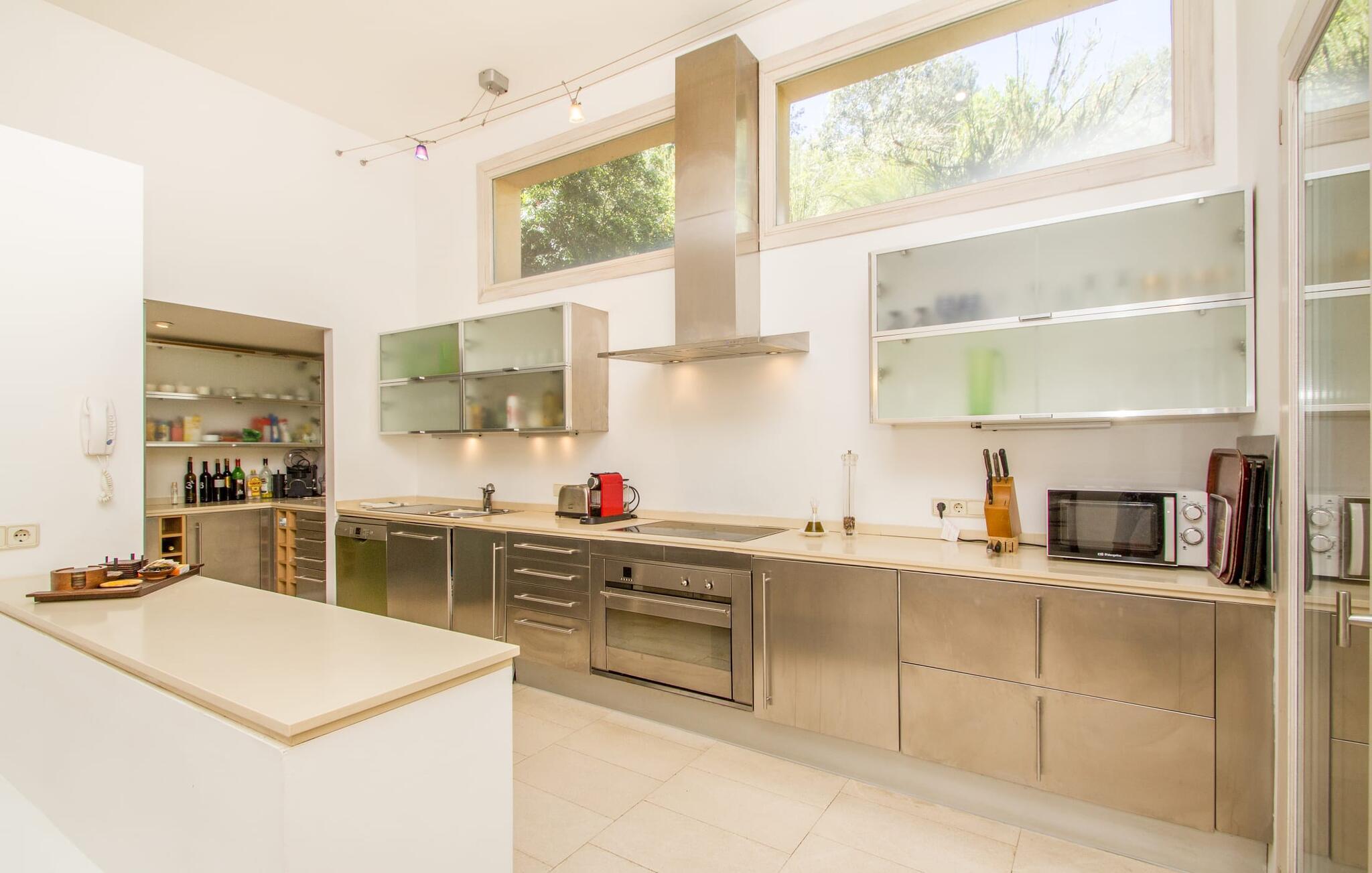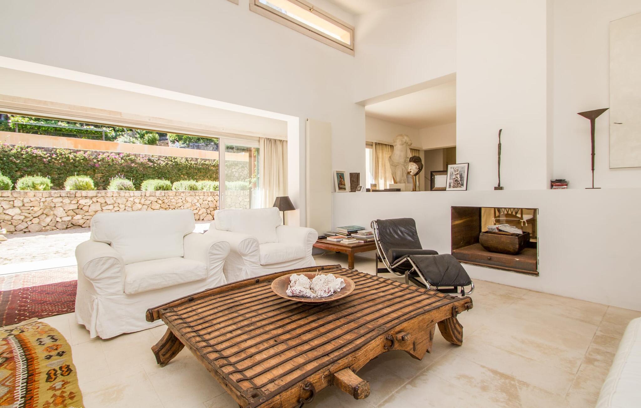 Den vildt romantiske villa "Can Eretat" med sin særligt rummelige have er et absolut højdepunkt i vores program: Små landeveje fører jer til den store ejendom, som er omgivet af bølgende bakker og vidunderligt duftende fyrreskove. Loungeterrasselandskabet er uden sidestykke: lige ved siden af huset kan I slappe af af hjertens lyst på komfortable møbler og nyde udsigten til græsplænen, vegetationen bagved og det smukke landskab. Fra dette plateau når man et lavere niveau via gamle stentrappe, hvor der er en have med et bordtennisbord foran soveværelserne. Den indre gårdhave er også meget flot udformet med en markant okkerfarvet stele, som i kombination med den moderne husfacade giver dette område stemningen af et stilrent kunstmuseum. Små træer skaber også en hyggelig atmosfære. Lige så attraktiv er poolen, som også er indlejret i frodige græsplæner og også er velegnet til ambitiøse svømmere på grund af sine generøse dimensioner. Foran middelhavsskovens kulisse med klippeformationer kan I svømme jeres omgange i fred og ro og derefter slappe af på en af liggestolene. Eller I kan placere jer på trækanten af poolen og lade benene dingle i det forfriskende vand for en stund. Det varierede udeareal indbyder til kortere barfodsture – en fest for sanserne. I kan også toppe det med grillen. Husets indretning på stejlt terræn er lige så rummelig og delvist overdådig: Værelserne byder på meget plads, hvilket har en positiv effekt på atmosfæren. Her har jeres tanker plads til at udfolde sig. Det udsøgte kunstværk, inklusive moderne malerier og statuer, vil løfte jeres humør og oplive de samtaler, I kan have i denne ekstravagante stue. Pejsen er åben på begge sider, så I kan nyde ildens hyggelige knitren fra en af de rummelige sofaer samt ved spisebordet. Herfra kan I komme til husets bibliotek og det ultramoderne køkken, som lever op til de højeste standarder, via en trappe. Det muntre skær fra et gult kunstværk stråler ind i rummet og varmer jeres hjerte og sjæl tidligt om morgenen under morgenmaden i køkkenets siddeområde. I har endda jeres eget vaskerum. Et stort dobbeltværelse med baldakin, walk-in-closet og en-suite badeværelse er også placeret på denne etage, og besøgende kan også forfriske sig på et gæstetoilet. De fire resterende soveværelser ligger en etage under: Her kan I forvente tre dobbeltværelser - hvoraf det ene har eget badeværelse. Soveværelserne er for det meste indrettet i hvidt og har desuden hyggelige detaljer som et skrivebord, så I kan føle, at I er på et eksklusivt hotel under hele jeres ophold. Badeværelset på soveplan har også badekar. Det har en golf driving range, og ejeren vil give jer et sæt golfkøller til gratis træning. Villaen "Can Eretat", som ligger i den nordøstlige del af øen, giver jer et område, hvor I kan rave om smukke bugter. som den omkring 8 km væk inviterer "Cala Mesquida" jer. Ikke alene udstråler Capdepera en fremragende middelhavsatmosfære med sit livlige marked om onsdagen, de små gader er også perfekte til at slentre og udforske. I kan nå middelalderbyen Artà med jeres lejebil på cirka femten minutter; Der kan I for eksempel besøge de imponerende drypstenshuler "Coves des Artà". Den pulserende kystby Cala Ratjada er det rigtige sted for jer, hvis I vil feste til langt ud på natten. Når I vender tilbage til Villa "Can Eretat", vil I sætte endnu mere pris på den vidunderlige stilhed, der omgiver jer. Beliggende midt i det grønne, tilbyder villaen "Can Eretat" de bedste betingelser for en afslappende ferie: en gåtur gennem frodige grønne bakker tager jer til havet, kun 2 km væk. Middelalderbyen Capdepera, hvor I kan tage en rundtur på det majestætiske slot, ligger kun 3 km væk. Derfra er der kun et stenkast til det pulserende Cala Ratjada, hvor vandrere og natugler får noget for pengene.