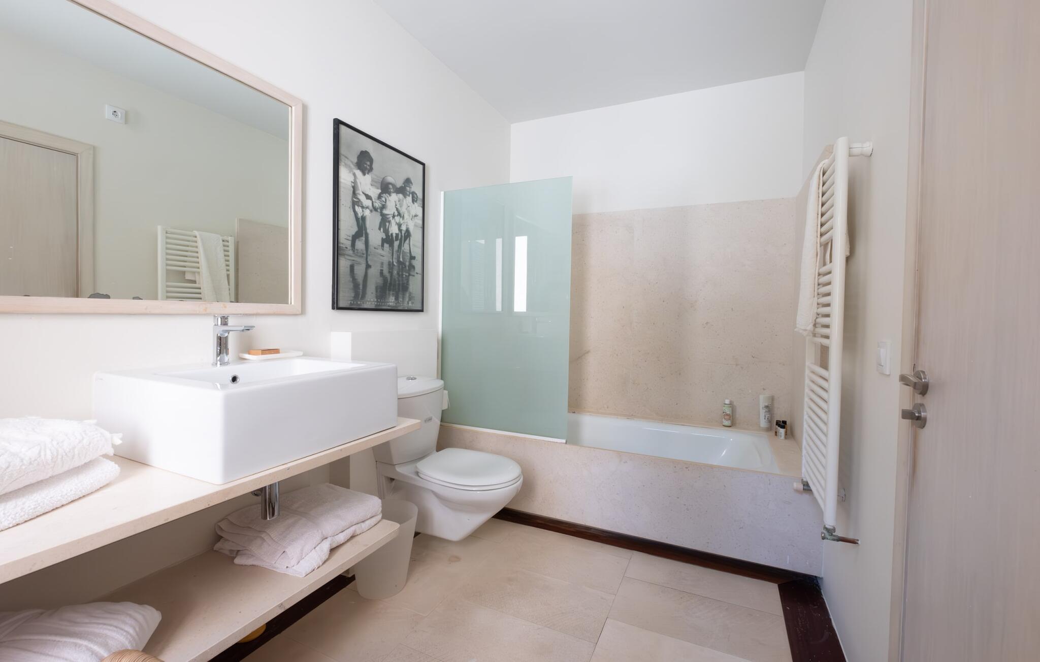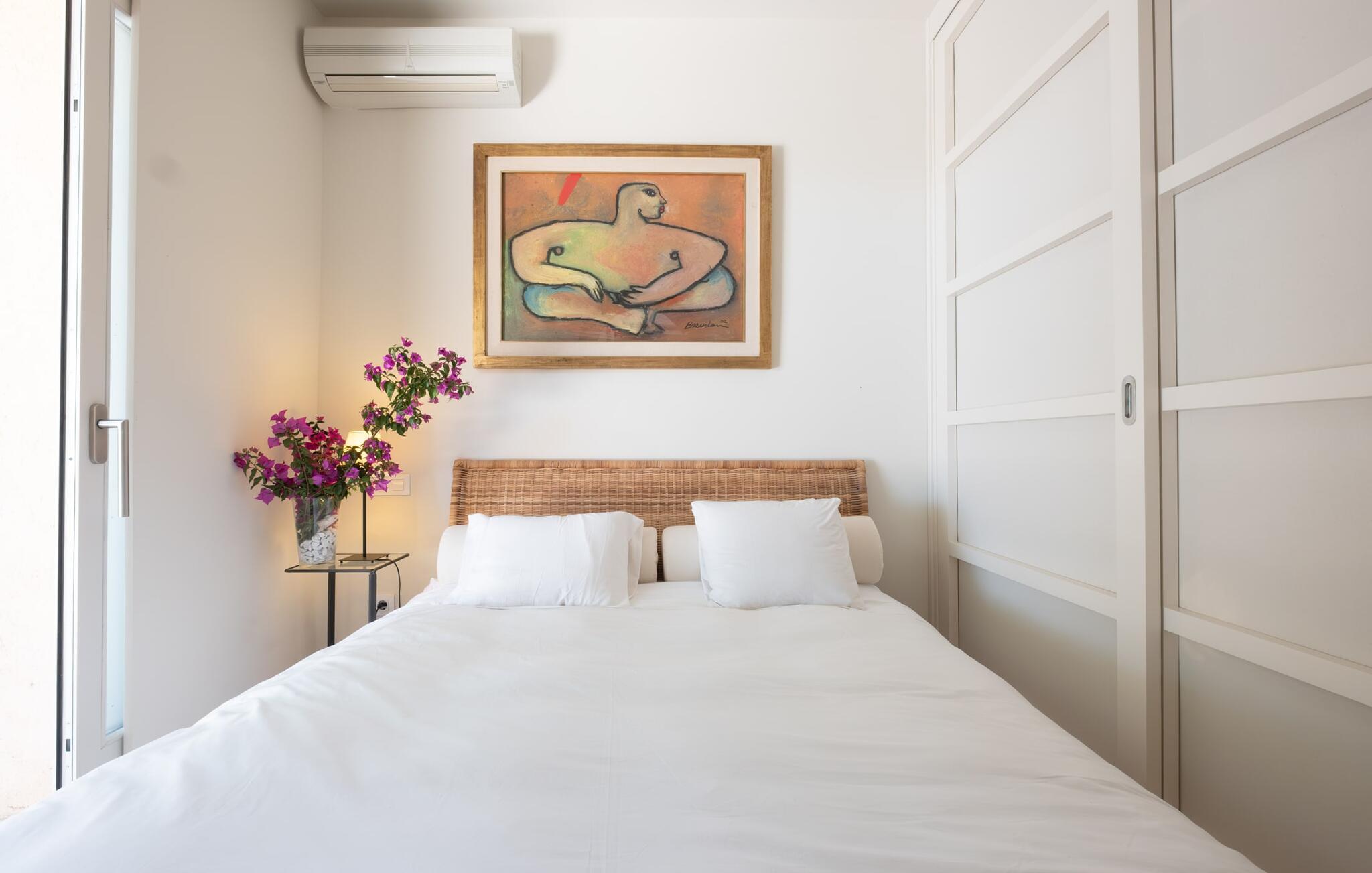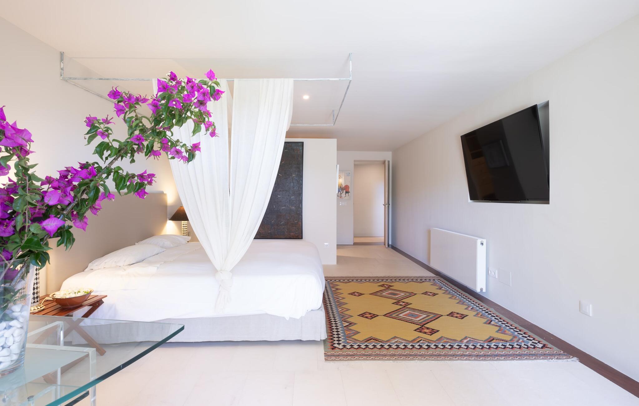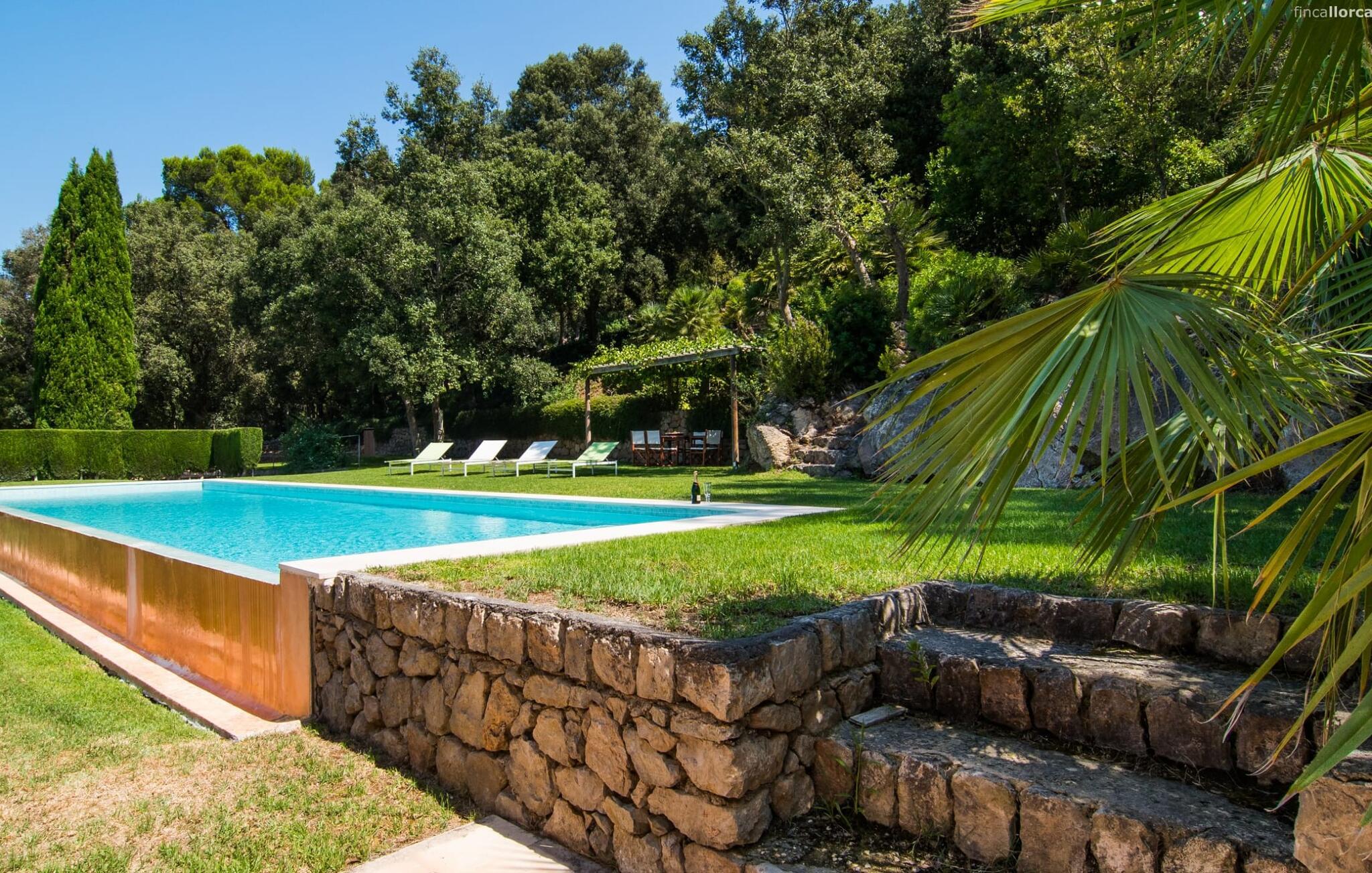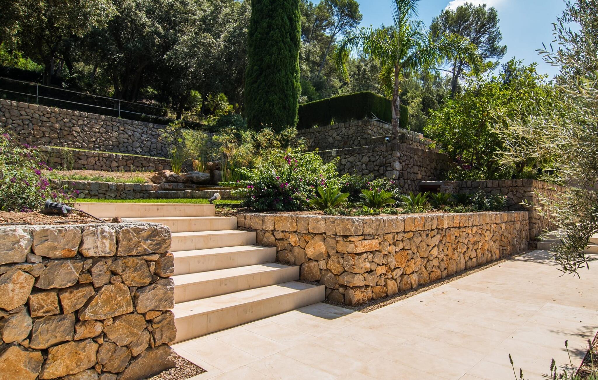 Den vildt romantiske villa "Can Eretat" med sin særligt rummelige have er et absolut højdepunkt i vores program: Små landeveje fører jer til den store ejendom, som er omgivet af bølgende bakker og vidunderligt duftende fyrreskove. Loungeterrasselandskabet er uden sidestykke: lige ved siden af huset kan I slappe af af hjertens lyst på komfortable møbler og nyde udsigten til græsplænen, vegetationen bagved og det smukke landskab. Fra dette plateau når man et lavere niveau via gamle stentrappe, hvor der er en have med et bordtennisbord foran soveværelserne. Den indre gårdhave er også meget flot udformet med en markant okkerfarvet stele, som i kombination med den moderne husfacade giver dette område stemningen af et stilrent kunstmuseum. Små træer skaber også en hyggelig atmosfære. Lige så attraktiv er poolen, som også er indlejret i frodige græsplæner og også er velegnet til ambitiøse svømmere på grund af sine generøse dimensioner. Foran middelhavsskovens kulisse med klippeformationer kan I svømme jeres omgange i fred og ro og derefter slappe af på en af liggestolene. Eller I kan placere jer på trækanten af poolen og lade benene dingle i det forfriskende vand for en stund. Det varierede udeareal indbyder til kortere barfodsture – en fest for sanserne. I kan også toppe det med grillen. Husets indretning på stejlt terræn er lige så rummelig og delvist overdådig: Værelserne byder på meget plads, hvilket har en positiv effekt på atmosfæren. Her har jeres tanker plads til at udfolde sig. Det udsøgte kunstværk, inklusive moderne malerier og statuer, vil løfte jeres humør og oplive de samtaler, I kan have i denne ekstravagante stue. Pejsen er åben på begge sider, så I kan nyde ildens hyggelige knitren fra en af de rummelige sofaer samt ved spisebordet. Herfra kan I komme til husets bibliotek og det ultramoderne køkken, som lever op til de højeste standarder, via en trappe. Det muntre skær fra et gult kunstværk stråler ind i rummet og varmer jeres hjerte og sjæl tidligt om morgenen under morgenmaden i køkkenets siddeområde. I har endda jeres eget vaskerum. Et stort dobbeltværelse med baldakin, walk-in-closet og en-suite badeværelse er også placeret på denne etage, og besøgende kan også forfriske sig på et gæstetoilet. De fire resterende soveværelser ligger en etage under: Her kan I forvente tre dobbeltværelser - hvoraf det ene har eget badeværelse. Soveværelserne er for det meste indrettet i hvidt og har desuden hyggelige detaljer som et skrivebord, så I kan føle, at I er på et eksklusivt hotel under hele jeres ophold. Badeværelset på soveplan har også badekar. Det har en golf driving range, og ejeren vil give jer et sæt golfkøller til gratis træning. Villaen "Can Eretat", som ligger i den nordøstlige del af øen, giver jer et område, hvor I kan rave om smukke bugter. som den omkring 8 km væk inviterer "Cala Mesquida" jer. Ikke alene udstråler Capdepera en fremragende middelhavsatmosfære med sit livlige marked om onsdagen, de små gader er også perfekte til at slentre og udforske. I kan nå middelalderbyen Artà med jeres lejebil på cirka femten minutter; Der kan I for eksempel besøge de imponerende drypstenshuler "Coves des Artà". Den pulserende kystby Cala Ratjada er det rigtige sted for jer, hvis I vil feste til langt ud på natten. Når I vender tilbage til Villa "Can Eretat", vil I sætte endnu mere pris på den vidunderlige stilhed, der omgiver jer. Beliggende midt i det grønne, tilbyder villaen "Can Eretat" de bedste betingelser for en afslappende ferie: en gåtur gennem frodige grønne bakker tager jer til havet, kun 2 km væk. Middelalderbyen Capdepera, hvor I kan tage en rundtur på det majestætiske slot, ligger kun 3 km væk. Derfra er der kun et stenkast til det pulserende Cala Ratjada, hvor vandrere og natugler får noget for pengene.