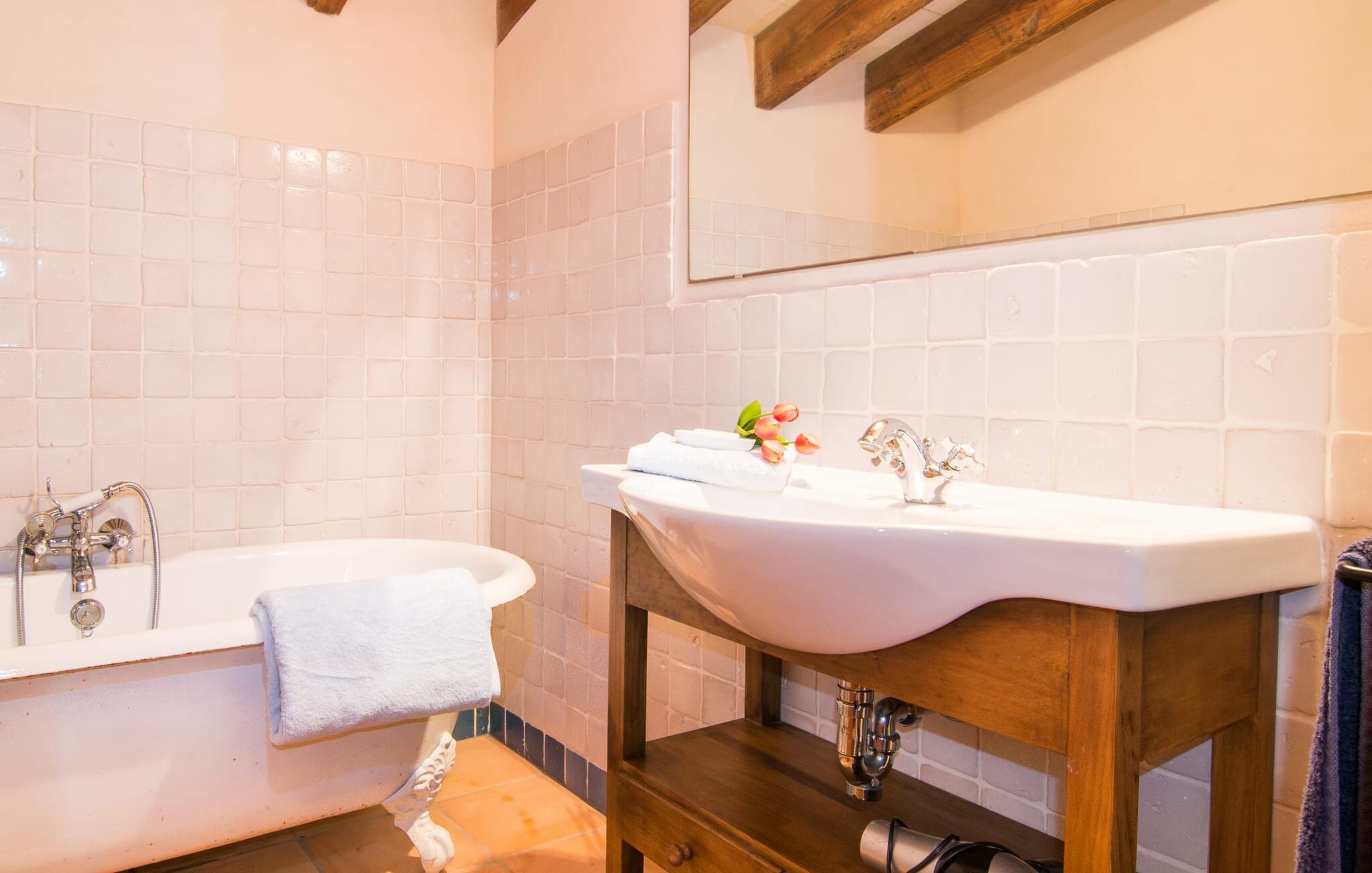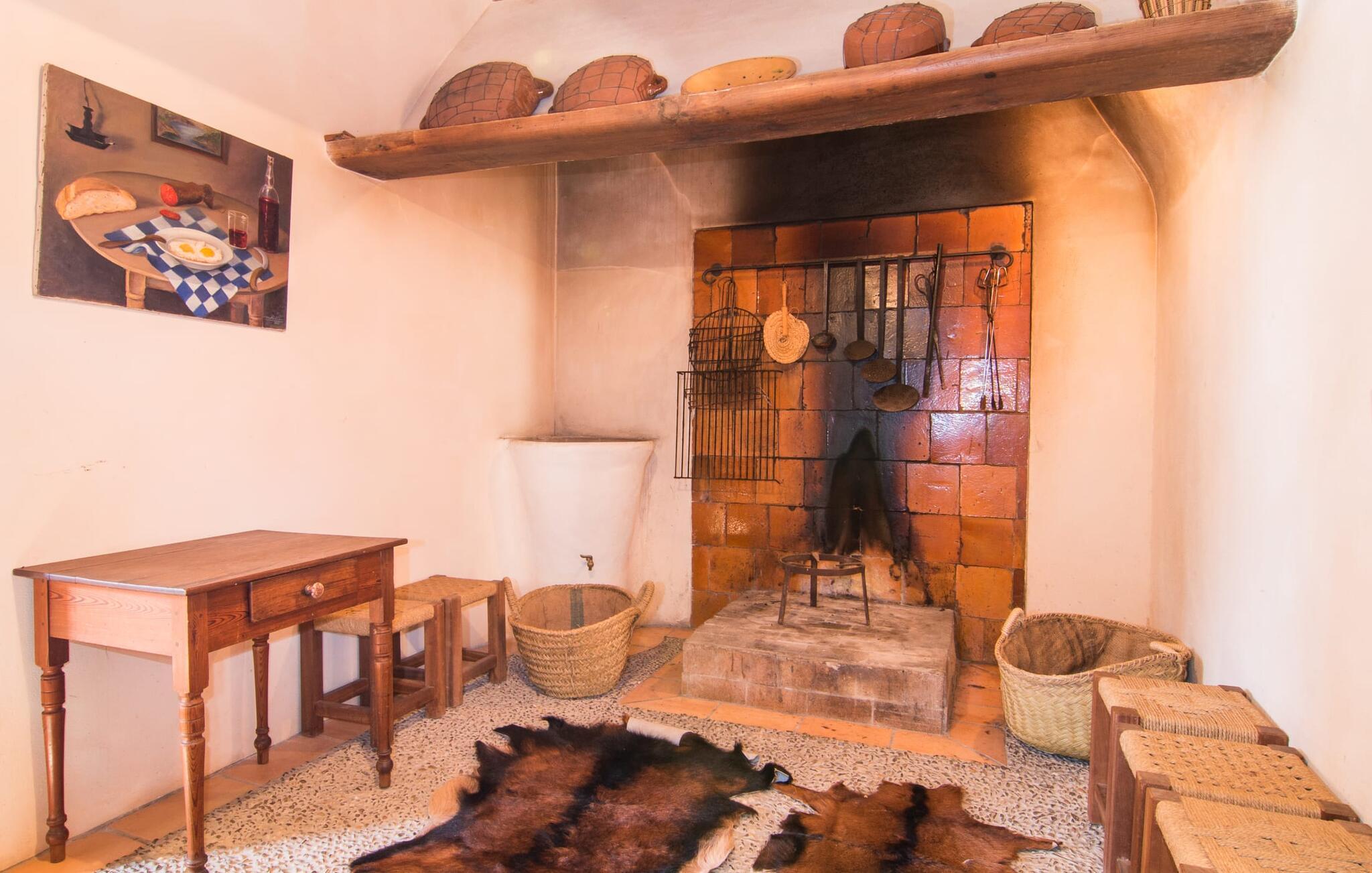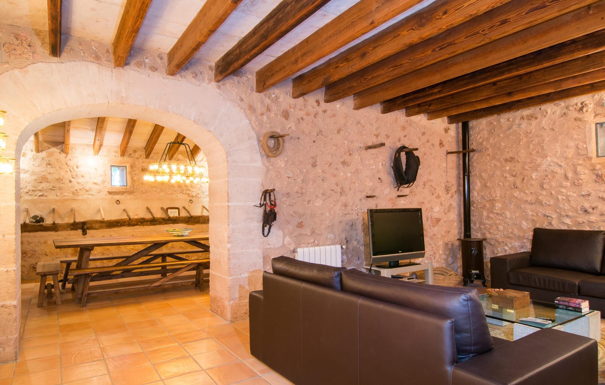 Oplev "Can Farineta", en fantastisk ejendom i finca-stil beliggende på en fredelig 30.000 m² grund i et afsondret område på Mallorca. Dette smukt restaurerede hus er en hyldest til Mallorcas historie og har en anlagt have med palmer, oliventræer og cypresser, hvilket giver en følelse af fred og privatliv. Udendørsområdet byder på en afskærmet spiseplads med et langt træbord og et fuldt udstyret køkken med en muret grill, perfekt til udendørs spisning. Den indbydende 50 m² store pool med liggestole og parasoller inviterer jer til at slappe af og slappe af. Indenfor fører den rummelige entré ind i en charmerende stue med lædersofaer og unikke gyngestole. Det åbne køkken har traditionelle blå og hvide fliser og moderne apparater. Med fire unikt designede soveværelser, herunder to dobbeltværelser og to singler, kan gæsterne nyde komfort i en afslappende atmosfære. To moderne badeværelser fuldender ejendommen og sikrer en perfekt blanding af rustik charme og moderne komfort på "Can Farineta". Den rustikke finca "Can Farineta" ligger nær den lille kystby Ses Covetes. Det er et fantastisk sted at shoppe. Alternativt kan I tage til landsbyen Ses Salines, som kan nås lige så hurtigt, og der er et landmandsmarked hver torsdag. Den fantastiske strand Ses Covetes ligger kun få kilometer væk, ligesom den simpelthen storslåede naturlige strand Es Trenc.