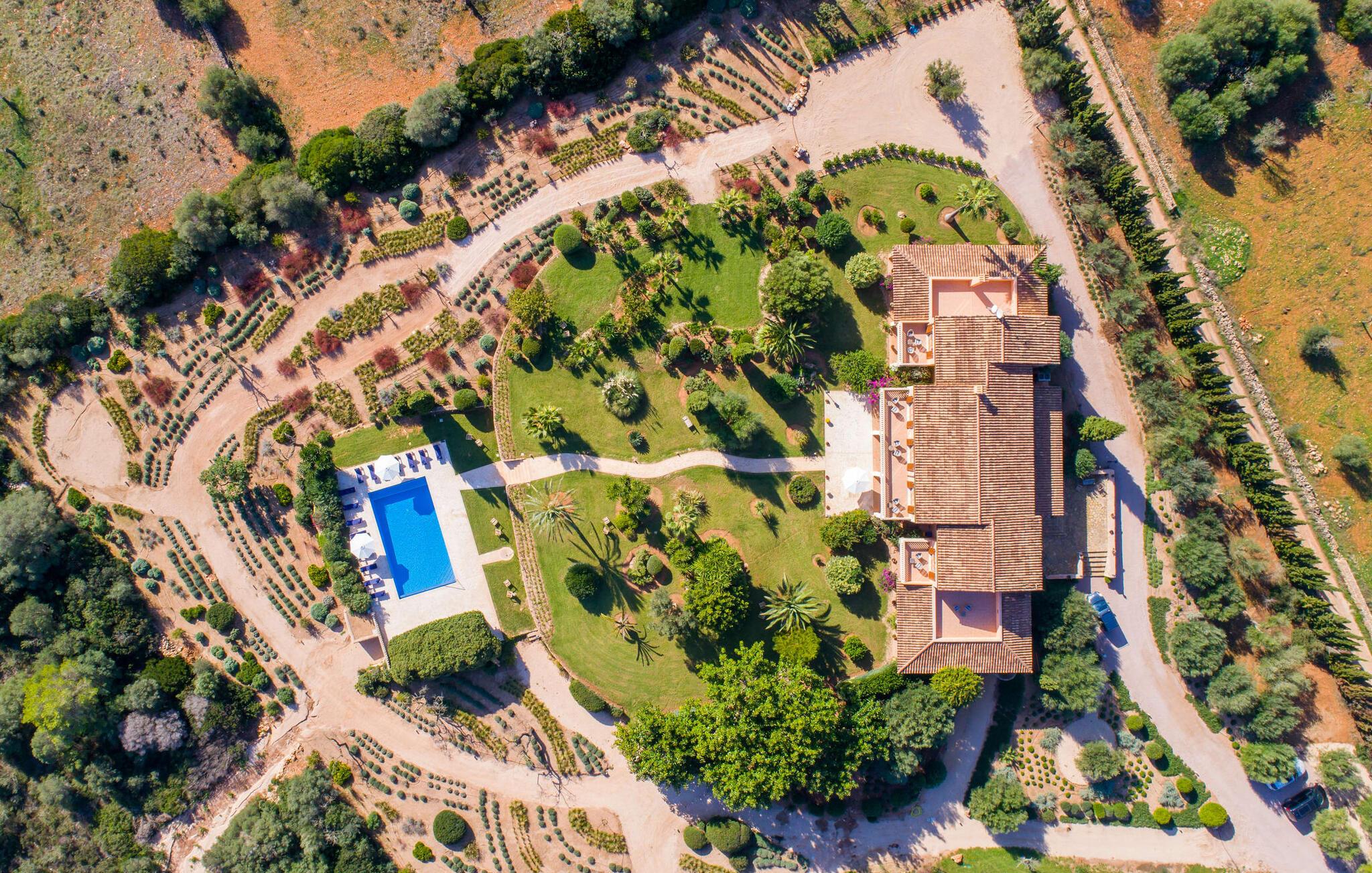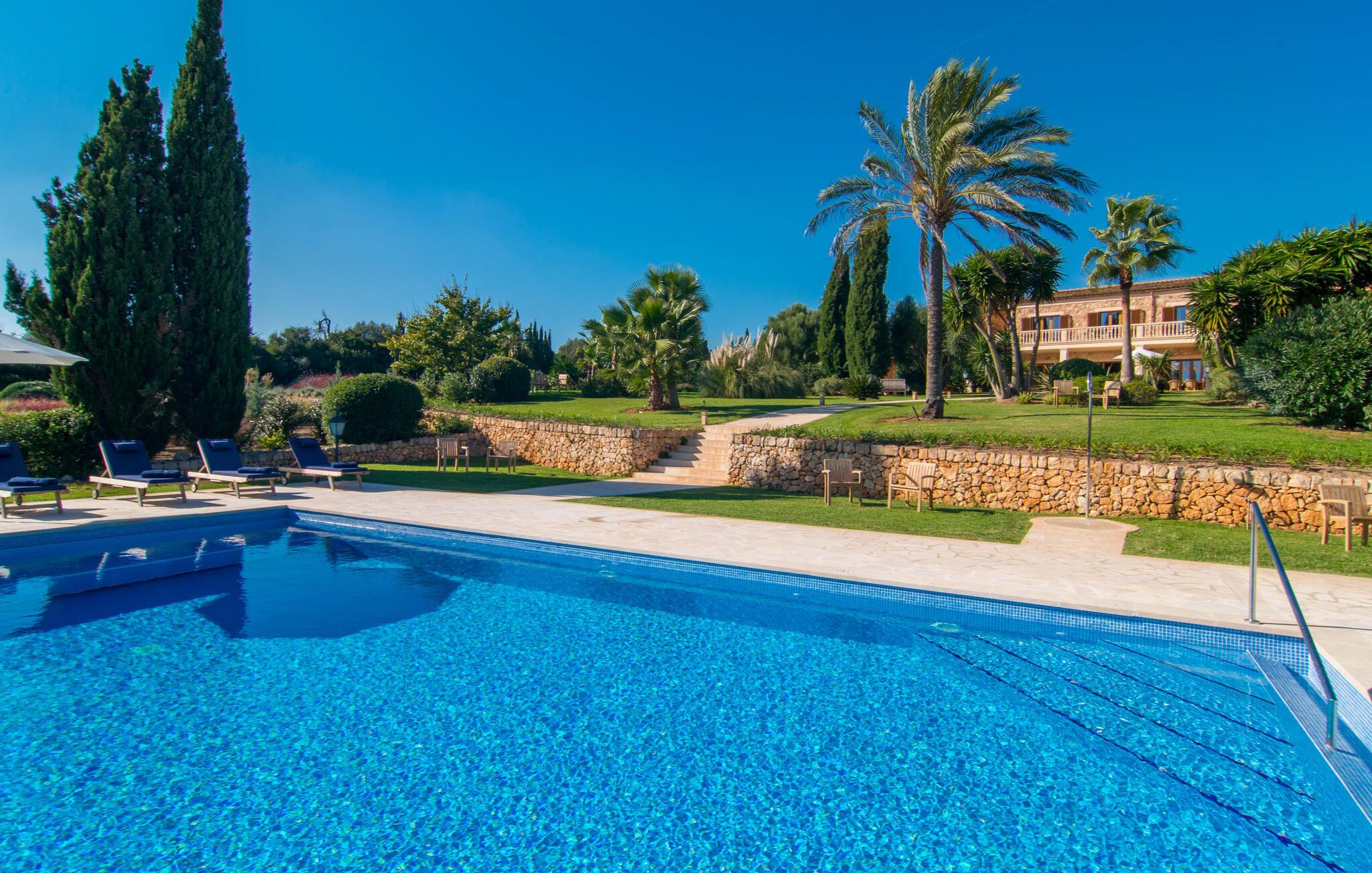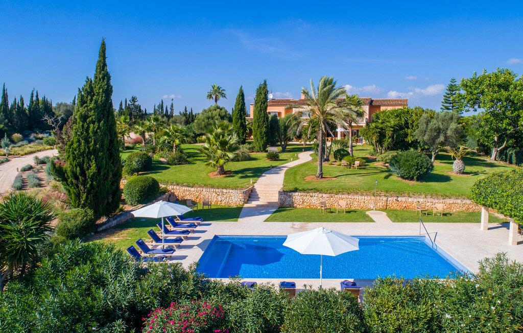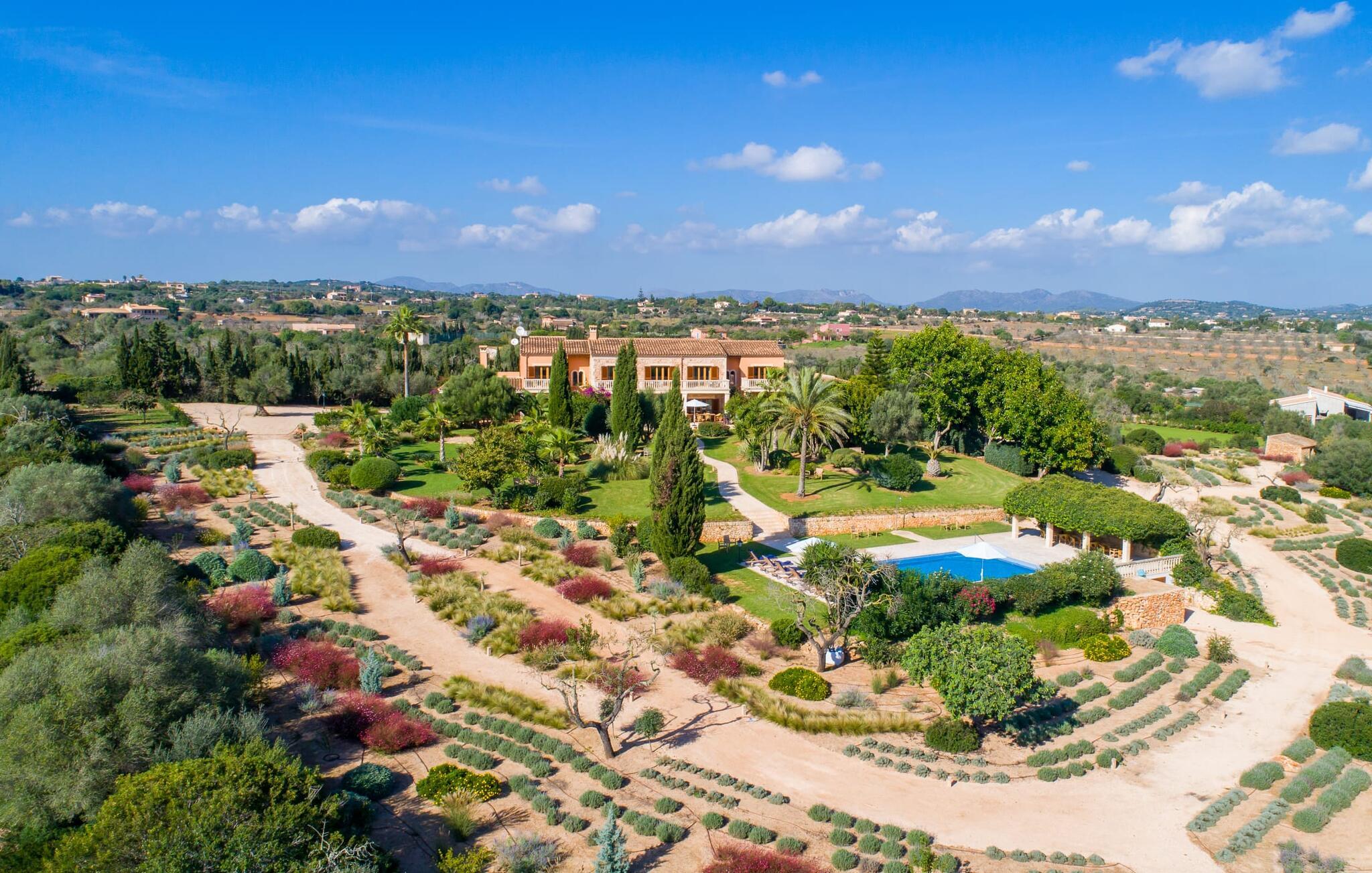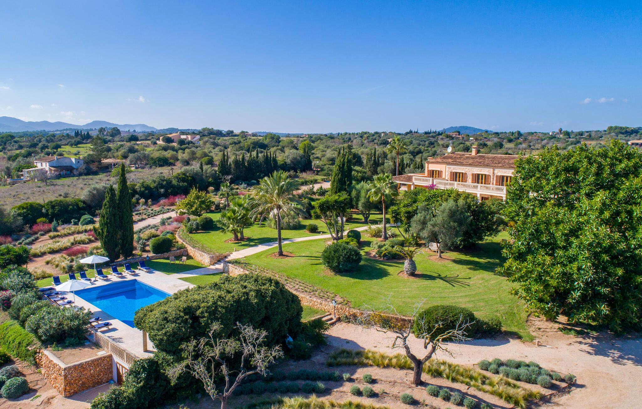 Den imponerende villaejendom "Can Ferragut de Porto Cristo" byder os velkommen med ynde og charme samt en betydelig ejendomsstørrelse på omkring 26.000 m². Haven, der indrammer huset, kan med rette kaldes en park, fordi den systematisk er anlagt med frodige græsplæner, enorme palmer, cypresser, frugttræer og utallige planter, der understreger middelhavskarakteren. Det er derfor næppe overraskende, at der er utallige steder at have det godt på ejendommen - til et øjebliks stilhed, meditation, en morgenyoga-session. Golfspillere eller sportsinteresserede kan nyde et ideelt træningsområde på de velholdte putting greens og træne til udfordringerne på de mallorcanske golfbaner. En smal sti fører fra det elegante feriehus til det attraktive poolområde. På den omkringliggende solterrasse kan I nyde det behagelige klima på komfortable liggestole og finde grønne, skyggefulde pletter. Yderligere overdækkede, jordnære terrasser og solbeskinnede altaner fuldender husets sofistikerede arkitektur. Særligt attraktivt er, at hvert af de velholdte dobbeltværelser har udgang til egen eller fælles terrasse - de seks stille værelser bliver selvstændige enheder med lejlighedspræg. Det en-suite badeværelse er naturligvis et absolut must og placerer denne fabelagtige villa i det øvre premium segment. Husets pragt er indlysende, men dets sofistikering ligger i detaljerne. Udover ovennævnte suiter finder I på 900 m² boligareal en rummelig opholdsstue med hyggelig salonstemning. Den består af et sofaområde foran en pejs og satellit-tv (du kan også nyde et væghængt tv i hvert af de smarte dobbeltværelser), en åben spiseplads, et praktisk opholdsområde og et hyggeligt læsehjørne. Vinduerne åbner ud til verandaen, hvorfor de rummelige værelser er badet i behageligt lysindfald med terracotta-fliser og fritlagte træbjælker. Køkkenet er naturligvis fuldt udstyret og har køleskabe nok til, at I altid har en kølig drink lige ved hånden. I interiøret danner en klassisk mallorcansk stil med et strejf af landlig hygge en særlig attraktiv symbiose med moderne dekorative elementer, der skaber en unik blanding af stilarter. Her kan I ikke kun tilbringe en perfekt ferie, men også holde en større fest i en afslappet atmosfære. Den imponerende villa "Can Ferragut de Porto Cristo" er omgivet af en lige så imponerende stor park med golf putting greens. Den storslåede ejendom er beliggende nær den tidligere fiskerby Porto Cristo på Mallorcas østkyst. I kan gøre jeres indkøb her i supermarkedet eller på det ugentlige marked. Den nærliggende Manacor er ideel til omfattende shoppingture. Smukke strande med fint sand som Cala Anguila eller Cala Mendia er kun en kort køretur væk.