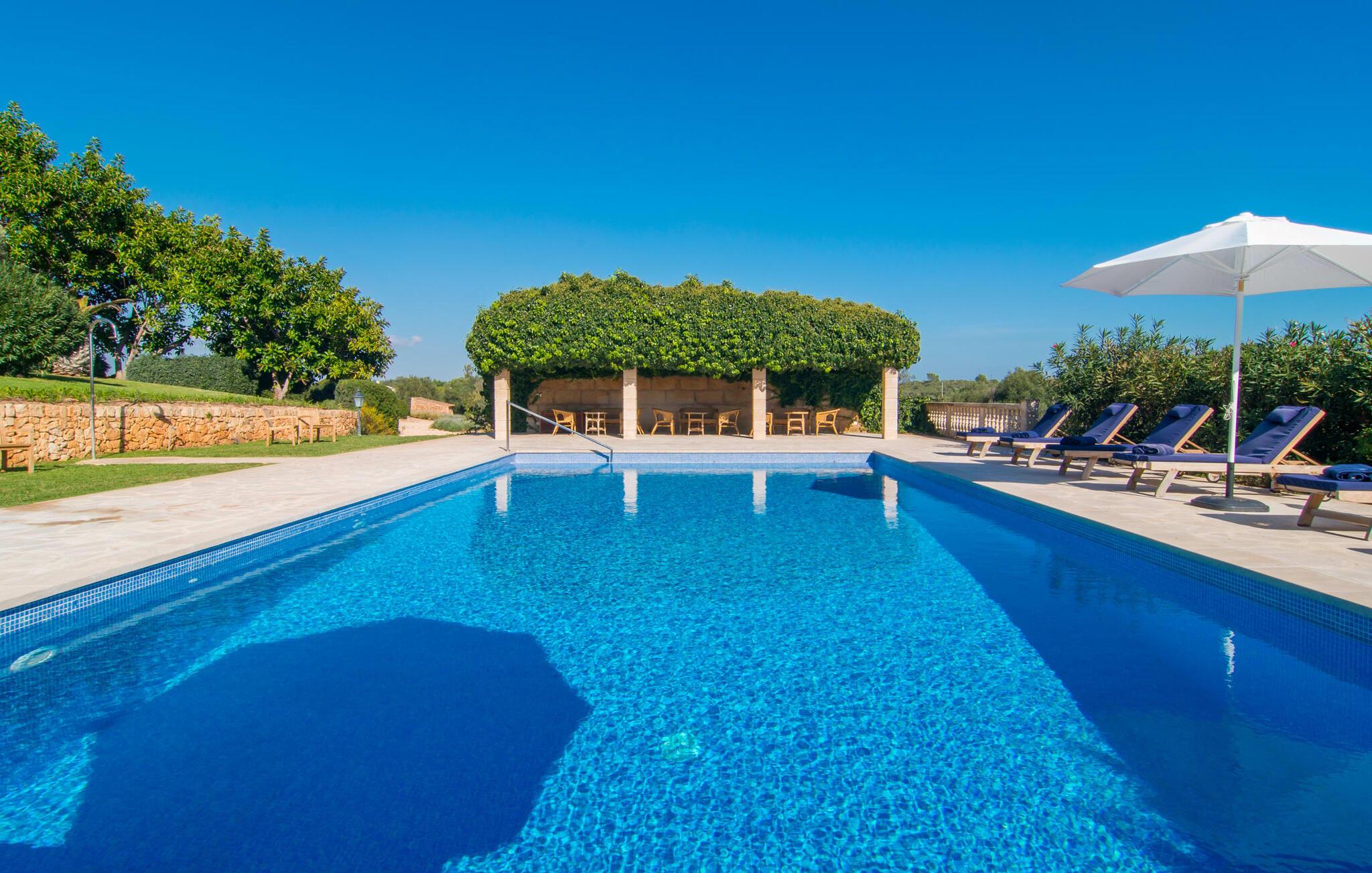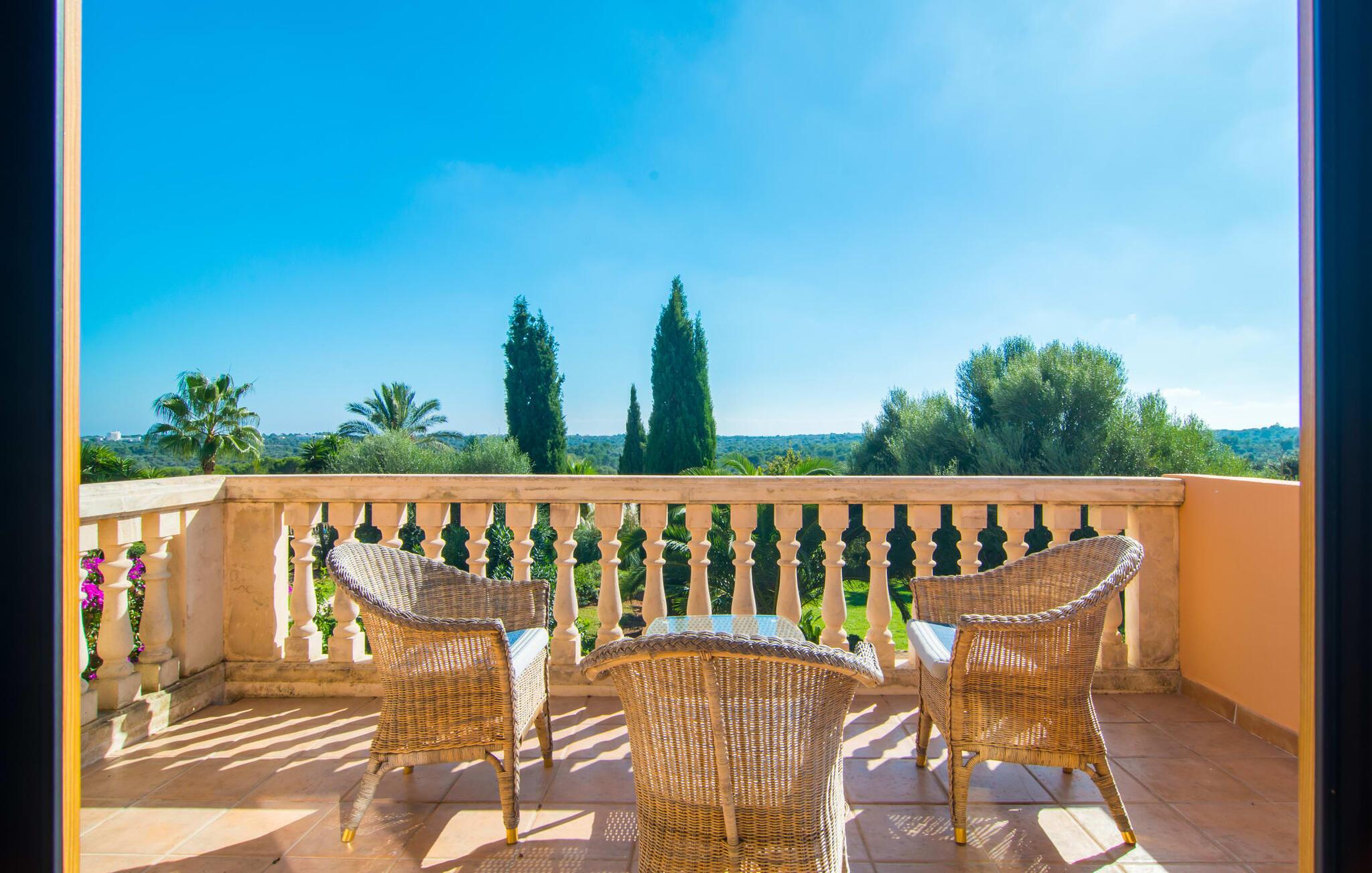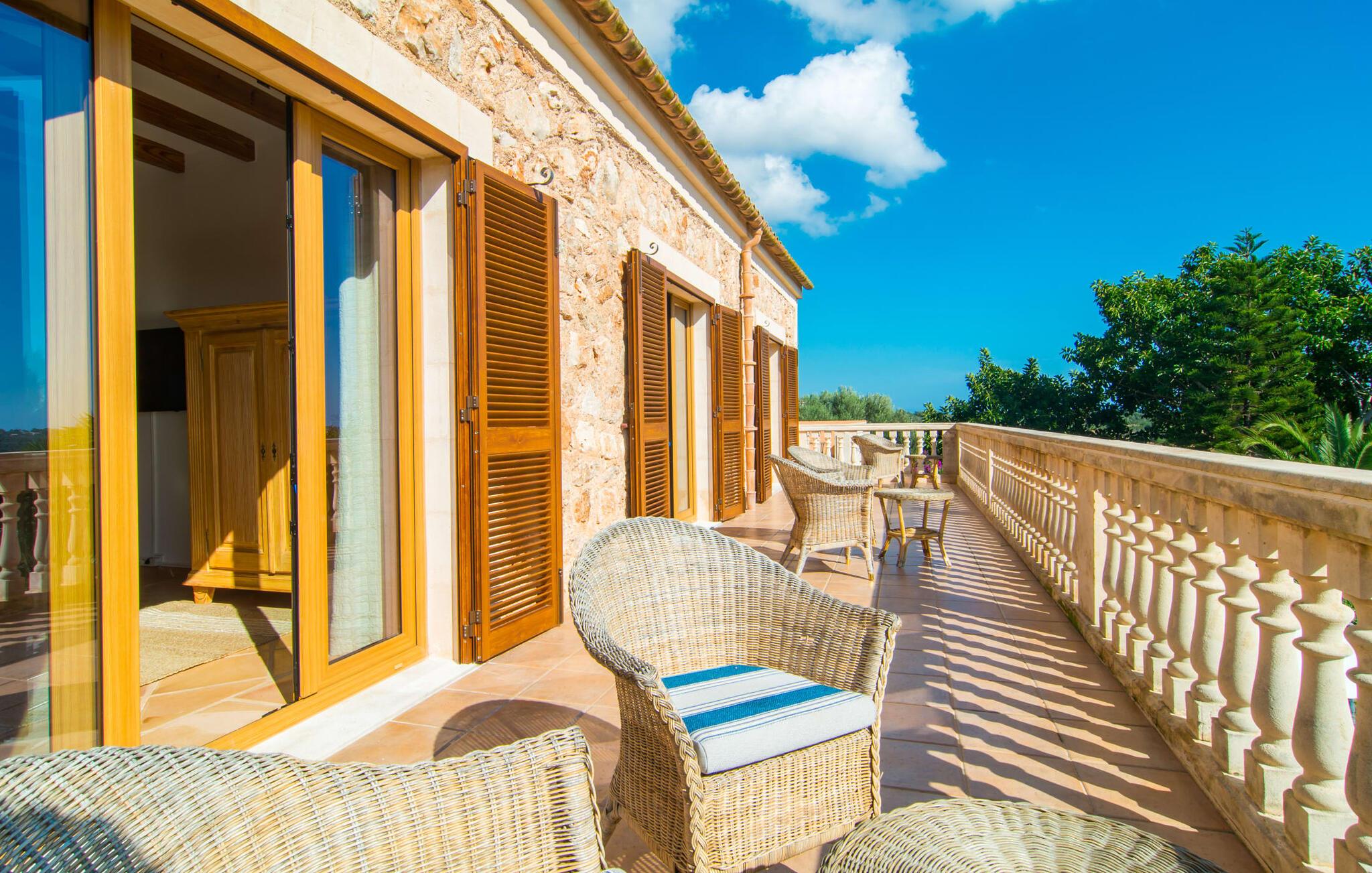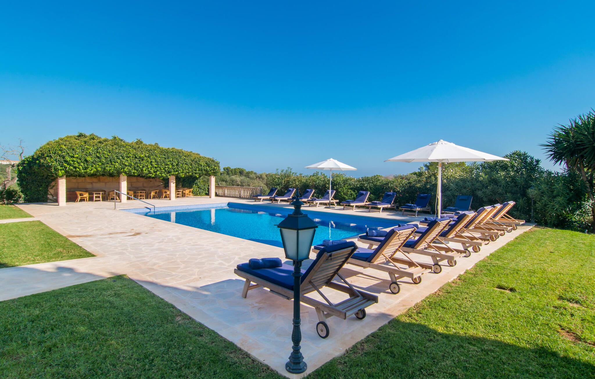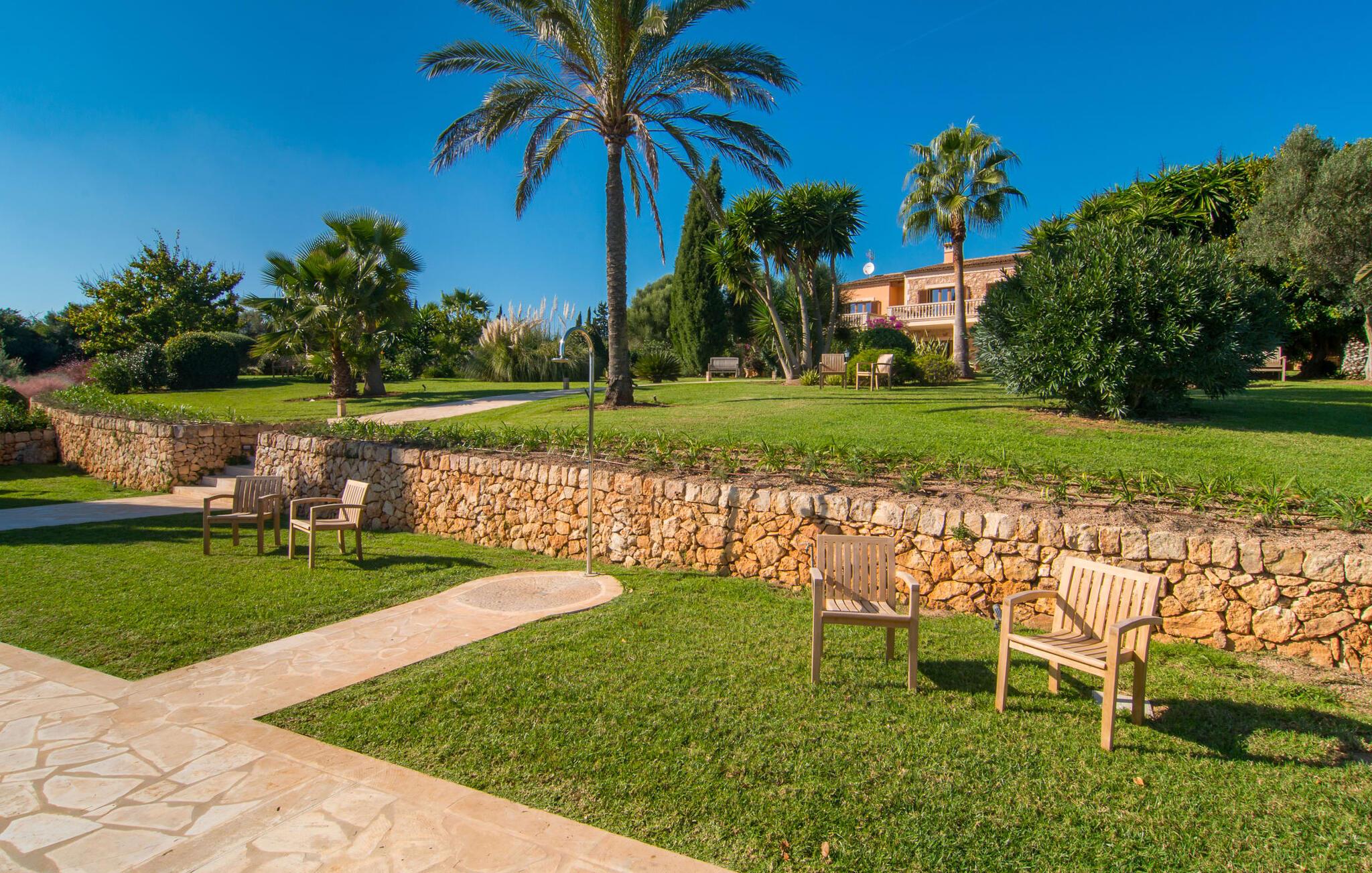 Den imponerende villaejendom "Can Ferragut de Porto Cristo" byder os velkommen med ynde og charme samt en betydelig ejendomsstørrelse på omkring 26.000 m². Haven, der indrammer huset, kan med rette kaldes en park, fordi den systematisk er anlagt med frodige græsplæner, enorme palmer, cypresser, frugttræer og utallige planter, der understreger middelhavskarakteren. Det er derfor næppe overraskende, at der er utallige steder at have det godt på ejendommen - til et øjebliks stilhed, meditation, en morgenyoga-session. Golfspillere eller sportsinteresserede kan nyde et ideelt træningsområde på de velholdte putting greens og træne til udfordringerne på de mallorcanske golfbaner. En smal sti fører fra det elegante feriehus til det attraktive poolområde. På den omkringliggende solterrasse kan I nyde det behagelige klima på komfortable liggestole og finde grønne, skyggefulde pletter. Yderligere overdækkede, jordnære terrasser og solbeskinnede altaner fuldender husets sofistikerede arkitektur. Særligt attraktivt er, at hvert af de velholdte dobbeltværelser har udgang til egen eller fælles terrasse - de seks stille værelser bliver selvstændige enheder med lejlighedspræg. Det en-suite badeværelse er naturligvis et absolut must og placerer denne fabelagtige villa i det øvre premium segment. Husets pragt er indlysende, men dets sofistikering ligger i detaljerne. Udover ovennævnte suiter finder I på 900 m² boligareal en rummelig opholdsstue med hyggelig salonstemning. Den består af et sofaområde foran en pejs og satellit-tv (du kan også nyde et væghængt tv i hvert af de smarte dobbeltværelser), en åben spiseplads, et praktisk opholdsområde og et hyggeligt læsehjørne. Vinduerne åbner ud til verandaen, hvorfor de rummelige værelser er badet i behageligt lysindfald med terracotta-fliser og fritlagte træbjælker. Køkkenet er naturligvis fuldt udstyret og har køleskabe nok til, at I altid har en kølig drink lige ved hånden. I interiøret danner en klassisk mallorcansk stil med et strejf af landlig hygge en særlig attraktiv symbiose med moderne dekorative elementer, der skaber en unik blanding af stilarter. Her kan I ikke kun tilbringe en perfekt ferie, men også holde en større fest i en afslappet atmosfære. Den imponerende villa "Can Ferragut de Porto Cristo" er omgivet af en lige så imponerende stor park med golf putting greens. Den storslåede ejendom er beliggende nær den tidligere fiskerby Porto Cristo på Mallorcas østkyst. I kan gøre jeres indkøb her i supermarkedet eller på det ugentlige marked. Den nærliggende Manacor er ideel til omfattende shoppingture. Smukke strande med fint sand som Cala Anguila eller Cala Mendia er kun en kort køretur væk.