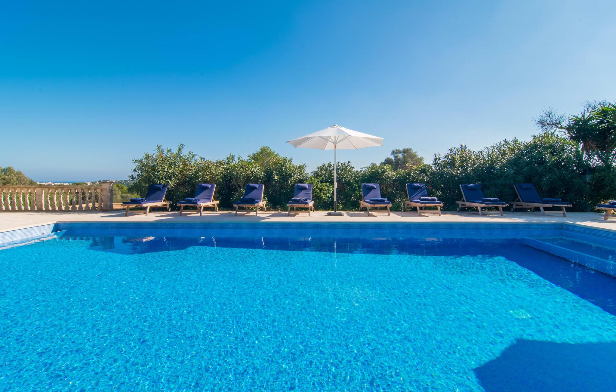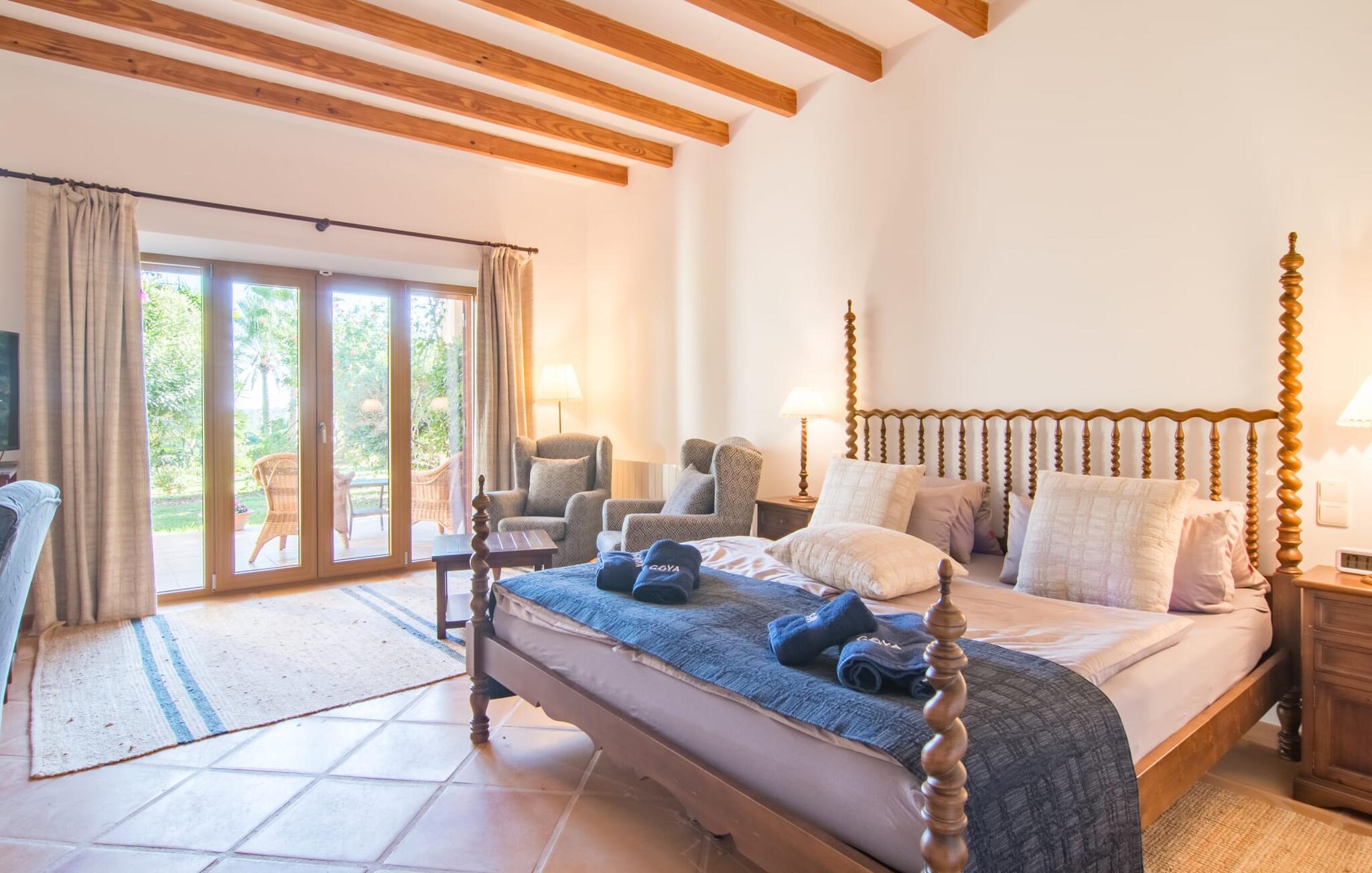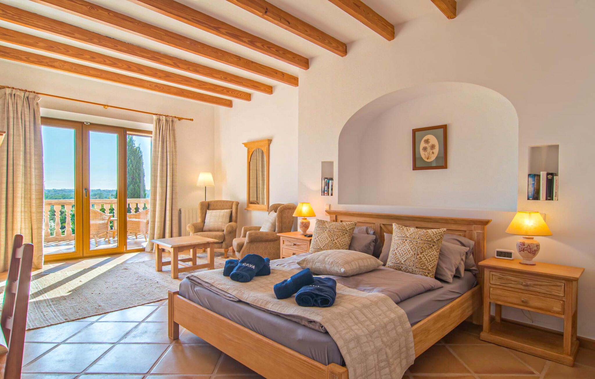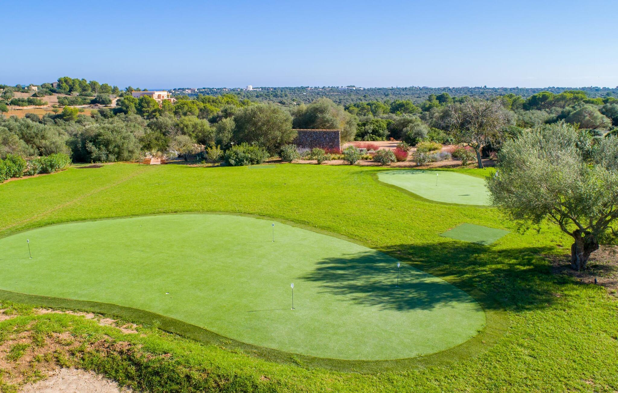 Den imponerende villaejendom "Can Ferragut de Porto Cristo" byder os velkommen med ynde og charme samt en betydelig ejendomsstørrelse på omkring 26.000 m². Haven, der indrammer huset, kan med rette kaldes en park, fordi den systematisk er anlagt med frodige græsplæner, enorme palmer, cypresser, frugttræer og utallige planter, der understreger middelhavskarakteren. Det er derfor næppe overraskende, at der er utallige steder at have det godt på ejendommen - til et øjebliks stilhed, meditation, en morgenyoga-session. Golfspillere eller sportsinteresserede kan nyde et ideelt træningsområde på de velholdte putting greens og træne til udfordringerne på de mallorcanske golfbaner. En smal sti fører fra det elegante feriehus til det attraktive poolområde. På den omkringliggende solterrasse kan I nyde det behagelige klima på komfortable liggestole og finde grønne, skyggefulde pletter. Yderligere overdækkede, jordnære terrasser og solbeskinnede altaner fuldender husets sofistikerede arkitektur. Særligt attraktivt er, at hvert af de velholdte dobbeltværelser har udgang til egen eller fælles terrasse - de seks stille værelser bliver selvstændige enheder med lejlighedspræg. Det en-suite badeværelse er naturligvis et absolut must og placerer denne fabelagtige villa i det øvre premium segment. Husets pragt er indlysende, men dets sofistikering ligger i detaljerne. Udover ovennævnte suiter finder I på 900 m² boligareal en rummelig opholdsstue med hyggelig salonstemning. Den består af et sofaområde foran en pejs og satellit-tv (du kan også nyde et væghængt tv i hvert af de smarte dobbeltværelser), en åben spiseplads, et praktisk opholdsområde og et hyggeligt læsehjørne. Vinduerne åbner ud til verandaen, hvorfor de rummelige værelser er badet i behageligt lysindfald med terracotta-fliser og fritlagte træbjælker. Køkkenet er naturligvis fuldt udstyret og har køleskabe nok til, at I altid har en kølig drink lige ved hånden. I interiøret danner en klassisk mallorcansk stil med et strejf af landlig hygge en særlig attraktiv symbiose med moderne dekorative elementer, der skaber en unik blanding af stilarter. Her kan I ikke kun tilbringe en perfekt ferie, men også holde en større fest i en afslappet atmosfære. Den imponerende villa "Can Ferragut de Porto Cristo" er omgivet af en lige så imponerende stor park med golf putting greens. Den storslåede ejendom er beliggende nær den tidligere fiskerby Porto Cristo på Mallorcas østkyst. I kan gøre jeres indkøb her i supermarkedet eller på det ugentlige marked. Den nærliggende Manacor er ideel til omfattende shoppingture. Smukke strande med fint sand som Cala Anguila eller Cala Mendia er kun en kort køretur væk.