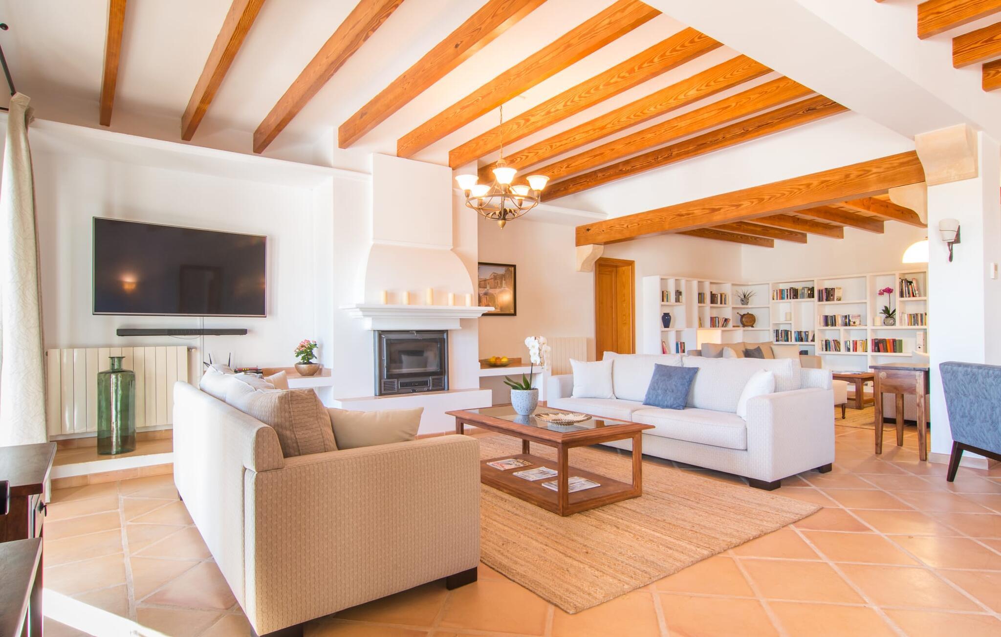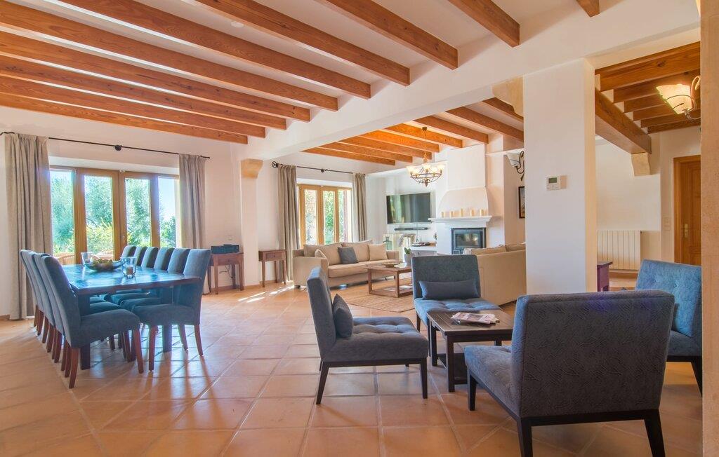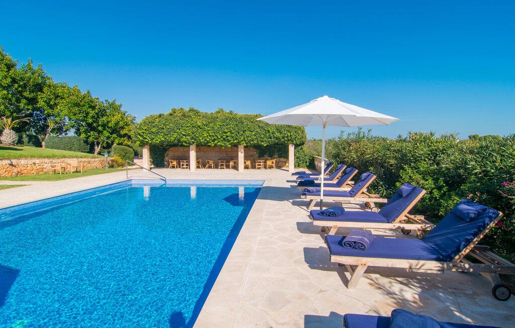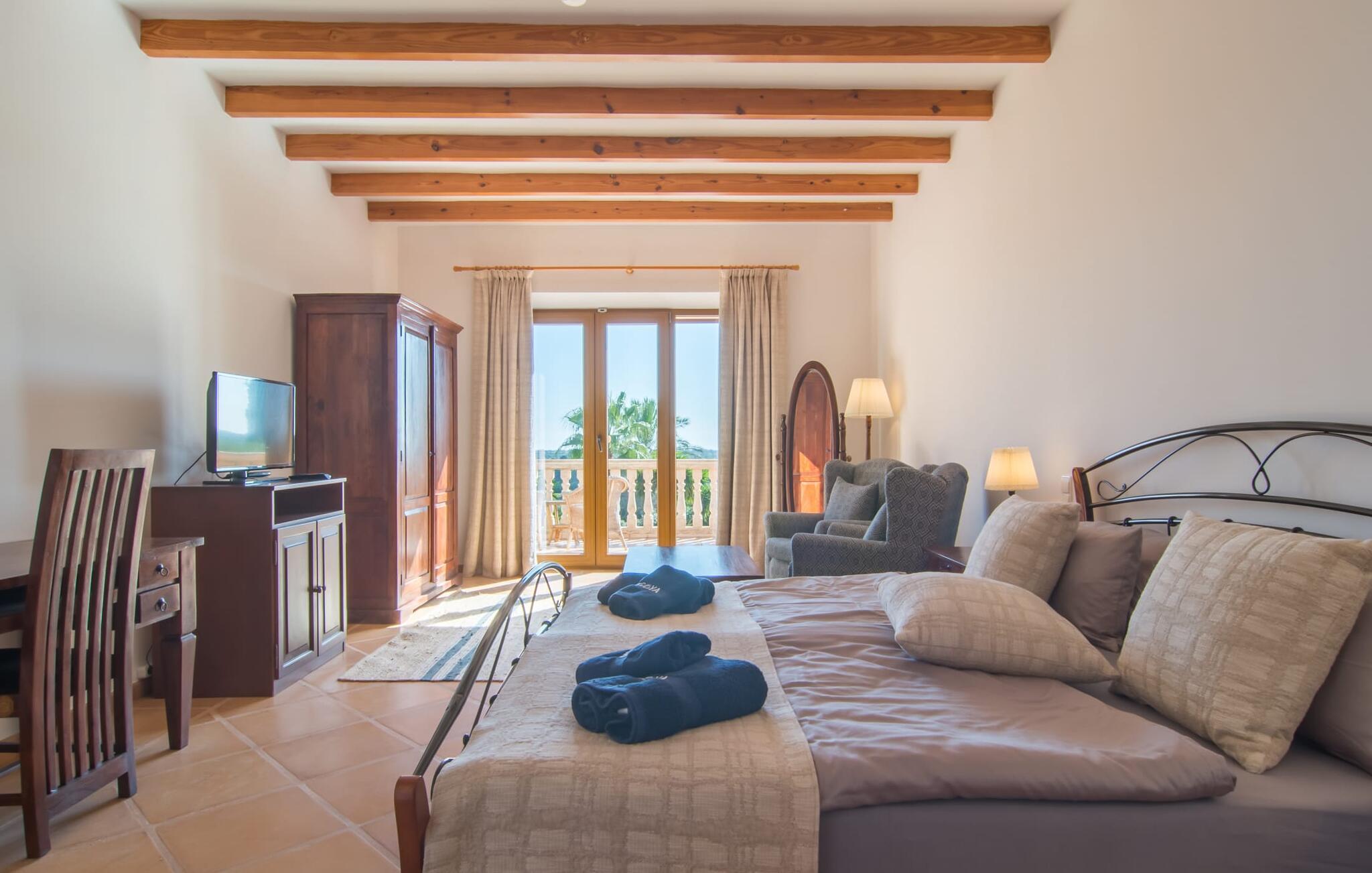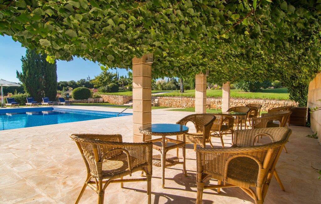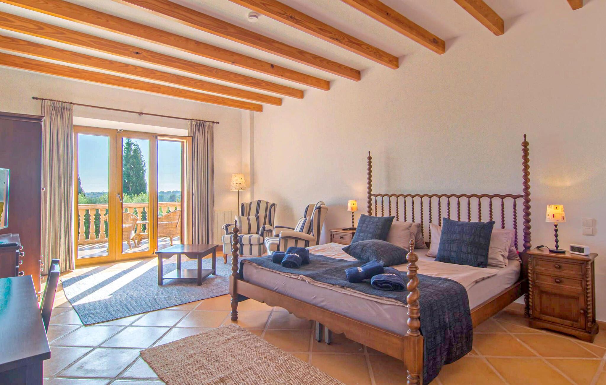 Den imponerende villaejendom "Can Ferragut de Porto Cristo" byder os velkommen med ynde og charme samt en betydelig ejendomsstørrelse på omkring 26.000 m². Haven, der indrammer huset, kan med rette kaldes en park, fordi den systematisk er anlagt med frodige græsplæner, enorme palmer, cypresser, frugttræer og utallige planter, der understreger middelhavskarakteren. Det er derfor næppe overraskende, at der er utallige steder at have det godt på ejendommen - til et øjebliks stilhed, meditation, en morgenyoga-session. Golfspillere eller sportsinteresserede kan nyde et ideelt træningsområde på de velholdte putting greens og træne til udfordringerne på de mallorcanske golfbaner. En smal sti fører fra det elegante feriehus til det attraktive poolområde. På den omkringliggende solterrasse kan I nyde det behagelige klima på komfortable liggestole og finde grønne, skyggefulde pletter. Yderligere overdækkede, jordnære terrasser og solbeskinnede altaner fuldender husets sofistikerede arkitektur. Særligt attraktivt er, at hvert af de velholdte dobbeltværelser har udgang til egen eller fælles terrasse - de seks stille værelser bliver selvstændige enheder med lejlighedspræg. Det en-suite badeværelse er naturligvis et absolut must og placerer denne fabelagtige villa i det øvre premium segment. Husets pragt er indlysende, men dets sofistikering ligger i detaljerne. Udover ovennævnte suiter finder I på 900 m² boligareal en rummelig opholdsstue med hyggelig salonstemning. Den består af et sofaområde foran en pejs og satellit-tv (du kan også nyde et væghængt tv i hvert af de smarte dobbeltværelser), en åben spiseplads, et praktisk opholdsområde og et hyggeligt læsehjørne. Vinduerne åbner ud til verandaen, hvorfor de rummelige værelser er badet i behageligt lysindfald med terracotta-fliser og fritlagte træbjælker. Køkkenet er naturligvis fuldt udstyret og har køleskabe nok til, at I altid har en kølig drink lige ved hånden. I interiøret danner en klassisk mallorcansk stil med et strejf af landlig hygge en særlig attraktiv symbiose med moderne dekorative elementer, der skaber en unik blanding af stilarter. Her kan I ikke kun tilbringe en perfekt ferie, men også holde en større fest i en afslappet atmosfære. Den imponerende villa "Can Ferragut de Porto Cristo" er omgivet af en lige så imponerende stor park med golf putting greens. Den storslåede ejendom er beliggende nær den tidligere fiskerby Porto Cristo på Mallorcas østkyst. I kan gøre jeres indkøb her i supermarkedet eller på det ugentlige marked. Den nærliggende Manacor er ideel til omfattende shoppingture. Smukke strande med fint sand som Cala Anguila eller Cala Mendia er kun en kort køretur væk.