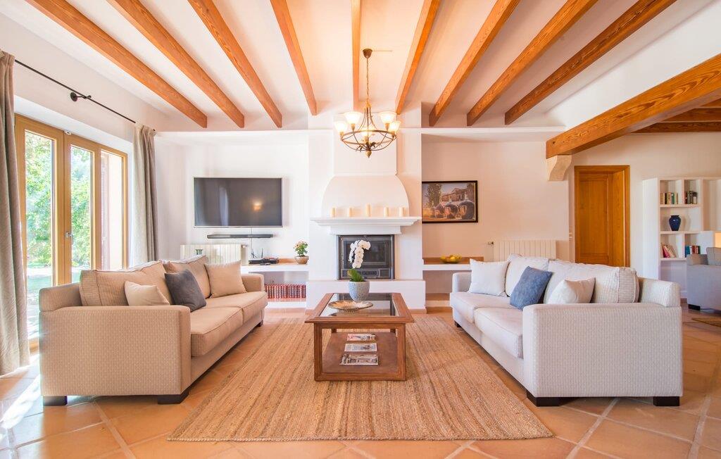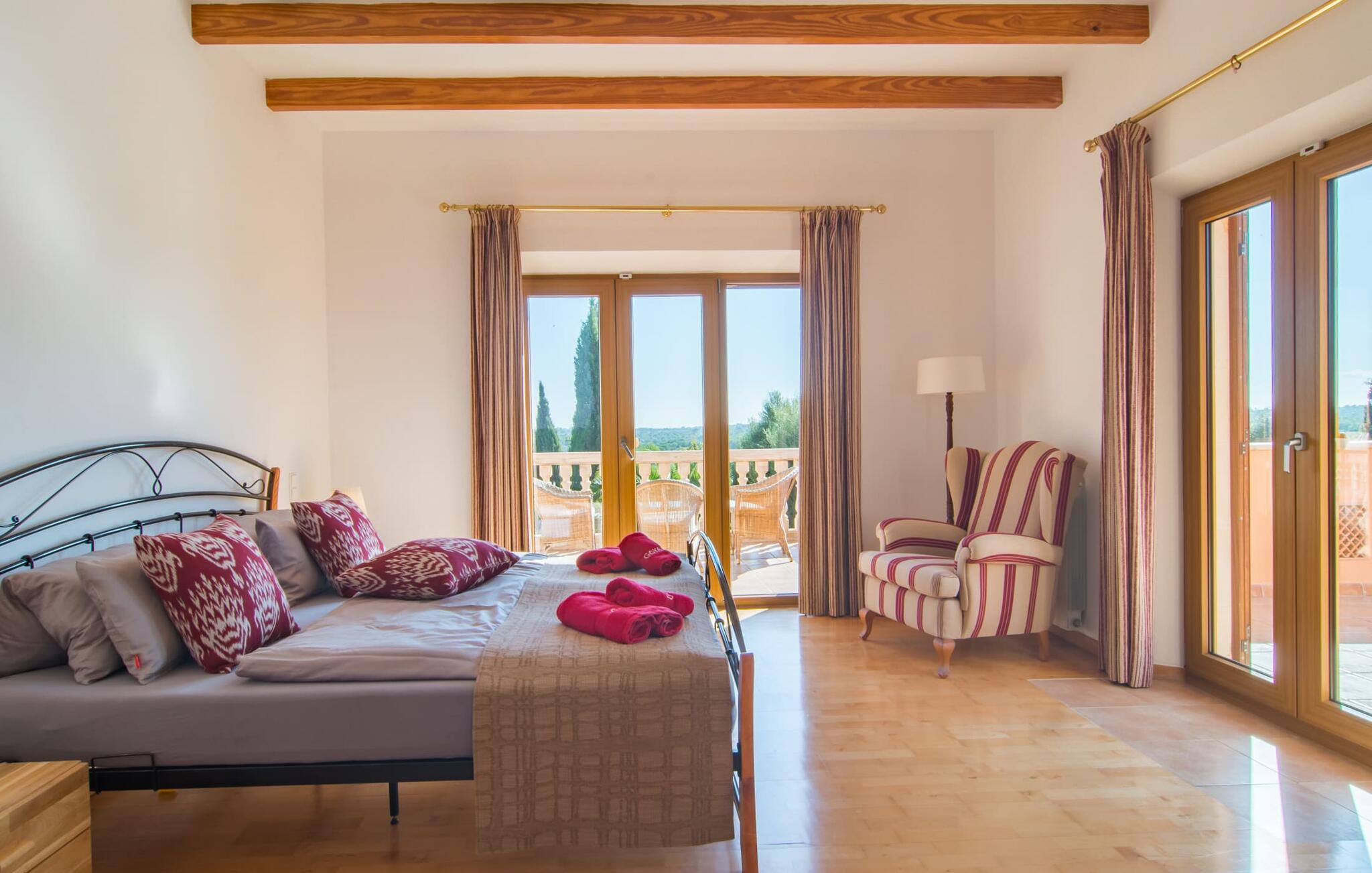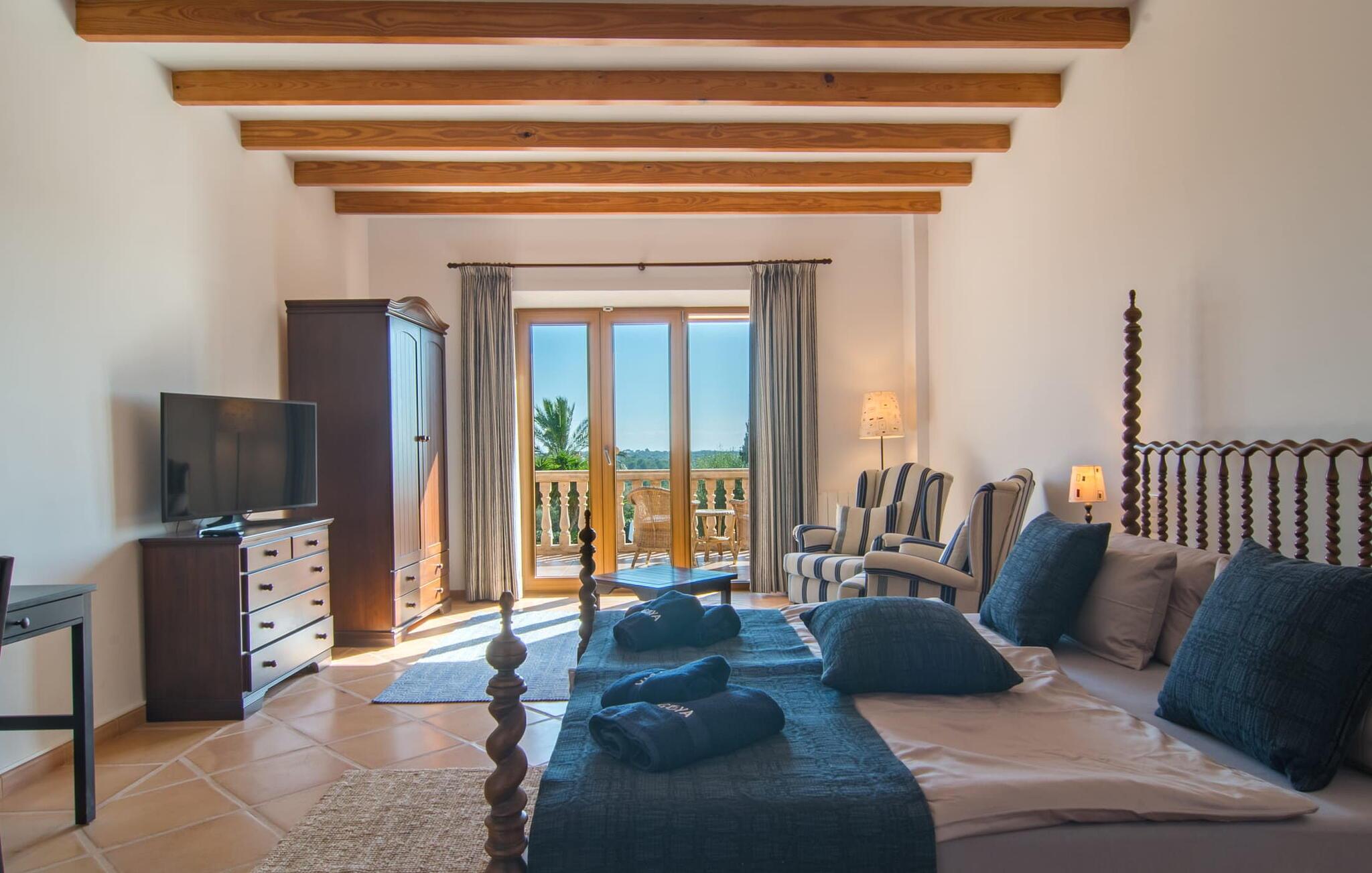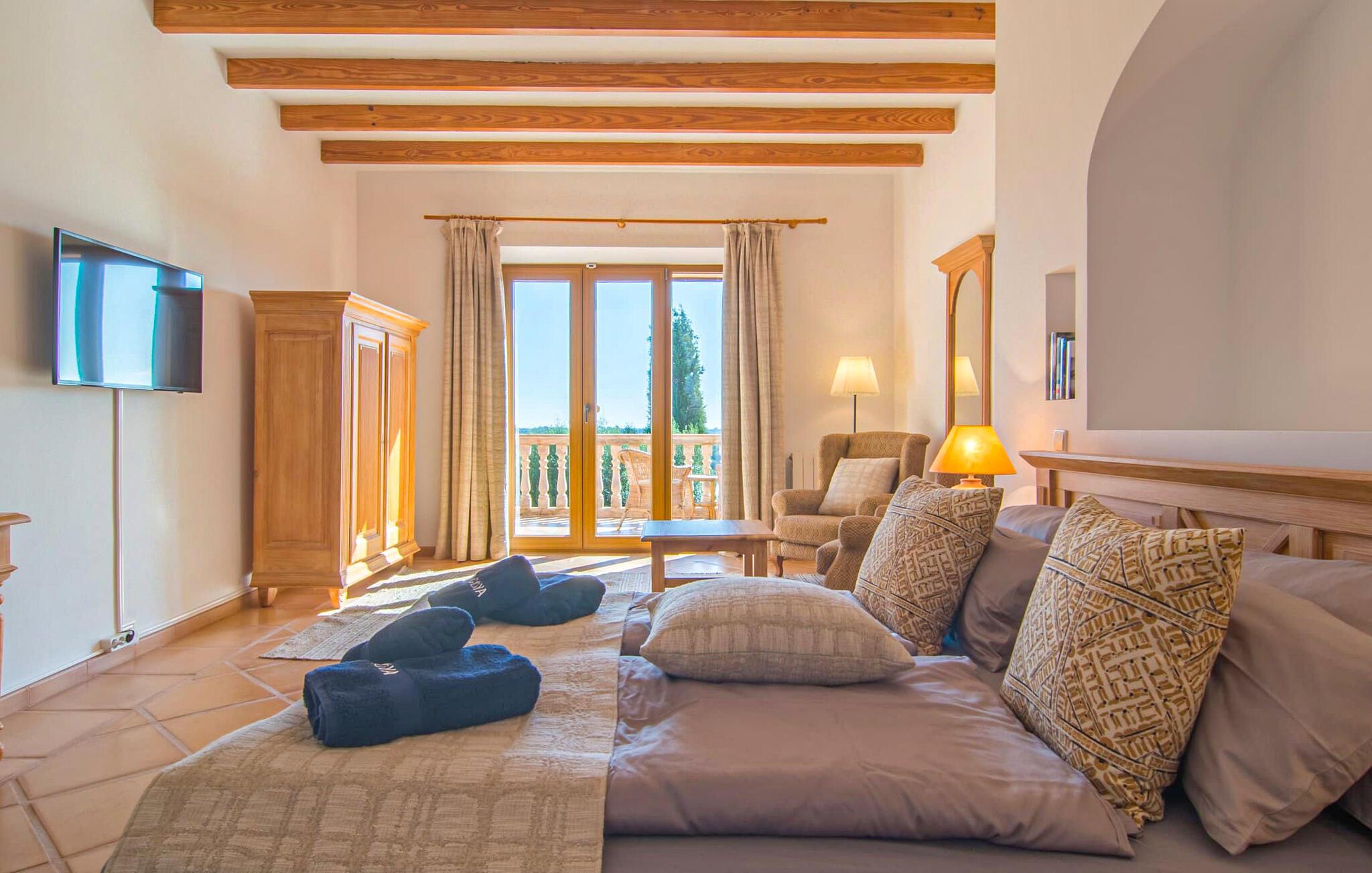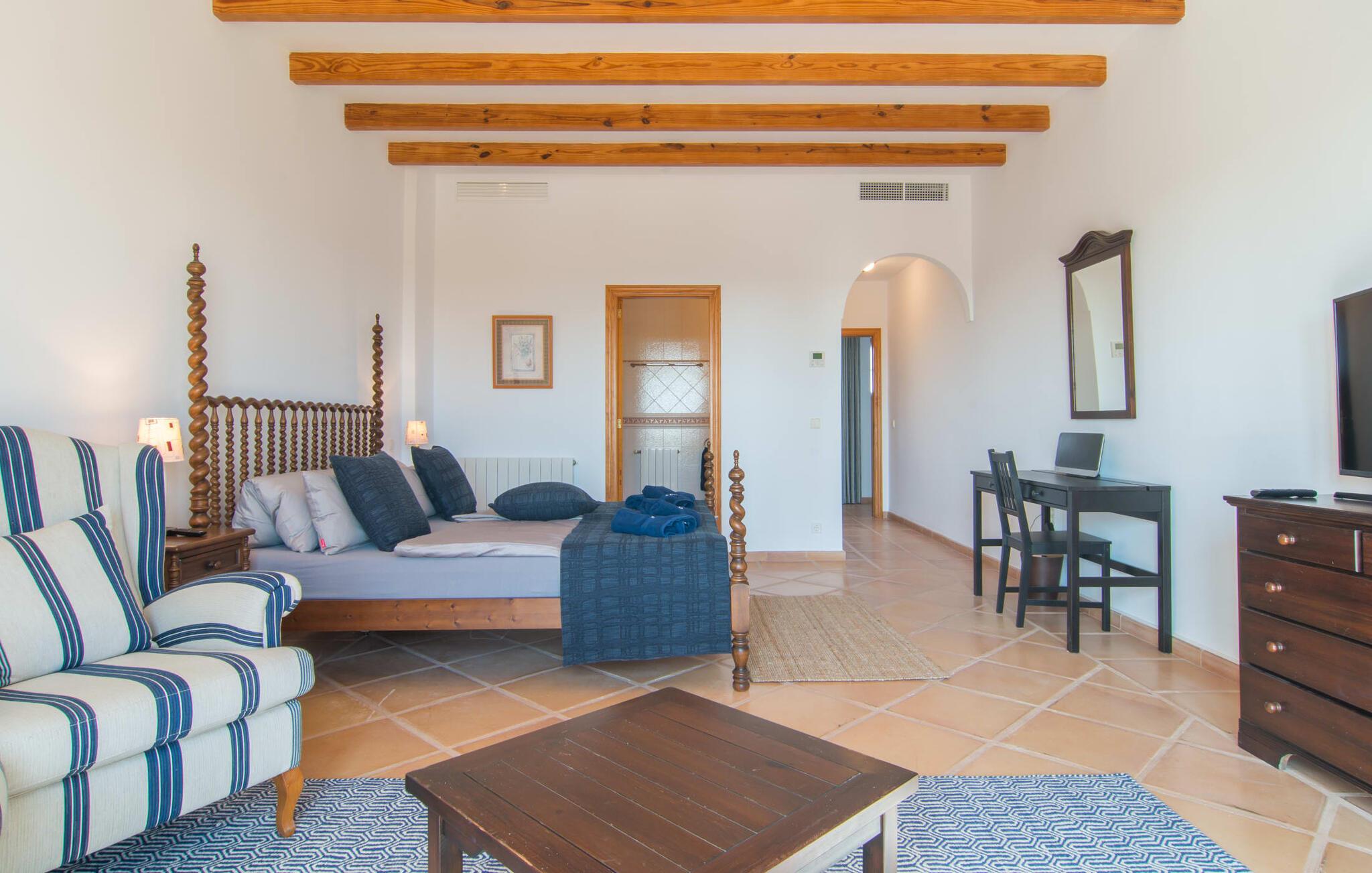 Den imponerende villaejendom "Can Ferragut de Porto Cristo" byder os velkommen med ynde og charme samt en betydelig ejendomsstørrelse på omkring 26.000 m². Haven, der indrammer huset, kan med rette kaldes en park, fordi den systematisk er anlagt med frodige græsplæner, enorme palmer, cypresser, frugttræer og utallige planter, der understreger middelhavskarakteren. Det er derfor næppe overraskende, at der er utallige steder at have det godt på ejendommen - til et øjebliks stilhed, meditation, en morgenyoga-session. Golfspillere eller sportsinteresserede kan nyde et ideelt træningsområde på de velholdte putting greens og træne til udfordringerne på de mallorcanske golfbaner. En smal sti fører fra det elegante feriehus til det attraktive poolområde. På den omkringliggende solterrasse kan I nyde det behagelige klima på komfortable liggestole og finde grønne, skyggefulde pletter. Yderligere overdækkede, jordnære terrasser og solbeskinnede altaner fuldender husets sofistikerede arkitektur. Særligt attraktivt er, at hvert af de velholdte dobbeltværelser har udgang til egen eller fælles terrasse - de seks stille værelser bliver selvstændige enheder med lejlighedspræg. Det en-suite badeværelse er naturligvis et absolut must og placerer denne fabelagtige villa i det øvre premium segment. Husets pragt er indlysende, men dets sofistikering ligger i detaljerne. Udover ovennævnte suiter finder I på 900 m² boligareal en rummelig opholdsstue med hyggelig salonstemning. Den består af et sofaområde foran en pejs og satellit-tv (du kan også nyde et væghængt tv i hvert af de smarte dobbeltværelser), en åben spiseplads, et praktisk opholdsområde og et hyggeligt læsehjørne. Vinduerne åbner ud til verandaen, hvorfor de rummelige værelser er badet i behageligt lysindfald med terracotta-fliser og fritlagte træbjælker. Køkkenet er naturligvis fuldt udstyret og har køleskabe nok til, at I altid har en kølig drink lige ved hånden. I interiøret danner en klassisk mallorcansk stil med et strejf af landlig hygge en særlig attraktiv symbiose med moderne dekorative elementer, der skaber en unik blanding af stilarter. Her kan I ikke kun tilbringe en perfekt ferie, men også holde en større fest i en afslappet atmosfære. Den imponerende villa "Can Ferragut de Porto Cristo" er omgivet af en lige så imponerende stor park med golf putting greens. Den storslåede ejendom er beliggende nær den tidligere fiskerby Porto Cristo på Mallorcas østkyst. I kan gøre jeres indkøb her i supermarkedet eller på det ugentlige marked. Den nærliggende Manacor er ideel til omfattende shoppingture. Smukke strande med fint sand som Cala Anguila eller Cala Mendia er kun en kort køretur væk.