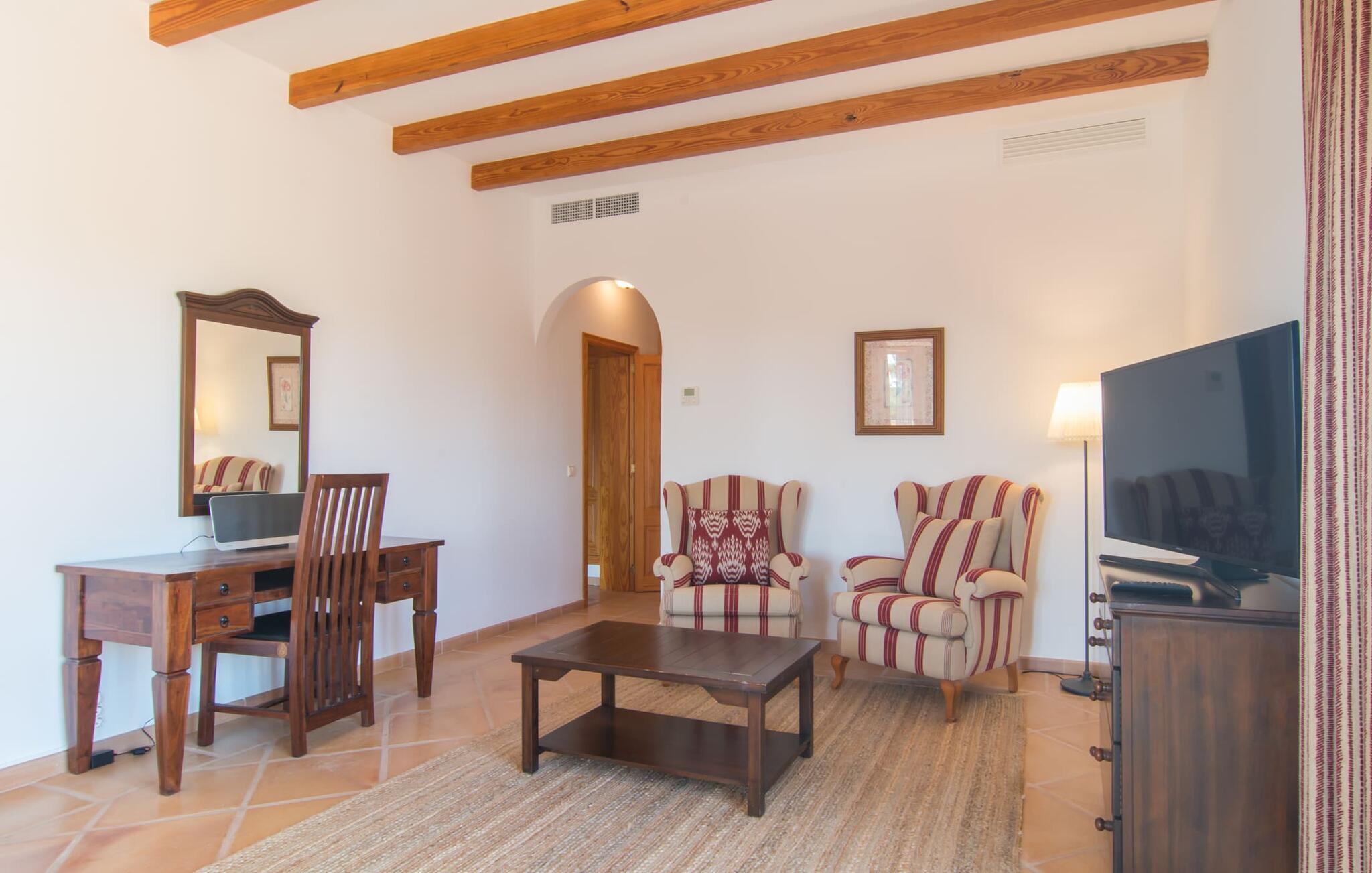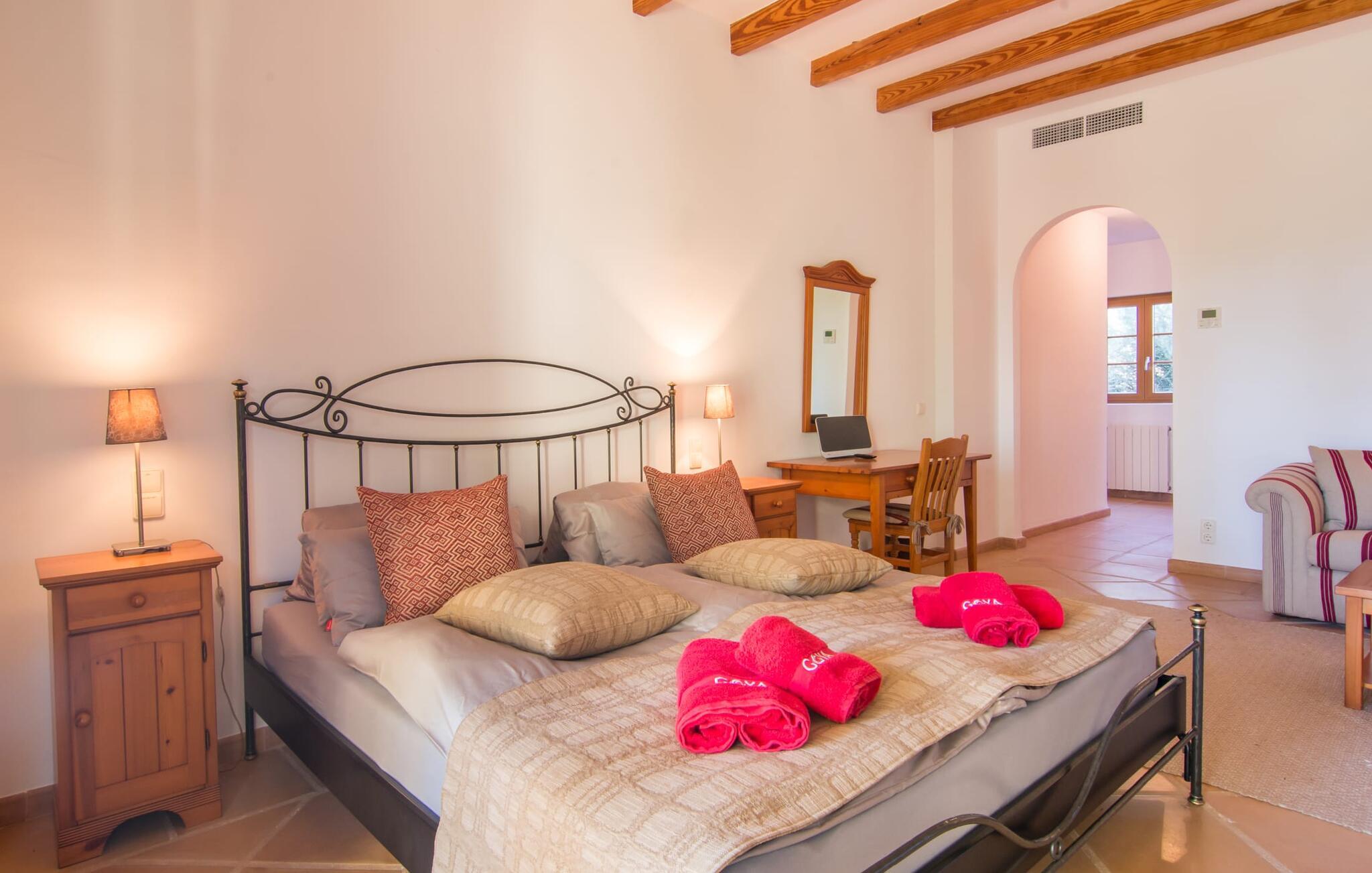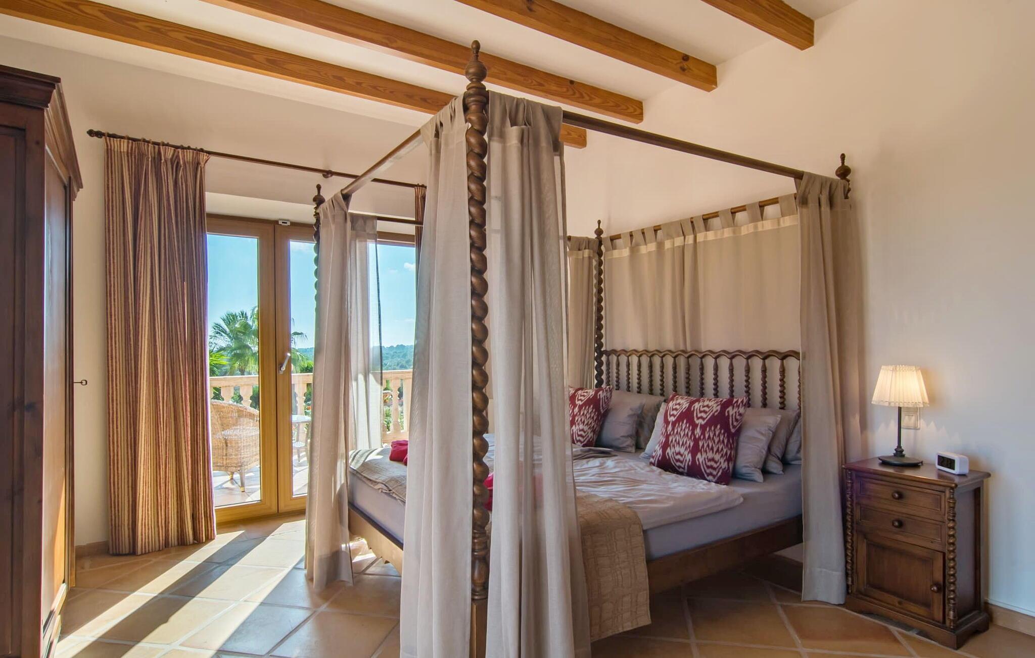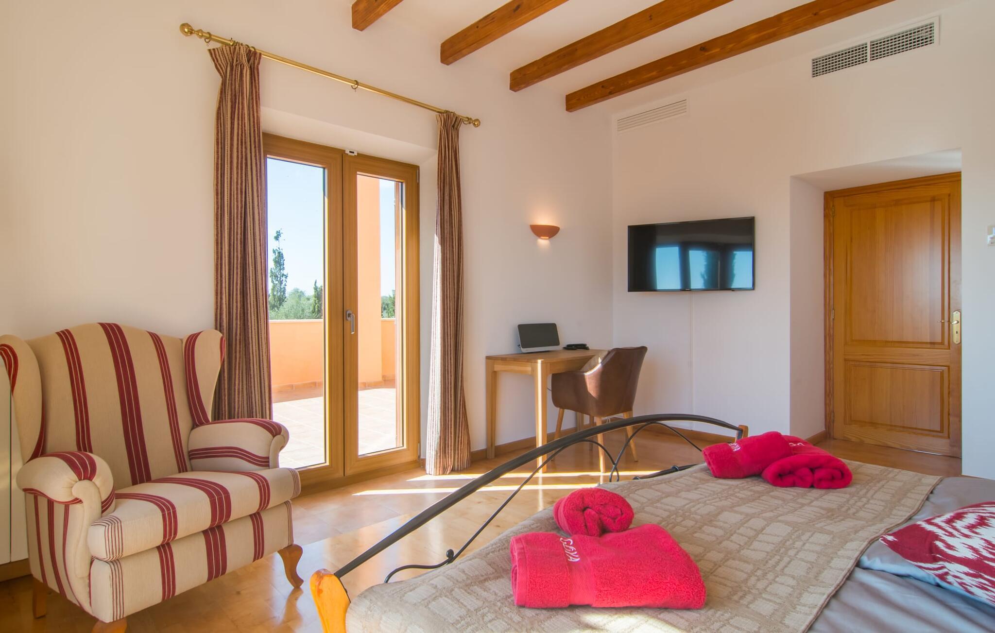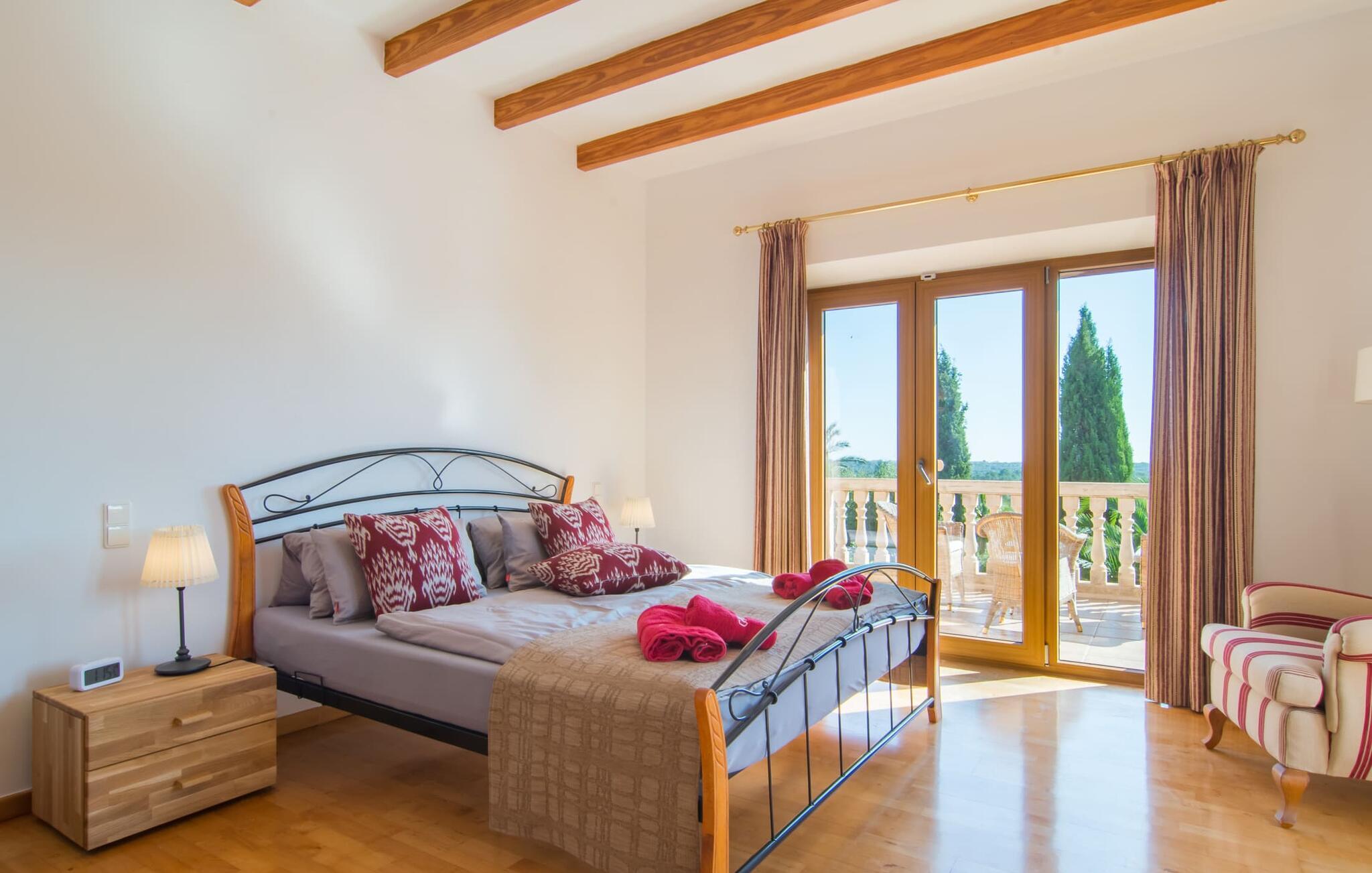 Den imponerende villaejendom "Can Ferragut de Porto Cristo" byder os velkommen med ynde og charme samt en betydelig ejendomsstørrelse på omkring 26.000 m². Haven, der indrammer huset, kan med rette kaldes en park, fordi den systematisk er anlagt med frodige græsplæner, enorme palmer, cypresser, frugttræer og utallige planter, der understreger middelhavskarakteren. Det er derfor næppe overraskende, at der er utallige steder at have det godt på ejendommen - til et øjebliks stilhed, meditation, en morgenyoga-session. Golfspillere eller sportsinteresserede kan nyde et ideelt træningsområde på de velholdte putting greens og træne til udfordringerne på de mallorcanske golfbaner. En smal sti fører fra det elegante feriehus til det attraktive poolområde. På den omkringliggende solterrasse kan I nyde det behagelige klima på komfortable liggestole og finde grønne, skyggefulde pletter. Yderligere overdækkede, jordnære terrasser og solbeskinnede altaner fuldender husets sofistikerede arkitektur. Særligt attraktivt er, at hvert af de velholdte dobbeltværelser har udgang til egen eller fælles terrasse - de seks stille værelser bliver selvstændige enheder med lejlighedspræg. Det en-suite badeværelse er naturligvis et absolut must og placerer denne fabelagtige villa i det øvre premium segment. Husets pragt er indlysende, men dets sofistikering ligger i detaljerne. Udover ovennævnte suiter finder I på 900 m² boligareal en rummelig opholdsstue med hyggelig salonstemning. Den består af et sofaområde foran en pejs og satellit-tv (du kan også nyde et væghængt tv i hvert af de smarte dobbeltværelser), en åben spiseplads, et praktisk opholdsområde og et hyggeligt læsehjørne. Vinduerne åbner ud til verandaen, hvorfor de rummelige værelser er badet i behageligt lysindfald med terracotta-fliser og fritlagte træbjælker. Køkkenet er naturligvis fuldt udstyret og har køleskabe nok til, at I altid har en kølig drink lige ved hånden. I interiøret danner en klassisk mallorcansk stil med et strejf af landlig hygge en særlig attraktiv symbiose med moderne dekorative elementer, der skaber en unik blanding af stilarter. Her kan I ikke kun tilbringe en perfekt ferie, men også holde en større fest i en afslappet atmosfære. Den imponerende villa "Can Ferragut de Porto Cristo" er omgivet af en lige så imponerende stor park med golf putting greens. Den storslåede ejendom er beliggende nær den tidligere fiskerby Porto Cristo på Mallorcas østkyst. I kan gøre jeres indkøb her i supermarkedet eller på det ugentlige marked. Den nærliggende Manacor er ideel til omfattende shoppingture. Smukke strande med fint sand som Cala Anguila eller Cala Mendia er kun en kort køretur væk.