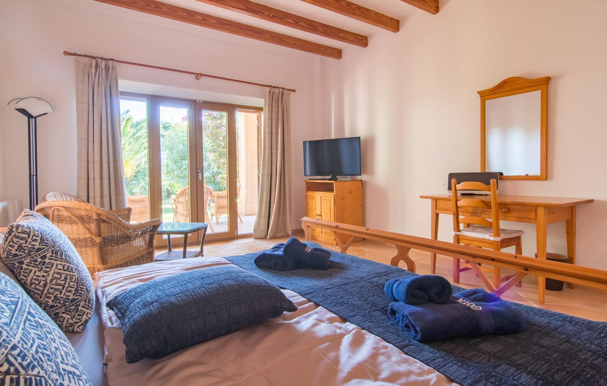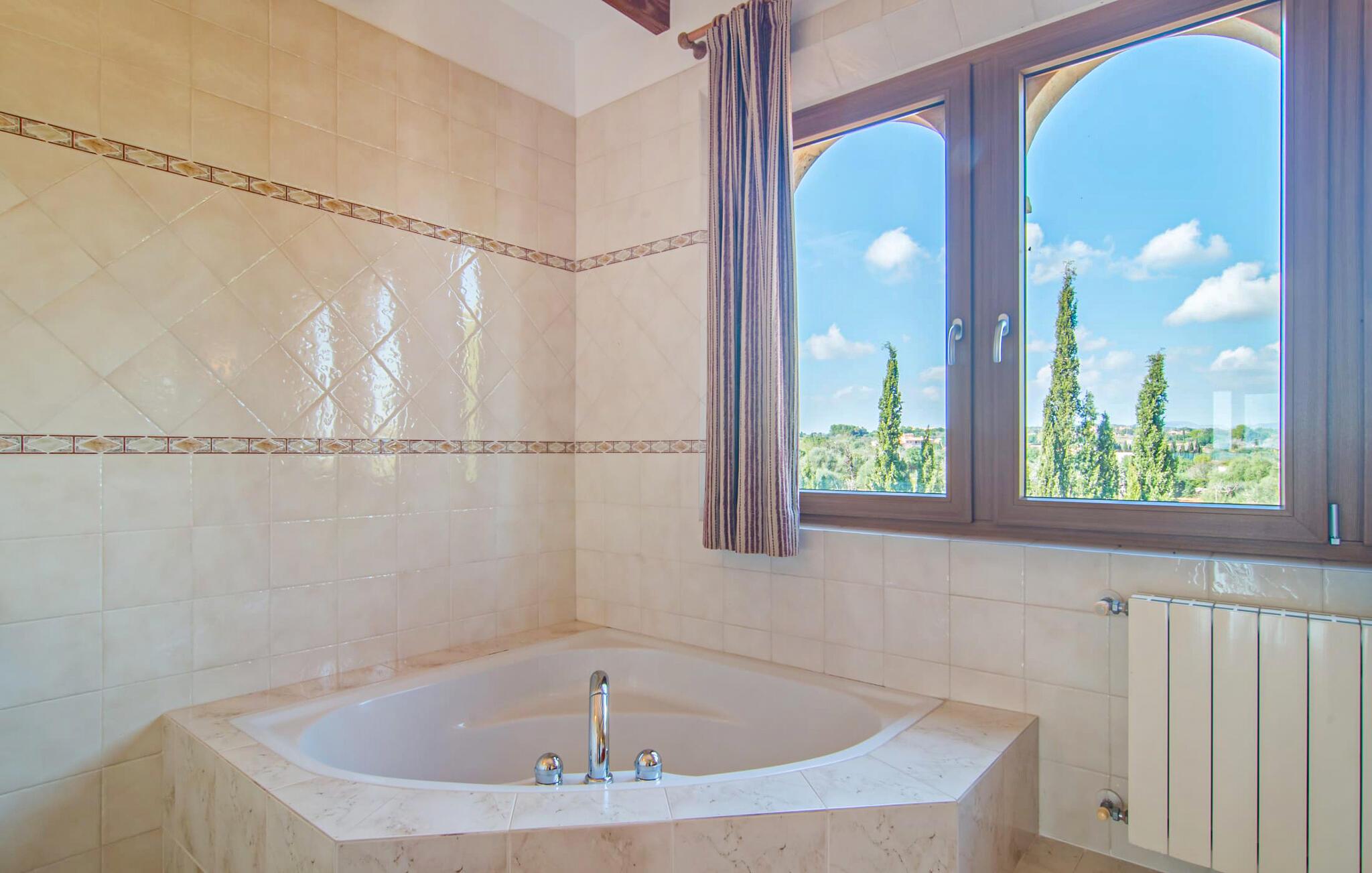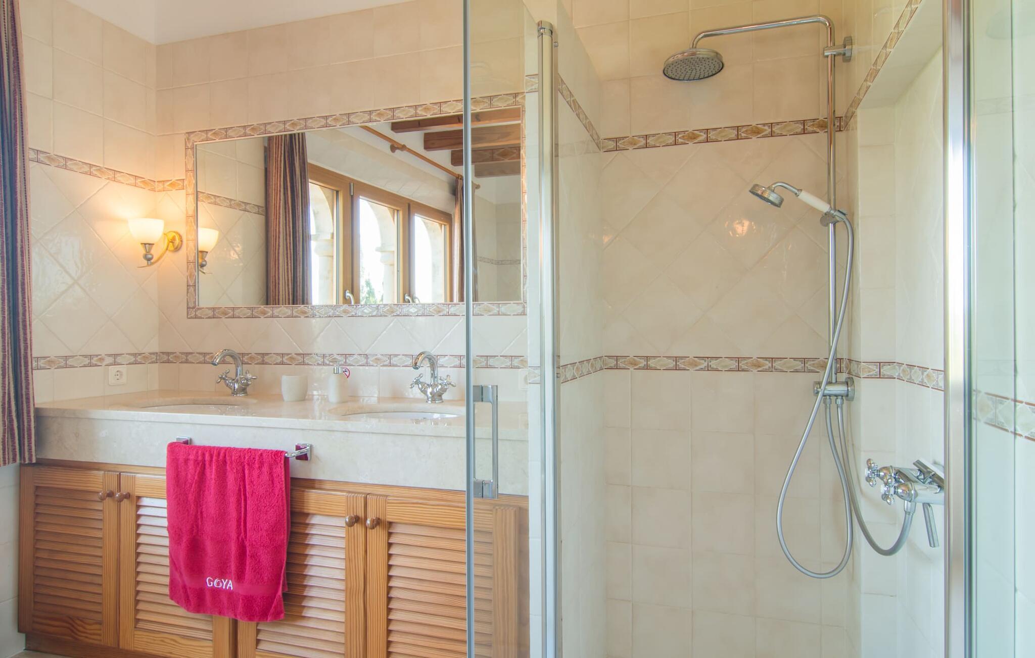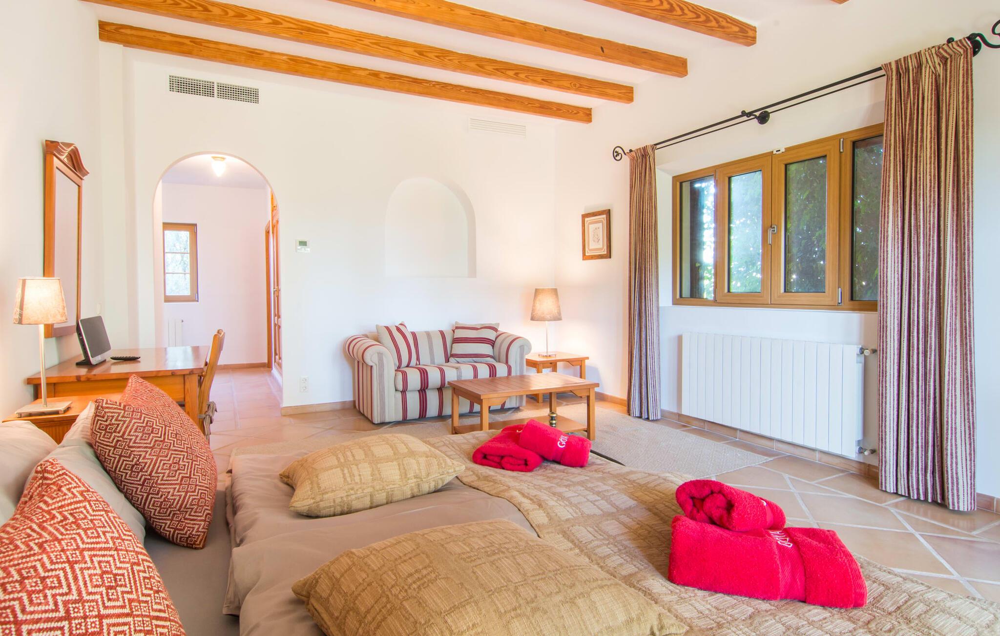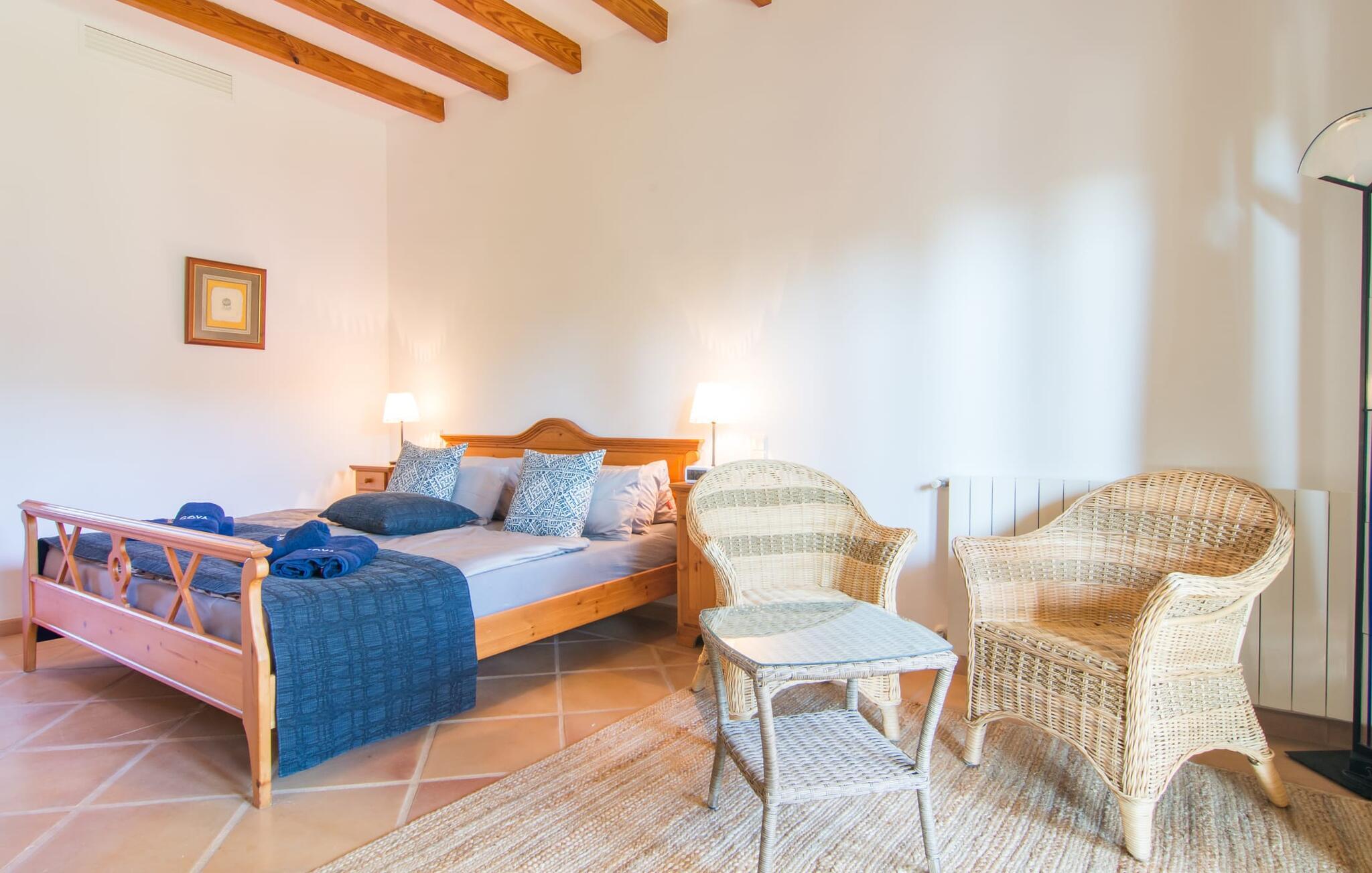 Den imponerende villaejendom "Can Ferragut de Porto Cristo" byder os velkommen med ynde og charme samt en betydelig ejendomsstørrelse på omkring 26.000 m². Haven, der indrammer huset, kan med rette kaldes en park, fordi den systematisk er anlagt med frodige græsplæner, enorme palmer, cypresser, frugttræer og utallige planter, der understreger middelhavskarakteren. Det er derfor næppe overraskende, at der er utallige steder at have det godt på ejendommen - til et øjebliks stilhed, meditation, en morgenyoga-session. Golfspillere eller sportsinteresserede kan nyde et ideelt træningsområde på de velholdte putting greens og træne til udfordringerne på de mallorcanske golfbaner. En smal sti fører fra det elegante feriehus til det attraktive poolområde. På den omkringliggende solterrasse kan I nyde det behagelige klima på komfortable liggestole og finde grønne, skyggefulde pletter. Yderligere overdækkede, jordnære terrasser og solbeskinnede altaner fuldender husets sofistikerede arkitektur. Særligt attraktivt er, at hvert af de velholdte dobbeltværelser har udgang til egen eller fælles terrasse - de seks stille værelser bliver selvstændige enheder med lejlighedspræg. Det en-suite badeværelse er naturligvis et absolut must og placerer denne fabelagtige villa i det øvre premium segment. Husets pragt er indlysende, men dets sofistikering ligger i detaljerne. Udover ovennævnte suiter finder I på 900 m² boligareal en rummelig opholdsstue med hyggelig salonstemning. Den består af et sofaområde foran en pejs og satellit-tv (du kan også nyde et væghængt tv i hvert af de smarte dobbeltværelser), en åben spiseplads, et praktisk opholdsområde og et hyggeligt læsehjørne. Vinduerne åbner ud til verandaen, hvorfor de rummelige værelser er badet i behageligt lysindfald med terracotta-fliser og fritlagte træbjælker. Køkkenet er naturligvis fuldt udstyret og har køleskabe nok til, at I altid har en kølig drink lige ved hånden. I interiøret danner en klassisk mallorcansk stil med et strejf af landlig hygge en særlig attraktiv symbiose med moderne dekorative elementer, der skaber en unik blanding af stilarter. Her kan I ikke kun tilbringe en perfekt ferie, men også holde en større fest i en afslappet atmosfære. Den imponerende villa "Can Ferragut de Porto Cristo" er omgivet af en lige så imponerende stor park med golf putting greens. Den storslåede ejendom er beliggende nær den tidligere fiskerby Porto Cristo på Mallorcas østkyst. I kan gøre jeres indkøb her i supermarkedet eller på det ugentlige marked. Den nærliggende Manacor er ideel til omfattende shoppingture. Smukke strande med fint sand som Cala Anguila eller Cala Mendia er kun en kort køretur væk.