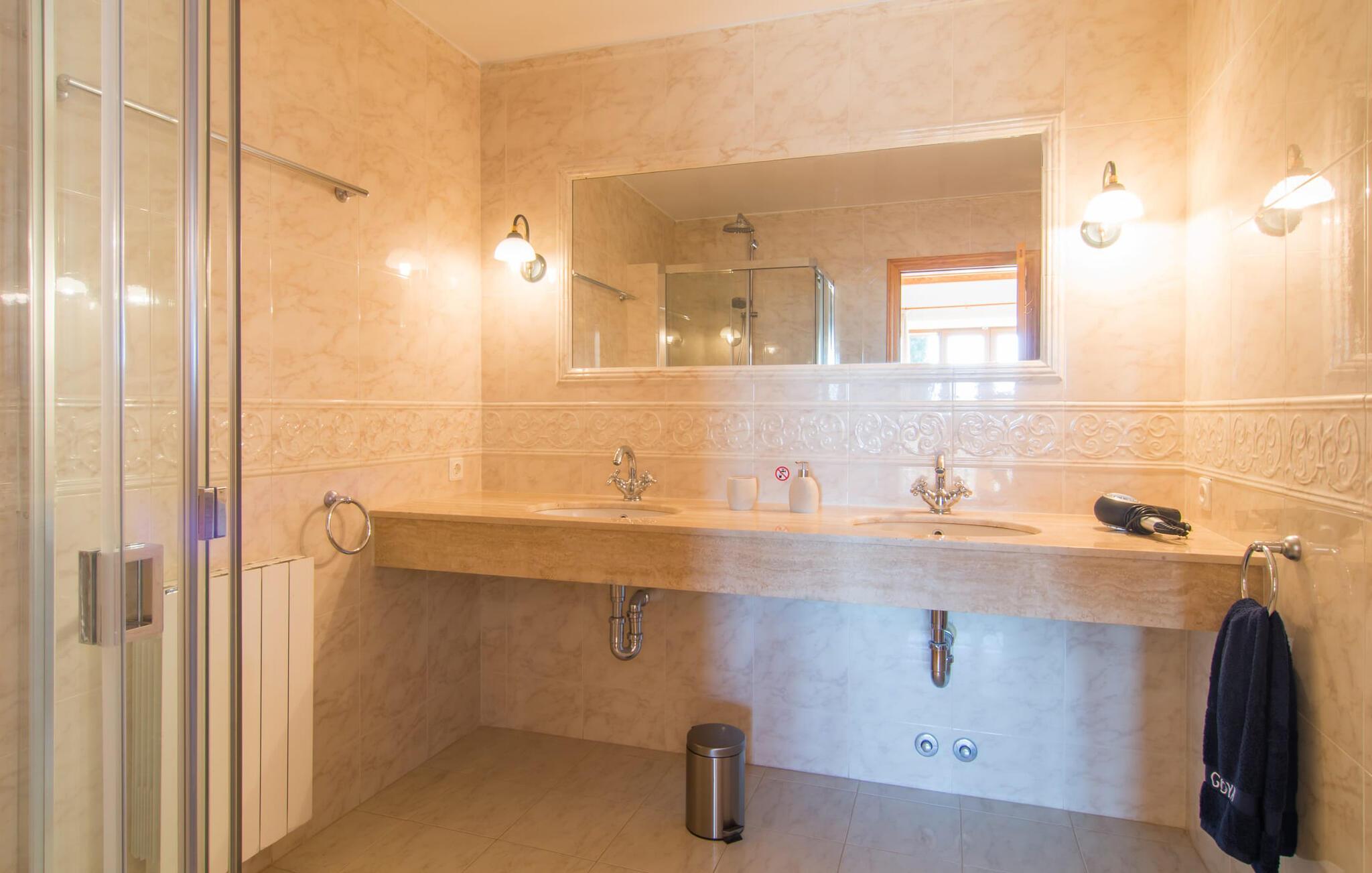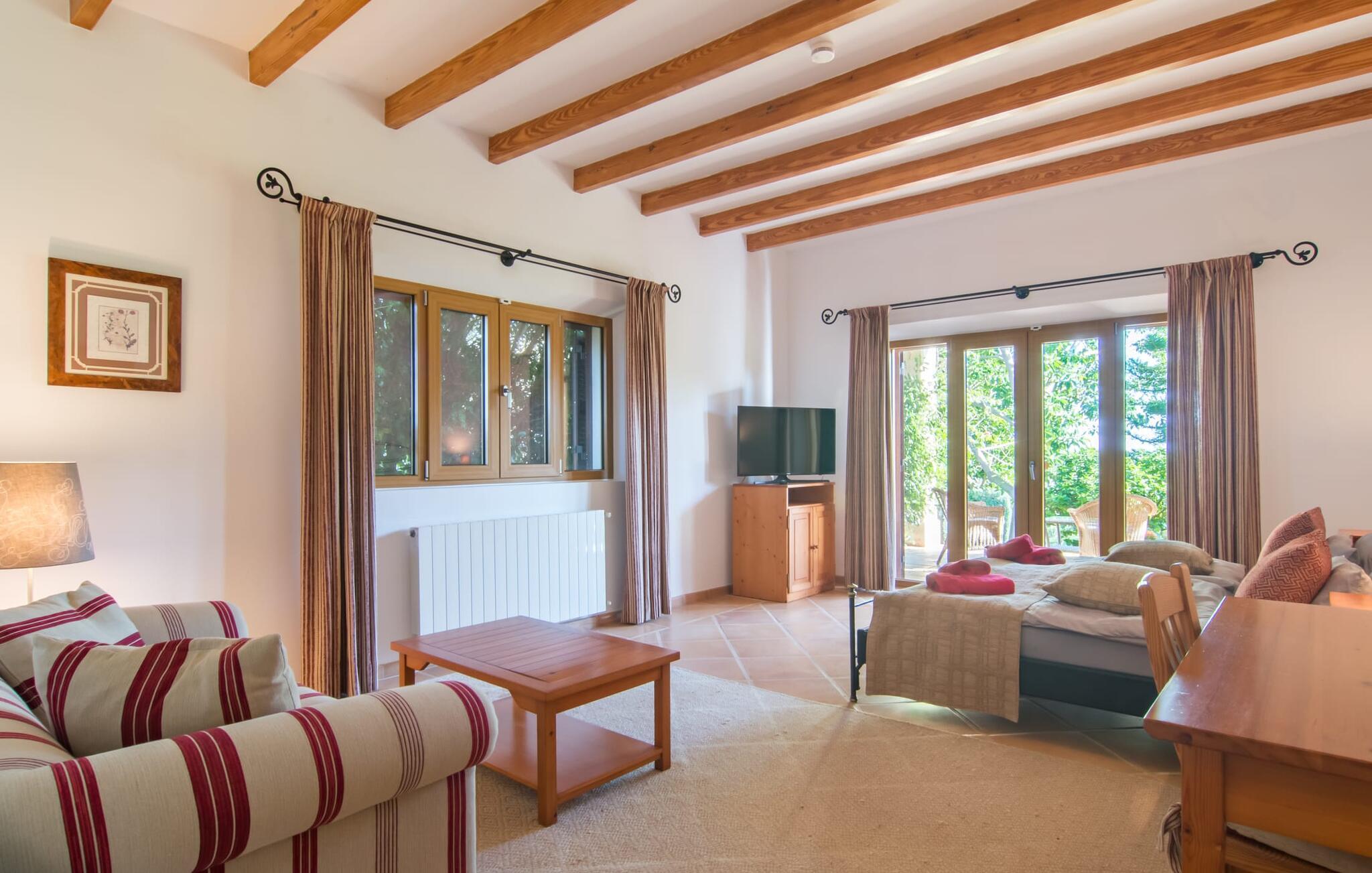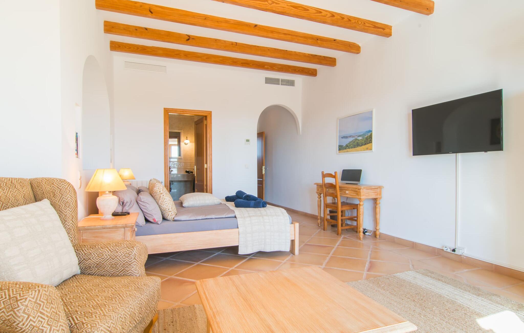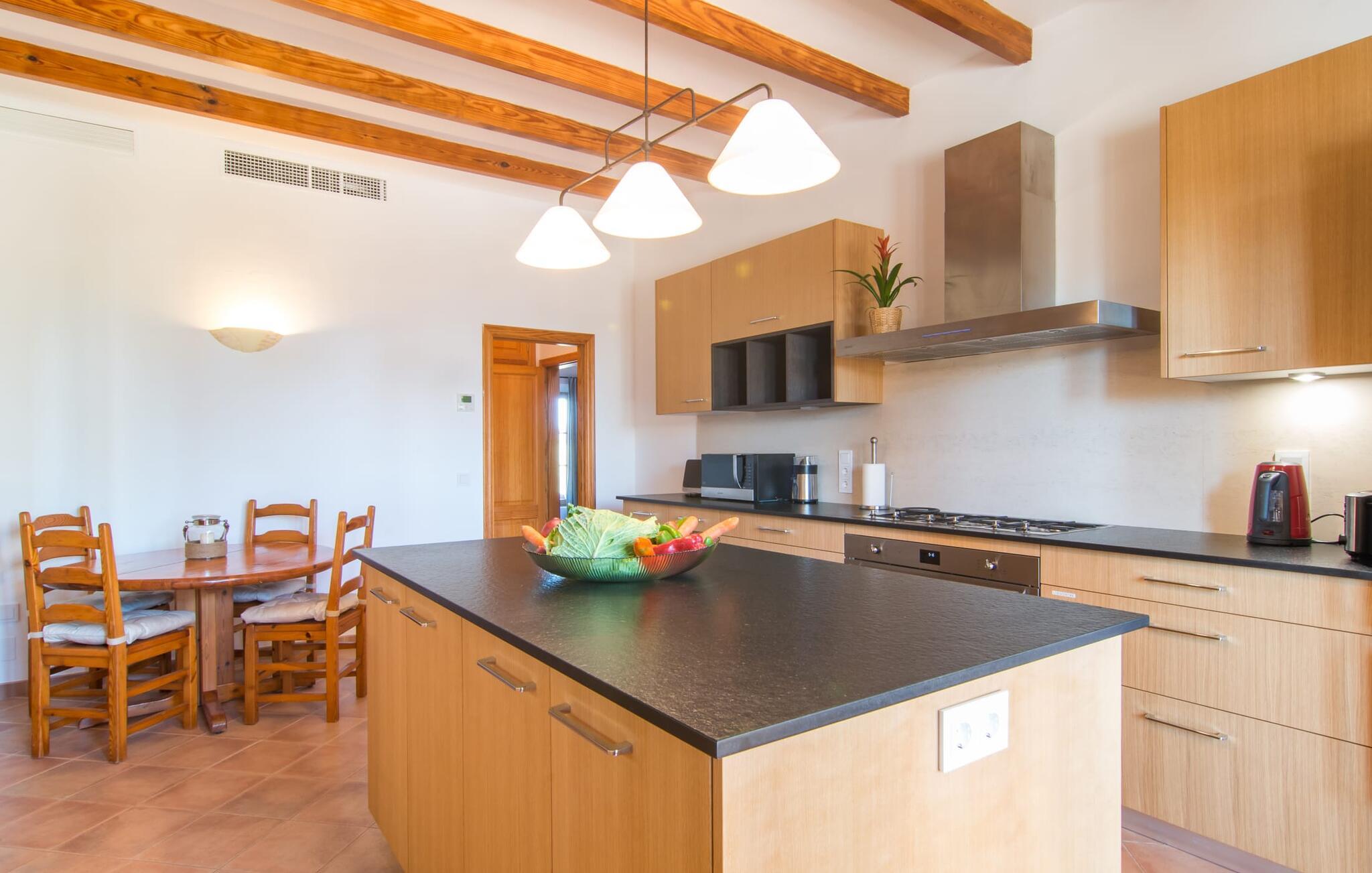 Den imponerende villaejendom "Can Ferragut de Porto Cristo" byder os velkommen med ynde og charme samt en betydelig ejendomsstørrelse på omkring 26.000 m². Haven, der indrammer huset, kan med rette kaldes en park, fordi den systematisk er anlagt med frodige græsplæner, enorme palmer, cypresser, frugttræer og utallige planter, der understreger middelhavskarakteren. Det er derfor næppe overraskende, at der er utallige steder at have det godt på ejendommen - til et øjebliks stilhed, meditation, en morgenyoga-session. Golfspillere eller sportsinteresserede kan nyde et ideelt træningsområde på de velholdte putting greens og træne til udfordringerne på de mallorcanske golfbaner. En smal sti fører fra det elegante feriehus til det attraktive poolområde. På den omkringliggende solterrasse kan I nyde det behagelige klima på komfortable liggestole og finde grønne, skyggefulde pletter. Yderligere overdækkede, jordnære terrasser og solbeskinnede altaner fuldender husets sofistikerede arkitektur. Særligt attraktivt er, at hvert af de velholdte dobbeltværelser har udgang til egen eller fælles terrasse - de seks stille værelser bliver selvstændige enheder med lejlighedspræg. Det en-suite badeværelse er naturligvis et absolut must og placerer denne fabelagtige villa i det øvre premium segment. Husets pragt er indlysende, men dets sofistikering ligger i detaljerne. Udover ovennævnte suiter finder I på 900 m² boligareal en rummelig opholdsstue med hyggelig salonstemning. Den består af et sofaområde foran en pejs og satellit-tv (du kan også nyde et væghængt tv i hvert af de smarte dobbeltværelser), en åben spiseplads, et praktisk opholdsområde og et hyggeligt læsehjørne. Vinduerne åbner ud til verandaen, hvorfor de rummelige værelser er badet i behageligt lysindfald med terracotta-fliser og fritlagte træbjælker. Køkkenet er naturligvis fuldt udstyret og har køleskabe nok til, at I altid har en kølig drink lige ved hånden. I interiøret danner en klassisk mallorcansk stil med et strejf af landlig hygge en særlig attraktiv symbiose med moderne dekorative elementer, der skaber en unik blanding af stilarter. Her kan I ikke kun tilbringe en perfekt ferie, men også holde en større fest i en afslappet atmosfære. Den imponerende villa "Can Ferragut de Porto Cristo" er omgivet af en lige så imponerende stor park med golf putting greens. Den storslåede ejendom er beliggende nær den tidligere fiskerby Porto Cristo på Mallorcas østkyst. I kan gøre jeres indkøb her i supermarkedet eller på det ugentlige marked. Den nærliggende Manacor er ideel til omfattende shoppingture. Smukke strande med fint sand som Cala Anguila eller Cala Mendia er kun en kort køretur væk.