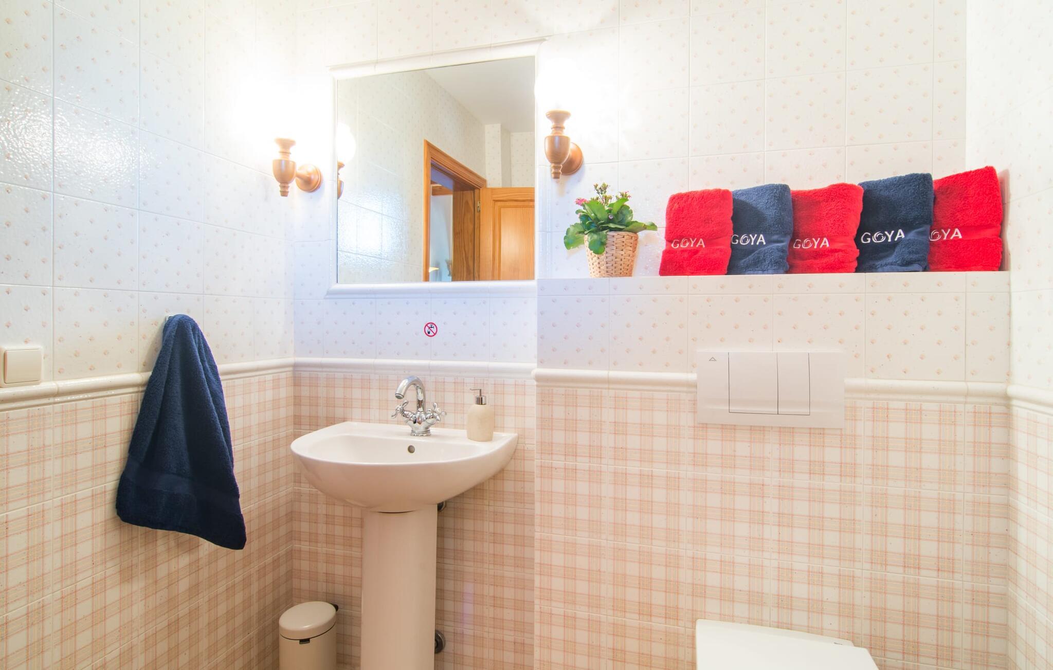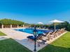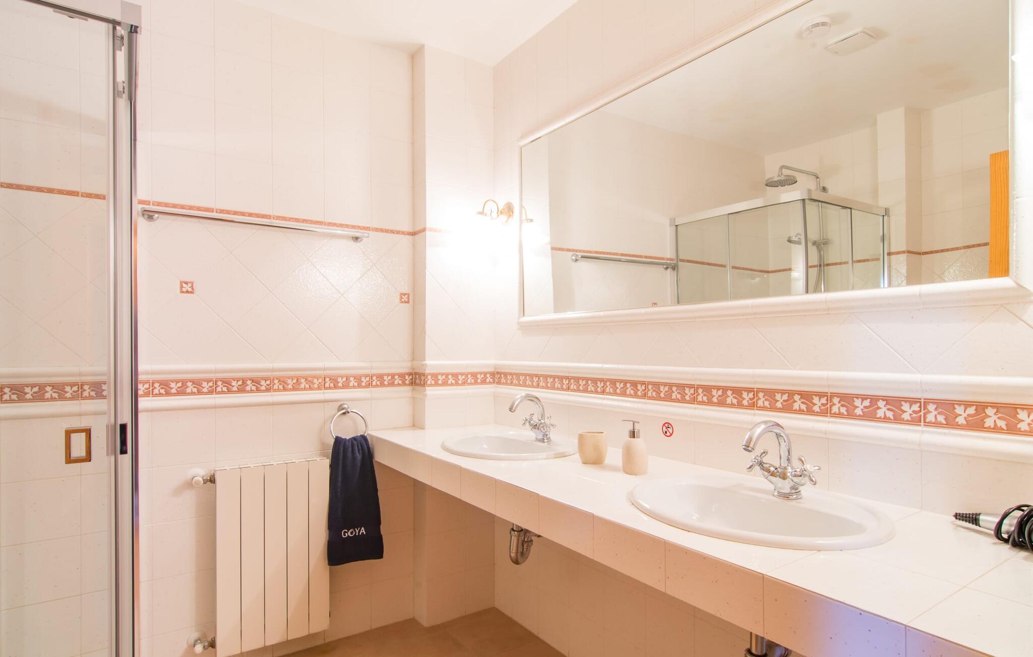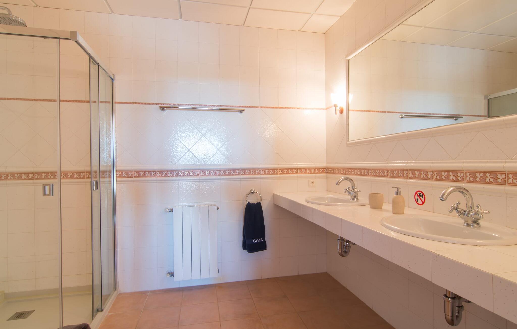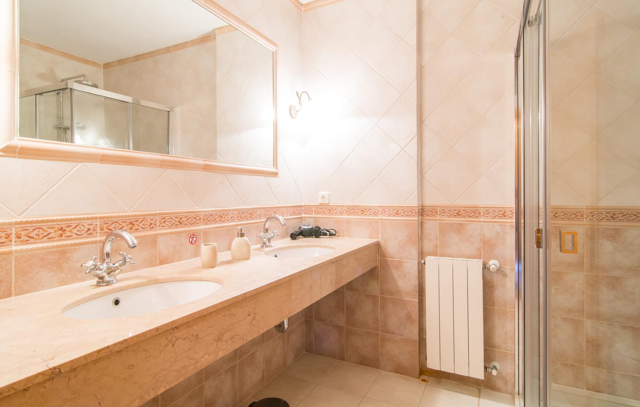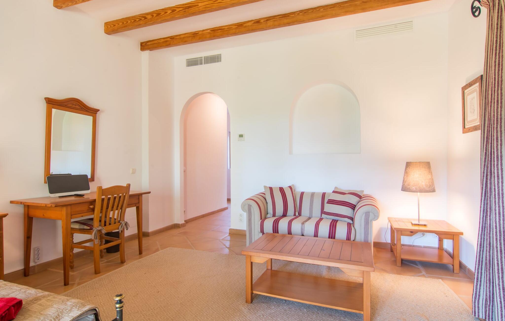 Den imponerende villaejendom "Can Ferragut de Porto Cristo" byder os velkommen med ynde og charme samt en betydelig ejendomsstørrelse på omkring 26.000 m². Haven, der indrammer huset, kan med rette kaldes en park, fordi den systematisk er anlagt med frodige græsplæner, enorme palmer, cypresser, frugttræer og utallige planter, der understreger middelhavskarakteren. Det er derfor næppe overraskende, at der er utallige steder at have det godt på ejendommen - til et øjebliks stilhed, meditation, en morgenyoga-session. Golfspillere eller sportsinteresserede kan nyde et ideelt træningsområde på de velholdte putting greens og træne til udfordringerne på de mallorcanske golfbaner. En smal sti fører fra det elegante feriehus til det attraktive poolområde. På den omkringliggende solterrasse kan I nyde det behagelige klima på komfortable liggestole og finde grønne, skyggefulde pletter. Yderligere overdækkede, jordnære terrasser og solbeskinnede altaner fuldender husets sofistikerede arkitektur. Særligt attraktivt er, at hvert af de velholdte dobbeltværelser har udgang til egen eller fælles terrasse - de seks stille værelser bliver selvstændige enheder med lejlighedspræg. Det en-suite badeværelse er naturligvis et absolut must og placerer denne fabelagtige villa i det øvre premium segment. Husets pragt er indlysende, men dets sofistikering ligger i detaljerne. Udover ovennævnte suiter finder I på 900 m² boligareal en rummelig opholdsstue med hyggelig salonstemning. Den består af et sofaområde foran en pejs og satellit-tv (du kan også nyde et væghængt tv i hvert af de smarte dobbeltværelser), en åben spiseplads, et praktisk opholdsområde og et hyggeligt læsehjørne. Vinduerne åbner ud til verandaen, hvorfor de rummelige værelser er badet i behageligt lysindfald med terracotta-fliser og fritlagte træbjælker. Køkkenet er naturligvis fuldt udstyret og har køleskabe nok til, at I altid har en kølig drink lige ved hånden. I interiøret danner en klassisk mallorcansk stil med et strejf af landlig hygge en særlig attraktiv symbiose med moderne dekorative elementer, der skaber en unik blanding af stilarter. Her kan I ikke kun tilbringe en perfekt ferie, men også holde en større fest i en afslappet atmosfære. Den imponerende villa "Can Ferragut de Porto Cristo" er omgivet af en lige så imponerende stor park med golf putting greens. Den storslåede ejendom er beliggende nær den tidligere fiskerby Porto Cristo på Mallorcas østkyst. I kan gøre jeres indkøb her i supermarkedet eller på det ugentlige marked. Den nærliggende Manacor er ideel til omfattende shoppingture. Smukke strande med fint sand som Cala Anguila eller Cala Mendia er kun en kort køretur væk.
