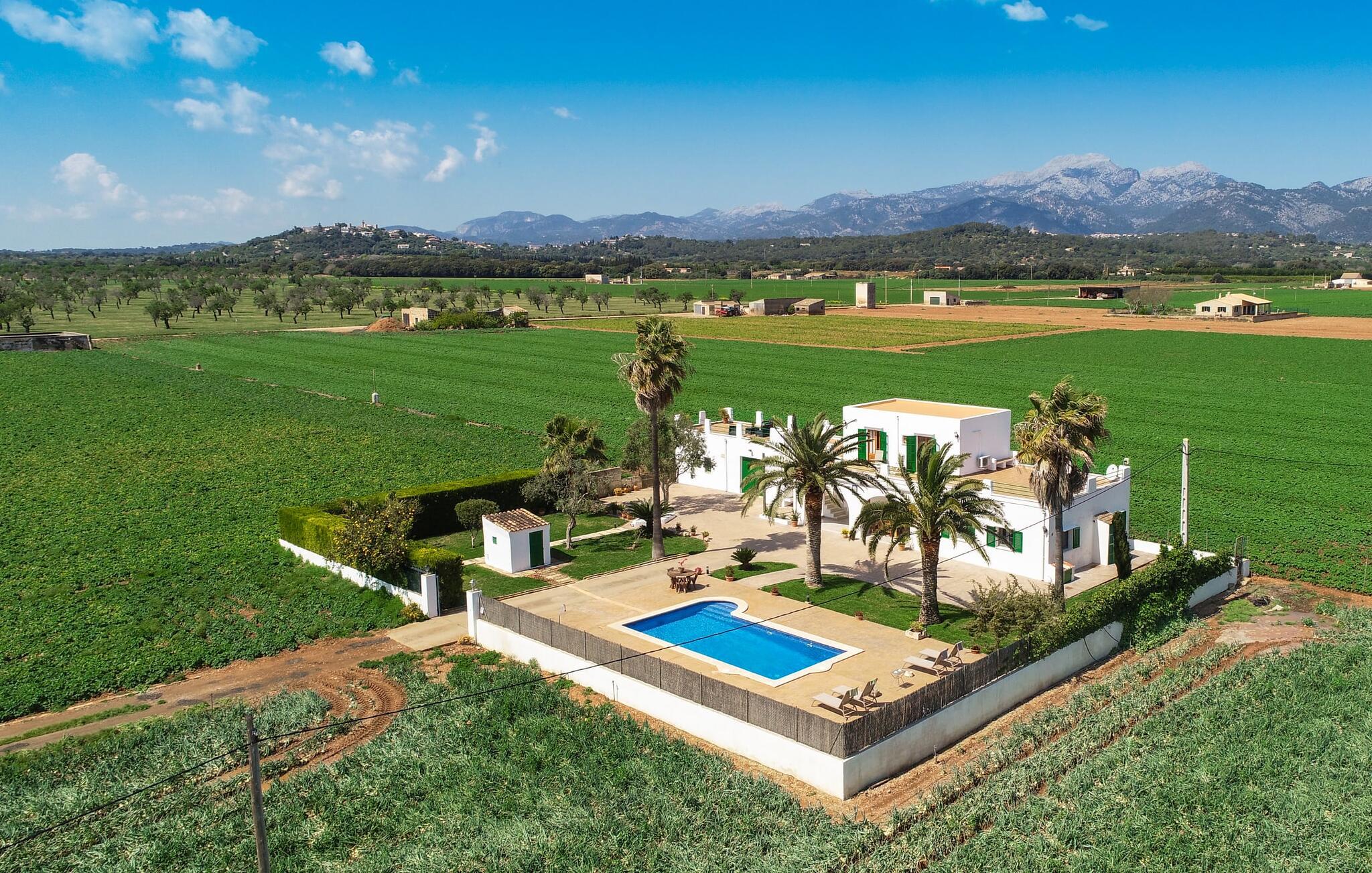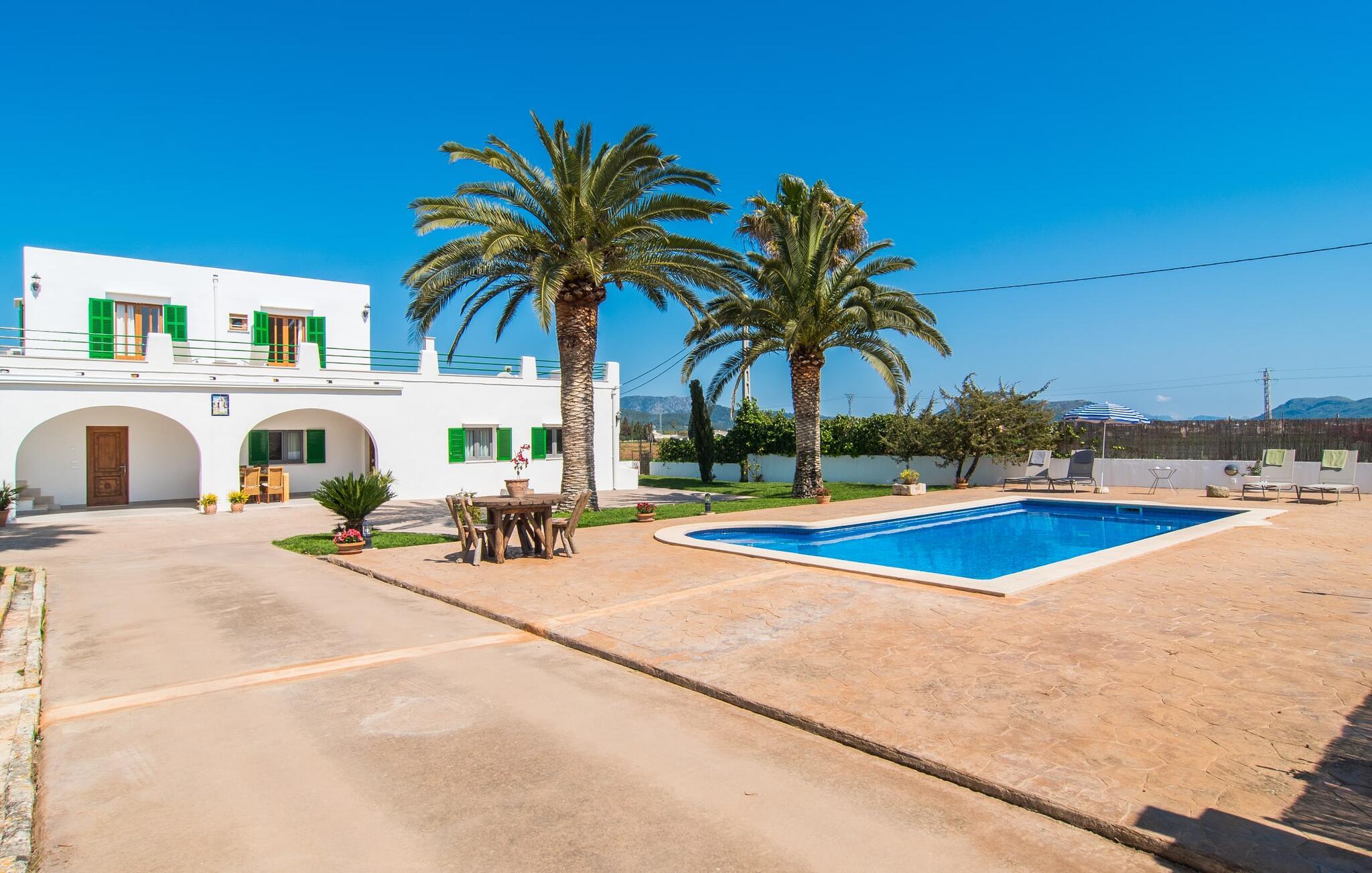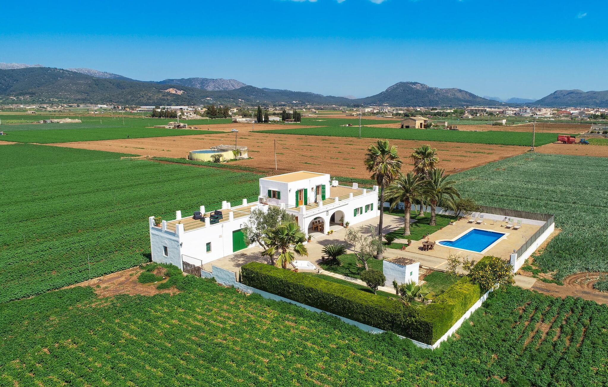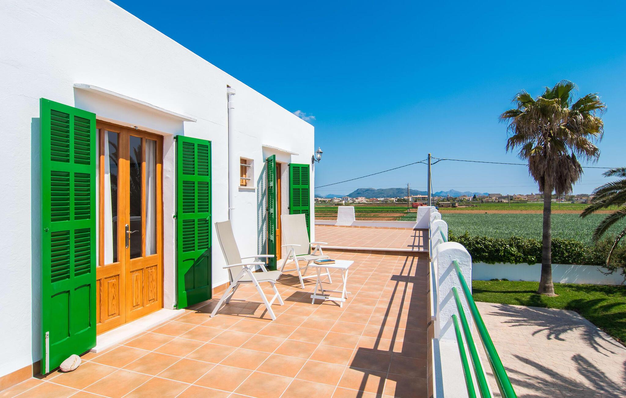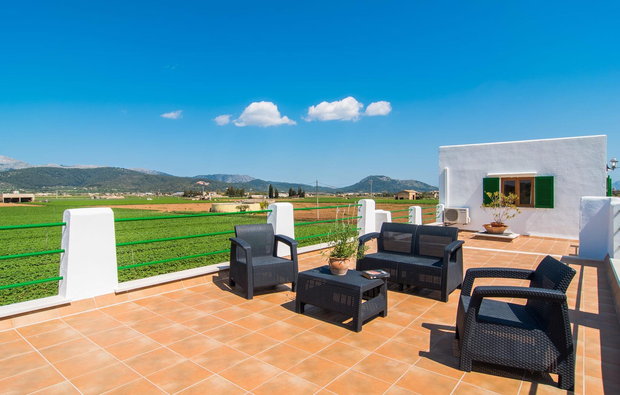 Kommer I fra motorvejen, lige før porten til Sa Poblas, fører den brede vej mellem bakkerne jer til villaen "Can Goet". Det funklende hvide hus ligger ved foden af de majestætiske Tramuntana-bjerge. Huset er omgivet af en lille hvid mur, langs hvilken grønne hække og imponerende høje palmer vokser, der markerer området, hvorpå den smukke villa med smaragdgrønne skodder står. Husets arkitektur er en vellykket blanding af typiske Ibiza-villaer og klassisk kolonistil. Denne storslåede sydvendte bygning har en skræddersyet swimmingpool dekoreret med azurblå mosaik, bekvemt placeret foran huset. Omgivet af en terrasse lavet af smukke natursten inviterer den til at slappe af i solens stråler, som er jævnt fordelt over dens overflade. Det runde bord, udstyret med en parasol, er det perfekte sted at køle af og nyde en forfriskende drink. Uanset om I foretrækker at grille eller lave mad sammen, nydes jeres måltider bedst udenfor ved det højkvalitets polyratan-bord på verandaen, lige bag de blide buer. Herfra kan I tage en trappe til en rummelig terrasse, der strækker sig rundt om hele overetagen og også er tilgængelig fra soveværelset. Det velplacerede chillout-område er stedet, hvor rødvin smager bedst under den lyse stjernehimmel på varme sommernætter. Pladsen er så smart opdelt, at denne villa nemt kan rumme op til fire gæster og byder velkommen til familier såvel som alle andre grupper. En indbydende foyer fører ind i den åbne stue, spisestue og madlavning, som er smart designet med et par vægåbninger. Dette gjorde det muligt at placere den hyggelige sofagruppe midt i rummet og samtidig nemt adskille den fra køkkenet ved hjælp af et resterende stykke væg. Der er plads nok lige bag sofaen til et enkelt bord med fire stole. Selve køkkenet er adskilt fra spisestuen af et gennemgangsområde, hvorfra I kan se det cremefarvede, fuldt udstyrede moderne køkken, som er særligt værdsat, når I er på ferie. Det mørke træbord med ru sisal-stole passer godt ind i den feudale atmosfære, mens den støbejerns-knaldende pejs giver varme i både spise- og opholdsrum. Den håndsmedede vindeltrappe i foyeren fører jer til øverste etage, hvor soveværelserne venter. Det store soveværelse er indrettet med en komfortabel dobbeltseng og direkte udgang til solterrassen. Det andet soveværelse har to enkeltsenge, hvilket gør det ideelt til børn eller gode venner. De to moderne bruserum på denne etage gør denne villa ekstraordinær komfortabel, undgår køer om morgenen og sparer dermed værdifuld tid, der kan bruges til udflugter. Dette komfortable landsted ligger ca. 1,5 km fra landbrugsbyen Sa Pobla, ofte omtalt som "Mallorcas grøntsagskurv" på grund af en århundreder lang tradition for intensiv dyrkning af jorden, der i dag producerer rigelig høst. Derudover fortryller de omkringliggende områder, som ligger inden for gåafstand, med deres typiske mallorcanske charme og inviterer jer til at tilbringe afslappende timer. Takket være villaens nærhed til landevejen, der forbinder byerne Sa Pobla og Búger, kan I nemt og hurtigt komme overalt. Afhængigt af vindretningen kan der nogle gange forekomme trafikstøj. Et besøg på bakken i den maleriske by Búger er dog et absolut must. Herfra kan I udover den imponerende aura også nyde en vidunderlig udsigt over den fredelige landsby, Alcúdia-bugten, Llevant-bjergene i nordøst, langt ind i kommunen Artà, Tramuntana-bjergene i vest og Albuferia-naturen. Reserve, den Tilbyder gode vandrestier for naturelskere. Til en forandring kan I tilbringe en dejlig dag på stranden, den nærmeste er Alcúdia-bugten. Den funklende hvide villa "Can Goet" ligger i landlige omgivelser mellem bjerglandsbyen Búger og den lidt større by Sa Pobla. Begge byer er ideelle til daglige indkøb og kan nås med bil. Om søndagen er der et ugentligt marked på det travle bytorv i Sa Pobla, hvor de lokale mødes for at chatte og shoppe. Alcúdia-bugten har en imponerende 16 km lang strandstrækning og kan nås på 20 minutter i bil.