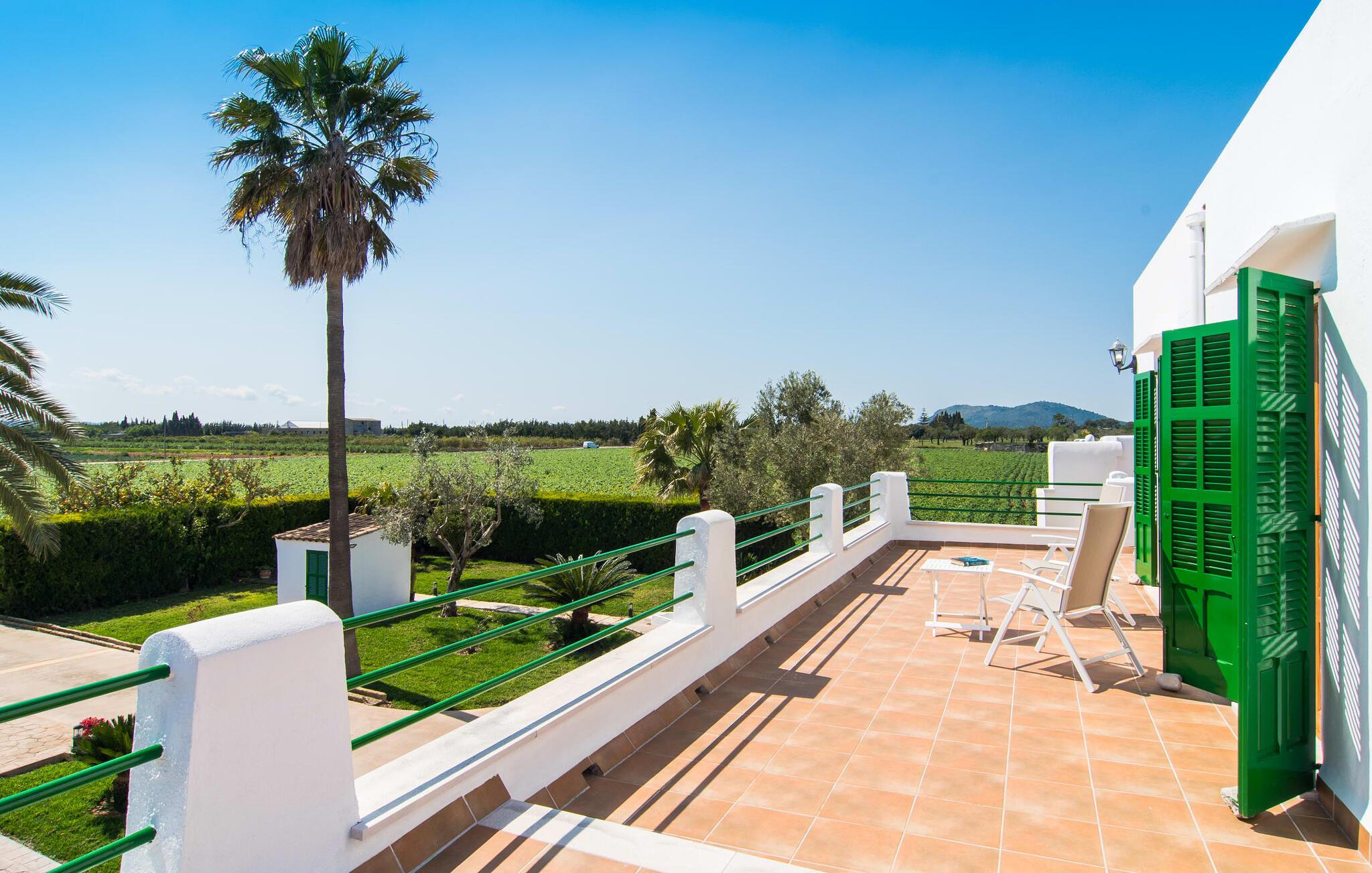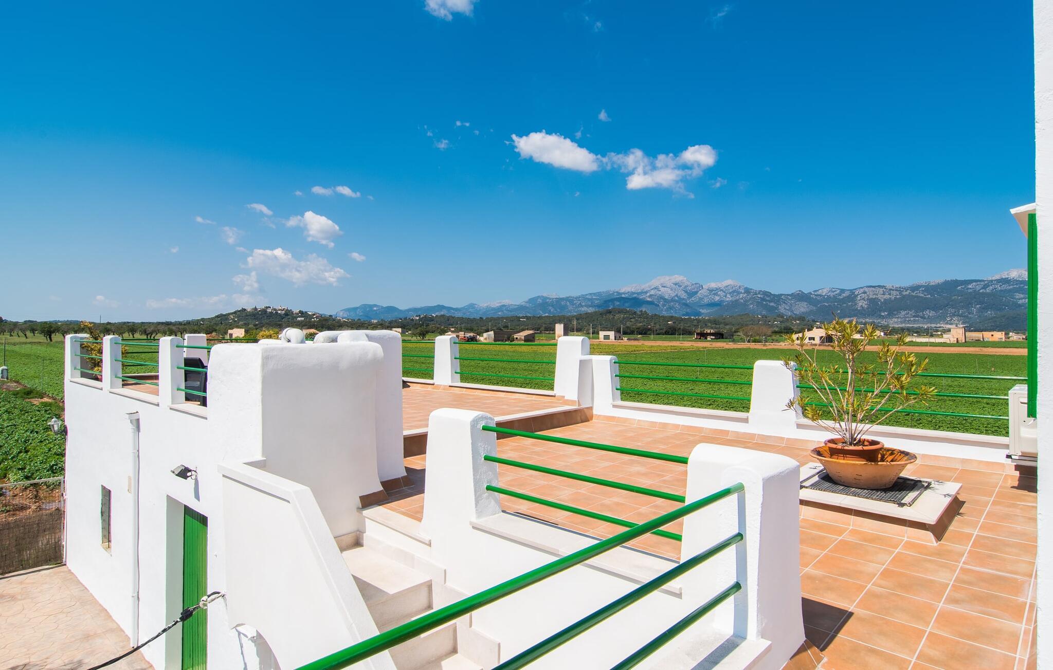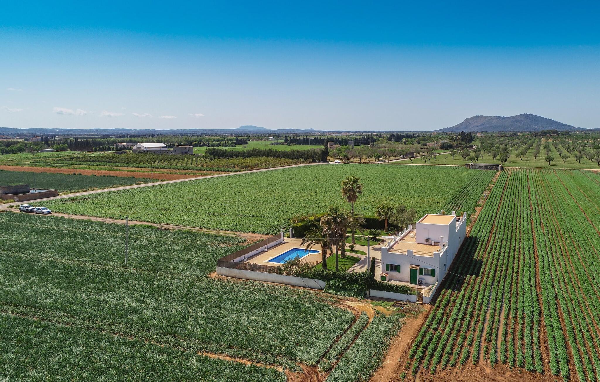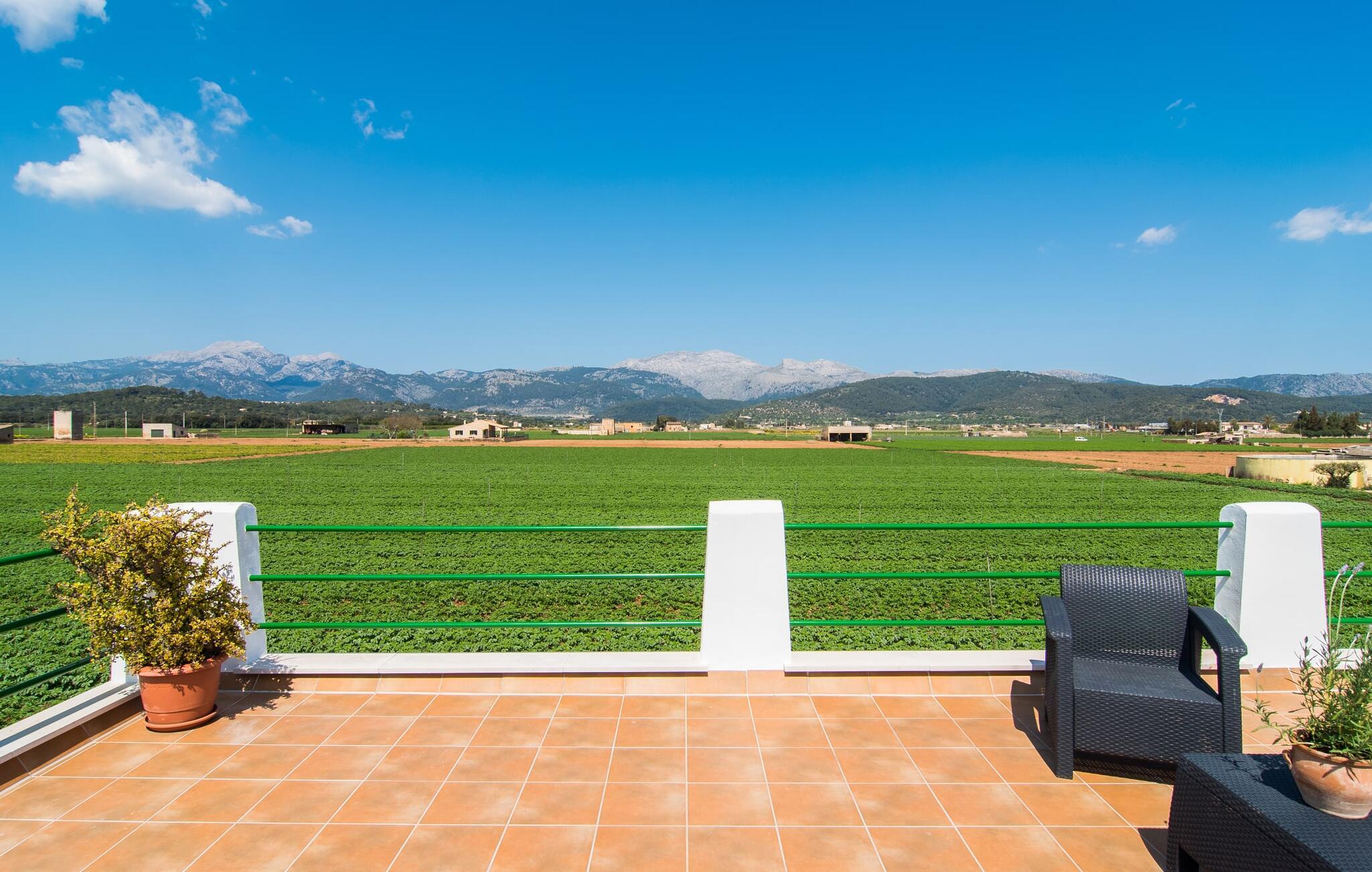 Kommer I fra motorvejen, lige før porten til Sa Poblas, fører den brede vej mellem bakkerne jer til villaen "Can Goet". Det funklende hvide hus ligger ved foden af de majestætiske Tramuntana-bjerge. Huset er omgivet af en lille hvid mur, langs hvilken grønne hække og imponerende høje palmer vokser, der markerer området, hvorpå den smukke villa med smaragdgrønne skodder står. Husets arkitektur er en vellykket blanding af typiske Ibiza-villaer og klassisk kolonistil. Denne storslåede sydvendte bygning har en skræddersyet swimmingpool dekoreret med azurblå mosaik, bekvemt placeret foran huset. Omgivet af en terrasse lavet af smukke natursten inviterer den til at slappe af i solens stråler, som er jævnt fordelt over dens overflade. Det runde bord, udstyret med en parasol, er det perfekte sted at køle af og nyde en forfriskende drink. Uanset om I foretrækker at grille eller lave mad sammen, nydes jeres måltider bedst udenfor ved det højkvalitets polyratan-bord på verandaen, lige bag de blide buer. Herfra kan I tage en trappe til en rummelig terrasse, der strækker sig rundt om hele overetagen og også er tilgængelig fra soveværelset. Det velplacerede chillout-område er stedet, hvor rødvin smager bedst under den lyse stjernehimmel på varme sommernætter. Pladsen er så smart opdelt, at denne villa nemt kan rumme op til fire gæster og byder velkommen til familier såvel som alle andre grupper. En indbydende foyer fører ind i den åbne stue, spisestue og madlavning, som er smart designet med et par vægåbninger. Dette gjorde det muligt at placere den hyggelige sofagruppe midt i rummet og samtidig nemt adskille den fra køkkenet ved hjælp af et resterende stykke væg. Der er plads nok lige bag sofaen til et enkelt bord med fire stole. Selve køkkenet er adskilt fra spisestuen af et gennemgangsområde, hvorfra I kan se det cremefarvede, fuldt udstyrede moderne køkken, som er særligt værdsat, når I er på ferie. Det mørke træbord med ru sisal-stole passer godt ind i den feudale atmosfære, mens den støbejerns-knaldende pejs giver varme i både spise- og opholdsrum. Den håndsmedede vindeltrappe i foyeren fører jer til øverste etage, hvor soveværelserne venter. Det store soveværelse er indrettet med en komfortabel dobbeltseng og direkte udgang til solterrassen. Det andet soveværelse har to enkeltsenge, hvilket gør det ideelt til børn eller gode venner. De to moderne bruserum på denne etage gør denne villa ekstraordinær komfortabel, undgår køer om morgenen og sparer dermed værdifuld tid, der kan bruges til udflugter. Dette komfortable landsted ligger ca. 1,5 km fra landbrugsbyen Sa Pobla, ofte omtalt som "Mallorcas grøntsagskurv" på grund af en århundreder lang tradition for intensiv dyrkning af jorden, der i dag producerer rigelig høst. Derudover fortryller de omkringliggende områder, som ligger inden for gåafstand, med deres typiske mallorcanske charme og inviterer jer til at tilbringe afslappende timer. Takket være villaens nærhed til landevejen, der forbinder byerne Sa Pobla og Búger, kan I nemt og hurtigt komme overalt. Afhængigt af vindretningen kan der nogle gange forekomme trafikstøj. Et besøg på bakken i den maleriske by Búger er dog et absolut must. Herfra kan I udover den imponerende aura også nyde en vidunderlig udsigt over den fredelige landsby, Alcúdia-bugten, Llevant-bjergene i nordøst, langt ind i kommunen Artà, Tramuntana-bjergene i vest og Albuferia-naturen. Reserve, den Tilbyder gode vandrestier for naturelskere. Til en forandring kan I tilbringe en dejlig dag på stranden, den nærmeste er Alcúdia-bugten. Den funklende hvide villa "Can Goet" ligger i landlige omgivelser mellem bjerglandsbyen Búger og den lidt større by Sa Pobla. Begge byer er ideelle til daglige indkøb og kan nås med bil. Om søndagen er der et ugentligt marked på det travle bytorv i Sa Pobla, hvor de lokale mødes for at chatte og shoppe. Alcúdia-bugten har en imponerende 16 km lang strandstrækning og kan nås på 20 minutter i bil.