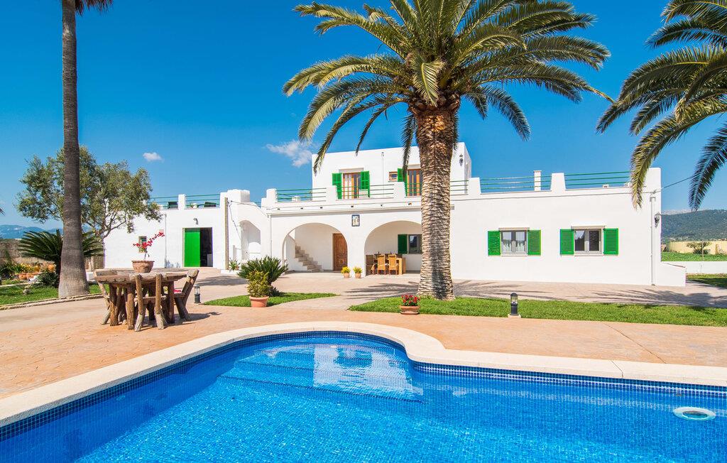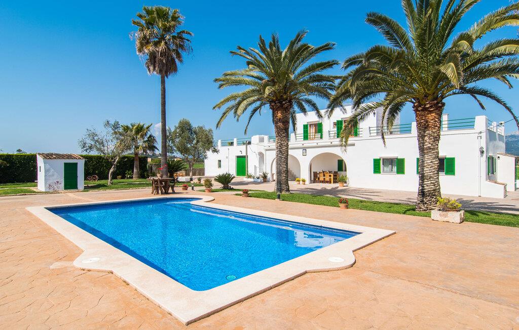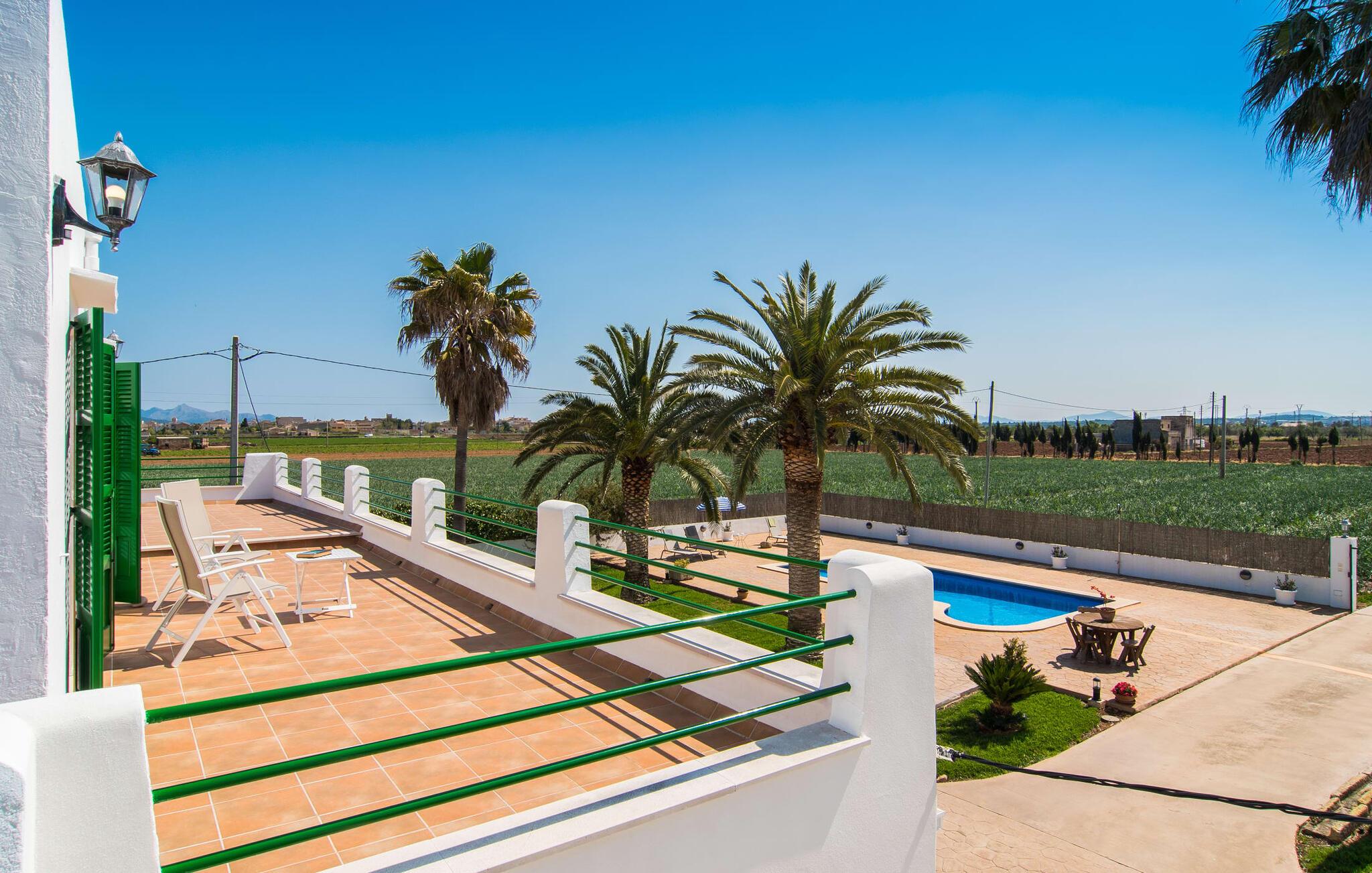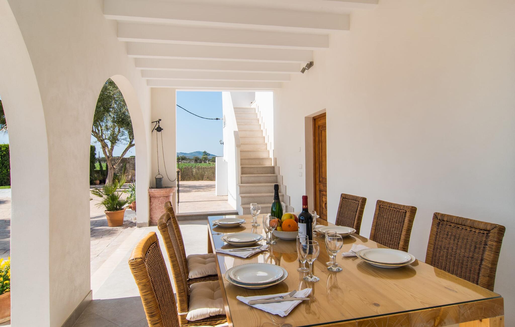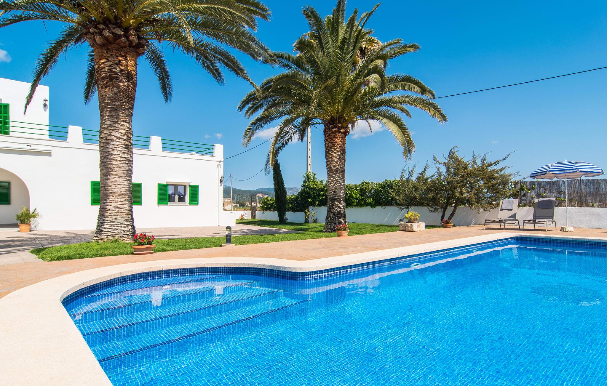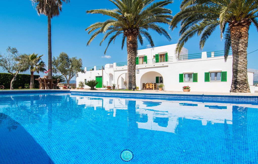 Kommer I fra motorvejen, lige før porten til Sa Poblas, fører den brede vej mellem bakkerne jer til villaen "Can Goet". Det funklende hvide hus ligger ved foden af de majestætiske Tramuntana-bjerge. Huset er omgivet af en lille hvid mur, langs hvilken grønne hække og imponerende høje palmer vokser, der markerer området, hvorpå den smukke villa med smaragdgrønne skodder står. Husets arkitektur er en vellykket blanding af typiske Ibiza-villaer og klassisk kolonistil. Denne storslåede sydvendte bygning har en skræddersyet swimmingpool dekoreret med azurblå mosaik, bekvemt placeret foran huset. Omgivet af en terrasse lavet af smukke natursten inviterer den til at slappe af i solens stråler, som er jævnt fordelt over dens overflade. Det runde bord, udstyret med en parasol, er det perfekte sted at køle af og nyde en forfriskende drink. Uanset om I foretrækker at grille eller lave mad sammen, nydes jeres måltider bedst udenfor ved det højkvalitets polyratan-bord på verandaen, lige bag de blide buer. Herfra kan I tage en trappe til en rummelig terrasse, der strækker sig rundt om hele overetagen og også er tilgængelig fra soveværelset. Det velplacerede chillout-område er stedet, hvor rødvin smager bedst under den lyse stjernehimmel på varme sommernætter. Pladsen er så smart opdelt, at denne villa nemt kan rumme op til fire gæster og byder velkommen til familier såvel som alle andre grupper. En indbydende foyer fører ind i den åbne stue, spisestue og madlavning, som er smart designet med et par vægåbninger. Dette gjorde det muligt at placere den hyggelige sofagruppe midt i rummet og samtidig nemt adskille den fra køkkenet ved hjælp af et resterende stykke væg. Der er plads nok lige bag sofaen til et enkelt bord med fire stole. Selve køkkenet er adskilt fra spisestuen af et gennemgangsområde, hvorfra I kan se det cremefarvede, fuldt udstyrede moderne køkken, som er særligt værdsat, når I er på ferie. Det mørke træbord med ru sisal-stole passer godt ind i den feudale atmosfære, mens den støbejerns-knaldende pejs giver varme i både spise- og opholdsrum. Den håndsmedede vindeltrappe i foyeren fører jer til øverste etage, hvor soveværelserne venter. Det store soveværelse er indrettet med en komfortabel dobbeltseng og direkte udgang til solterrassen. Det andet soveværelse har to enkeltsenge, hvilket gør det ideelt til børn eller gode venner. De to moderne bruserum på denne etage gør denne villa ekstraordinær komfortabel, undgår køer om morgenen og sparer dermed værdifuld tid, der kan bruges til udflugter. Dette komfortable landsted ligger ca. 1,5 km fra landbrugsbyen Sa Pobla, ofte omtalt som "Mallorcas grøntsagskurv" på grund af en århundreder lang tradition for intensiv dyrkning af jorden, der i dag producerer rigelig høst. Derudover fortryller de omkringliggende områder, som ligger inden for gåafstand, med deres typiske mallorcanske charme og inviterer jer til at tilbringe afslappende timer. Takket være villaens nærhed til landevejen, der forbinder byerne Sa Pobla og Búger, kan I nemt og hurtigt komme overalt. Afhængigt af vindretningen kan der nogle gange forekomme trafikstøj. Et besøg på bakken i den maleriske by Búger er dog et absolut must. Herfra kan I udover den imponerende aura også nyde en vidunderlig udsigt over den fredelige landsby, Alcúdia-bugten, Llevant-bjergene i nordøst, langt ind i kommunen Artà, Tramuntana-bjergene i vest og Albuferia-naturen. Reserve, den Tilbyder gode vandrestier for naturelskere. Til en forandring kan I tilbringe en dejlig dag på stranden, den nærmeste er Alcúdia-bugten. Den funklende hvide villa "Can Goet" ligger i landlige omgivelser mellem bjerglandsbyen Búger og den lidt større by Sa Pobla. Begge byer er ideelle til daglige indkøb og kan nås med bil. Om søndagen er der et ugentligt marked på det travle bytorv i Sa Pobla, hvor de lokale mødes for at chatte og shoppe. Alcúdia-bugten har en imponerende 16 km lang strandstrækning og kan nås på 20 minutter i bil.