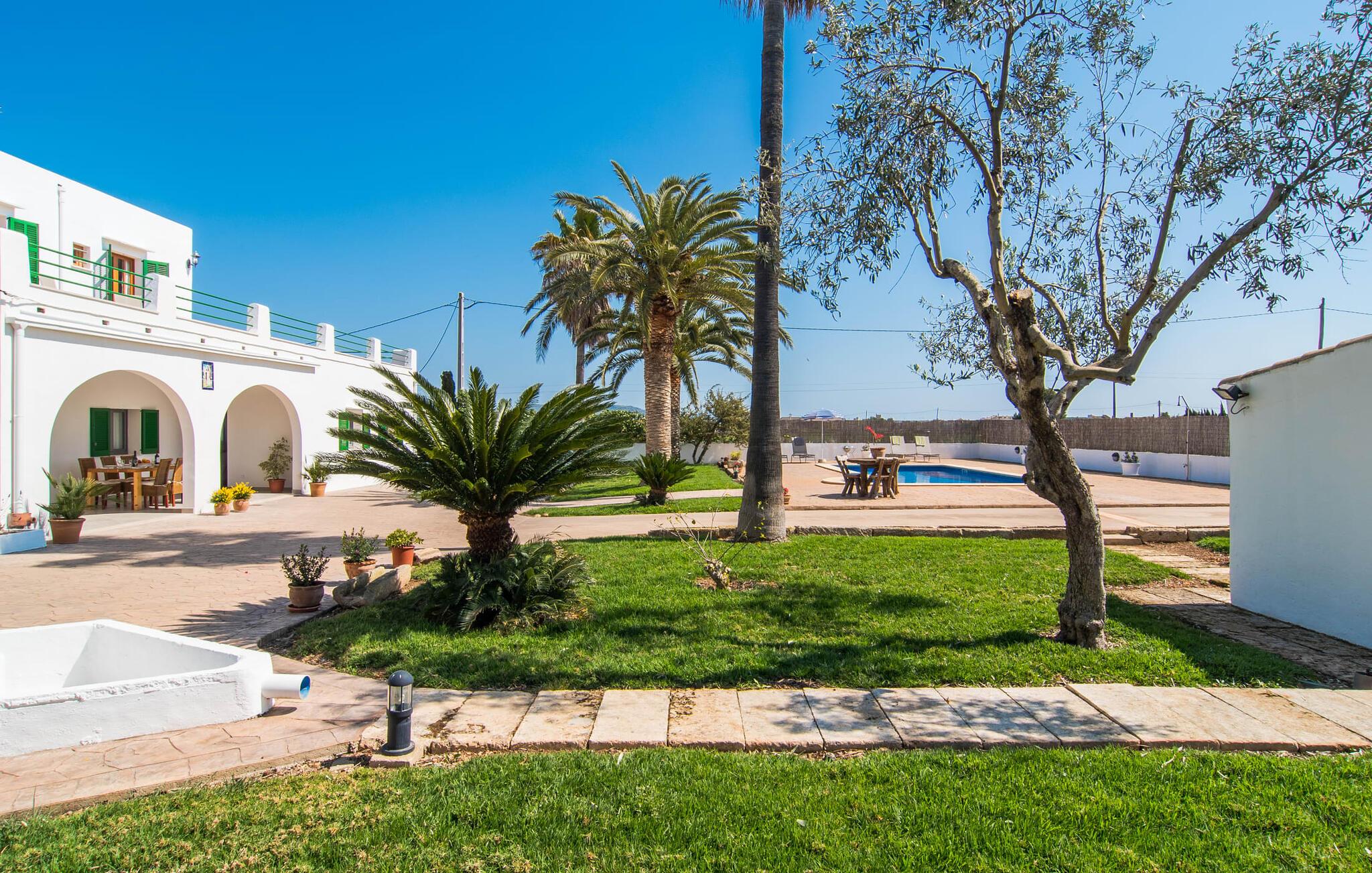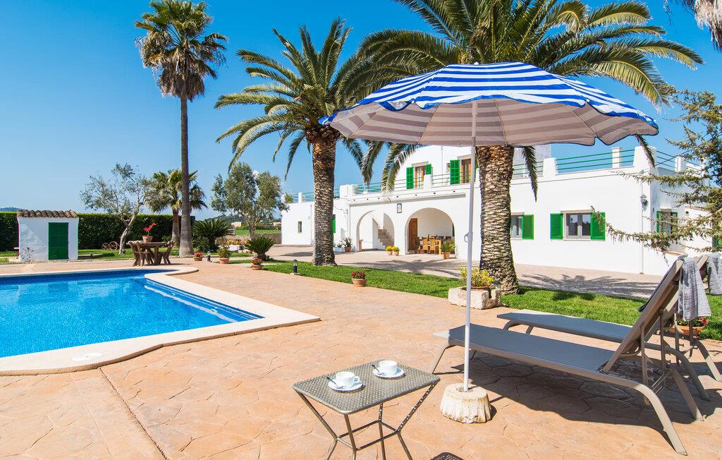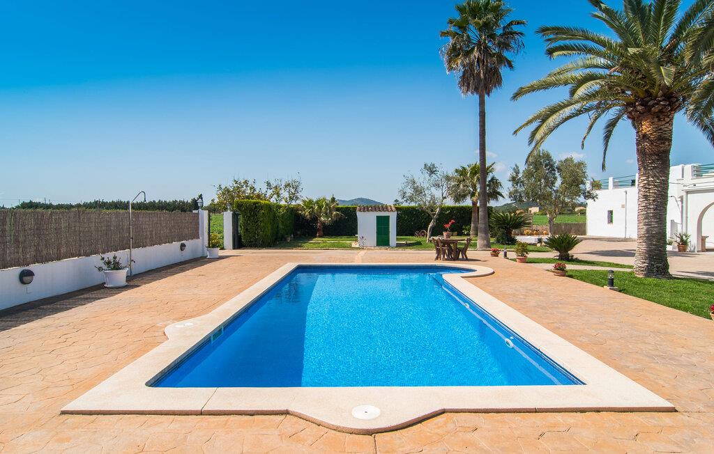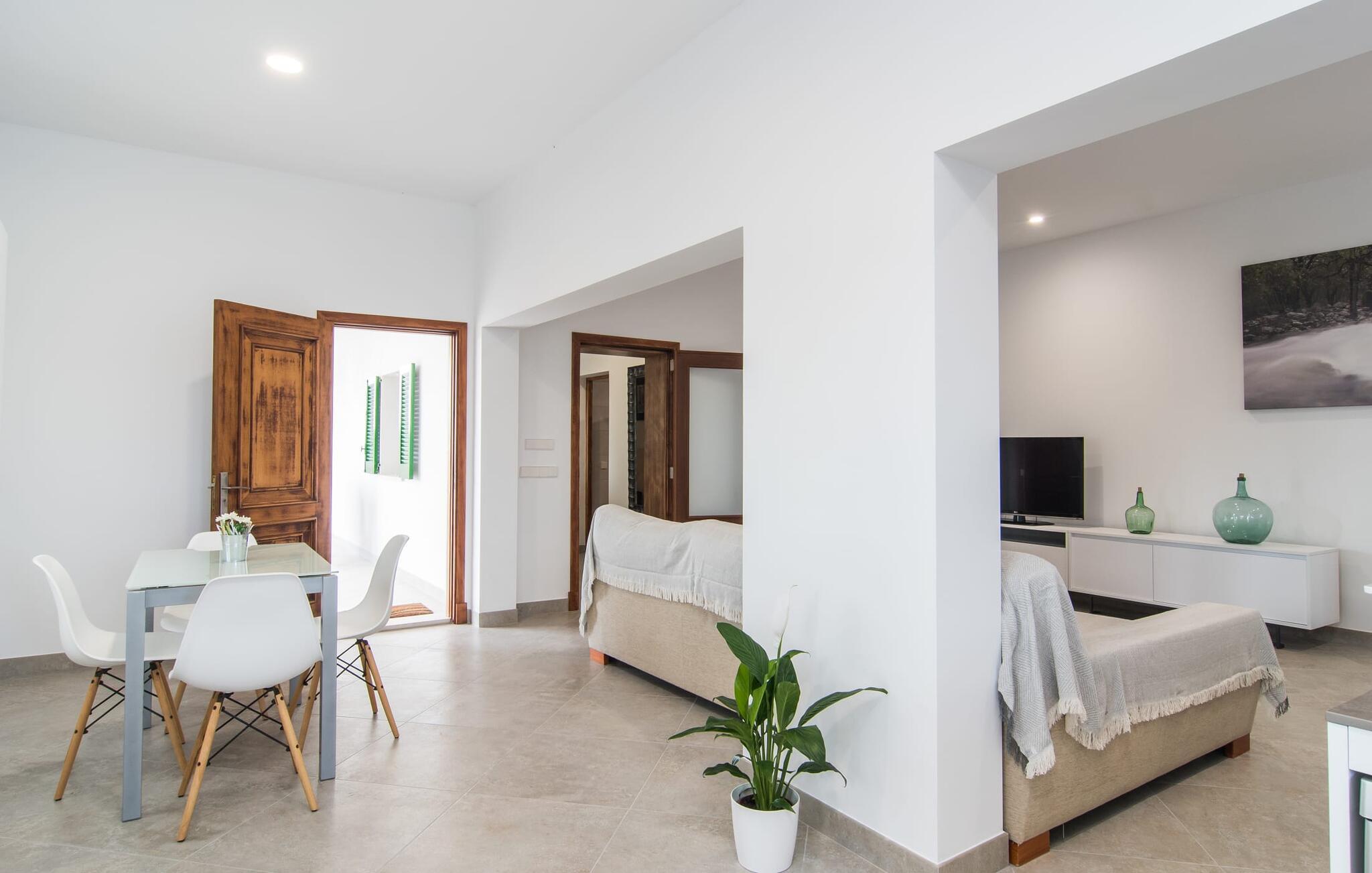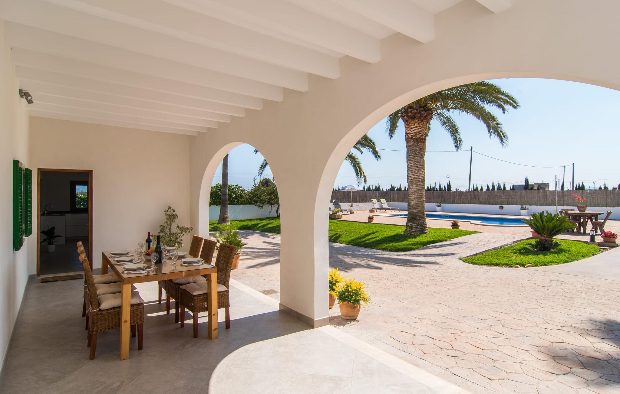 Kommer I fra motorvejen, lige før porten til Sa Poblas, fører den brede vej mellem bakkerne jer til villaen "Can Goet". Det funklende hvide hus ligger ved foden af de majestætiske Tramuntana-bjerge. Huset er omgivet af en lille hvid mur, langs hvilken grønne hække og imponerende høje palmer vokser, der markerer området, hvorpå den smukke villa med smaragdgrønne skodder står. Husets arkitektur er en vellykket blanding af typiske Ibiza-villaer og klassisk kolonistil. Denne storslåede sydvendte bygning har en skræddersyet swimmingpool dekoreret med azurblå mosaik, bekvemt placeret foran huset. Omgivet af en terrasse lavet af smukke natursten inviterer den til at slappe af i solens stråler, som er jævnt fordelt over dens overflade. Det runde bord, udstyret med en parasol, er det perfekte sted at køle af og nyde en forfriskende drink. Uanset om I foretrækker at grille eller lave mad sammen, nydes jeres måltider bedst udenfor ved det højkvalitets polyratan-bord på verandaen, lige bag de blide buer. Herfra kan I tage en trappe til en rummelig terrasse, der strækker sig rundt om hele overetagen og også er tilgængelig fra soveværelset. Det velplacerede chillout-område er stedet, hvor rødvin smager bedst under den lyse stjernehimmel på varme sommernætter. Pladsen er så smart opdelt, at denne villa nemt kan rumme op til fire gæster og byder velkommen til familier såvel som alle andre grupper. En indbydende foyer fører ind i den åbne stue, spisestue og madlavning, som er smart designet med et par vægåbninger. Dette gjorde det muligt at placere den hyggelige sofagruppe midt i rummet og samtidig nemt adskille den fra køkkenet ved hjælp af et resterende stykke væg. Der er plads nok lige bag sofaen til et enkelt bord med fire stole. Selve køkkenet er adskilt fra spisestuen af et gennemgangsområde, hvorfra I kan se det cremefarvede, fuldt udstyrede moderne køkken, som er særligt værdsat, når I er på ferie. Det mørke træbord med ru sisal-stole passer godt ind i den feudale atmosfære, mens den støbejerns-knaldende pejs giver varme i både spise- og opholdsrum. Den håndsmedede vindeltrappe i foyeren fører jer til øverste etage, hvor soveværelserne venter. Det store soveværelse er indrettet med en komfortabel dobbeltseng og direkte udgang til solterrassen. Det andet soveværelse har to enkeltsenge, hvilket gør det ideelt til børn eller gode venner. De to moderne bruserum på denne etage gør denne villa ekstraordinær komfortabel, undgår køer om morgenen og sparer dermed værdifuld tid, der kan bruges til udflugter. Dette komfortable landsted ligger ca. 1,5 km fra landbrugsbyen Sa Pobla, ofte omtalt som "Mallorcas grøntsagskurv" på grund af en århundreder lang tradition for intensiv dyrkning af jorden, der i dag producerer rigelig høst. Derudover fortryller de omkringliggende områder, som ligger inden for gåafstand, med deres typiske mallorcanske charme og inviterer jer til at tilbringe afslappende timer. Takket være villaens nærhed til landevejen, der forbinder byerne Sa Pobla og Búger, kan I nemt og hurtigt komme overalt. Afhængigt af vindretningen kan der nogle gange forekomme trafikstøj. Et besøg på bakken i den maleriske by Búger er dog et absolut must. Herfra kan I udover den imponerende aura også nyde en vidunderlig udsigt over den fredelige landsby, Alcúdia-bugten, Llevant-bjergene i nordøst, langt ind i kommunen Artà, Tramuntana-bjergene i vest og Albuferia-naturen. Reserve, den Tilbyder gode vandrestier for naturelskere. Til en forandring kan I tilbringe en dejlig dag på stranden, den nærmeste er Alcúdia-bugten. Den funklende hvide villa "Can Goet" ligger i landlige omgivelser mellem bjerglandsbyen Búger og den lidt større by Sa Pobla. Begge byer er ideelle til daglige indkøb og kan nås med bil. Om søndagen er der et ugentligt marked på det travle bytorv i Sa Pobla, hvor de lokale mødes for at chatte og shoppe. Alcúdia-bugten har en imponerende 16 km lang strandstrækning og kan nås på 20 minutter i bil.