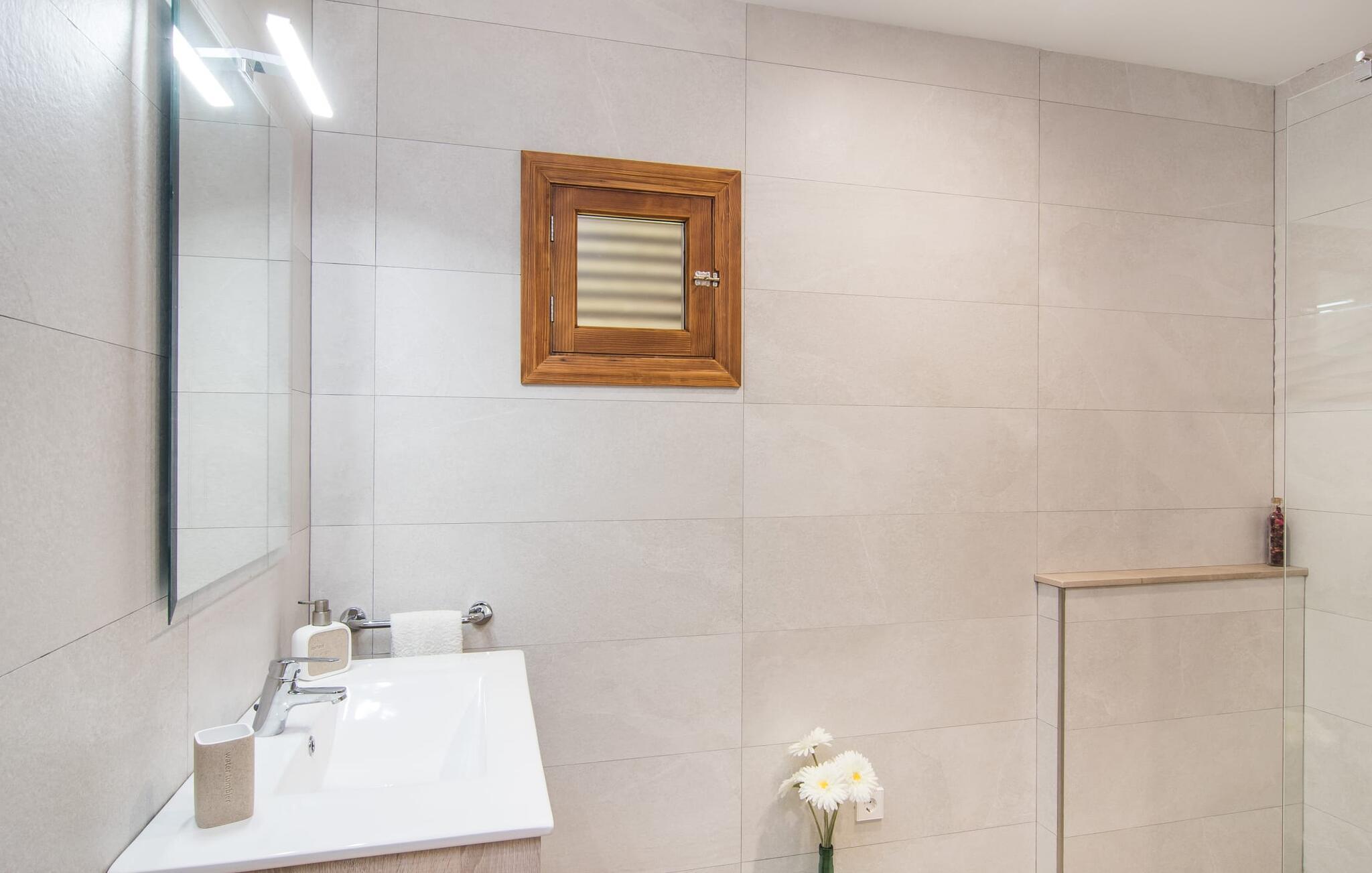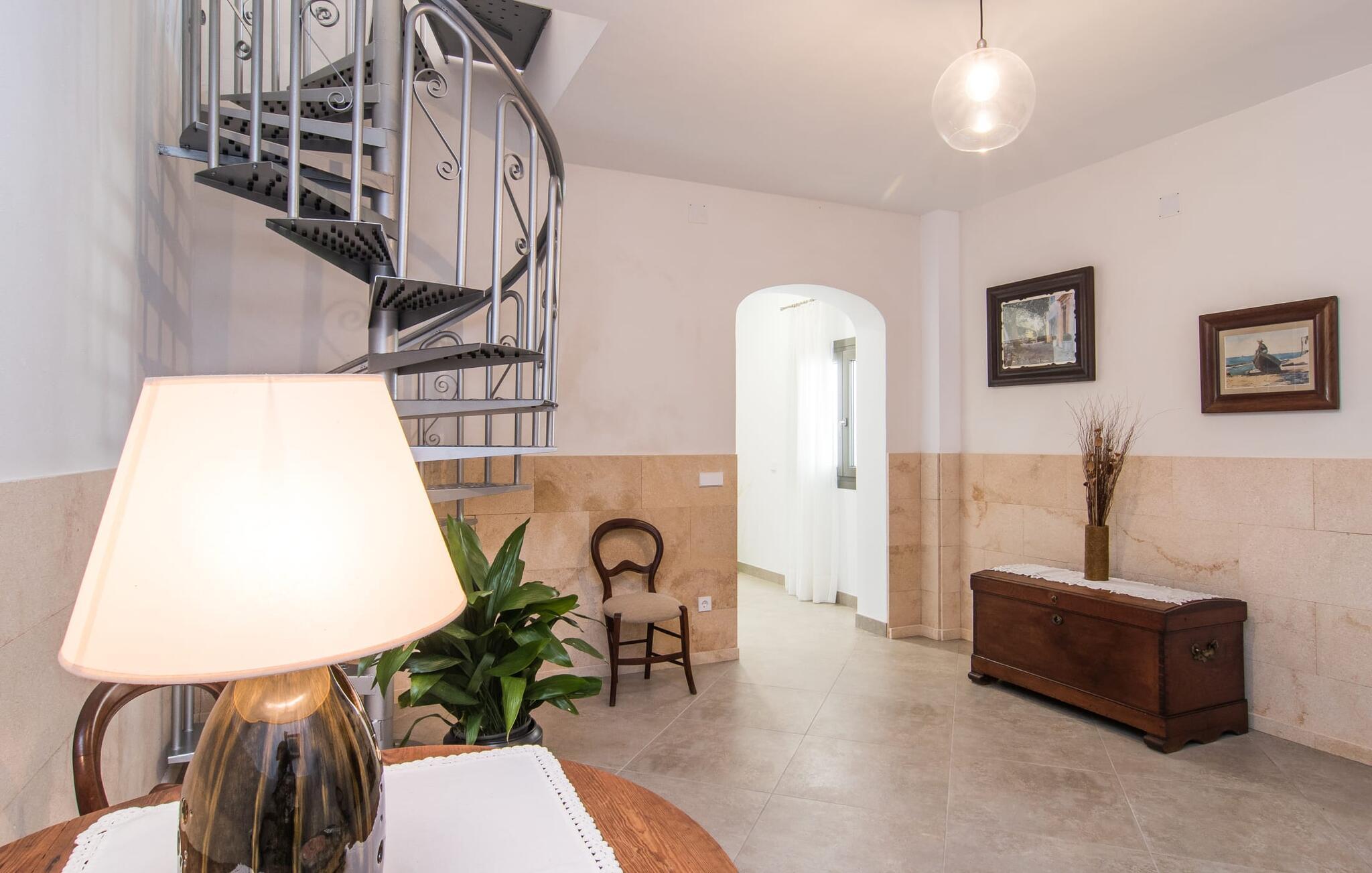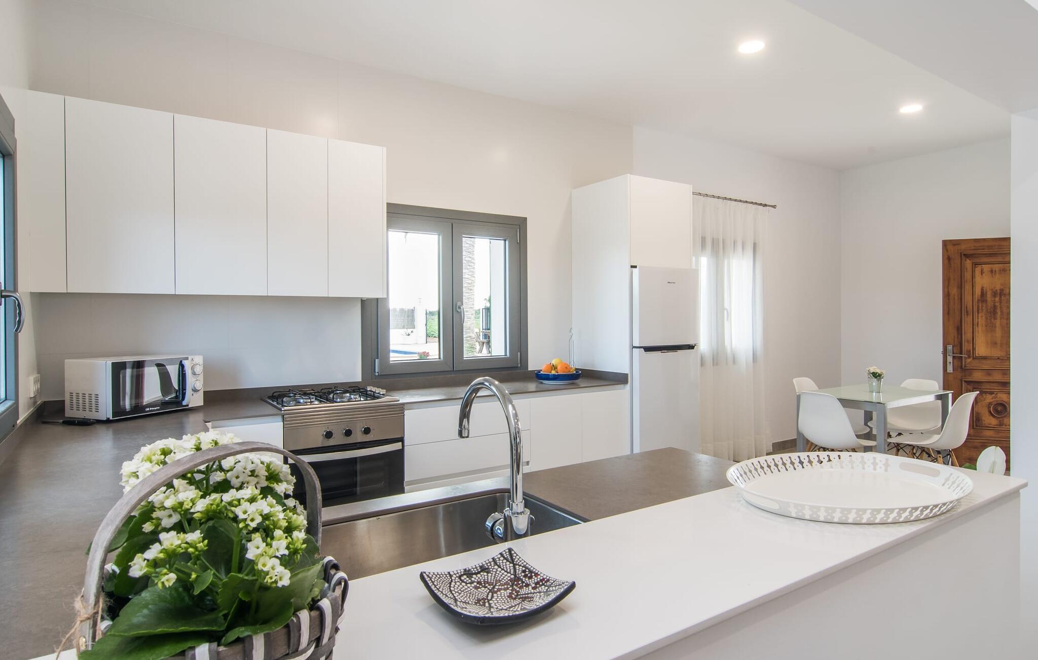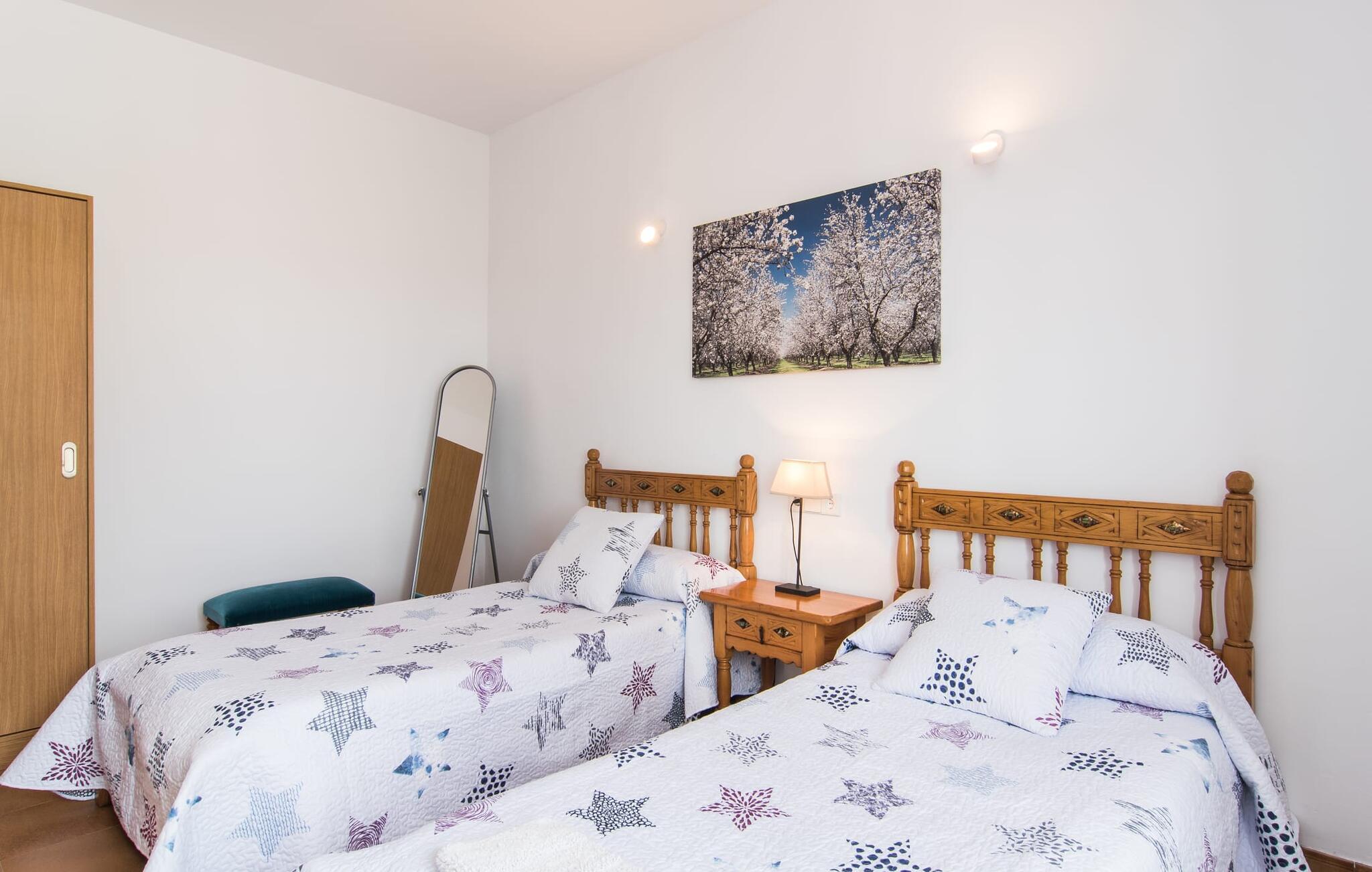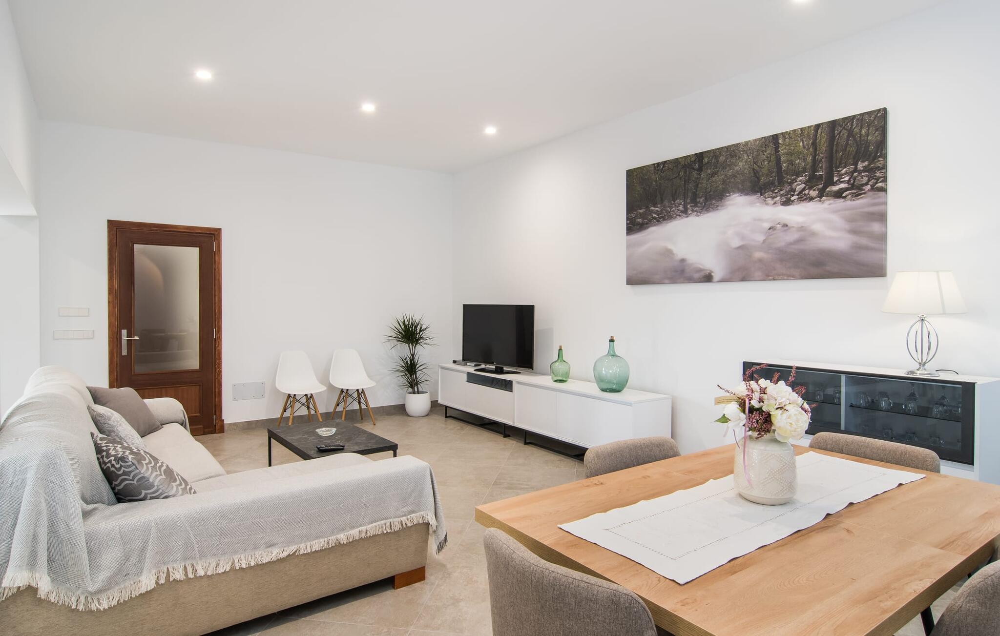 Kommer I fra motorvejen, lige før porten til Sa Poblas, fører den brede vej mellem bakkerne jer til villaen "Can Goet". Det funklende hvide hus ligger ved foden af de majestætiske Tramuntana-bjerge. Huset er omgivet af en lille hvid mur, langs hvilken grønne hække og imponerende høje palmer vokser, der markerer området, hvorpå den smukke villa med smaragdgrønne skodder står. Husets arkitektur er en vellykket blanding af typiske Ibiza-villaer og klassisk kolonistil. Denne storslåede sydvendte bygning har en skræddersyet swimmingpool dekoreret med azurblå mosaik, bekvemt placeret foran huset. Omgivet af en terrasse lavet af smukke natursten inviterer den til at slappe af i solens stråler, som er jævnt fordelt over dens overflade. Det runde bord, udstyret med en parasol, er det perfekte sted at køle af og nyde en forfriskende drink. Uanset om I foretrækker at grille eller lave mad sammen, nydes jeres måltider bedst udenfor ved det højkvalitets polyratan-bord på verandaen, lige bag de blide buer. Herfra kan I tage en trappe til en rummelig terrasse, der strækker sig rundt om hele overetagen og også er tilgængelig fra soveværelset. Det velplacerede chillout-område er stedet, hvor rødvin smager bedst under den lyse stjernehimmel på varme sommernætter. Pladsen er så smart opdelt, at denne villa nemt kan rumme op til fire gæster og byder velkommen til familier såvel som alle andre grupper. En indbydende foyer fører ind i den åbne stue, spisestue og madlavning, som er smart designet med et par vægåbninger. Dette gjorde det muligt at placere den hyggelige sofagruppe midt i rummet og samtidig nemt adskille den fra køkkenet ved hjælp af et resterende stykke væg. Der er plads nok lige bag sofaen til et enkelt bord med fire stole. Selve køkkenet er adskilt fra spisestuen af et gennemgangsområde, hvorfra I kan se det cremefarvede, fuldt udstyrede moderne køkken, som er særligt værdsat, når I er på ferie. Det mørke træbord med ru sisal-stole passer godt ind i den feudale atmosfære, mens den støbejerns-knaldende pejs giver varme i både spise- og opholdsrum. Den håndsmedede vindeltrappe i foyeren fører jer til øverste etage, hvor soveværelserne venter. Det store soveværelse er indrettet med en komfortabel dobbeltseng og direkte udgang til solterrassen. Det andet soveværelse har to enkeltsenge, hvilket gør det ideelt til børn eller gode venner. De to moderne bruserum på denne etage gør denne villa ekstraordinær komfortabel, undgår køer om morgenen og sparer dermed værdifuld tid, der kan bruges til udflugter. Dette komfortable landsted ligger ca. 1,5 km fra landbrugsbyen Sa Pobla, ofte omtalt som "Mallorcas grøntsagskurv" på grund af en århundreder lang tradition for intensiv dyrkning af jorden, der i dag producerer rigelig høst. Derudover fortryller de omkringliggende områder, som ligger inden for gåafstand, med deres typiske mallorcanske charme og inviterer jer til at tilbringe afslappende timer. Takket være villaens nærhed til landevejen, der forbinder byerne Sa Pobla og Búger, kan I nemt og hurtigt komme overalt. Afhængigt af vindretningen kan der nogle gange forekomme trafikstøj. Et besøg på bakken i den maleriske by Búger er dog et absolut must. Herfra kan I udover den imponerende aura også nyde en vidunderlig udsigt over den fredelige landsby, Alcúdia-bugten, Llevant-bjergene i nordøst, langt ind i kommunen Artà, Tramuntana-bjergene i vest og Albuferia-naturen. Reserve, den Tilbyder gode vandrestier for naturelskere. Til en forandring kan I tilbringe en dejlig dag på stranden, den nærmeste er Alcúdia-bugten. Den funklende hvide villa "Can Goet" ligger i landlige omgivelser mellem bjerglandsbyen Búger og den lidt større by Sa Pobla. Begge byer er ideelle til daglige indkøb og kan nås med bil. Om søndagen er der et ugentligt marked på det travle bytorv i Sa Pobla, hvor de lokale mødes for at chatte og shoppe. Alcúdia-bugten har en imponerende 16 km lang strandstrækning og kan nås på 20 minutter i bil.