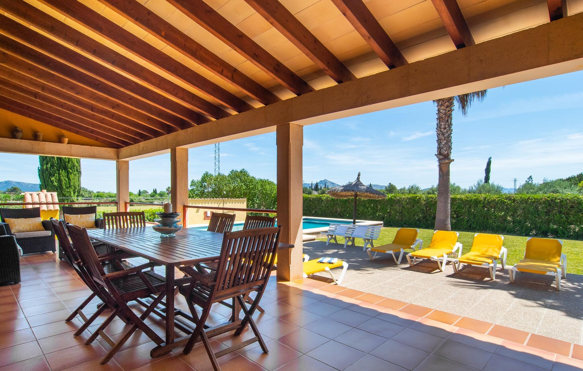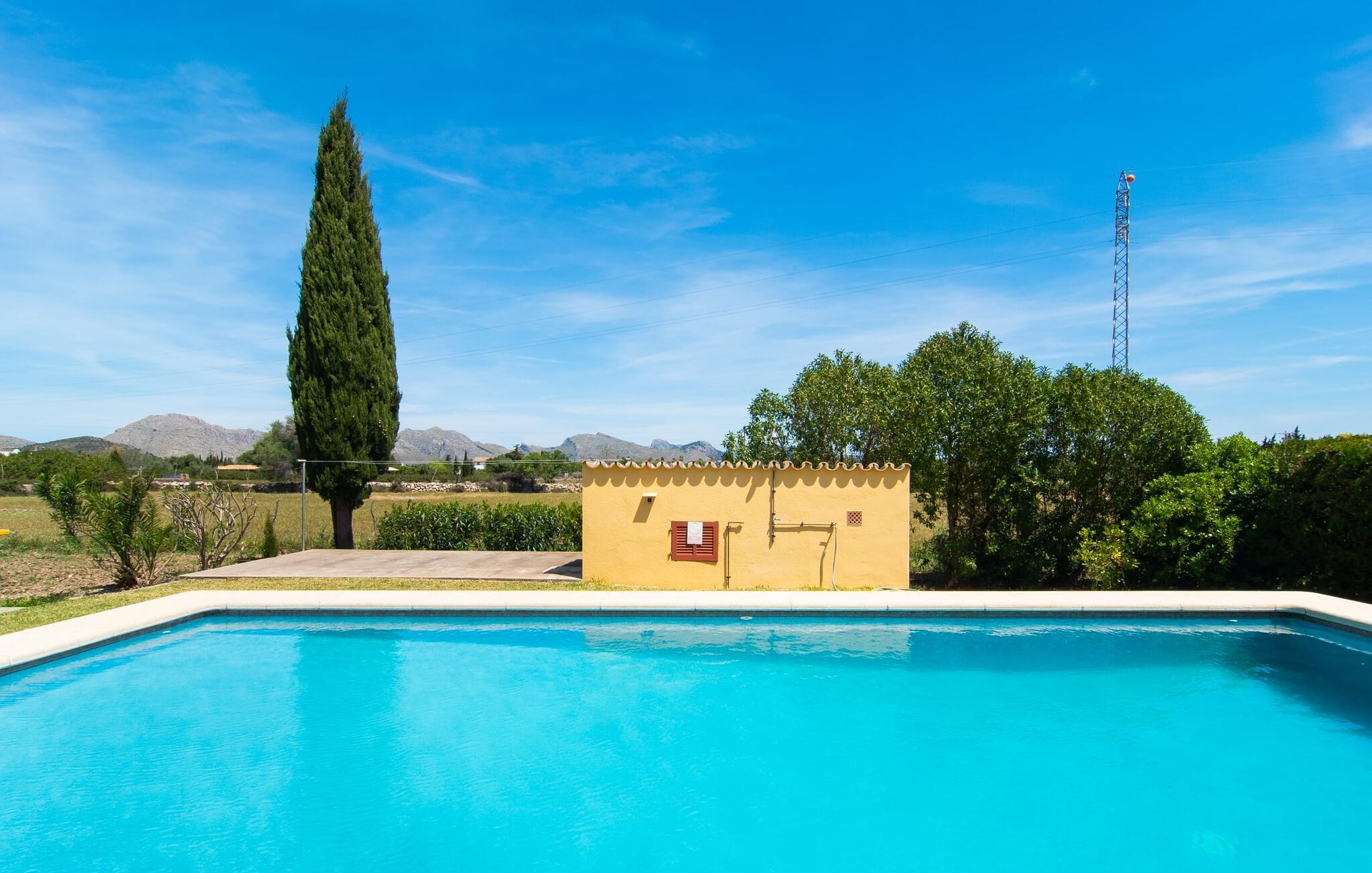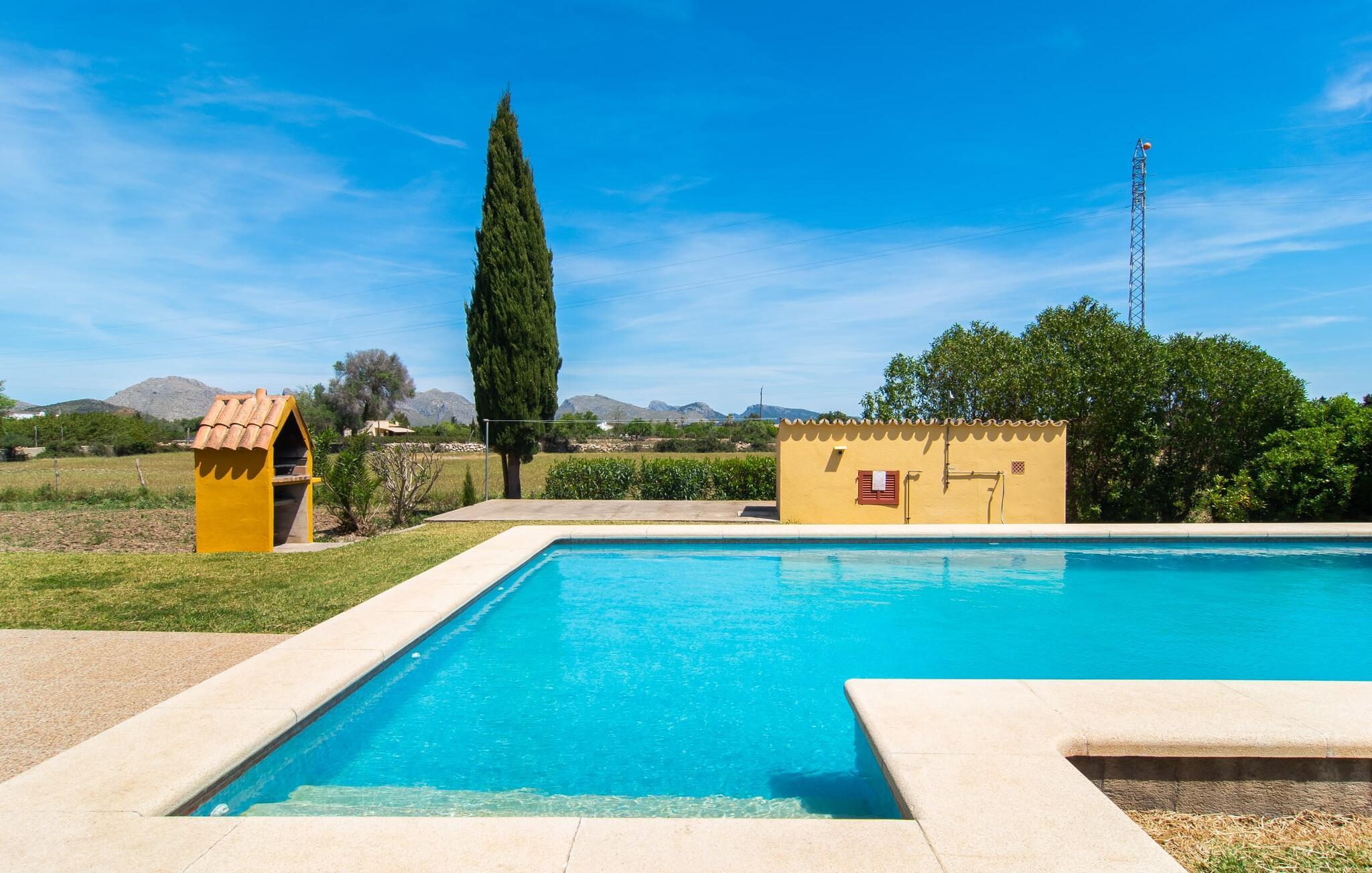 "Can Jaume Pollenca" byder på traditionel mallorcansk charme i spektakulære omgivelser, med en betagende udsigt over Tramuntana-bjergene og nem adgang til øens bedste strande. Selvom villaen er enklere end nogle moderne modstykker, gør dens landlige charme og beliggenhed med fire parkeringspladser den til et unikt valg for at udforske regionen. Nyd poolen, spil bordtennis eller slap af i palmernes skygge. Den overdækkede terrasse og grillplads er det perfekte sted at slappe af og nyde udendørs spisning. Indenfor giver det veludstyrede køkken mulighed for nem selvforplejning, og den hyggelige opholdsstue med tv og bibliotek sikrer, at alle kan slappe af i komfort. Villaen har tre soveværelser og to badeværelser (et en-suite), udstyret med robuste træmøbler, der forstærker den rustikke charme. Dobbeltsengen er 1,8 x 2 m, mens enkeltsengene er 1,9 m lange, hvilket giver afslappende komfort for alle. Strategisk beliggende i et meget roligt og rummeligt boligområde: Den legende "Can Jaume Pollenca" byder på ideelle indkøbs- og fritidsaktiviteter på de smukkeste steder på den nordlige del af øen. Uanset om I besøger Alcúdias middelaldergader og imponerende bymure eller Port de Pollença med dens berømte promenade, børnevenlige svømning og to strande, er det kun et spørgsmål om tid, før I hopper på cyklerne, snører vandrestøvlerne eller begiver jer ud. for en tur, tag en tur langs de vidunderligt buede gader. Serra de Tramuntana, Formentor, Santuari de Lluc og Sa Calobra venter på jer! Aircondition i ejendommen er inkluderet i prisen, men dets brug er begrænset mellem kl. 21.00 og 06.00.
