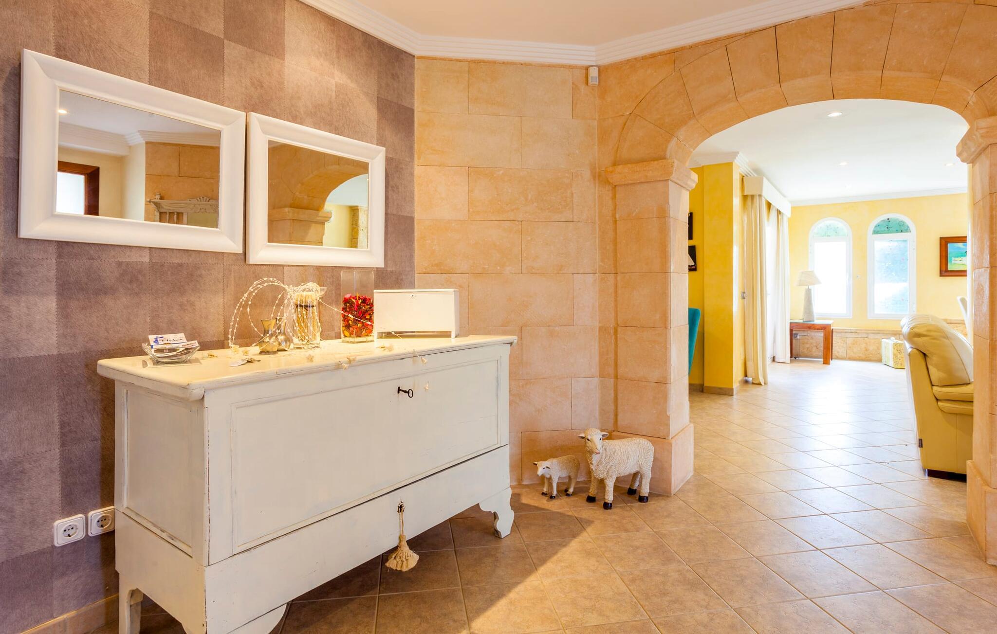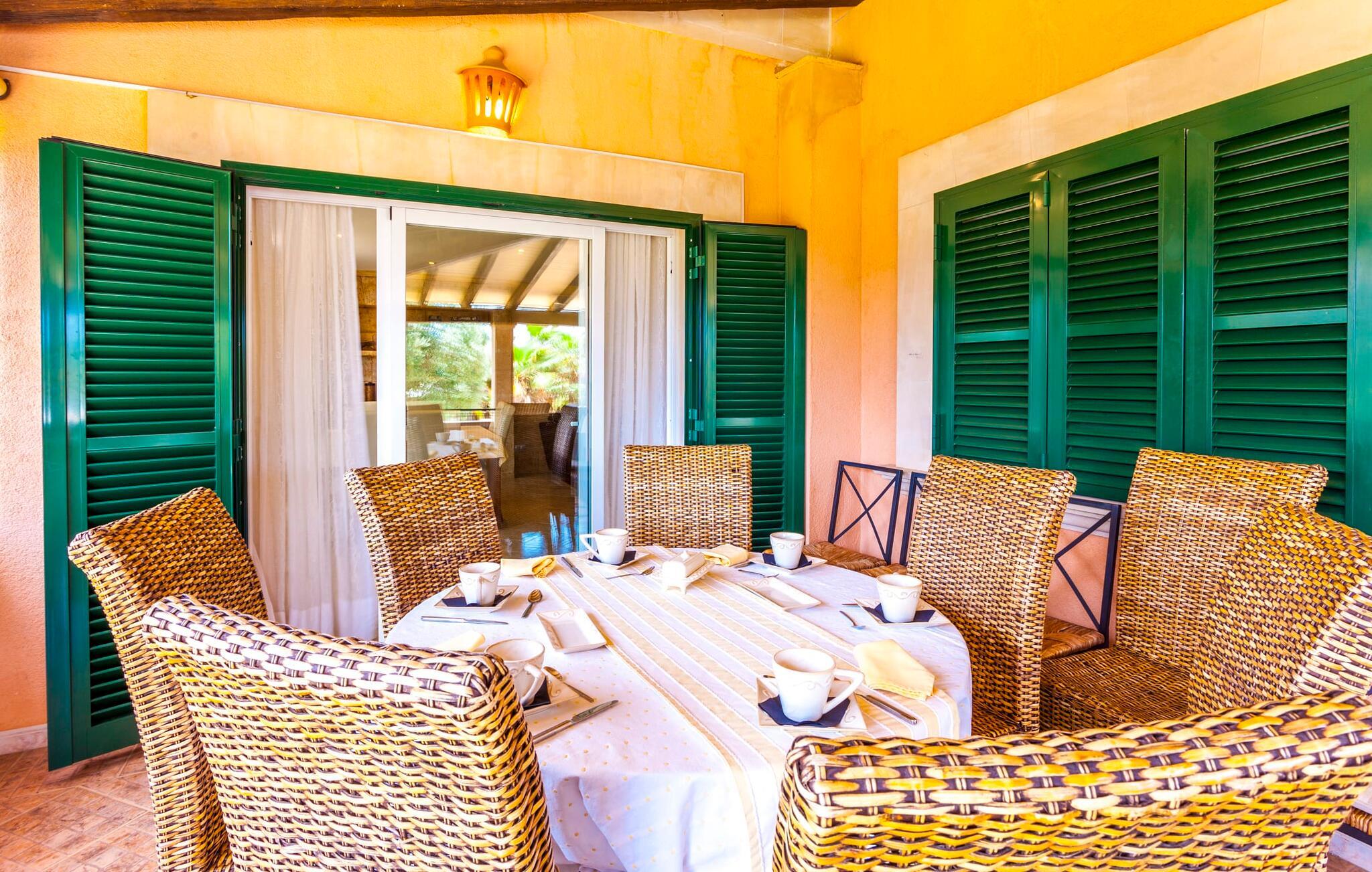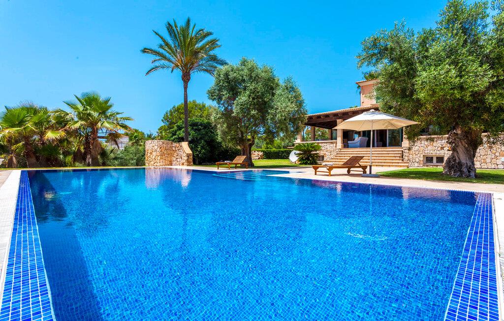Stille, men ikke for langt væk fra den slagne vej; oliven- og palmetræer; en pool mousserende i solen; Alle de moderne bekvemmeligheder I kan ønske jer i et feriehus - velkommen til Villa “Can Jordi” på det sydlige Mallorca, den perfekte ferieresidens til et utroligt ophold på øen. Den overdækkede naturstensterrasse med en imponerende trappe ind til haven er et sandt blikfang i denne villa med fortryllende grønne skodder. For nemheds skyld kan terrassen låses af hensyn til små børns sikkerhed. Poolen er børnevenlig takket være den store, blide hældning af trinindgangen. Vandet indbyder til at køle af, slappe af og flyde på en af køjerne eller svømme et par længder. Så forkæl jer selv med en lang siesta på en af de komfortable liggestole på den vidunderlige rustikke naturstensterrasse omkring poolen. Foretrækker I skyggen, er den overdækkede terrasse det perfekte sted for jer, hvor I enten kan nyde et solidt festmåltid ved det store spisebord eller synke ned i de komfortable hynder i rattansofaerne. Interiøret i "Can Jordi" er også stilfuldt: alt er lyst og venligt; væggene spreder en hjemlig varme med deres middelhavsfarver; og lysene installeret i lofterne bader alt i et behageligt lys. Stenbuer mellem de åbne rum og en elegant søjle i stuen skaber sammen med de højkvalitets og elegante møbler en særlig statelig stemning, hvor I straks vil føle jer hjemme. De komfortable lædersofaer og to indbydende fløjstole omkring pejsen i stuen er virkelig fristende, mens I i spisestuen kan nyde kulinariske lækkerier i en skøn mørk træsofa. Disse delikatesser kan nemt tilberedes i køkkenet, som er udstyret med moderne udstyr og endnu et rundt spisebord med tilhørende stole, så I kan spise morgenmad uanset vejret i regnvejr. De fem lyse dobbeltværelser garanterer jer en velfortjent nattesøvn - enten komfortable dobbeltsenge eller enkeltsenge inviterer jer til søde drømme. Takket være de store vinduespartier er alle rum lyse ned til mindste detalje – inklusive villaens fire badeværelser. En af dem har et privat badeværelse ovenpå, og alle er meget rene og har store spejle. Placeringen af jeres feriehus er ideel til en virkelig afvekslende ferie: i umiddelbar nærhed kan I nyde fred og ro midt i bjergskråninger, overvejende i form af cypresser. Hvis I så vil ind til byen, skal I kun køre i jeres lejebil cirka 3,3 km til den tidligere fiskerby Colònia Sant Jordi - i dag et populært feriested med et stort udvalg af gode restauranter, caféer og barer samt talrige vandsportsaktiviteter og indkøbsmuligheder. Derfra er der kun få kilometer via forskellige smukke naturstier til en af de smukkeste strande på Mallorca: Es Trenc. Det fine, hvide sand mellem uberørt natur og beskyttede klitter, saltmarker og en fyrreskov skråner blidt ned i det klare vand og er ideelt for børn at lege. Den smukke finca "Can Jordi" ligger roligt på en gammel, tilgroet grund med oliventræer og imponerende palmer i det sydlige Mallorca. Fra den store overdækkede terrasse med sine smukke søjler kan I nyde udsigten over det glitrende hav i det fjerne - der er nogle smukke strande inden for en radius af kun omkring 3 km. Næsten lige så let at komme til er den charmerende lille kystby Colònia de Sant Jordi, hvor I kan slentre langs den livlige havnepromenade, prøve de forskellige restauranter og shoppe til jeres daglige behov.