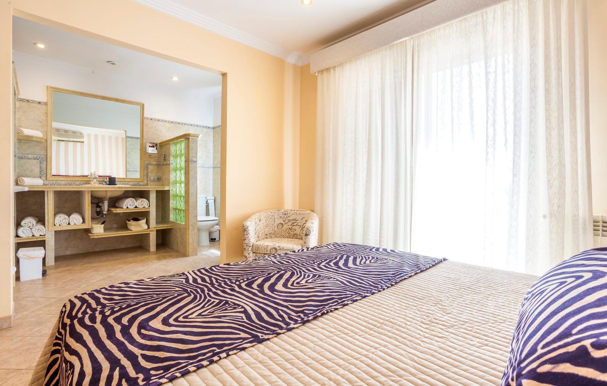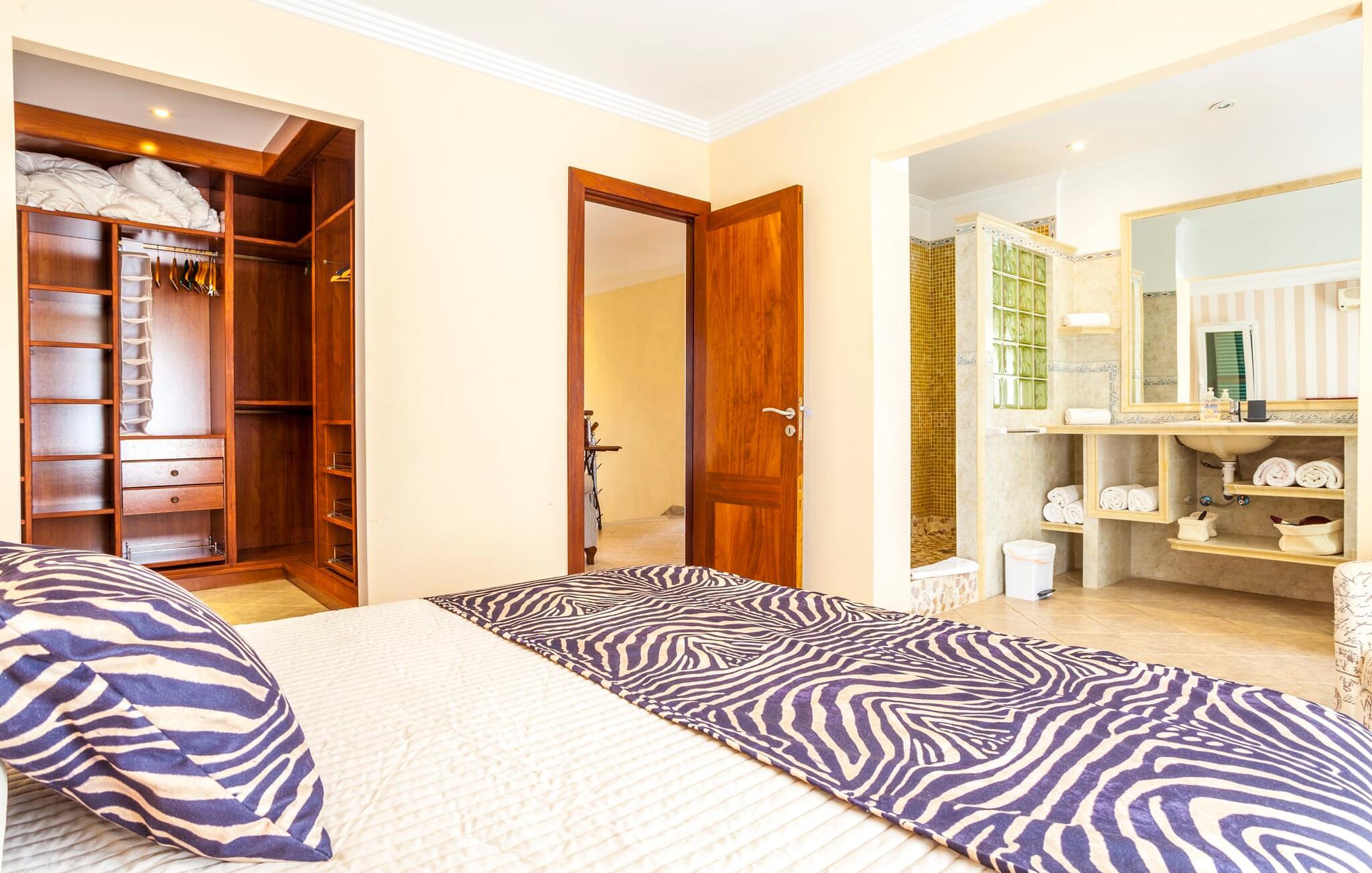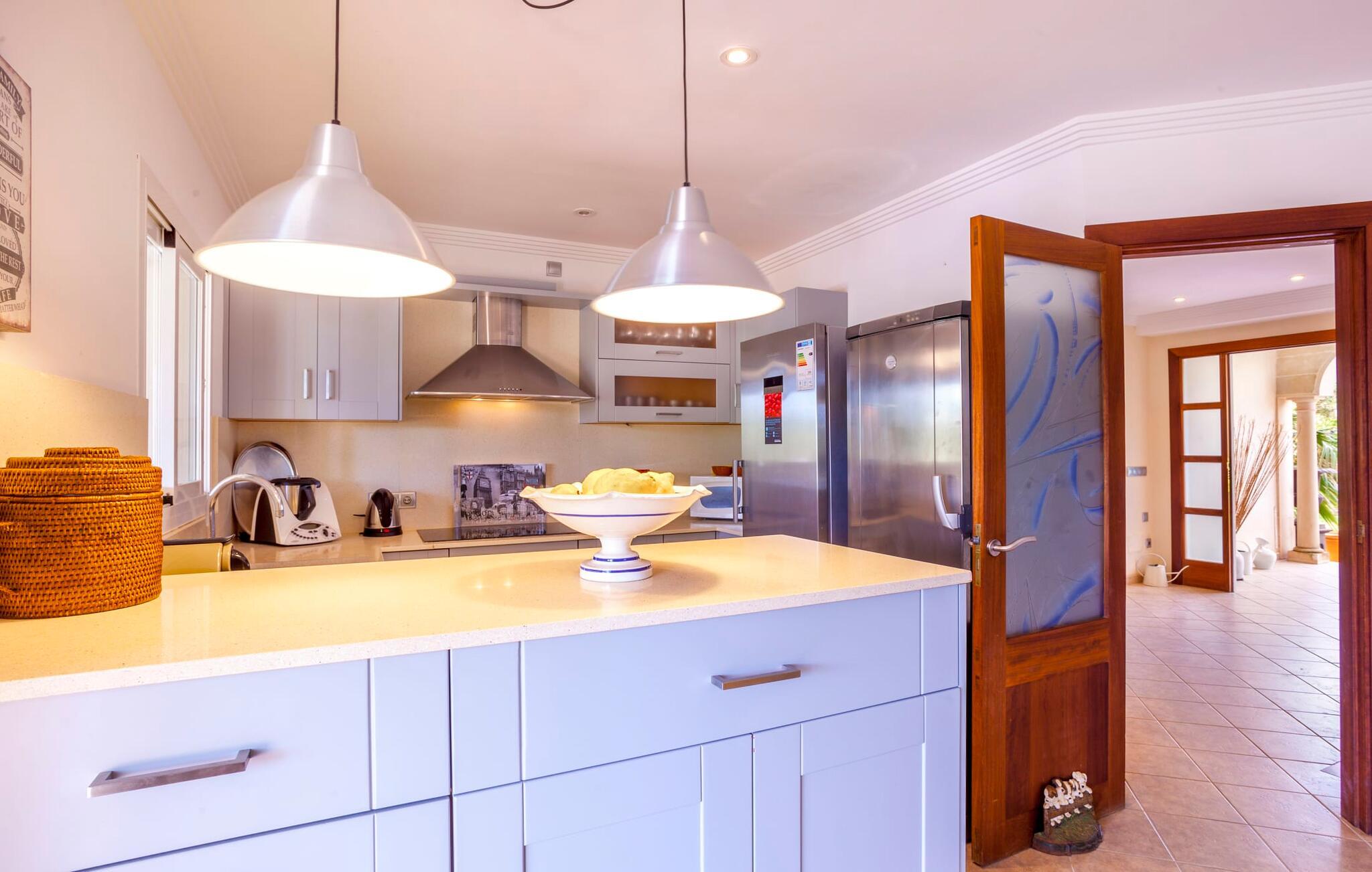 Stille, men ikke for langt væk fra den slagne vej; oliven- og palmetræer; en pool mousserende i solen; Alle de moderne bekvemmeligheder I kan ønske jer i et feriehus - velkommen til Villa “Can Jordi” på det sydlige Mallorca, den perfekte ferieresidens til et utroligt ophold på øen. Den overdækkede naturstensterrasse med en imponerende trappe ind til haven er et sandt blikfang i denne villa med fortryllende grønne skodder. For nemheds skyld kan terrassen låses af hensyn til små børns sikkerhed. Poolen er børnevenlig takket være den store, blide hældning af trinindgangen. Vandet indbyder til at køle af, slappe af og flyde på en af køjerne eller svømme et par længder. Så forkæl jer selv med en lang siesta på en af de komfortable liggestole på den vidunderlige rustikke naturstensterrasse omkring poolen. Foretrækker I skyggen, er den overdækkede terrasse det perfekte sted for jer, hvor I enten kan nyde et solidt festmåltid ved det store spisebord eller synke ned i de komfortable hynder i rattansofaerne. Interiøret i "Can Jordi" er også stilfuldt: alt er lyst og venligt; væggene spreder en hjemlig varme med deres middelhavsfarver; og lysene installeret i lofterne bader alt i et behageligt lys. Stenbuer mellem de åbne rum og en elegant søjle i stuen skaber sammen med de højkvalitets og elegante møbler en særlig statelig stemning, hvor I straks vil føle jer hjemme. De komfortable lædersofaer og to indbydende fløjstole omkring pejsen i stuen er virkelig fristende, mens I i spisestuen kan nyde kulinariske lækkerier i en skøn mørk træsofa. Disse delikatesser kan nemt tilberedes i køkkenet, som er udstyret med moderne udstyr og endnu et rundt spisebord med tilhørende stole, så I kan spise morgenmad uanset vejret i regnvejr. De fem lyse dobbeltværelser garanterer jer en velfortjent nattesøvn - enten komfortable dobbeltsenge eller enkeltsenge inviterer jer til søde drømme. Takket være de store vinduespartier er alle rum lyse ned til mindste detalje – inklusive villaens fire badeværelser. En af dem har et privat badeværelse ovenpå, og alle er meget rene og har store spejle. Placeringen af jeres feriehus er ideel til en virkelig afvekslende ferie: i umiddelbar nærhed kan I nyde fred og ro midt i bjergskråninger, overvejende i form af cypresser. Hvis I så vil ind til byen, skal I kun køre i jeres lejebil cirka 3,3 km til den tidligere fiskerby Colònia Sant Jordi - i dag et populært feriested med et stort udvalg af gode restauranter, caféer og barer samt talrige vandsportsaktiviteter og indkøbsmuligheder. Derfra er der kun få kilometer via forskellige smukke naturstier til en af de smukkeste strande på Mallorca: Es Trenc. Det fine, hvide sand mellem uberørt natur og beskyttede klitter, saltmarker og en fyrreskov skråner blidt ned i det klare vand og er ideelt for børn at lege. Den smukke finca "Can Jordi" ligger roligt på en gammel, tilgroet grund med oliventræer og imponerende palmer i det sydlige Mallorca. Fra den store overdækkede terrasse med sine smukke søjler kan I nyde udsigten over det glitrende hav i det fjerne - der er nogle smukke strande inden for en radius af kun omkring 3 km. Næsten lige så let at komme til er den charmerende lille kystby Colònia de Sant Jordi, hvor I kan slentre langs den livlige havnepromenade, prøve de forskellige restauranter og shoppe til jeres daglige behov.