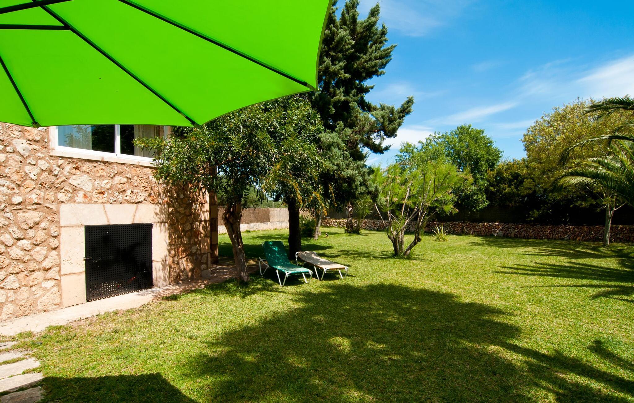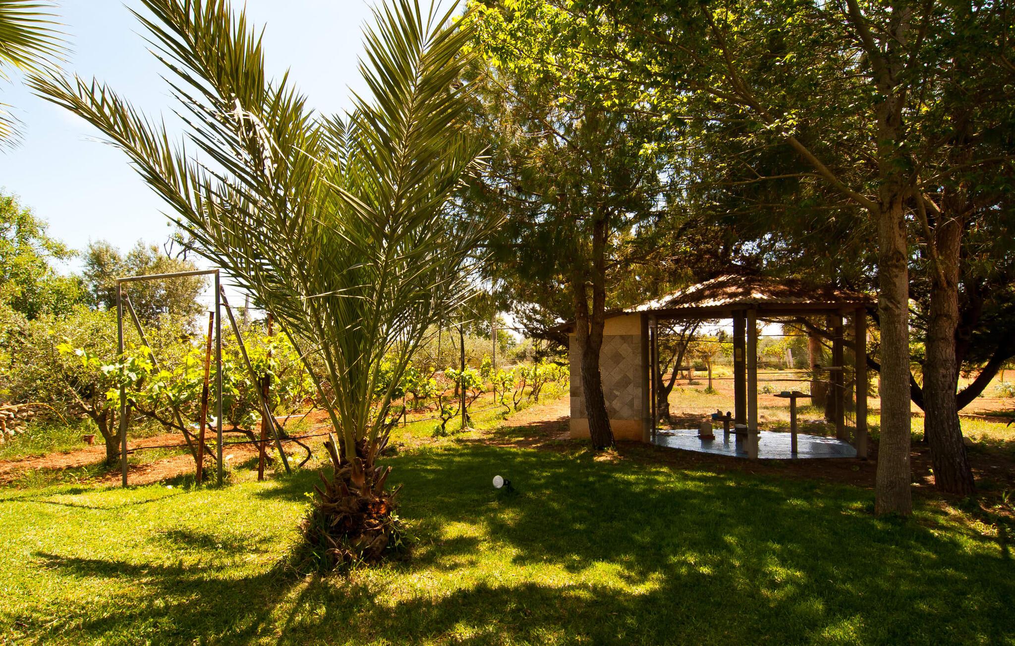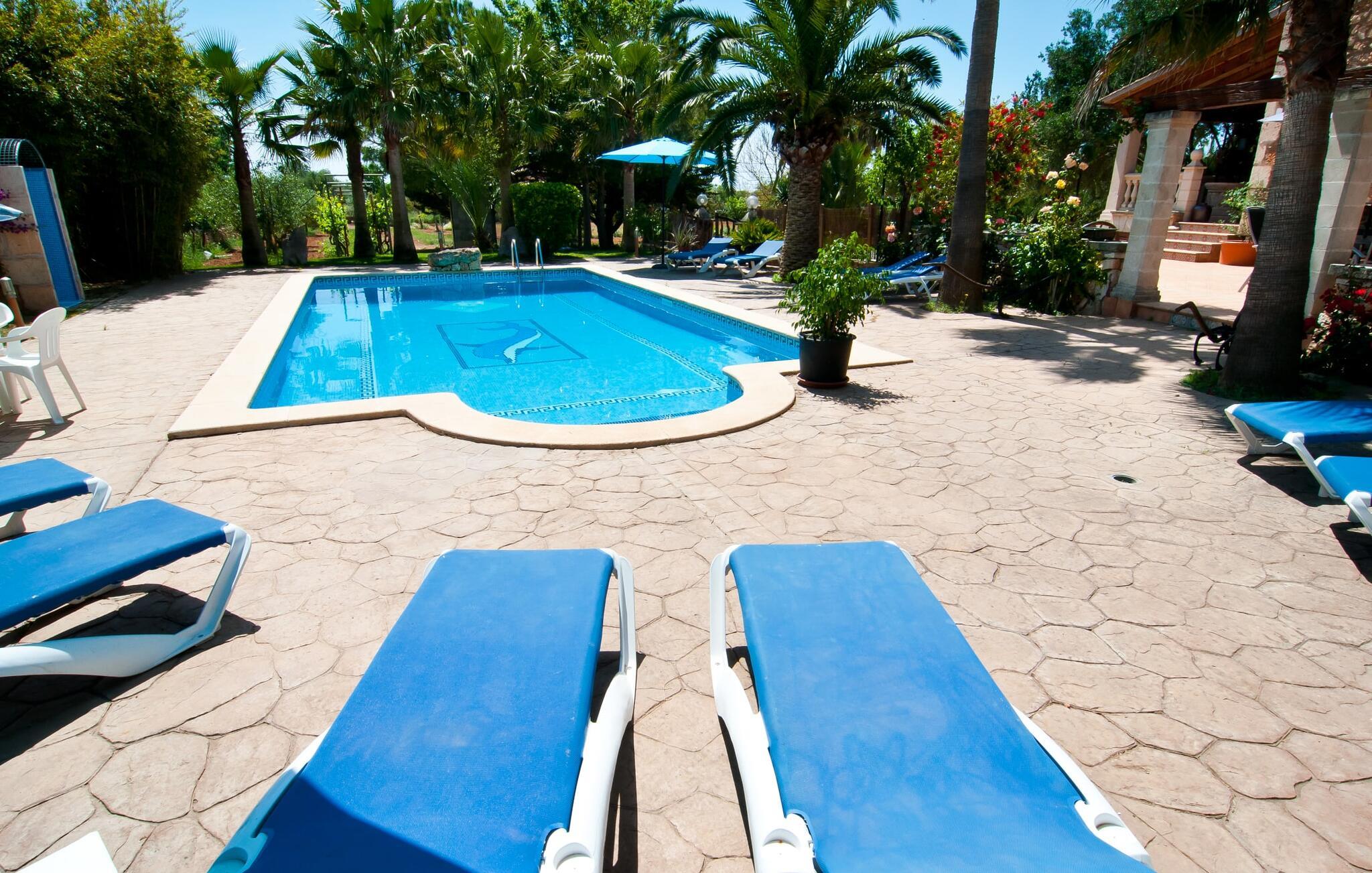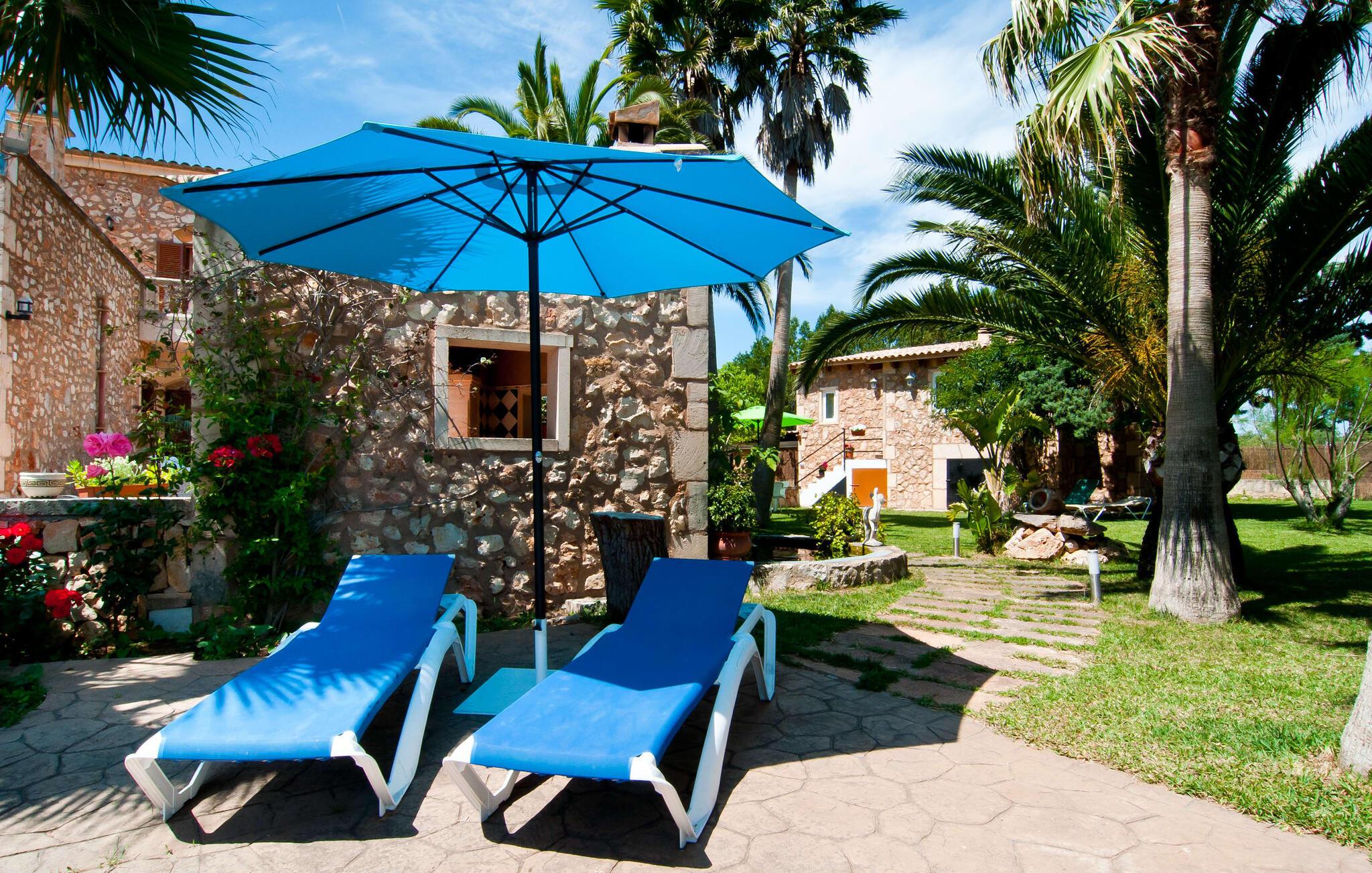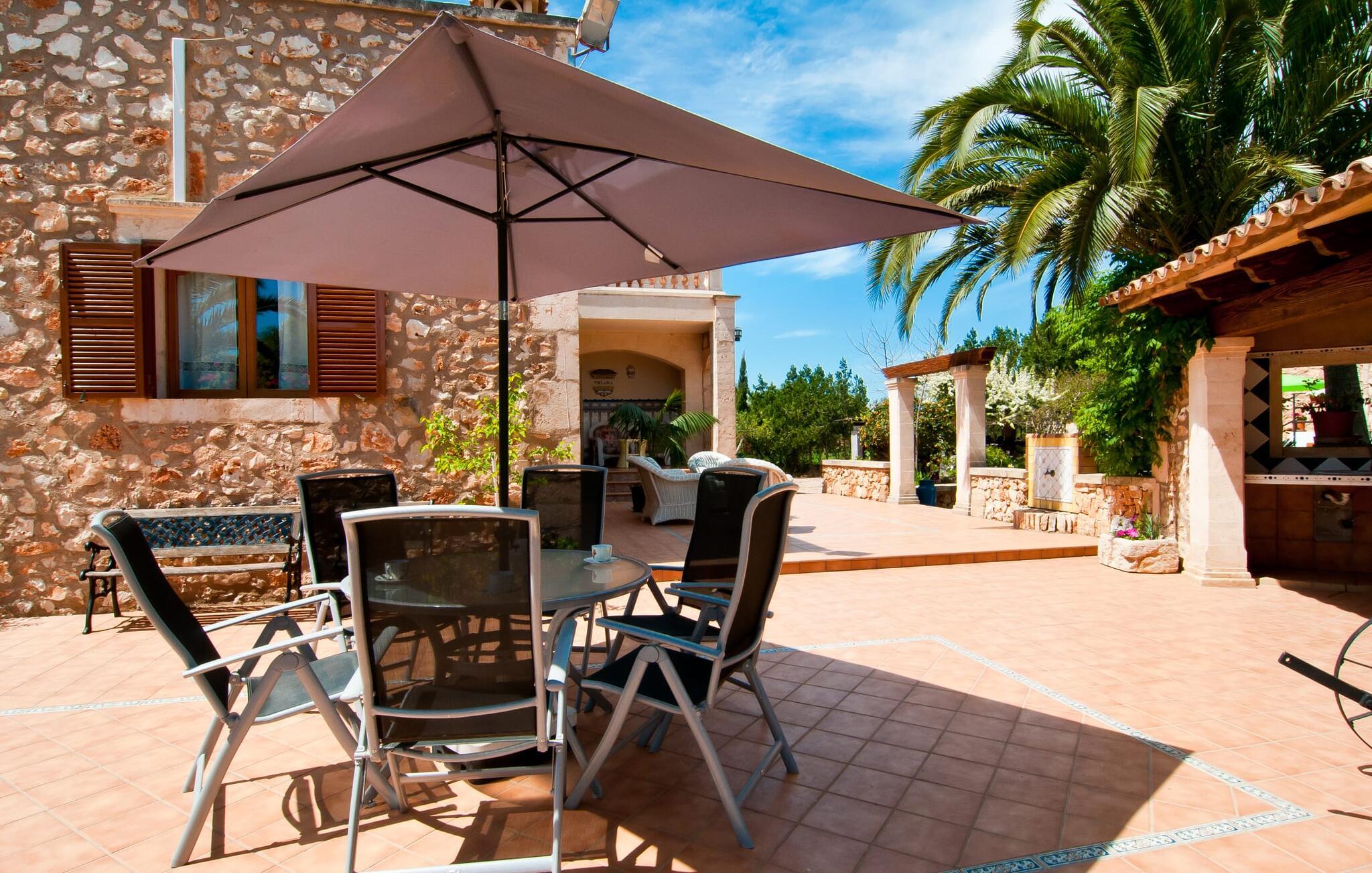 En frodig indkørsel beklædt med en naturstensmur og høje palmer fører os til huset og giver en første smagsprøve på denne ejendoms eksklusivitet. Det står hurtigt klart, at der i udearealet i denne villa er lagt vægt på at præsentere de enkelte elementer i et varieret og større format. Særligt imponerende er det ekstremt store antal træer på ejendommen. I poolområdet får I indtryk af at være midt i en palmehave. En række dekorative elementer og andre unikke stykker og installationer inviterer jer til at opdage og forundre ejendommen og give den en meget individuel flair. På de store terrassearealer kan I hver dag lede efter et nyt, eksklusivt yndlingssted og finde både solrige og luftige naturlige skyggeområder at slappe af. Frugttræer, grøntsager, høns og fugle er også en del af livet på landet her. Poolen, som ligger i læ foran huset, danner havens centrum. Der er adgang til poolen via en stige og har en smuk delfinmosaik på gulvet. Med en længde på 10 m er den en respektabel størrelse. Liggestole og parasoller harmonerer med poolens blå farve og fremtryller et malerisk billede. I kan ligge under middelhavshimlen af hjertens lyst og nyde den mest vidunderlige tid på året. Det kan I lige så smagfuldt gøre i forskellige siddepladser spredt rundt i huset, som udover komfortable kurvestole også byder på spiseborde, stole og en bænk. Ejendommen tilbyder i alt 20 udendørs siddepladser. Et overdækket område er også en del af det rummelige udeareal. I nærheden af poolterrassen ligger grillpladsen, hvor I kan sidde dejligt på lune aftener og forkæle jer selv med friske, regionale delikatesser. Fincaen "Can Lopez Vara" består af et hovedhus og en lejlighed, som stod færdigt i foråret 2014. Når man træder ind i hovedhuset genkender man straks den karakteristiske overdådighed og kan derfor tilbringe tid indenfor i skønne omgivelser. Fritlagte bjælkelofter, mønstrede terracotta-fliser og lyse vægge indrammer dette interiør smukt. I stuen/alrummet, kun adskilt af en bred buet gang, kan I slappe af i sofahjørnet på den ene side og måske nyde en god bog eller en underholdende film, da fjernsynet er bekvemt placeret her. På køligere aftener kan pejsen fremtrylle hyggelig varme. Der er også en lille bar indrettet i hjørnet af lokalet. I kan spise sammen på en kultiveret måde i spisestuen og gøre alle forberedelser på forhånd i køkkenet lige ved siden af. Køkkenet er rummeligt og byder på alt hvad I behøver til daglig brug samt masser af opbevaringsplads. Hvidevarerne omfatter et komfur, en ovn, en køle/frysekombination, en brødrister og en opvaskemaskine samt en kedel og en filterkaffemaskine. Der er endda plads til endnu et lille spisebord, hvor I kan nyde en lille snack med en lille gruppe. I de fem kærligt og meget individuelt designede soveværelser vil alle med garanti finde deres ideelle sted for en afslappende søvn. Badeværelserne fremstår friske og lyse og er udstyret med møbler af høj kvalitet. Den smukke lejlighed har en dobbeltseng og en sovesofa til en ekstra person. Stuen er meget åben. To af soveværelserne har aircondition, de andre har loftsventilator. Derudover har annekset og spisestuen også aircondition. Det smukke havneområde i den tidligere fiskerby Colonia de Sant Jordi (16 km) er ideelt til en kort tur. Elskere af badeferie er kommet til det rigtige sted med villaen "Can Lopez Vara". De indbydende strande på sydøstkysten, især den familievenlige Es Trenc strand, kan hurtigt nås med lejebil. Hvis I ønsker det, kan I udforske en anden af de mange bugter hver dag. Om aftenen på en fantastisk feriedag, kan I vende tilbage til jeres ferievilla og skabe jeres egen personlige afslutning på dagen. Villaen "Can Lopez Vara" er beliggende i en afsondret landlig beliggenhed, mindre end 5 minutter i bil nord for byen Campos i den sydlige del af øen. Campos har barer og restauranter samt butikker til daglige behov. Køreturen til Mallorcas sydlige strande er ikke langt fra dette feriehus.