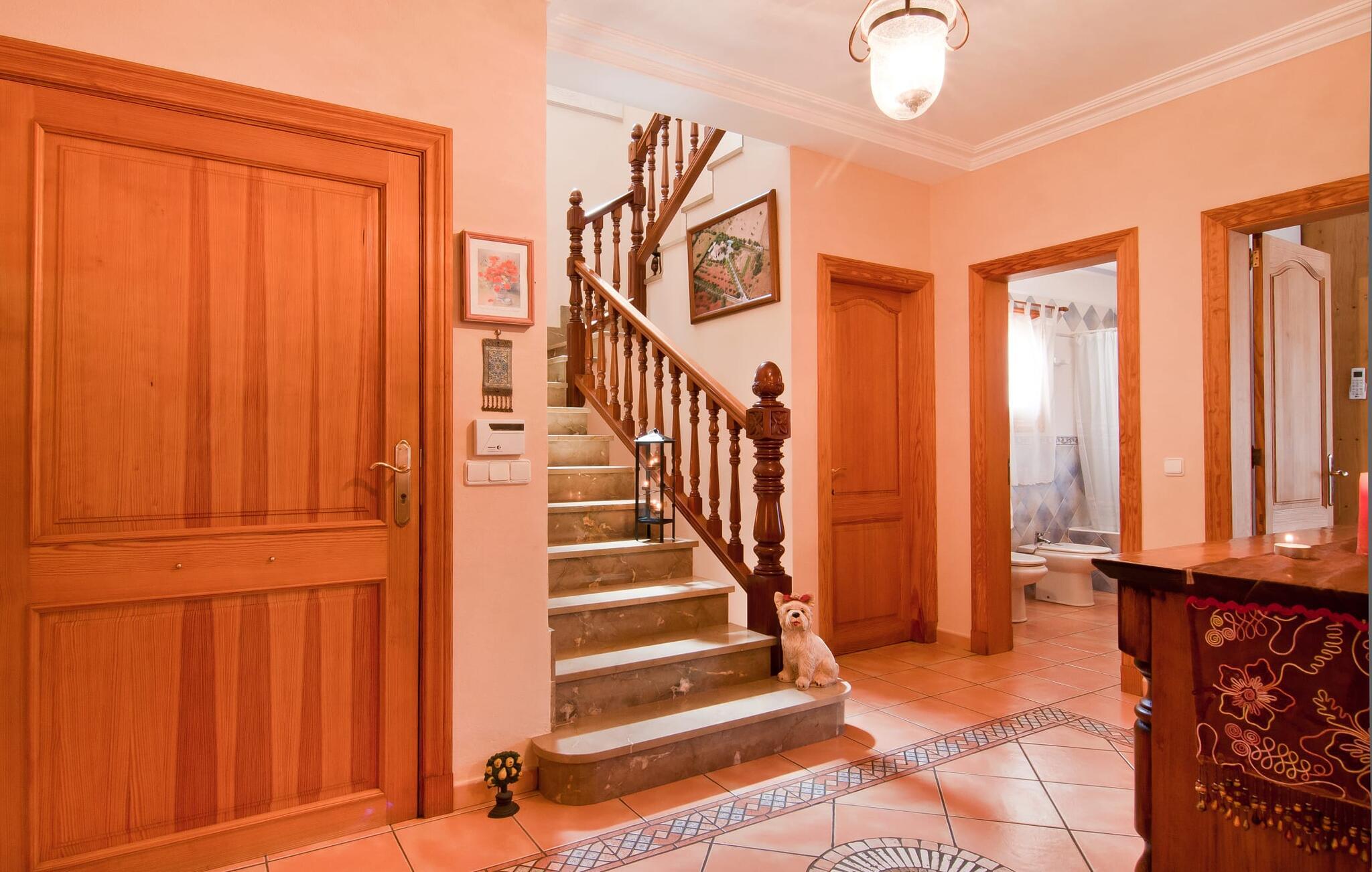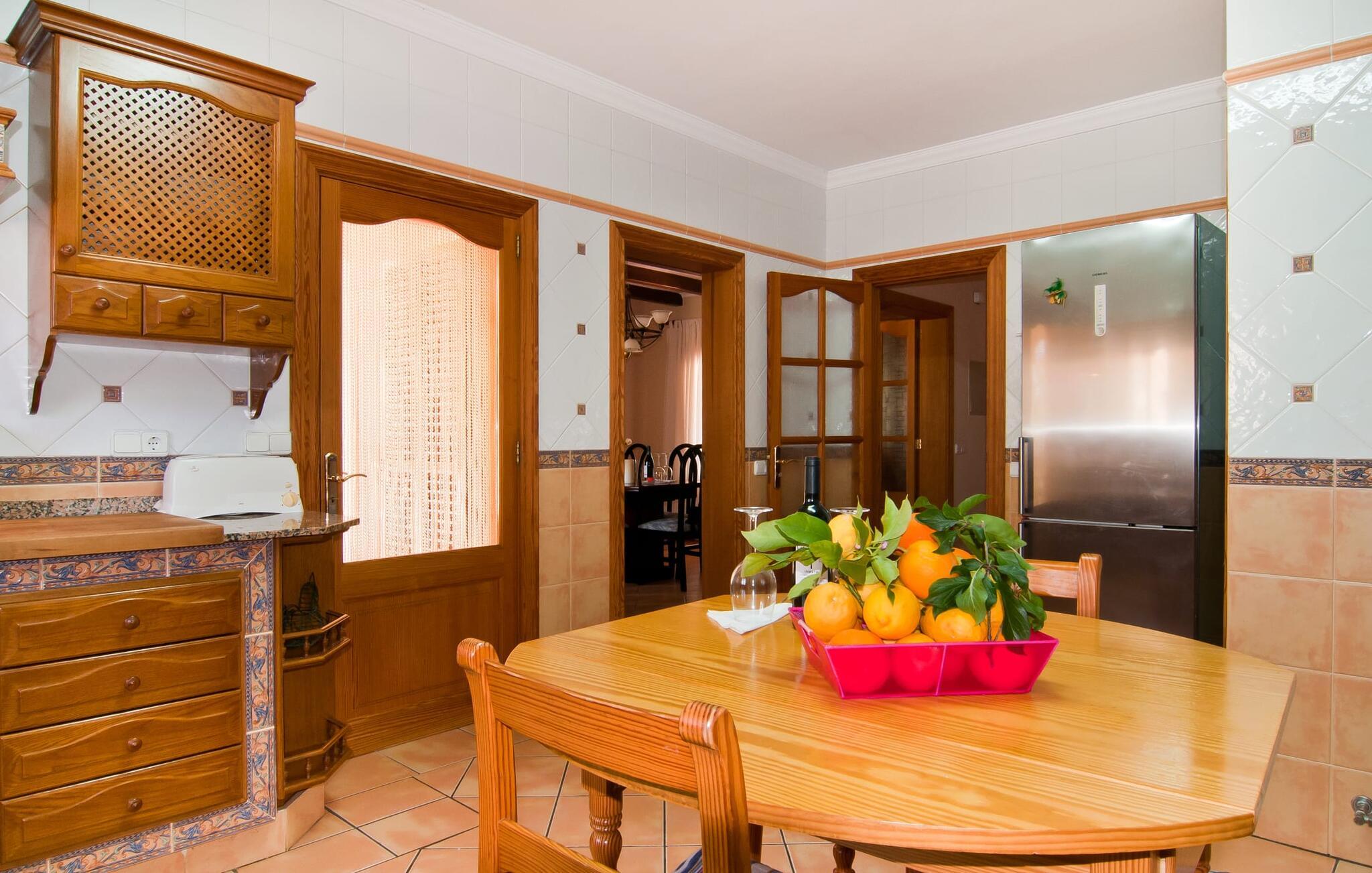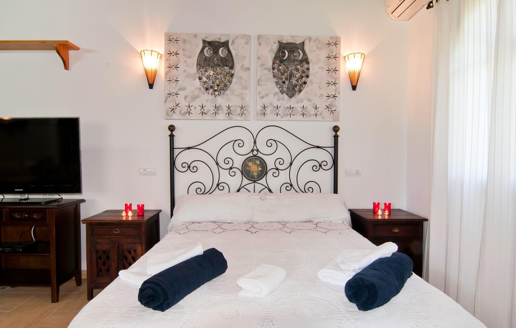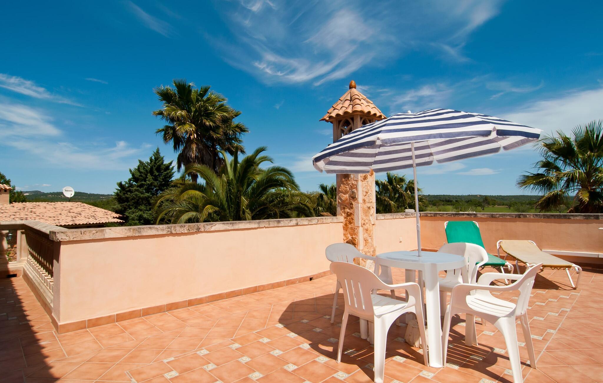 En frodig indkørsel beklædt med en naturstensmur og høje palmer fører os til huset og giver en første smagsprøve på denne ejendoms eksklusivitet. Det står hurtigt klart, at der i udearealet i denne villa er lagt vægt på at præsentere de enkelte elementer i et varieret og større format. Særligt imponerende er det ekstremt store antal træer på ejendommen. I poolområdet får I indtryk af at være midt i en palmehave. En række dekorative elementer og andre unikke stykker og installationer inviterer jer til at opdage og forundre ejendommen og give den en meget individuel flair. På de store terrassearealer kan I hver dag lede efter et nyt, eksklusivt yndlingssted og finde både solrige og luftige naturlige skyggeområder at slappe af. Frugttræer, grøntsager, høns og fugle er også en del af livet på landet her. Poolen, som ligger i læ foran huset, danner havens centrum. Der er adgang til poolen via en stige og har en smuk delfinmosaik på gulvet. Med en længde på 10 m er den en respektabel størrelse. Liggestole og parasoller harmonerer med poolens blå farve og fremtryller et malerisk billede. I kan ligge under middelhavshimlen af hjertens lyst og nyde den mest vidunderlige tid på året. Det kan I lige så smagfuldt gøre i forskellige siddepladser spredt rundt i huset, som udover komfortable kurvestole også byder på spiseborde, stole og en bænk. Ejendommen tilbyder i alt 20 udendørs siddepladser. Et overdækket område er også en del af det rummelige udeareal. I nærheden af poolterrassen ligger grillpladsen, hvor I kan sidde dejligt på lune aftener og forkæle jer selv med friske, regionale delikatesser. Fincaen "Can Lopez Vara" består af et hovedhus og en lejlighed, som stod færdigt i foråret 2014. Når man træder ind i hovedhuset genkender man straks den karakteristiske overdådighed og kan derfor tilbringe tid indenfor i skønne omgivelser. Fritlagte bjælkelofter, mønstrede terracotta-fliser og lyse vægge indrammer dette interiør smukt. I stuen/alrummet, kun adskilt af en bred buet gang, kan I slappe af i sofahjørnet på den ene side og måske nyde en god bog eller en underholdende film, da fjernsynet er bekvemt placeret her. På køligere aftener kan pejsen fremtrylle hyggelig varme. Der er også en lille bar indrettet i hjørnet af lokalet. I kan spise sammen på en kultiveret måde i spisestuen og gøre alle forberedelser på forhånd i køkkenet lige ved siden af. Køkkenet er rummeligt og byder på alt hvad I behøver til daglig brug samt masser af opbevaringsplads. Hvidevarerne omfatter et komfur, en ovn, en køle/frysekombination, en brødrister og en opvaskemaskine samt en kedel og en filterkaffemaskine. Der er endda plads til endnu et lille spisebord, hvor I kan nyde en lille snack med en lille gruppe. I de fem kærligt og meget individuelt designede soveværelser vil alle med garanti finde deres ideelle sted for en afslappende søvn. Badeværelserne fremstår friske og lyse og er udstyret med møbler af høj kvalitet. Den smukke lejlighed har en dobbeltseng og en sovesofa til en ekstra person. Stuen er meget åben. To af soveværelserne har aircondition, de andre har loftsventilator. Derudover har annekset og spisestuen også aircondition. Det smukke havneområde i den tidligere fiskerby Colonia de Sant Jordi (16 km) er ideelt til en kort tur. Elskere af badeferie er kommet til det rigtige sted med villaen "Can Lopez Vara". De indbydende strande på sydøstkysten, især den familievenlige Es Trenc strand, kan hurtigt nås med lejebil. Hvis I ønsker det, kan I udforske en anden af de mange bugter hver dag. Om aftenen på en fantastisk feriedag, kan I vende tilbage til jeres ferievilla og skabe jeres egen personlige afslutning på dagen. Villaen "Can Lopez Vara" er beliggende i en afsondret landlig beliggenhed, mindre end 5 minutter i bil nord for byen Campos i den sydlige del af øen. Campos har barer og restauranter samt butikker til daglige behov. Køreturen til Mallorcas sydlige strande er ikke langt fra dette feriehus.