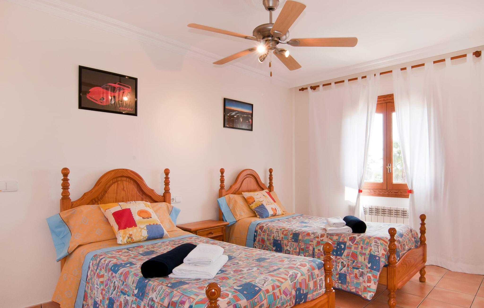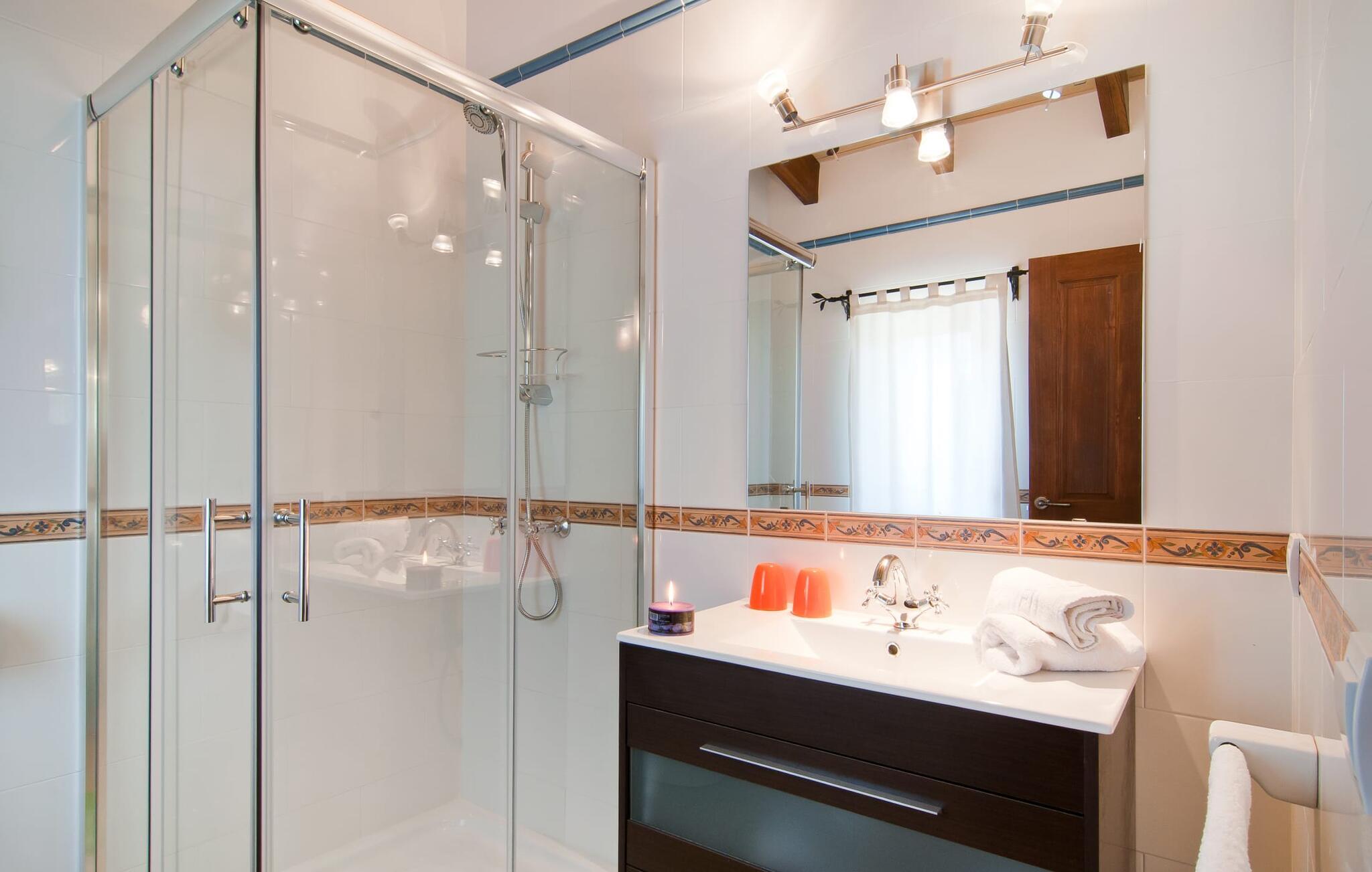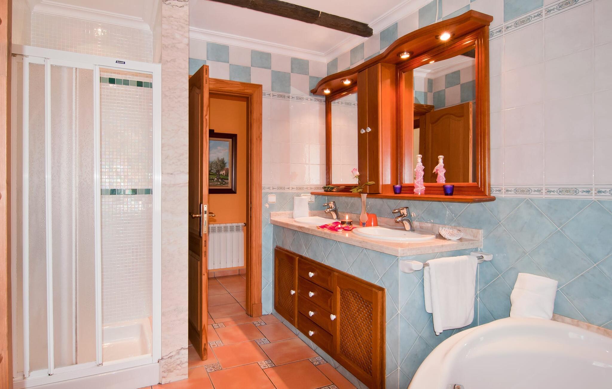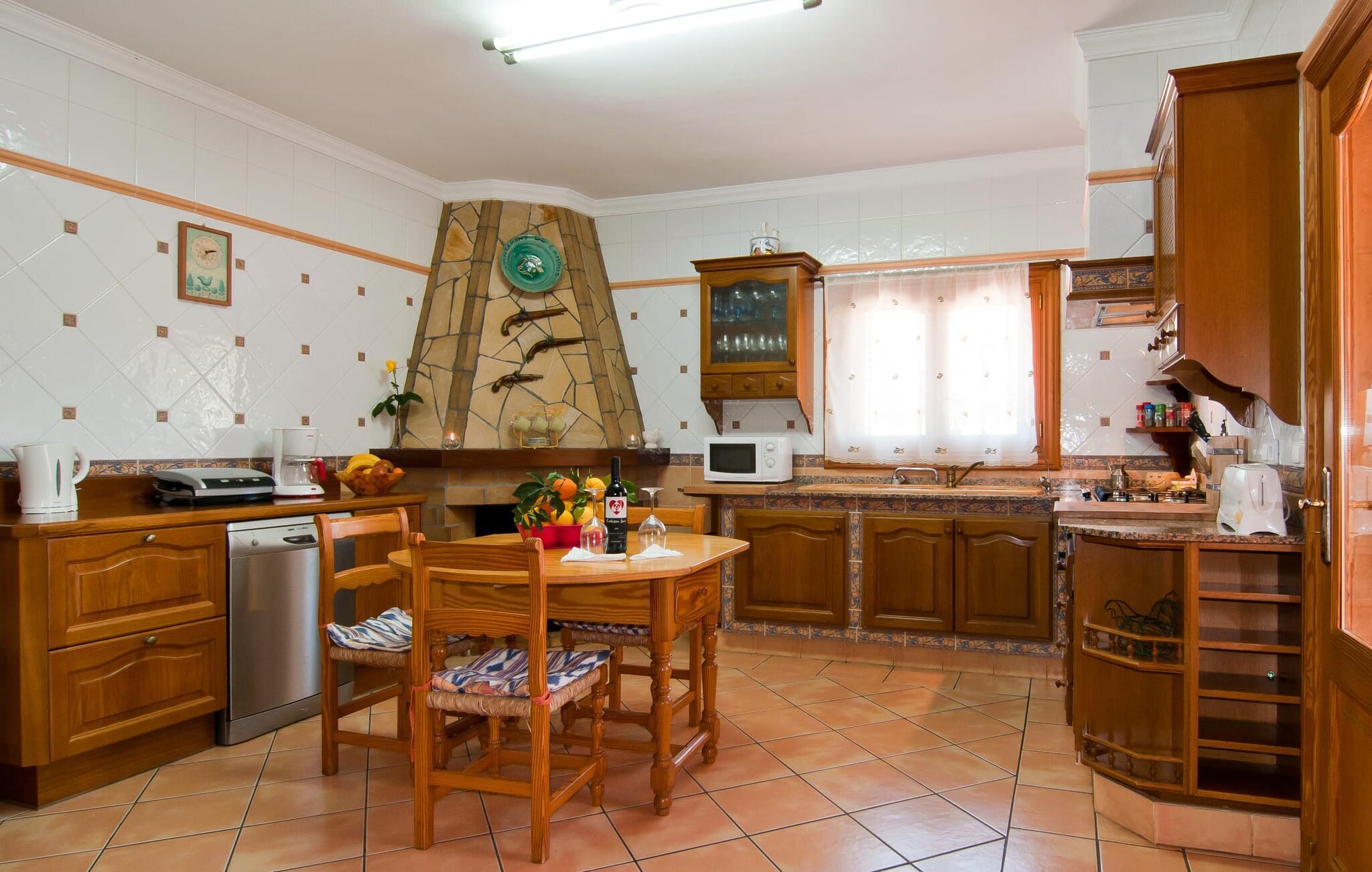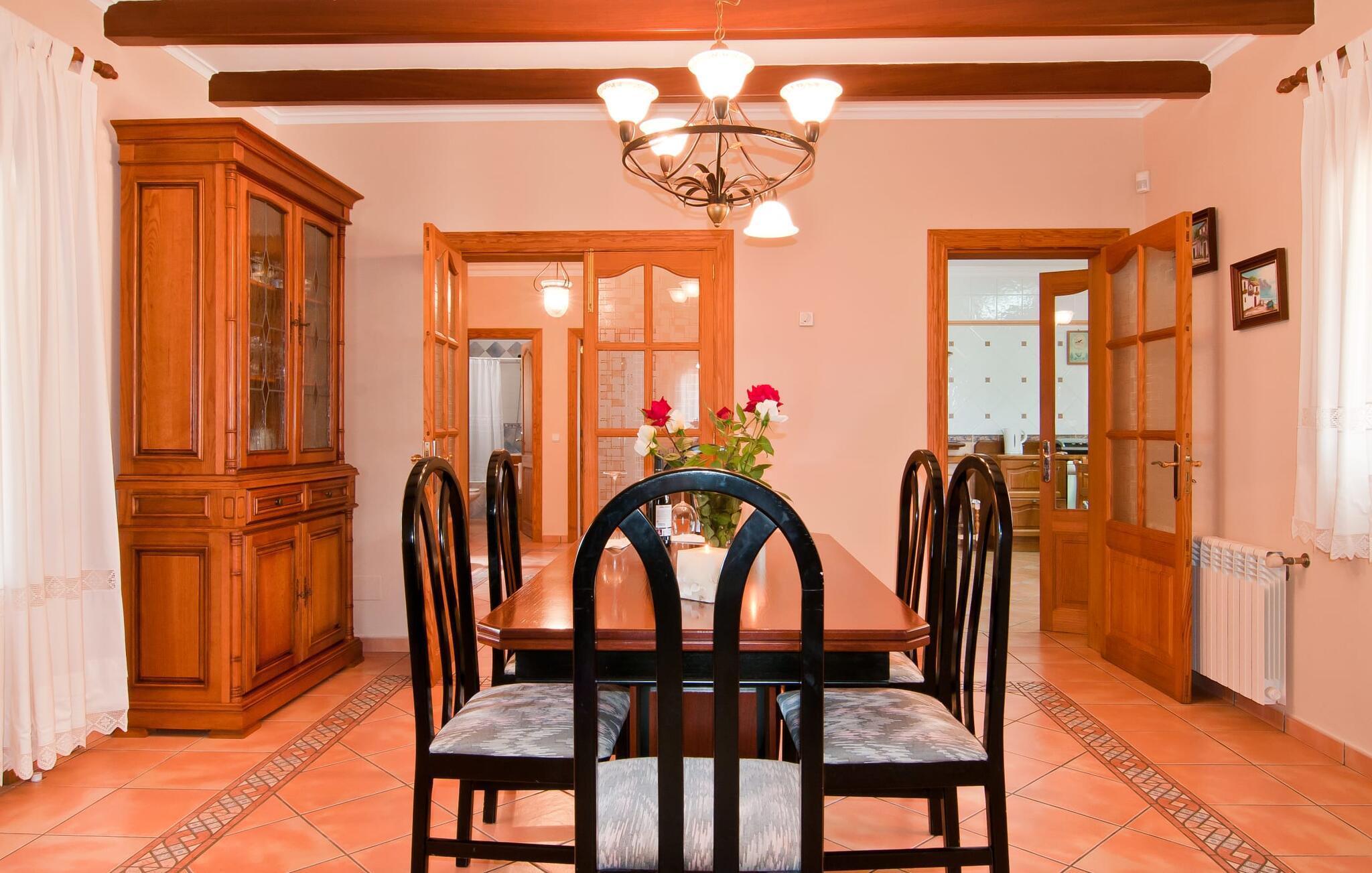 En frodig indkørsel beklædt med en naturstensmur og høje palmer fører os til huset og giver en første smagsprøve på denne ejendoms eksklusivitet. Det står hurtigt klart, at der i udearealet i denne villa er lagt vægt på at præsentere de enkelte elementer i et varieret og større format. Særligt imponerende er det ekstremt store antal træer på ejendommen. I poolområdet får I indtryk af at være midt i en palmehave. En række dekorative elementer og andre unikke stykker og installationer inviterer jer til at opdage og forundre ejendommen og give den en meget individuel flair. På de store terrassearealer kan I hver dag lede efter et nyt, eksklusivt yndlingssted og finde både solrige og luftige naturlige skyggeområder at slappe af. Frugttræer, grøntsager, høns og fugle er også en del af livet på landet her. Poolen, som ligger i læ foran huset, danner havens centrum. Der er adgang til poolen via en stige og har en smuk delfinmosaik på gulvet. Med en længde på 10 m er den en respektabel størrelse. Liggestole og parasoller harmonerer med poolens blå farve og fremtryller et malerisk billede. I kan ligge under middelhavshimlen af hjertens lyst og nyde den mest vidunderlige tid på året. Det kan I lige så smagfuldt gøre i forskellige siddepladser spredt rundt i huset, som udover komfortable kurvestole også byder på spiseborde, stole og en bænk. Ejendommen tilbyder i alt 20 udendørs siddepladser. Et overdækket område er også en del af det rummelige udeareal. I nærheden af poolterrassen ligger grillpladsen, hvor I kan sidde dejligt på lune aftener og forkæle jer selv med friske, regionale delikatesser. Fincaen "Can Lopez Vara" består af et hovedhus og en lejlighed, som stod færdigt i foråret 2014. Når man træder ind i hovedhuset genkender man straks den karakteristiske overdådighed og kan derfor tilbringe tid indenfor i skønne omgivelser. Fritlagte bjælkelofter, mønstrede terracotta-fliser og lyse vægge indrammer dette interiør smukt. I stuen/alrummet, kun adskilt af en bred buet gang, kan I slappe af i sofahjørnet på den ene side og måske nyde en god bog eller en underholdende film, da fjernsynet er bekvemt placeret her. På køligere aftener kan pejsen fremtrylle hyggelig varme. Der er også en lille bar indrettet i hjørnet af lokalet. I kan spise sammen på en kultiveret måde i spisestuen og gøre alle forberedelser på forhånd i køkkenet lige ved siden af. Køkkenet er rummeligt og byder på alt hvad I behøver til daglig brug samt masser af opbevaringsplads. Hvidevarerne omfatter et komfur, en ovn, en køle/frysekombination, en brødrister og en opvaskemaskine samt en kedel og en filterkaffemaskine. Der er endda plads til endnu et lille spisebord, hvor I kan nyde en lille snack med en lille gruppe. I de fem kærligt og meget individuelt designede soveværelser vil alle med garanti finde deres ideelle sted for en afslappende søvn. Badeværelserne fremstår friske og lyse og er udstyret med møbler af høj kvalitet. Den smukke lejlighed har en dobbeltseng og en sovesofa til en ekstra person. Stuen er meget åben. To af soveværelserne har aircondition, de andre har loftsventilator. Derudover har annekset og spisestuen også aircondition. Det smukke havneområde i den tidligere fiskerby Colonia de Sant Jordi (16 km) er ideelt til en kort tur. Elskere af badeferie er kommet til det rigtige sted med villaen "Can Lopez Vara". De indbydende strande på sydøstkysten, især den familievenlige Es Trenc strand, kan hurtigt nås med lejebil. Hvis I ønsker det, kan I udforske en anden af de mange bugter hver dag. Om aftenen på en fantastisk feriedag, kan I vende tilbage til jeres ferievilla og skabe jeres egen personlige afslutning på dagen. Villaen "Can Lopez Vara" er beliggende i en afsondret landlig beliggenhed, mindre end 5 minutter i bil nord for byen Campos i den sydlige del af øen. Campos har barer og restauranter samt butikker til daglige behov. Køreturen til Mallorcas sydlige strande er ikke langt fra dette feriehus.