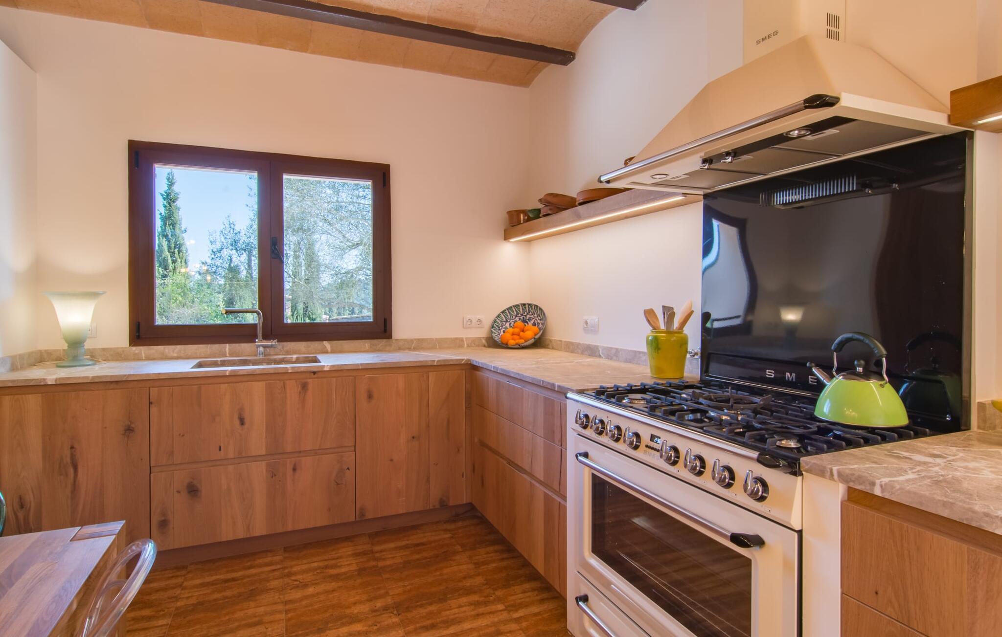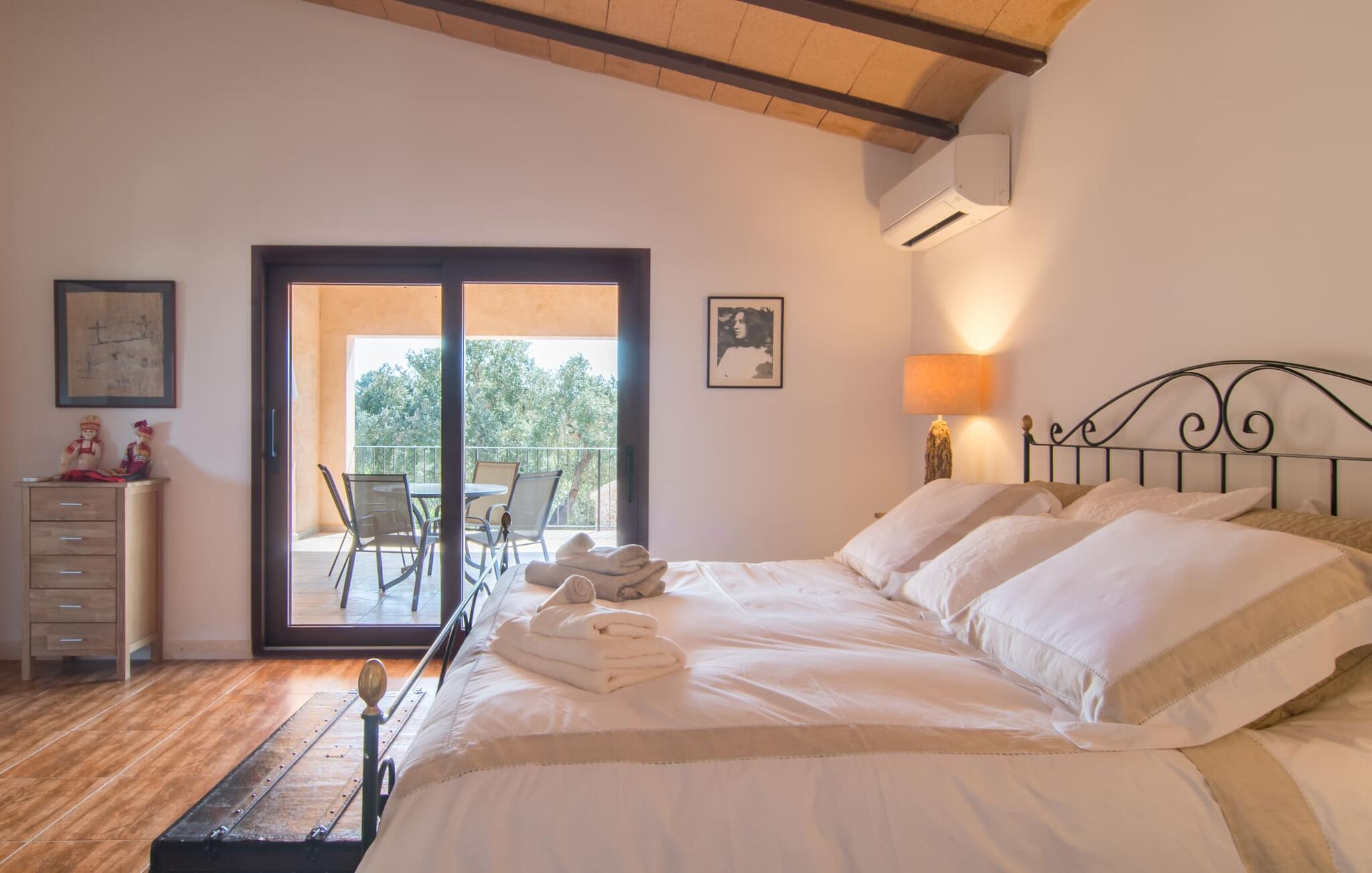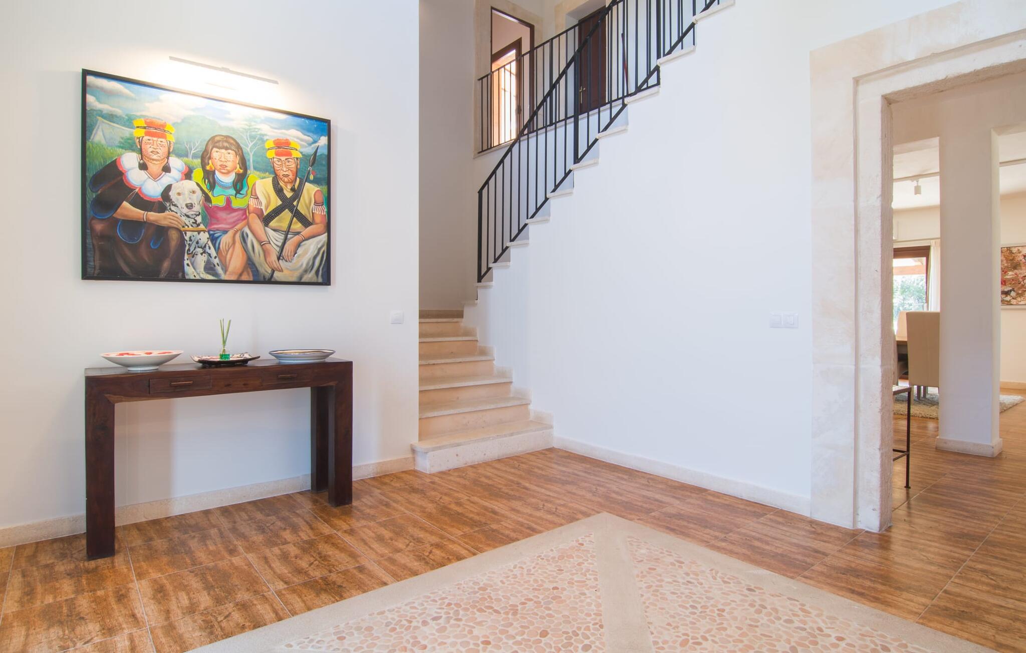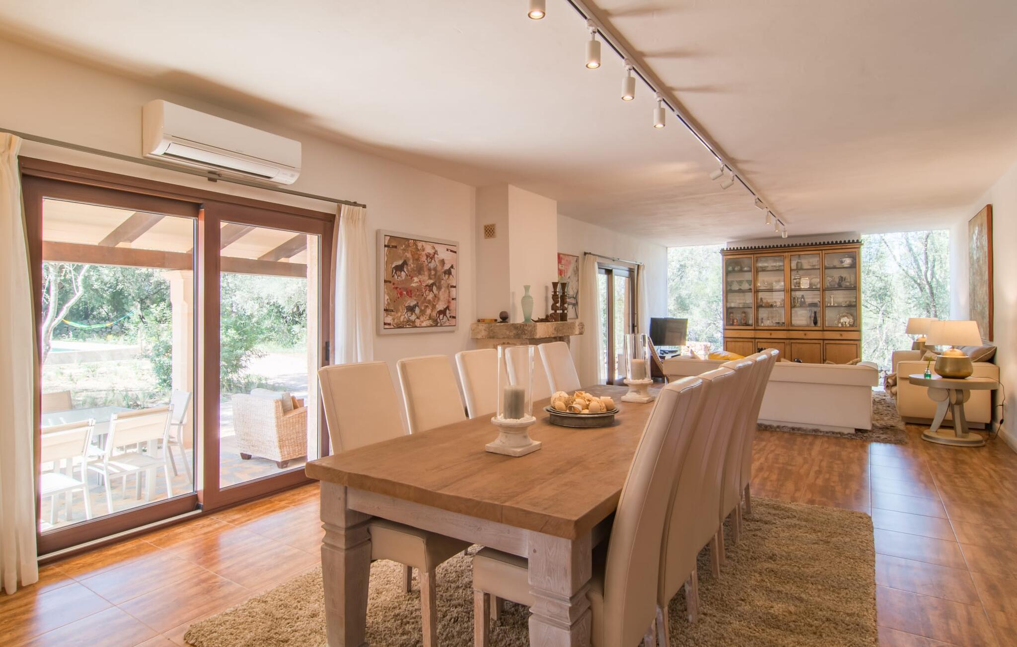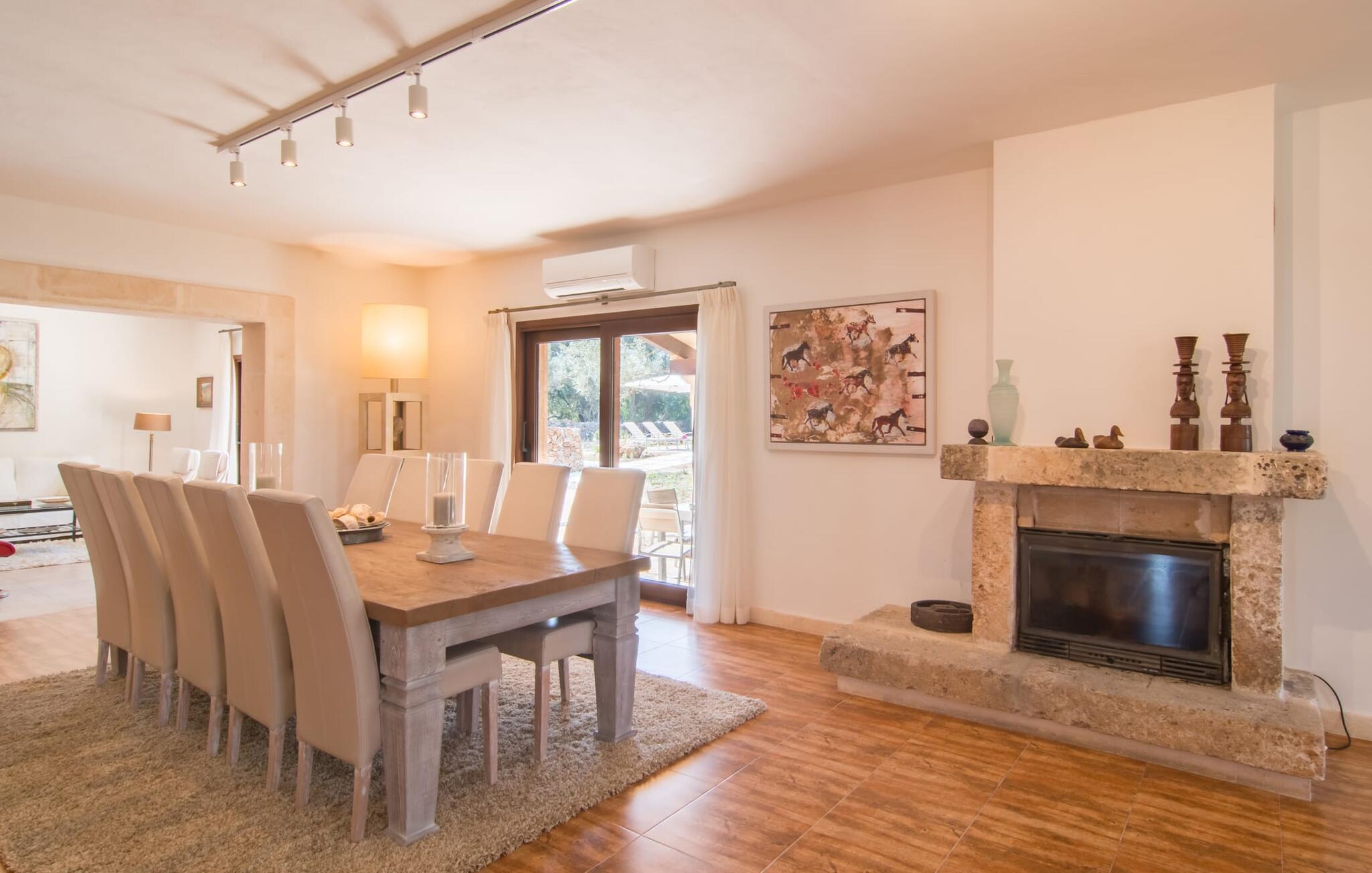 Farverne på "Can Madis" fanger straks øjet - de udtrykker livlighed, frihed, nærhed til naturen og på samme tid en følelse af ædel skønhed og luksus. Noget vi sjældent forkæler os selv med, måske alt for sjældent. Derfor bør I forkæle jeres familie og venner med et besøg på "Can Madis", en smuk ejendom i hjertet af vores ø. Figen- og oliventræer, cypresser og udsigt over Tramuntana-bjergene karakteriserer middelhavsejendommen. Den nybyggede sandstensbygning, der skinner gyldent i solen, afspejler tradition og modernitet. Det er afrundet af den enorme pool med komfortabel indgang. Efter lange dage med udflugter eller vandreture kan I slappe af i spabadet. Bagefter kan I tage en siesta på en af de komfortable liggestole under den dobbelte parasol eller blot slappe af i en af hængekøjerne i haven. Den indbyggede hjørnegrill fungerer også som bålplads efter et lækkert festmåltid - I kan sidde på de indbydende kurvemøbler ved et langt træbord under markiserne. I kan også finde mere komfortable møbler på den overdækkede del af terrassen med spiseplads, en afslappet lounge og farverige liggestole. Afslapning er hovedaktiviteten på programmet, så det usædvanligt smarte interiør og udvendige design vil altid passe til jeres behov. Midtpunktet er det kombinerede opholdsrum. Denne lyse stue med gulv til loft vinduer er opdelt i en hyggelig stue med sofagruppe og tv-hjørne, en stilfuld spiseplads foran en hyggelig pejs og et rustikt bibliotek, ligeledes med smart-tv. Så mange yndlingssteder at vælge imellem! Terracotta, trægulve, buede lofter og "hopper" understreger den naturlige atmosfære i interiøret. I vil også opdage denne kvalitet i det fuldt udstyrede køkken med træmøbler af høj kvalitet. Samtidig minder det om et gammelt stuehus med det andet ildsted: I tidligere tider var dette socialcenter, da det ofte var det eneste opvarmede lokale. Efter lange, frie dage vil I til sidst føle jer træt - I kan derefter trække jer tilbage til et af de fire airconditionerede soveværelser, hvoraf de fleste er placeret på øverste etage (et soveværelse med badeværelse er i stueetagen). På første sal har hvert af de smarte soveværelser med fantastisk udsigt også et badeværelse med brusekabine eller badekar. Den rummelige balkon med tag, hvorfra I kan overskue haven og poolen, er et ideelt sted at trække sig tilbage for at læse en god bog. Lad os være ærlige – kan I komme i tanke om noget, I skal gå på kompromis med? Vi er helt vilde med "Can Madis". Det gælder også den smukke beliggenhed af denne premium villa, selvom øens centrum ofte får mindre opmærksomhed. Det er også tilfældet med Costitx, den dejlige lille by, der hurtigt kan nås. Det tilbyder alt, hvad I behøver til hverdagen, såvel som de typiske ø-faciliteter: et landsbytorv i centrum og et ugentligt marked om lørdagen. Caféer, restauranter, en bank, et apotek, et supermarked – hvad mere kan jeres hjerte ønske sig? Og i denne lille by er der af alle steder et planetarium – men måske er udsigten til stjernerne midt på øen simpelthen den smukkeste. I bør bestemt også besøge Santuari Ferrer de Son Ferrer-attraktionen, som I endda kan kombinere med en kort gåtur. Simpelthen spredt ud - takket være den centrale beliggenhed kan I hurtigt nå alle regioner. God fornøjelse med at udforske hele Mallorca! Den moderne naturstensvilla "Can Madis" byder på et unikt smukt feriehus med en stor pool og et omfattende havelandskab. Ejendommen har en utrolig rolig beliggenhed i centrum af øen mellem Sencelles og Costitx, hvor I også kan shoppe eller besøge det ugentlige marked. Fra den centrale del af øen kan I tage på fantastiske ture til alle kystregioner og deres lokale strande - fra Cuidad Jardin i syd til Alcúdia-bugten i nord.