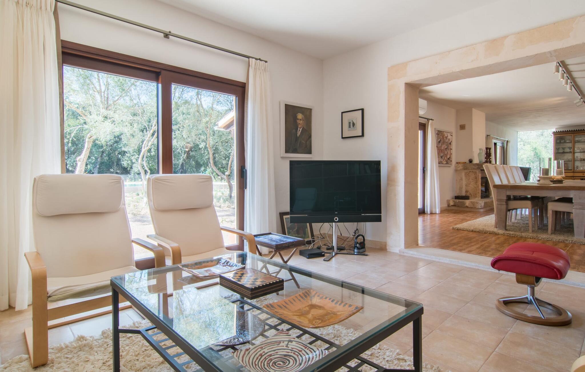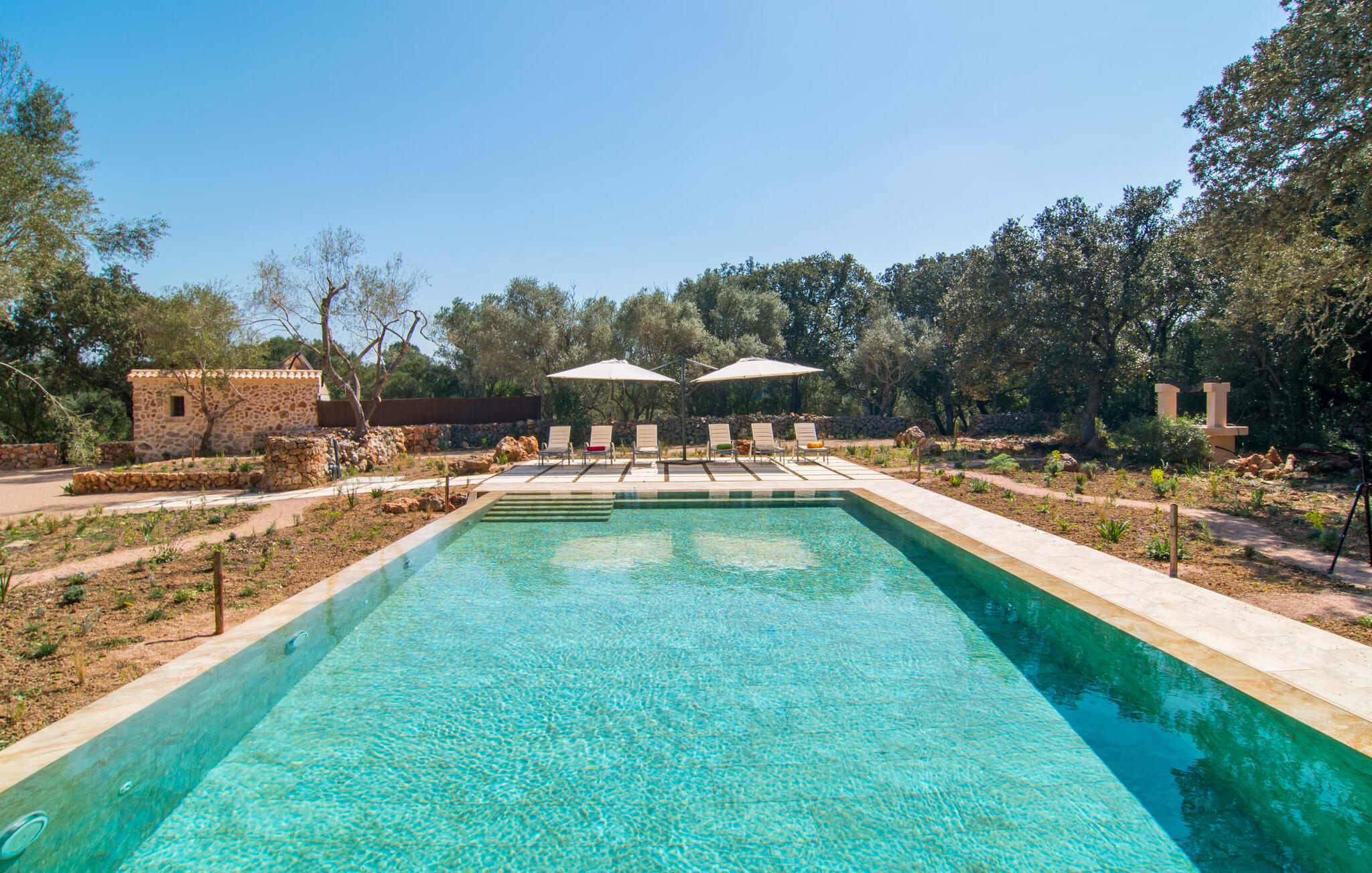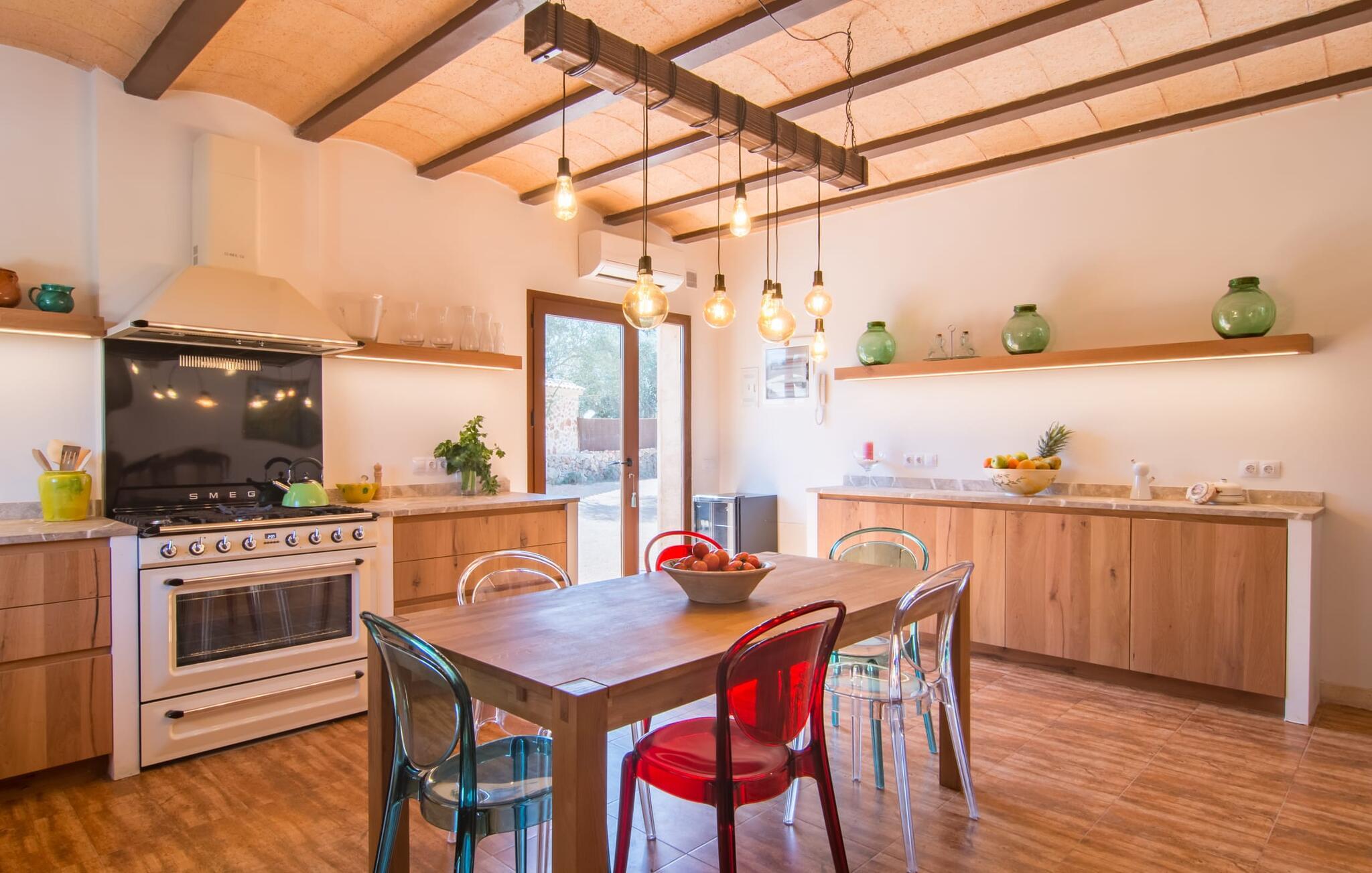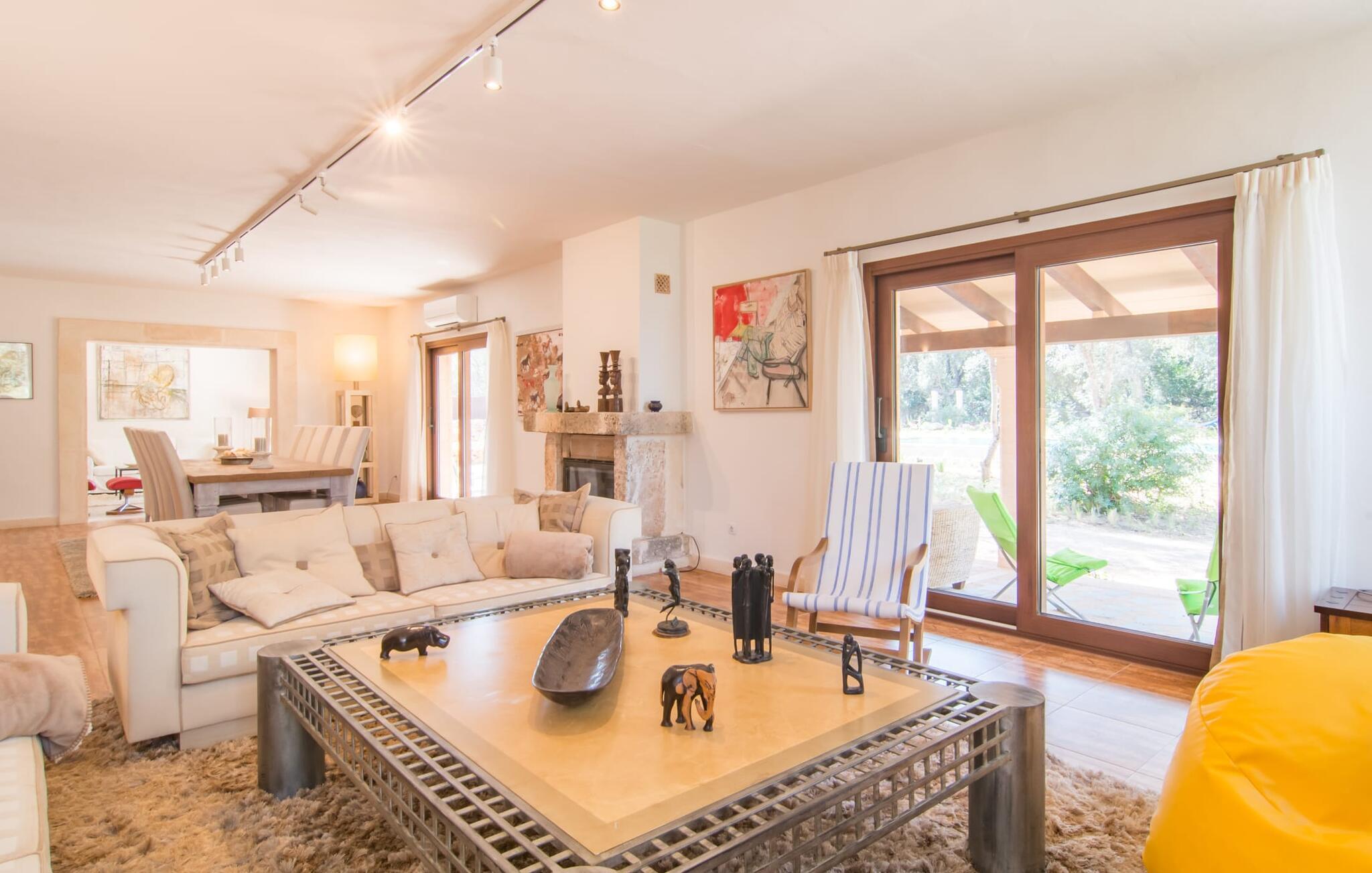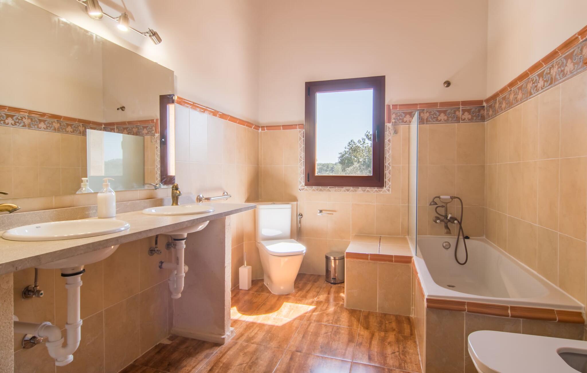 Farverne på "Can Madis" fanger straks øjet - de udtrykker livlighed, frihed, nærhed til naturen og på samme tid en følelse af ædel skønhed og luksus. Noget vi sjældent forkæler os selv med, måske alt for sjældent. Derfor bør I forkæle jeres familie og venner med et besøg på "Can Madis", en smuk ejendom i hjertet af vores ø. Figen- og oliventræer, cypresser og udsigt over Tramuntana-bjergene karakteriserer middelhavsejendommen. Den nybyggede sandstensbygning, der skinner gyldent i solen, afspejler tradition og modernitet. Det er afrundet af den enorme pool med komfortabel indgang. Efter lange dage med udflugter eller vandreture kan I slappe af i spabadet. Bagefter kan I tage en siesta på en af de komfortable liggestole under den dobbelte parasol eller blot slappe af i en af hængekøjerne i haven. Den indbyggede hjørnegrill fungerer også som bålplads efter et lækkert festmåltid - I kan sidde på de indbydende kurvemøbler ved et langt træbord under markiserne. I kan også finde mere komfortable møbler på den overdækkede del af terrassen med spiseplads, en afslappet lounge og farverige liggestole. Afslapning er hovedaktiviteten på programmet, så det usædvanligt smarte interiør og udvendige design vil altid passe til jeres behov. Midtpunktet er det kombinerede opholdsrum. Denne lyse stue med gulv til loft vinduer er opdelt i en hyggelig stue med sofagruppe og tv-hjørne, en stilfuld spiseplads foran en hyggelig pejs og et rustikt bibliotek, ligeledes med smart-tv. Så mange yndlingssteder at vælge imellem! Terracotta, trægulve, buede lofter og "hopper" understreger den naturlige atmosfære i interiøret. I vil også opdage denne kvalitet i det fuldt udstyrede køkken med træmøbler af høj kvalitet. Samtidig minder det om et gammelt stuehus med det andet ildsted: I tidligere tider var dette socialcenter, da det ofte var det eneste opvarmede lokale. Efter lange, frie dage vil I til sidst føle jer træt - I kan derefter trække jer tilbage til et af de fire airconditionerede soveværelser, hvoraf de fleste er placeret på øverste etage (et soveværelse med badeværelse er i stueetagen). På første sal har hvert af de smarte soveværelser med fantastisk udsigt også et badeværelse med brusekabine eller badekar. Den rummelige balkon med tag, hvorfra I kan overskue haven og poolen, er et ideelt sted at trække sig tilbage for at læse en god bog. Lad os være ærlige – kan I komme i tanke om noget, I skal gå på kompromis med? Vi er helt vilde med "Can Madis". Det gælder også den smukke beliggenhed af denne premium villa, selvom øens centrum ofte får mindre opmærksomhed. Det er også tilfældet med Costitx, den dejlige lille by, der hurtigt kan nås. Det tilbyder alt, hvad I behøver til hverdagen, såvel som de typiske ø-faciliteter: et landsbytorv i centrum og et ugentligt marked om lørdagen. Caféer, restauranter, en bank, et apotek, et supermarked – hvad mere kan jeres hjerte ønske sig? Og i denne lille by er der af alle steder et planetarium – men måske er udsigten til stjernerne midt på øen simpelthen den smukkeste. I bør bestemt også besøge Santuari Ferrer de Son Ferrer-attraktionen, som I endda kan kombinere med en kort gåtur. Simpelthen spredt ud - takket være den centrale beliggenhed kan I hurtigt nå alle regioner. God fornøjelse med at udforske hele Mallorca! Den moderne naturstensvilla "Can Madis" byder på et unikt smukt feriehus med en stor pool og et omfattende havelandskab. Ejendommen har en utrolig rolig beliggenhed i centrum af øen mellem Sencelles og Costitx, hvor I også kan shoppe eller besøge det ugentlige marked. Fra den centrale del af øen kan I tage på fantastiske ture til alle kystregioner og deres lokale strande - fra Cuidad Jardin i syd til Alcúdia-bugten i nord.