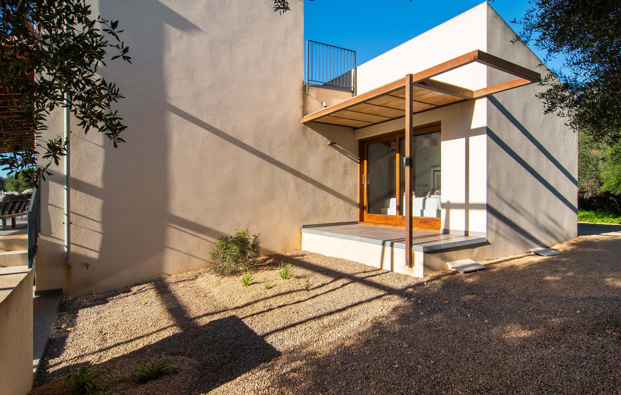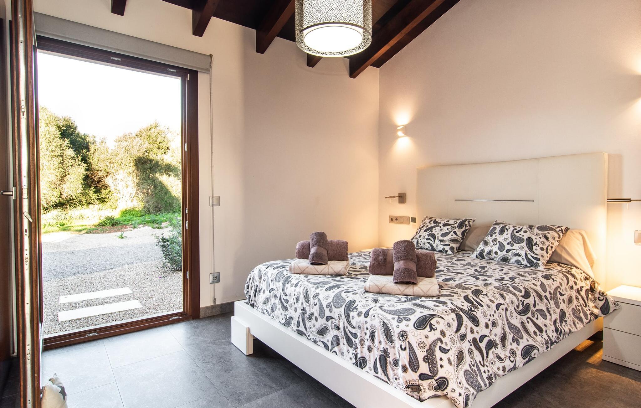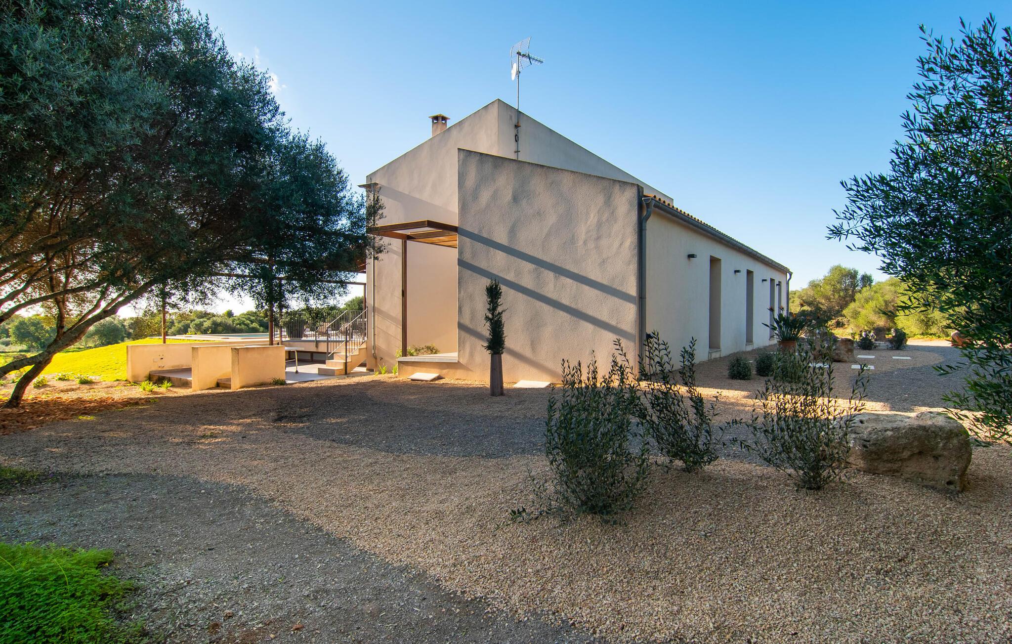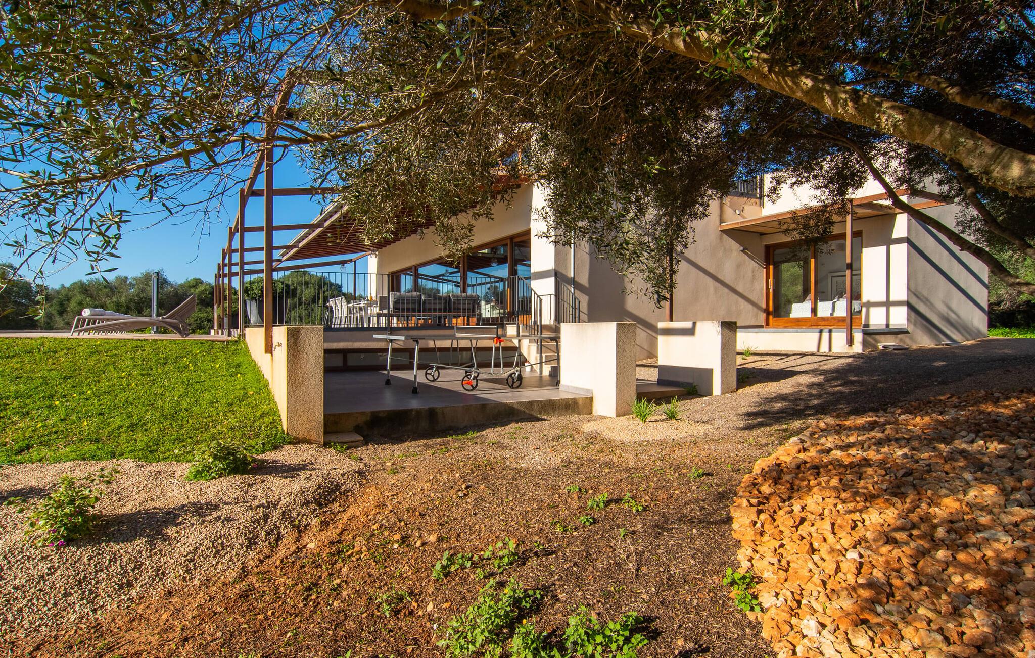 Beliggende i den sydlige del af Mallorca er "Can Maimo Nou" det perfekte valg for enhver, der drømmer om en moderne finca på Mallorca, der tilbyder både komfort og ro. Denne stilfulde bolig ligger på en stor, grøn grund uden direkte naboer, hvilket sikrer et fredeligt tilflugtssted. Fincaen har plads til op til otte gæster. Den rummelige, delvist overdækkede terrasse inviterer til solbadning eller skygge. Poolen, der er synlig fra de komfortable liggestole, er særdeles velegnet til familier med børn. Bordtennisbordet byder på timevis af sjov for gæster i alle aldre. Der er også masser af parkeringspladser til jeres lejebil. Fincaen er i åbent plan, hvor de fleste værelser flyder ind i hinanden, men kan adskilles fra hinanden med skydedøre. Store vinduer tillader middelhavslyset at oversvømme rummet, hvilket skaber en varm og indbydende atmosfære. Boligen er fordelt på to etager, forbundet med en åben trappe. I stueetagen er der opholds- og spisestue, køkken af høj kvalitet, tre soveværelser og to badeværelser, hvoraf det ene har eget bad. På øverste etage, adskilt af et glasgalleri, er der en ekstra soveplads, et skrivebord til feriearbejde og udgang til en lille solrig tagterrasse. Den moderne finca "Can Maimo Nou" er beliggende i en vidunderlig rolig beliggenhed midt i det typiske middelhavslandskab på den sydlige del af øen. For at shoppe, spise ude og slentre gennem smukke smalle gader med talrige kunstgallerier og små butikker er det kun omkring 4,4 km til Santanyí, mens den romantiske bugt Cala Llombards kun er omkring 8,9 km.
