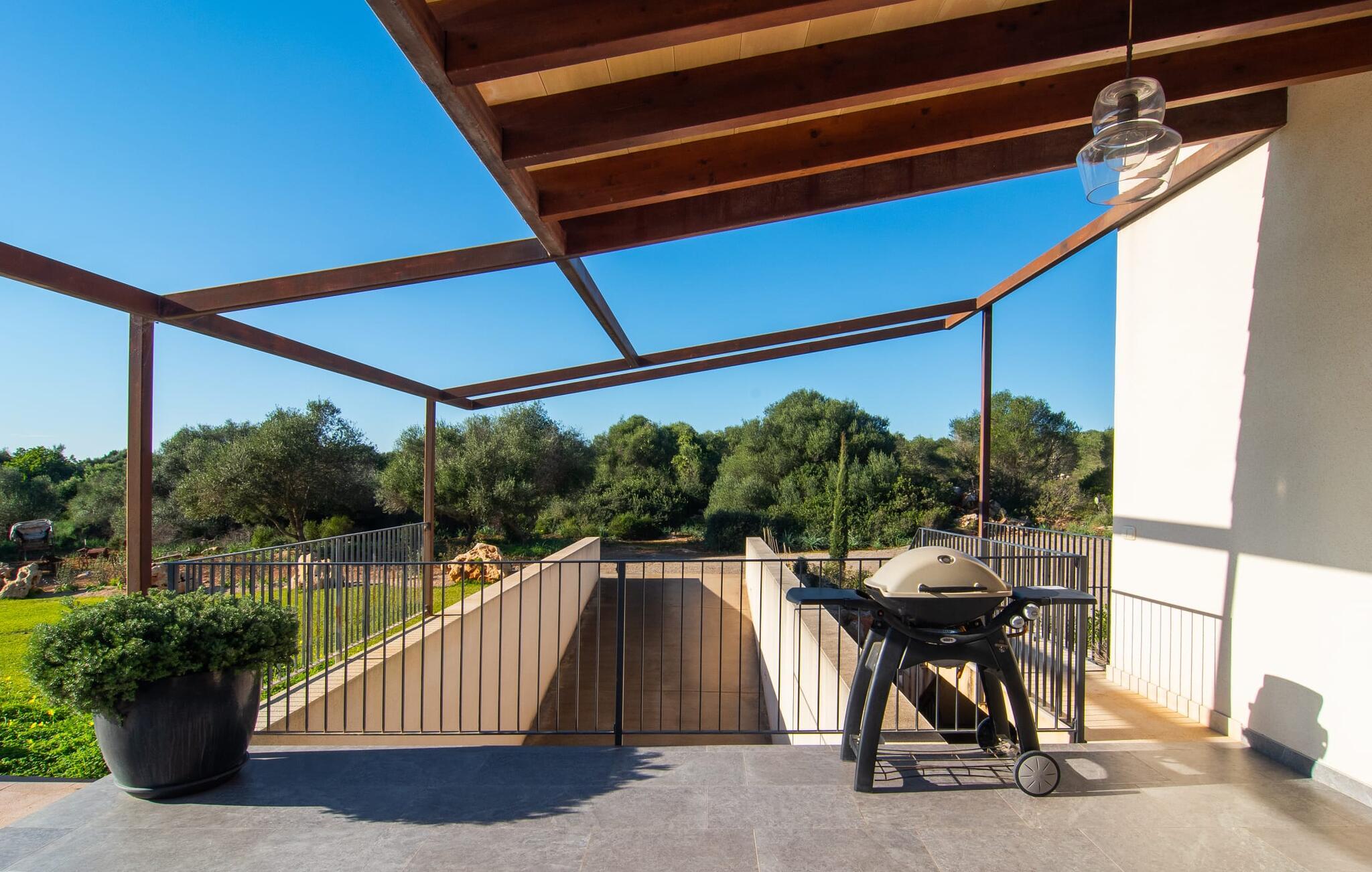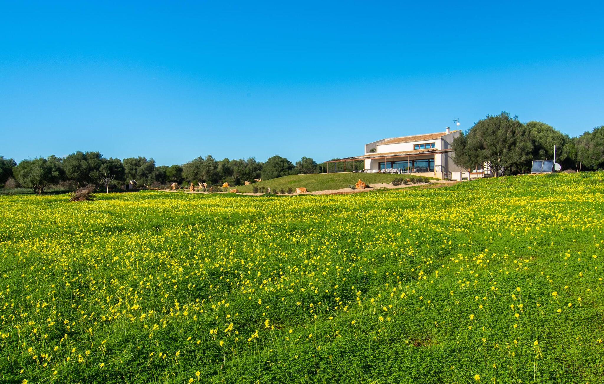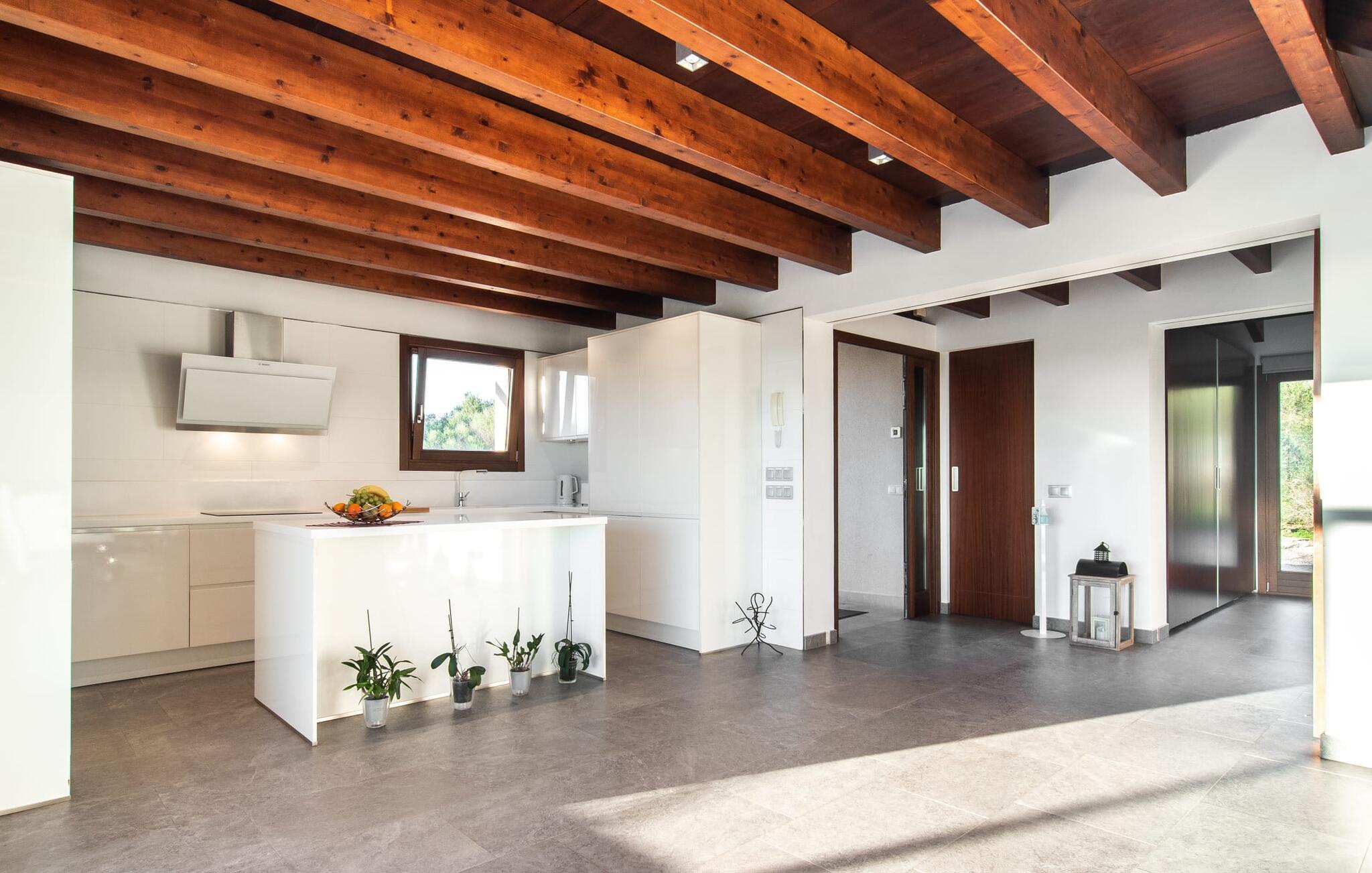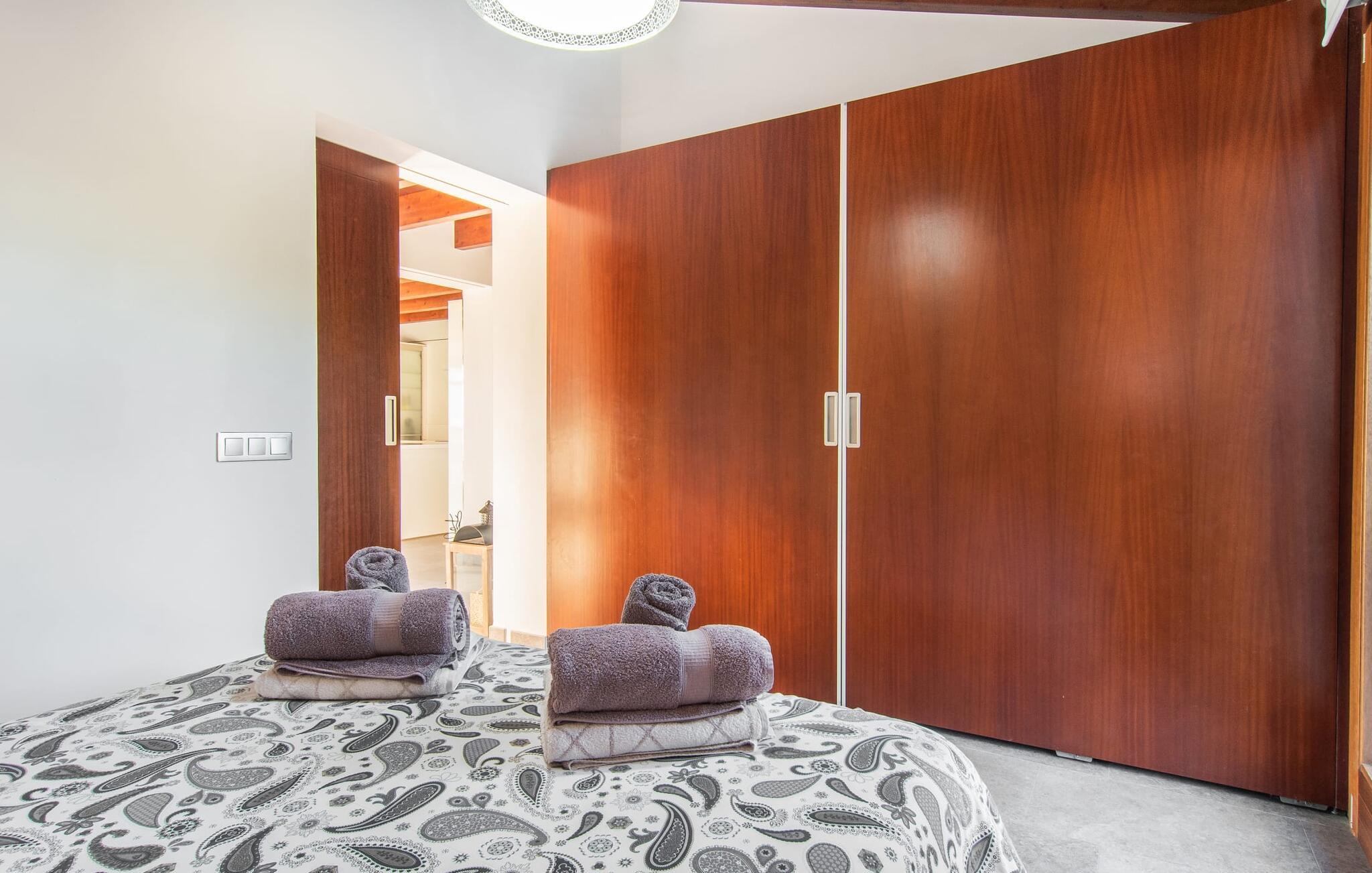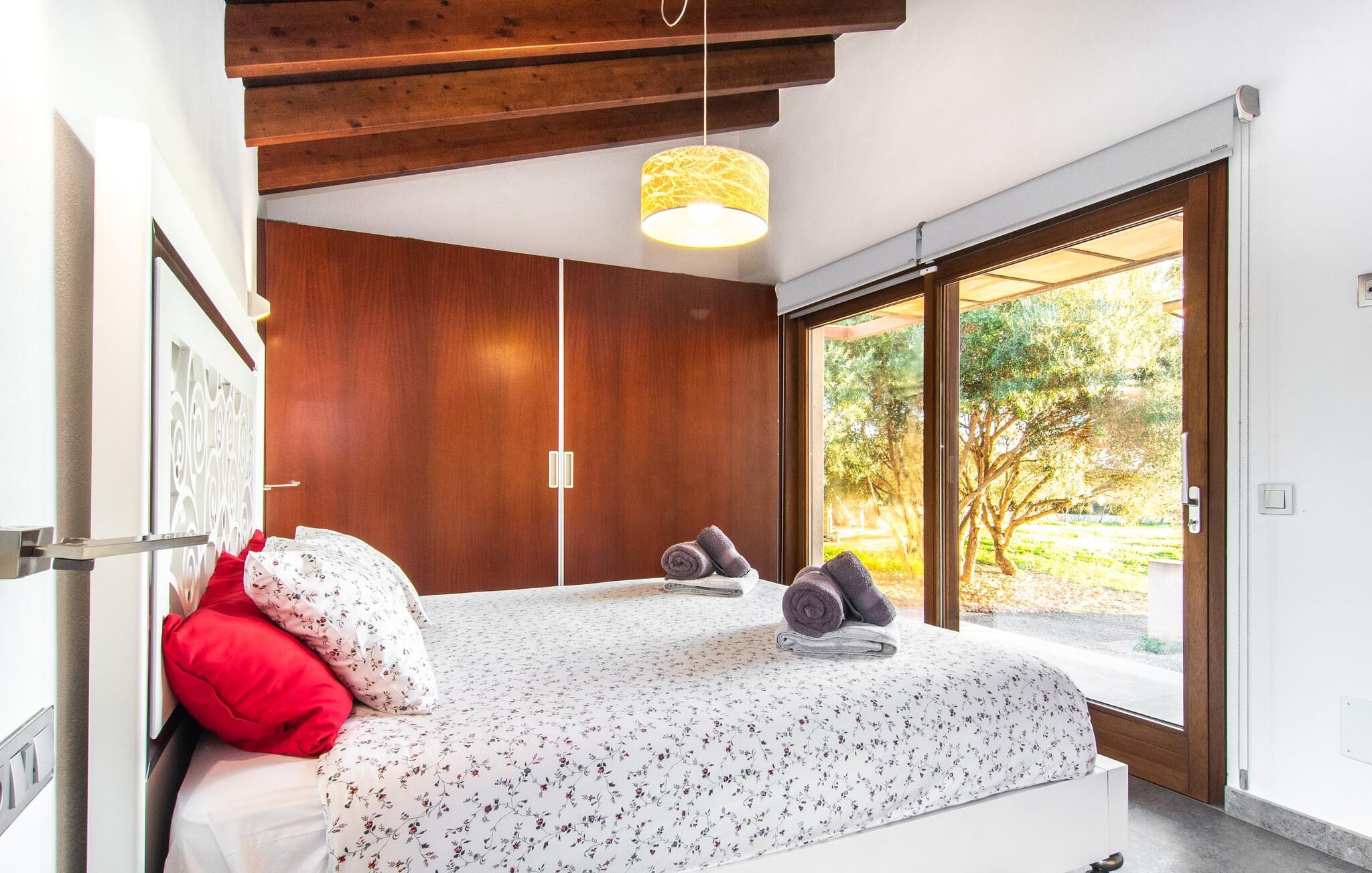 Beliggende i den sydlige del af Mallorca er "Can Maimo Nou" det perfekte valg for enhver, der drømmer om en moderne finca på Mallorca, der tilbyder både komfort og ro. Denne stilfulde bolig ligger på en stor, grøn grund uden direkte naboer, hvilket sikrer et fredeligt tilflugtssted. Fincaen har plads til op til otte gæster. Den rummelige, delvist overdækkede terrasse inviterer til solbadning eller skygge. Poolen, der er synlig fra de komfortable liggestole, er særdeles velegnet til familier med børn. Bordtennisbordet byder på timevis af sjov for gæster i alle aldre. Der er også masser af parkeringspladser til jeres lejebil. Fincaen er i åbent plan, hvor de fleste værelser flyder ind i hinanden, men kan adskilles fra hinanden med skydedøre. Store vinduer tillader middelhavslyset at oversvømme rummet, hvilket skaber en varm og indbydende atmosfære. Boligen er fordelt på to etager, forbundet med en åben trappe. I stueetagen er der opholds- og spisestue, køkken af høj kvalitet, tre soveværelser og to badeværelser, hvoraf det ene har eget bad. På øverste etage, adskilt af et glasgalleri, er der en ekstra soveplads, et skrivebord til feriearbejde og udgang til en lille solrig tagterrasse. Den moderne finca "Can Maimo Nou" er beliggende i en vidunderlig rolig beliggenhed midt i det typiske middelhavslandskab på den sydlige del af øen. For at shoppe, spise ude og slentre gennem smukke smalle gader med talrige kunstgallerier og små butikker er det kun omkring 4,4 km til Santanyí, mens den romantiske bugt Cala Llombards kun er omkring 8,9 km.