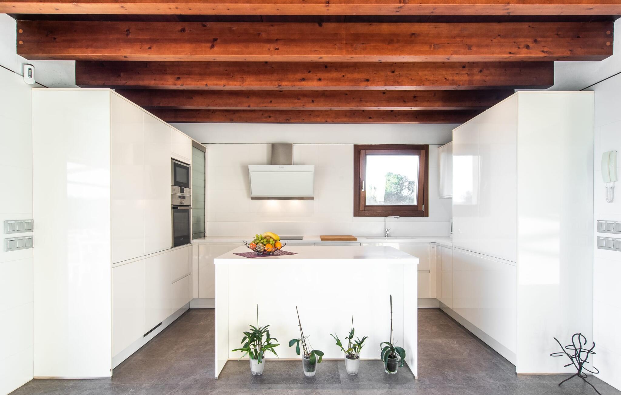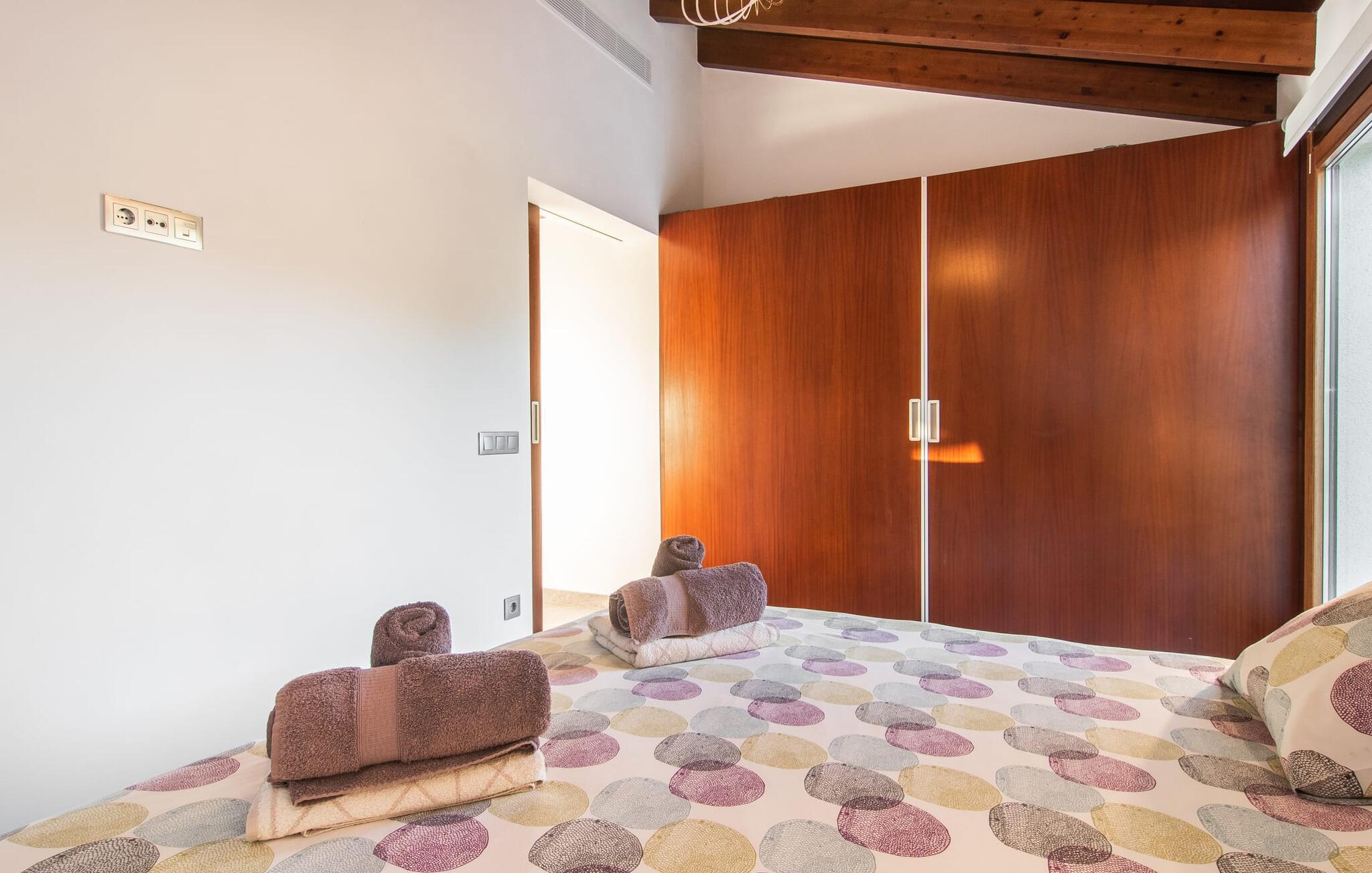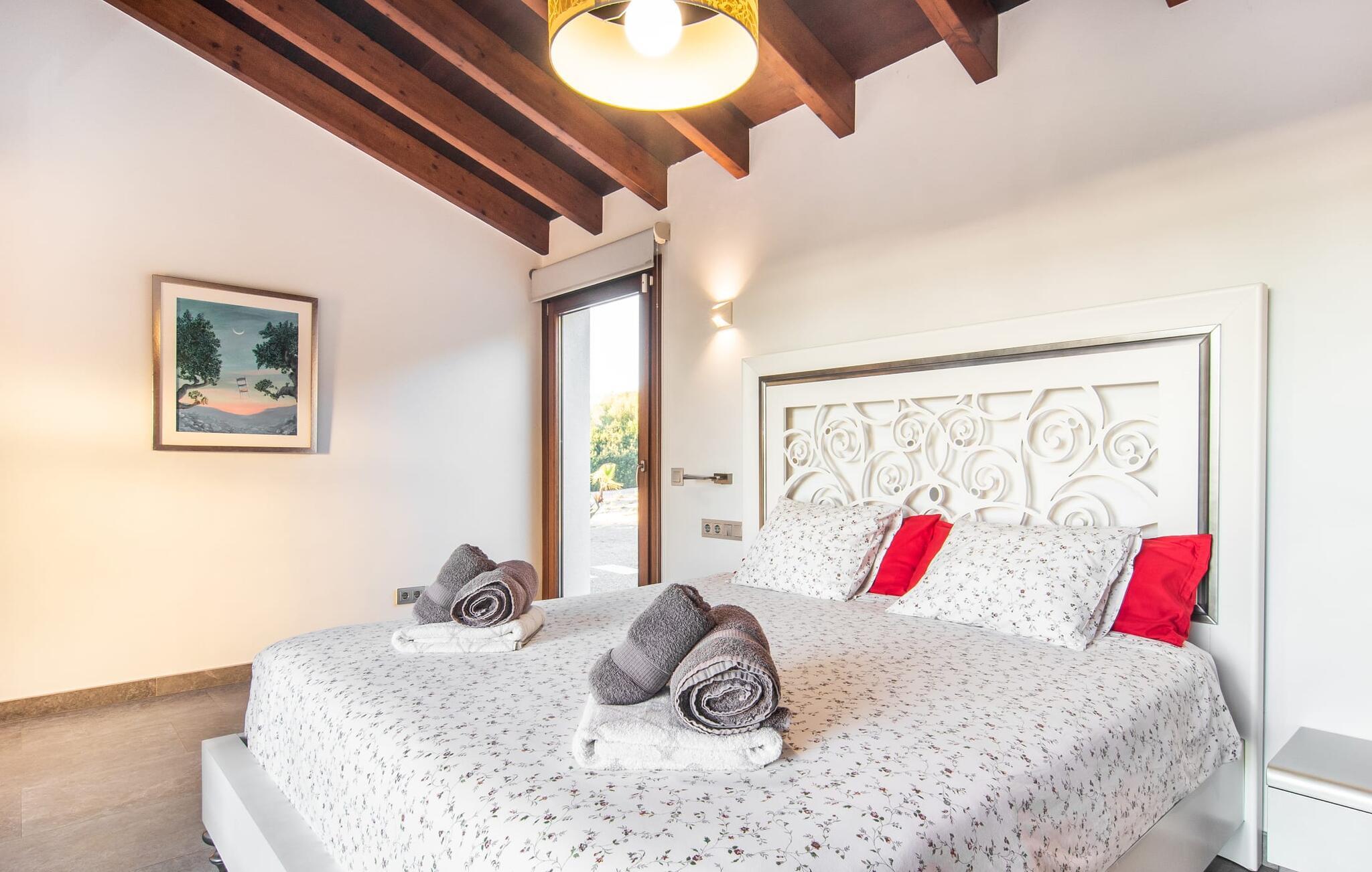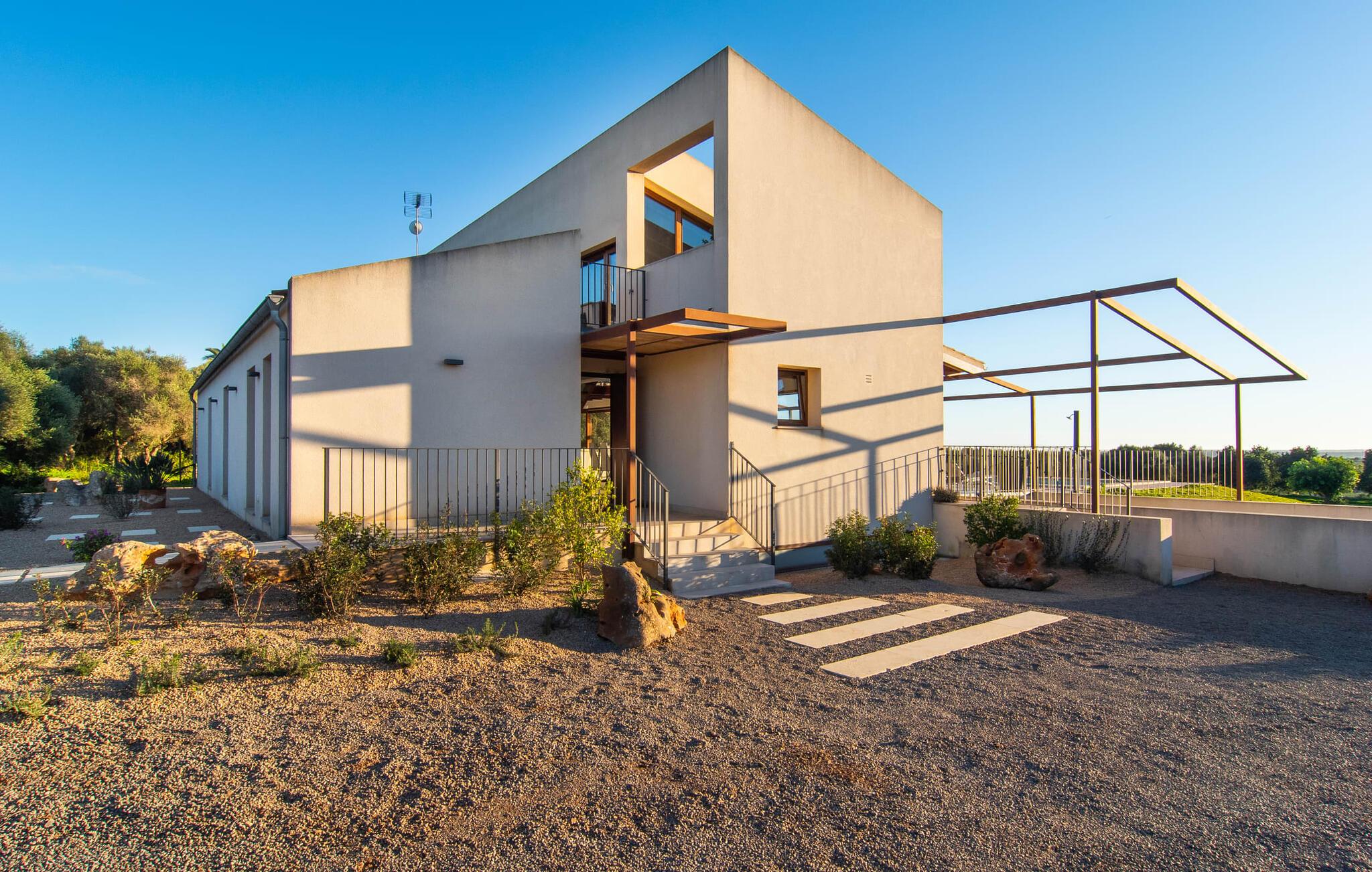 Beliggende i den sydlige del af Mallorca er "Can Maimo Nou" det perfekte valg for enhver, der drømmer om en moderne finca på Mallorca, der tilbyder både komfort og ro. Denne stilfulde bolig ligger på en stor, grøn grund uden direkte naboer, hvilket sikrer et fredeligt tilflugtssted. Fincaen har plads til op til otte gæster. Den rummelige, delvist overdækkede terrasse inviterer til solbadning eller skygge. Poolen, der er synlig fra de komfortable liggestole, er særdeles velegnet til familier med børn. Bordtennisbordet byder på timevis af sjov for gæster i alle aldre. Der er også masser af parkeringspladser til jeres lejebil. Fincaen er i åbent plan, hvor de fleste værelser flyder ind i hinanden, men kan adskilles fra hinanden med skydedøre. Store vinduer tillader middelhavslyset at oversvømme rummet, hvilket skaber en varm og indbydende atmosfære. Boligen er fordelt på to etager, forbundet med en åben trappe. I stueetagen er der opholds- og spisestue, køkken af høj kvalitet, tre soveværelser og to badeværelser, hvoraf det ene har eget bad. På øverste etage, adskilt af et glasgalleri, er der en ekstra soveplads, et skrivebord til feriearbejde og udgang til en lille solrig tagterrasse. Den moderne finca "Can Maimo Nou" er beliggende i en vidunderlig rolig beliggenhed midt i det typiske middelhavslandskab på den sydlige del af øen. For at shoppe, spise ude og slentre gennem smukke smalle gader med talrige kunstgallerier og små butikker er det kun omkring 4,4 km til Santanyí, mens den romantiske bugt Cala Llombards kun er omkring 8,9 km.