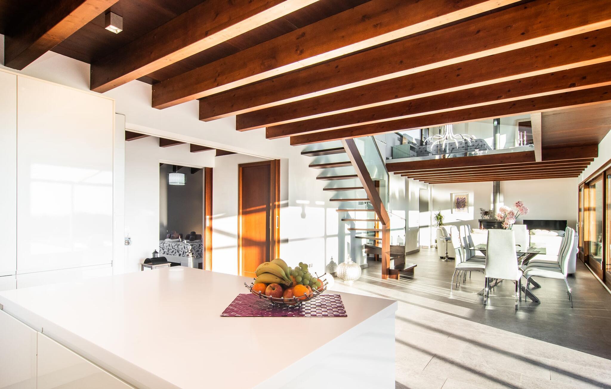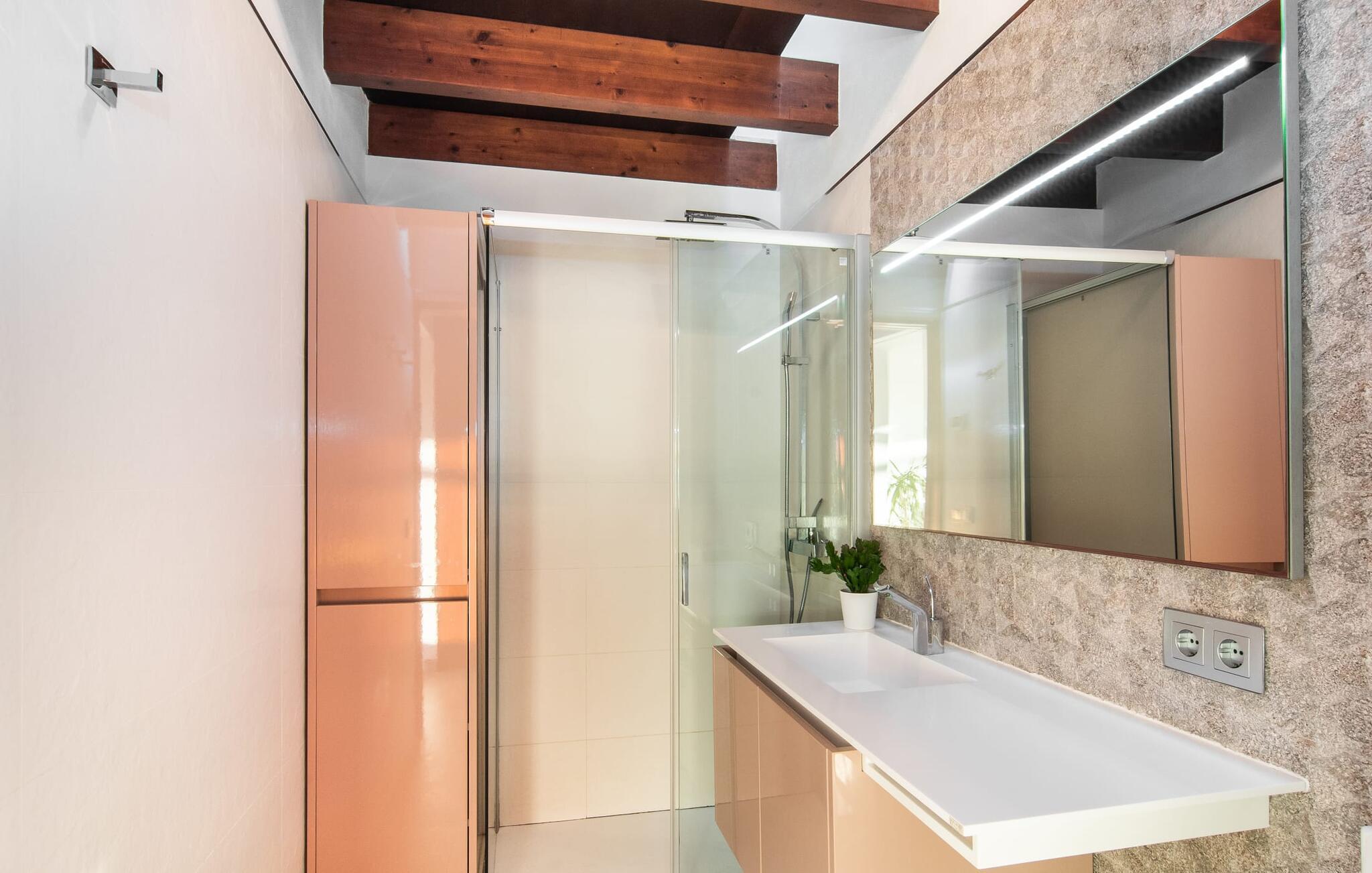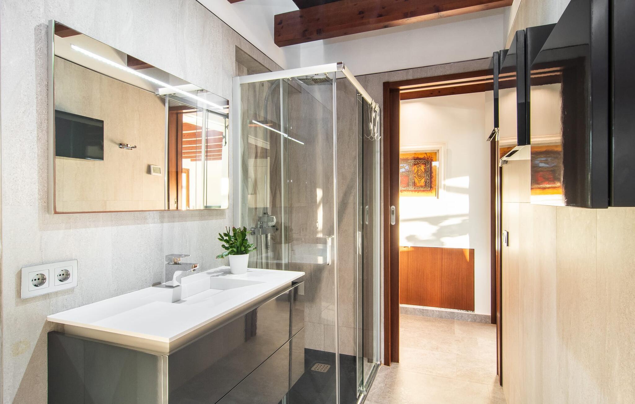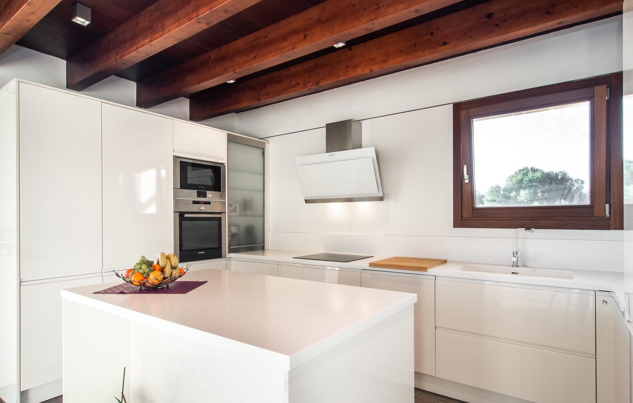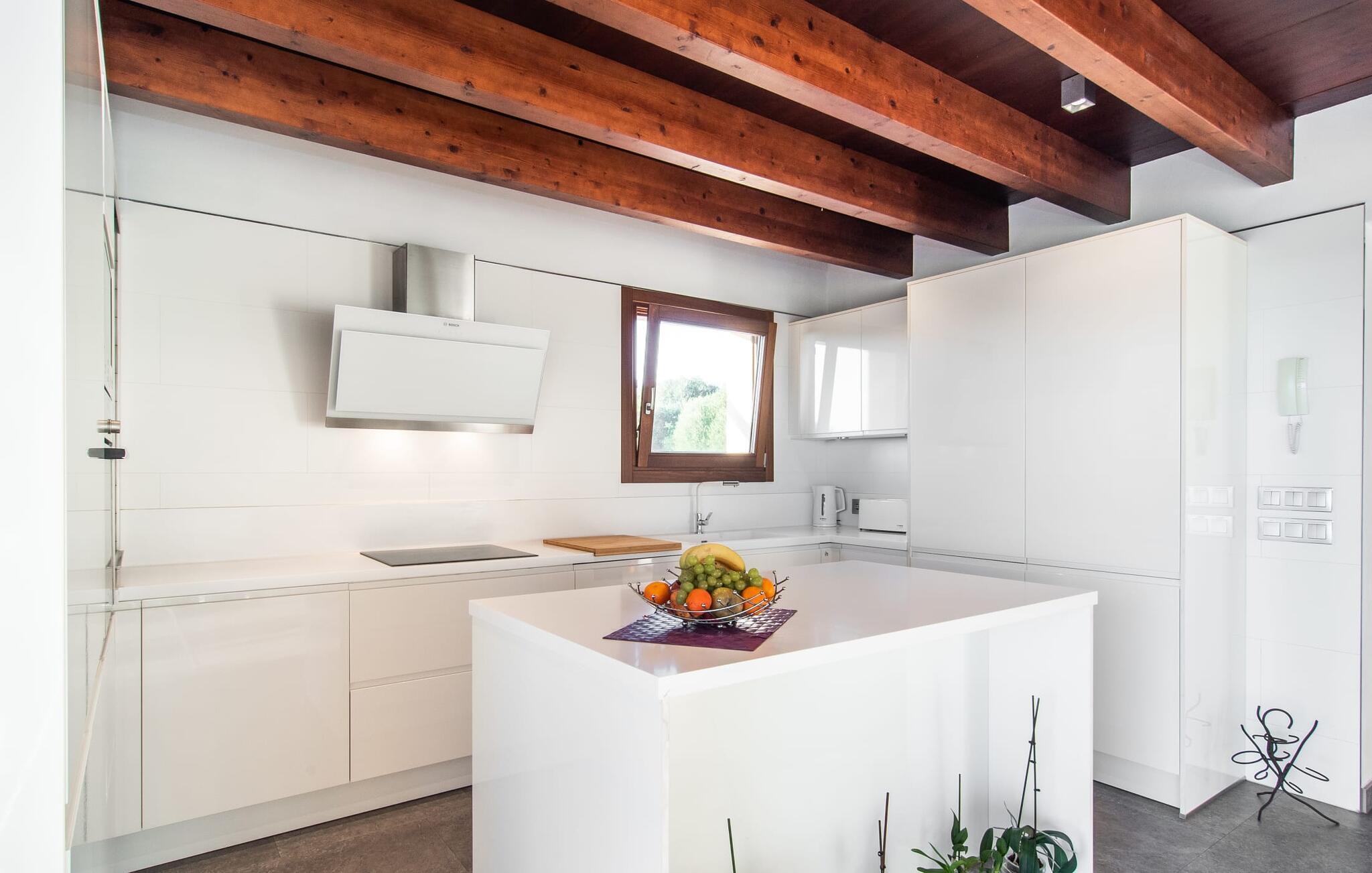 Beliggende i den sydlige del af Mallorca er "Can Maimo Nou" det perfekte valg for enhver, der drømmer om en moderne finca på Mallorca, der tilbyder både komfort og ro. Denne stilfulde bolig ligger på en stor, grøn grund uden direkte naboer, hvilket sikrer et fredeligt tilflugtssted. Fincaen har plads til op til otte gæster. Den rummelige, delvist overdækkede terrasse inviterer til solbadning eller skygge. Poolen, der er synlig fra de komfortable liggestole, er særdeles velegnet til familier med børn. Bordtennisbordet byder på timevis af sjov for gæster i alle aldre. Der er også masser af parkeringspladser til jeres lejebil. Fincaen er i åbent plan, hvor de fleste værelser flyder ind i hinanden, men kan adskilles fra hinanden med skydedøre. Store vinduer tillader middelhavslyset at oversvømme rummet, hvilket skaber en varm og indbydende atmosfære. Boligen er fordelt på to etager, forbundet med en åben trappe. I stueetagen er der opholds- og spisestue, køkken af høj kvalitet, tre soveværelser og to badeværelser, hvoraf det ene har eget bad. På øverste etage, adskilt af et glasgalleri, er der en ekstra soveplads, et skrivebord til feriearbejde og udgang til en lille solrig tagterrasse. Den moderne finca "Can Maimo Nou" er beliggende i en vidunderlig rolig beliggenhed midt i det typiske middelhavslandskab på den sydlige del af øen. For at shoppe, spise ude og slentre gennem smukke smalle gader med talrige kunstgallerier og små butikker er det kun omkring 4,4 km til Santanyí, mens den romantiske bugt Cala Llombards kun er omkring 8,9 km.