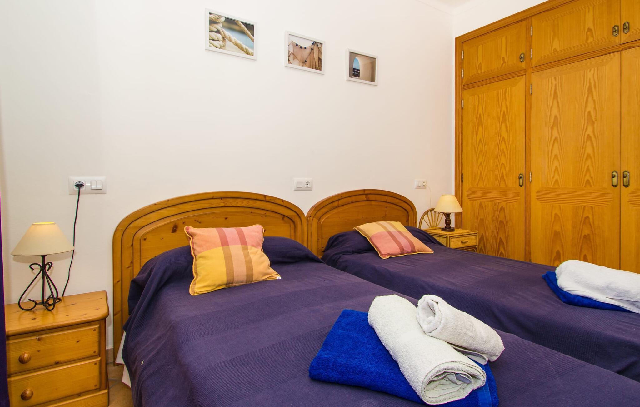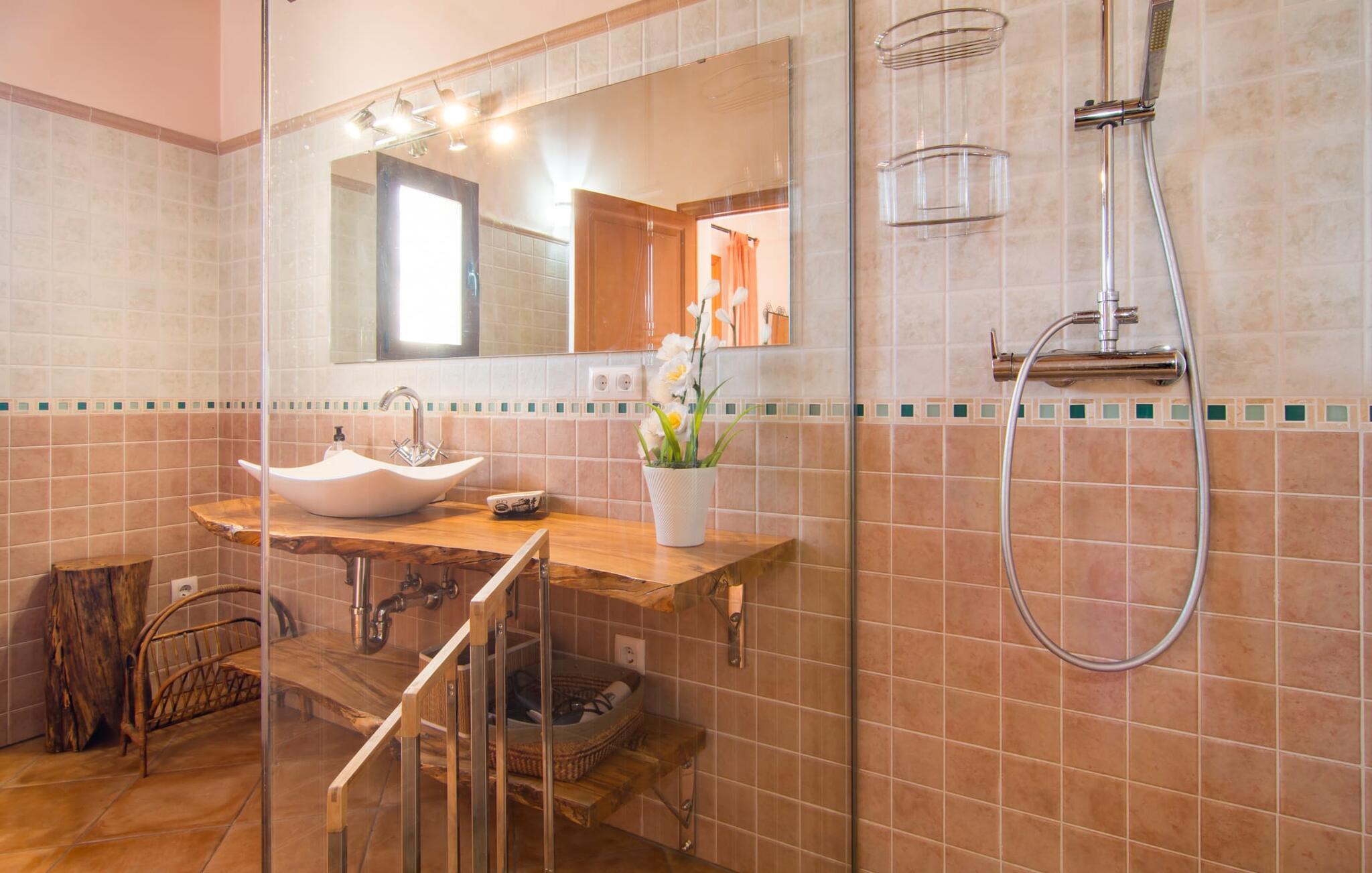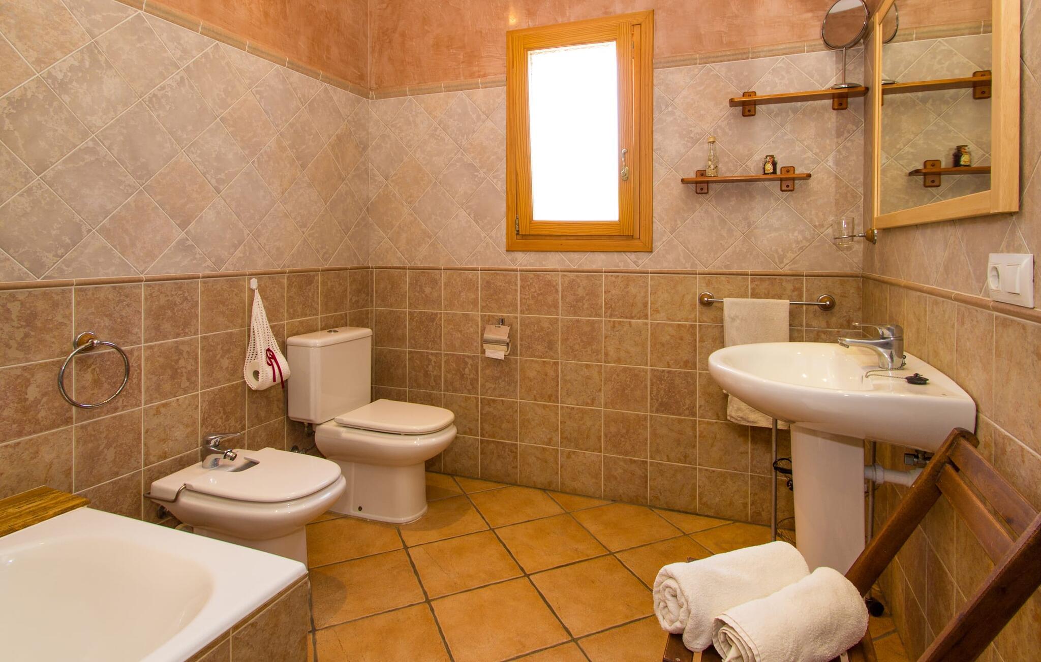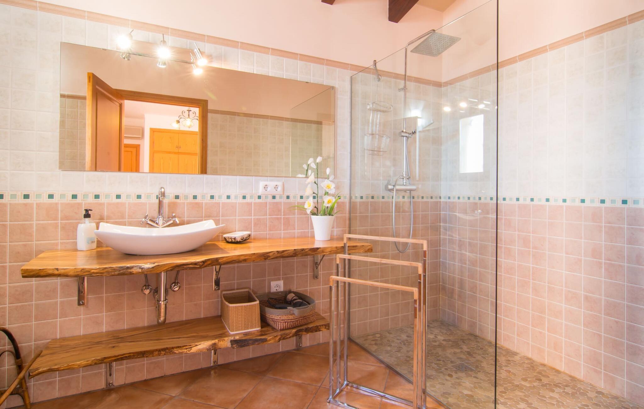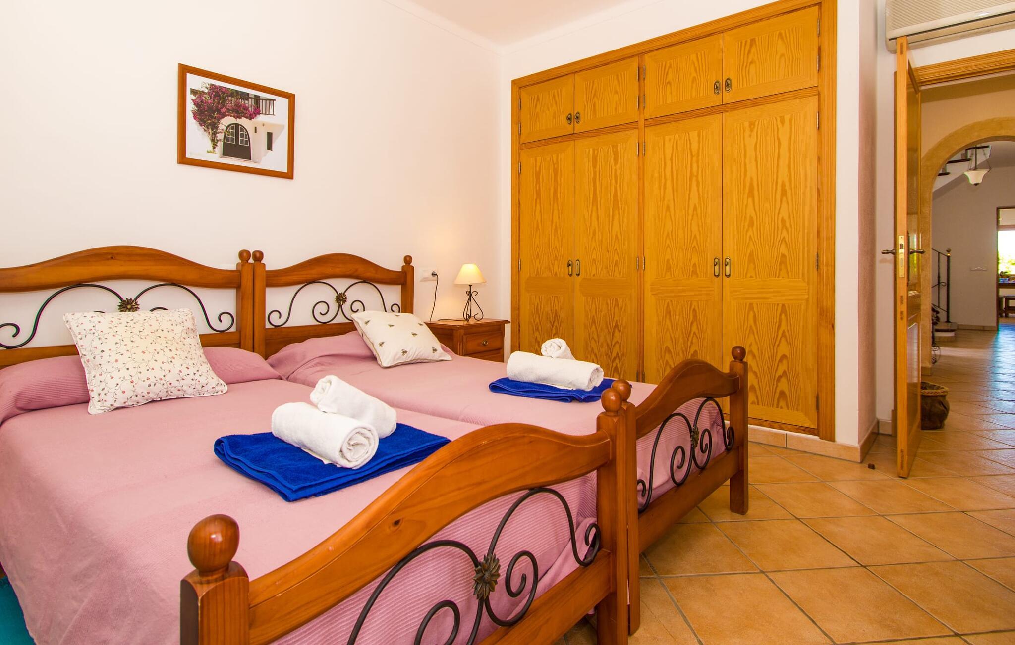 Villa "Can Marines" tilbyder den perfekte blanding af privatliv og bekvemmelighed, beliggende i en smuk grund med nem adgang til nærliggende faciliteter. Ejendommen har middelhavsflora, herunder mandeltræer, hvilket skaber et roligt udendørsområde. De omfattende terrasser tilbyder en betagende havudsigt, herunder et glimt af Portocolom fyrtårn. Poolen, med sin trappeindgang i romersk stil, er perfekt til at slappe af og nyde solen. Indvendigt har villaen med aircondition et typisk spansk design og en varm, indbydende atmosfære med fire soveværelser med dobbeltsenge, tre badeværelser (et en-suite) og en rummelig stue/spisestue med pejs. Det fuldt udstyrede køkken og et lille fitnesscenter i kælderen giver ekstra komfort. Fincaen "Can Marines" ligger på landet lige uden for S'Horta på den sydlige del af øen. Bare to minutters kørsel eller gå ind i landsbyen med et lille supermarked, restauranter og caféer, eller gå, hvis I foretrækker det. Santanyí med sit marked hver onsdag og lørdag er omkring 10 km væk. De nærmeste strande ligger kun 5 km væk, herunder Cala Sa Nau og Cala d'Or. Aircondition i denne ejendom er inkluderet i 12 timer om dagen med rimelig brug. I det sjældne tilfælde, at denne grænse overskrides, vil I blive opkrævet kontant på stedet. Bemærk venligst, at denne ejendom ikke accepterer ungdomsgrupper eller polterabender. En ungdomsgruppe på denne ejendom består af personer under 25 år. Book ikke denne ejendom, hvis I er en ungdomsgruppe eller polterabend, da jeres reservation vil blive afvist, når den er booket, hvilket kan være ved ankomsten til ejendommen eller under jeres ophold, og I vil ikke modtage en refusion.