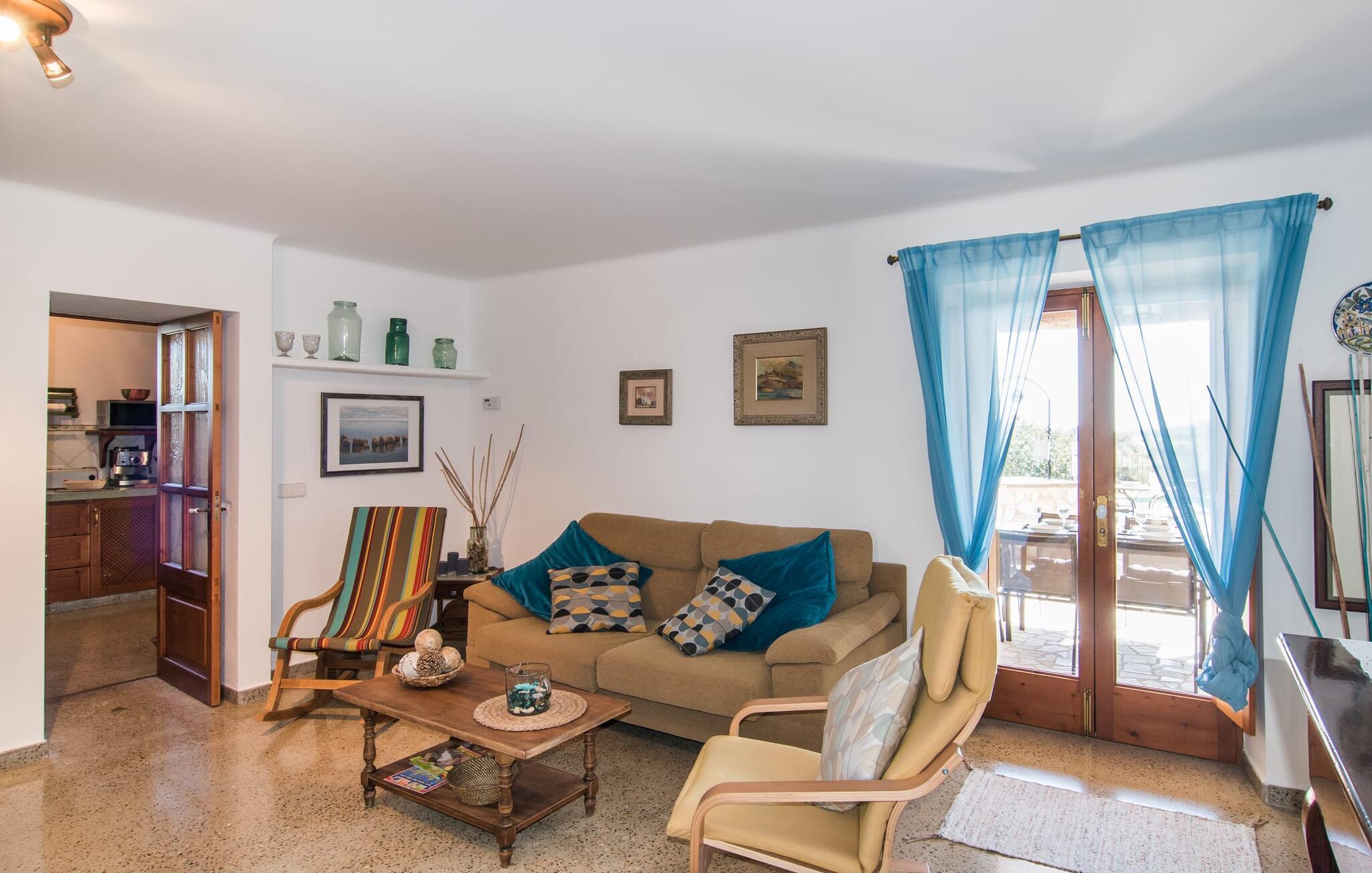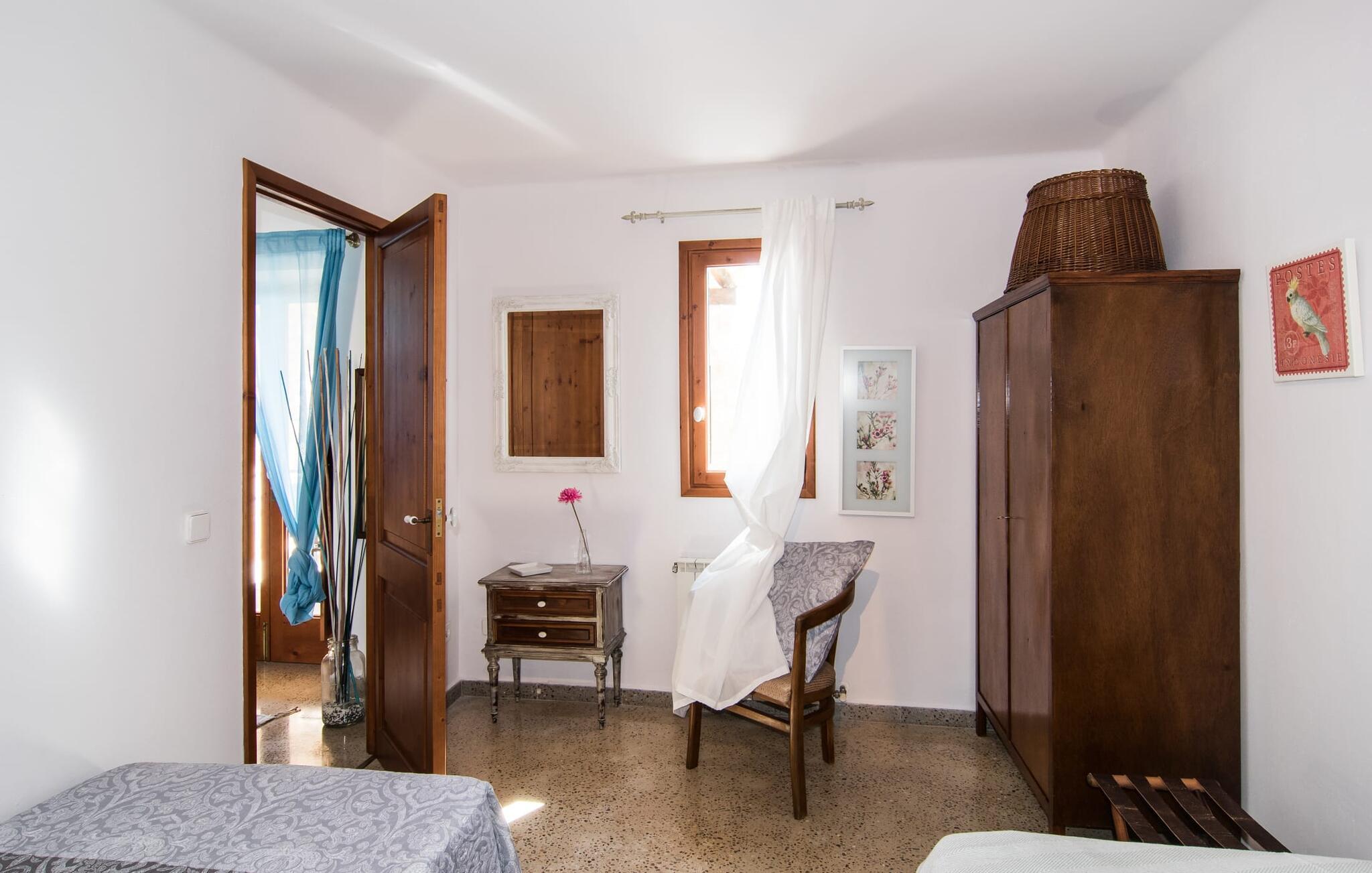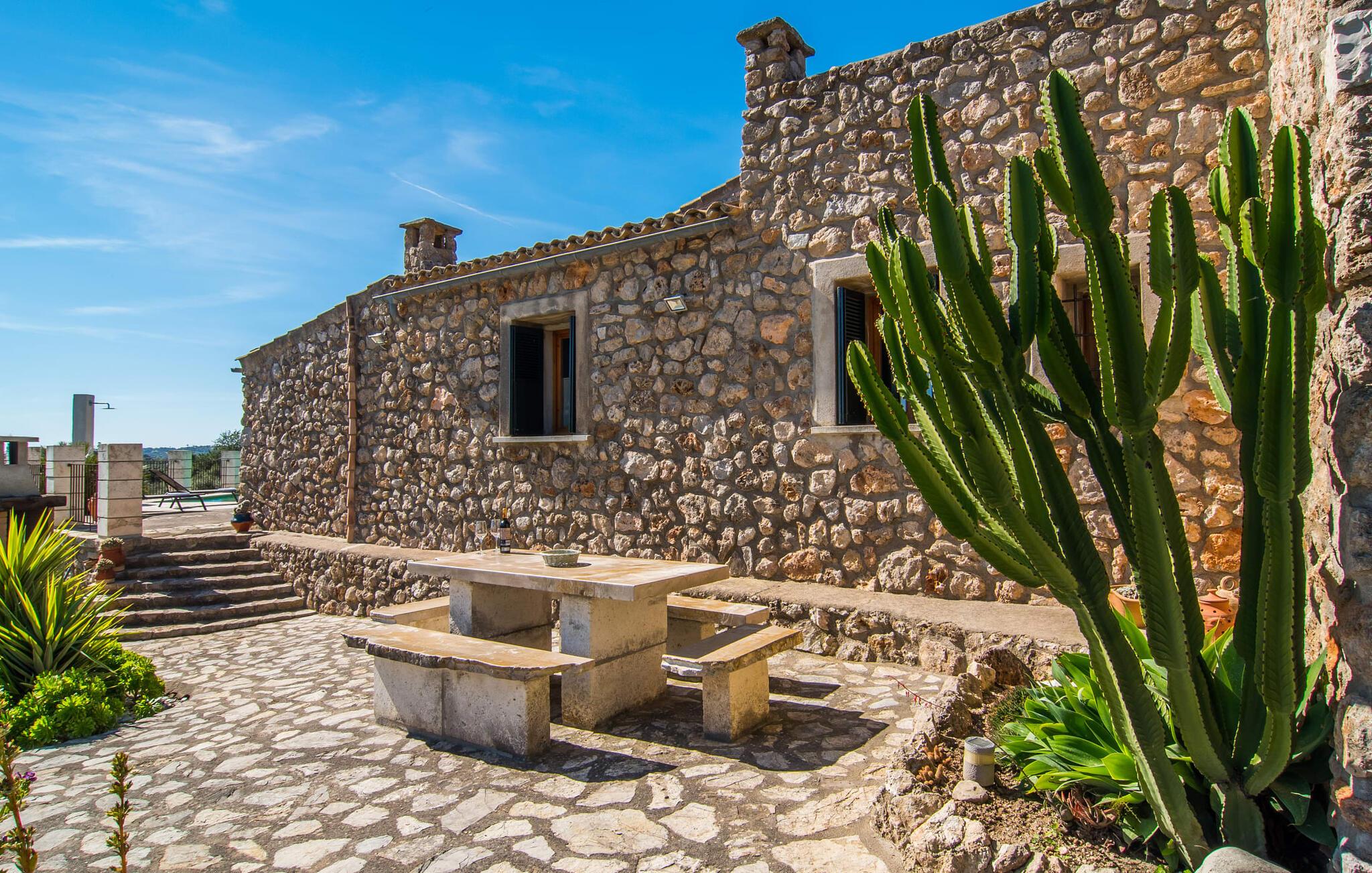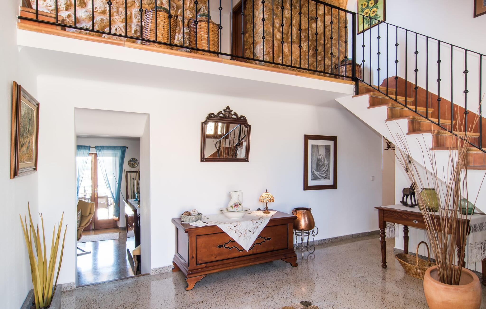 Villa "Can Matxet" er et perfekt eksempel på et mallorcansk feriehus, der kombinerer autentisk charme med moderne komfort. Villaen ligger på en let skrånende grund omgivet af en lav bakke og byder på en fantastisk udsigt fra adskillige udendørs siddepladser. Haven med mandel-, oliven- og citrustræer blander sig problemfrit ind i det naturlige landskab, selv inden for stenmuren. Slående sofaborde og robuste stenbænke er spredt ud over de solbeskinnede terrasser, mens liggestole i aluminium er det perfekte sted at slappe af efter en svømmetur i den azurblå pool. To cardio-maskiner er tilgængelige for fitness-entusiaster. Nyd grillet mad ved det moderne spisebord under den overdækkede terrasse. Tagterrassen byder på en uforglemmelig udsigt over landskabet, perfekt til stjernekiggeri, mens I lytter til de beroligende lyde fra græshopperne og mærker den varme brise. Indenfor fortsætter villaen med at imponere med sin blanding af lyse gulve, synlige murværker og træelementer. De rummelige opholds- og spiseområder suppleres af et separat køkken med kaffebrune møbler. Tre dobbeltværelser deler to stilfulde badeværelser, hvoraf det ene har badekar. Den øverste etage byder på endnu et rum, der er ideelt som lounge eller kontor. Villaen er beliggende i den rolige østlige del af øen i det blidt bølgende landskab omkring Sant Llorenc. Middelalderbyen Artà med sit landmandsmarked om tirsdagen og Manacor, Mallorcas næststørste by, er gode til shopping og ligger kun en kort køretur væk. Smukke sandstrande som Cala Marcal eller smukke naturlige strande som Cala Varques er kun 15 km væk.