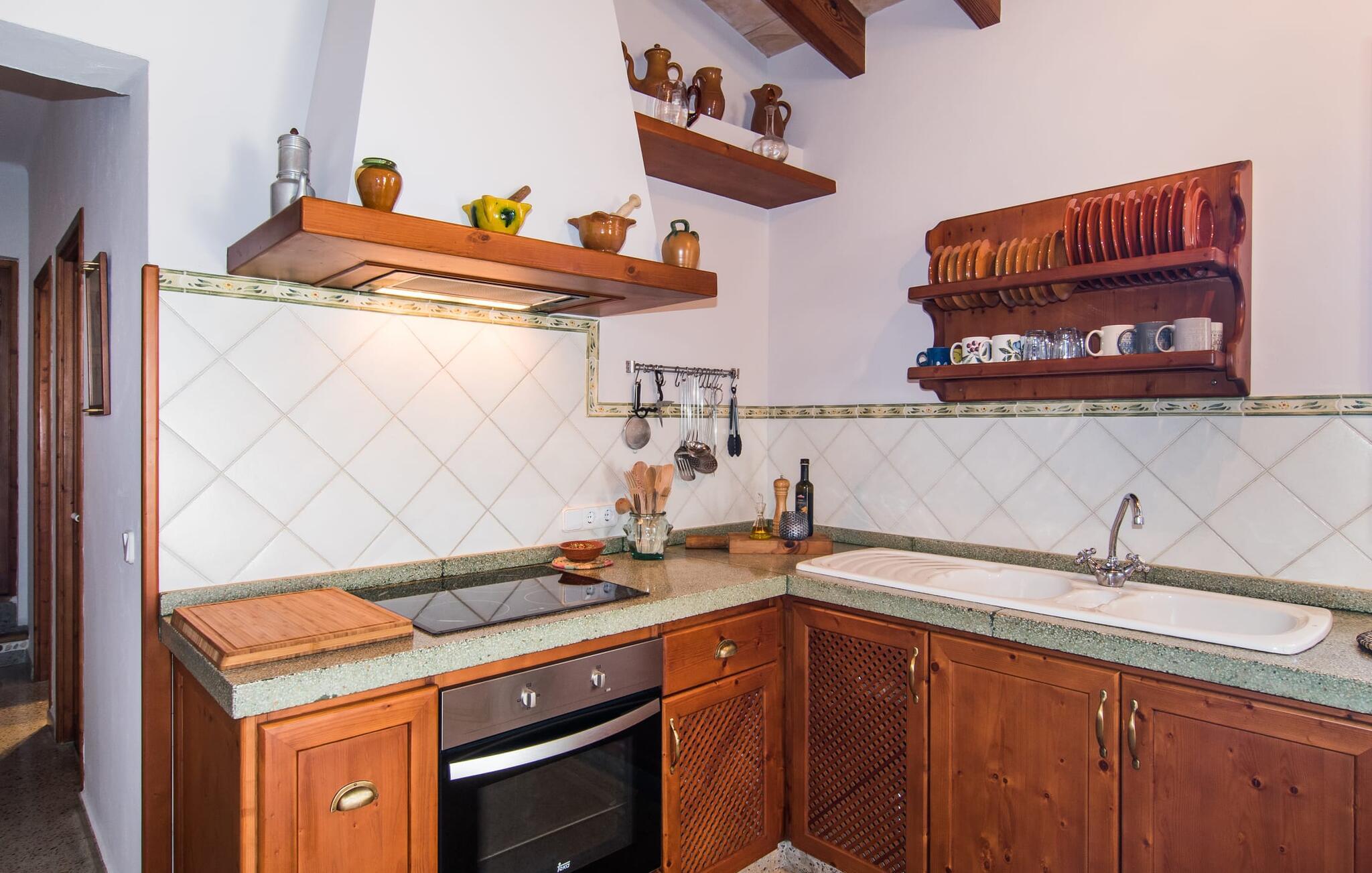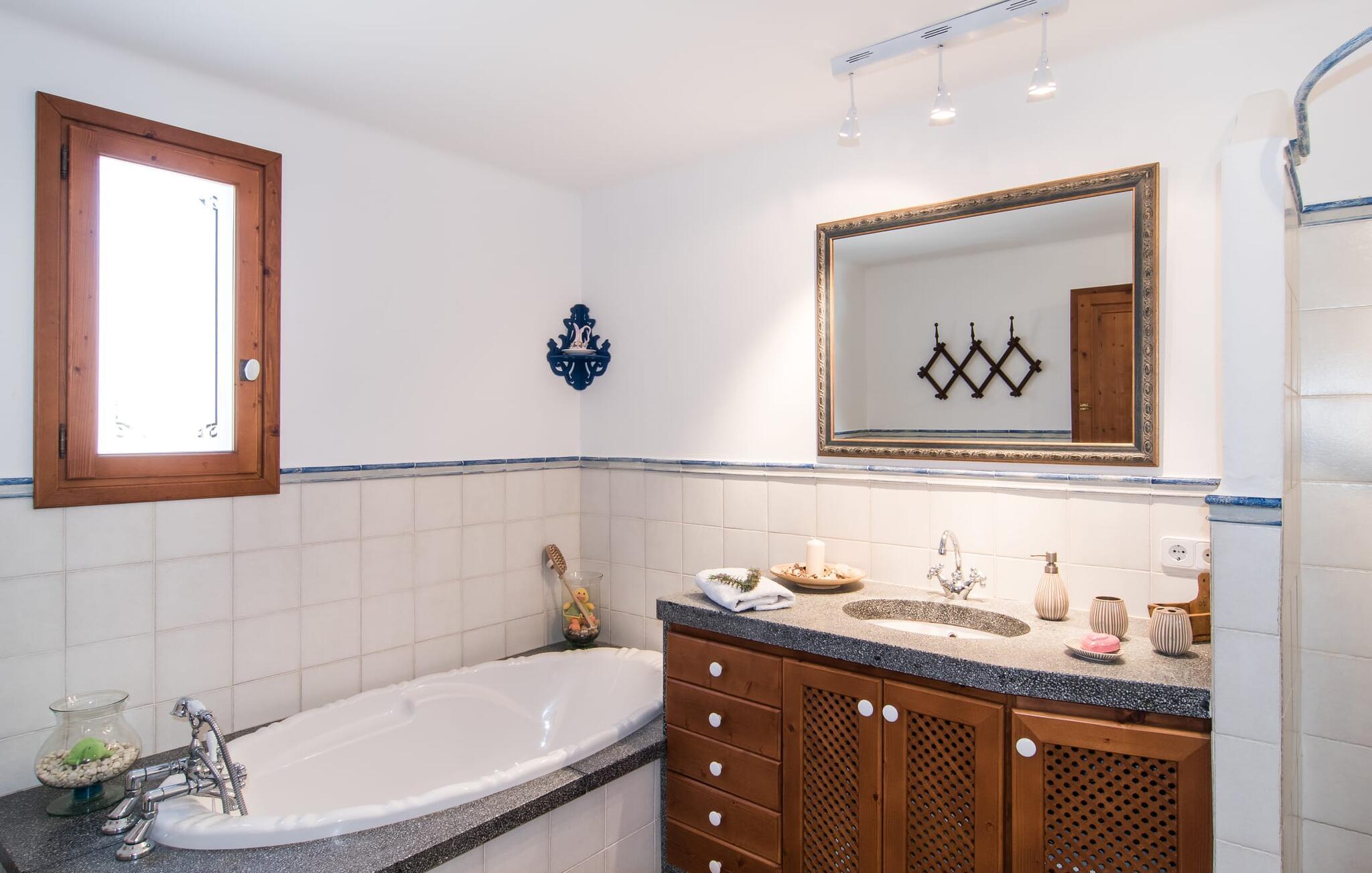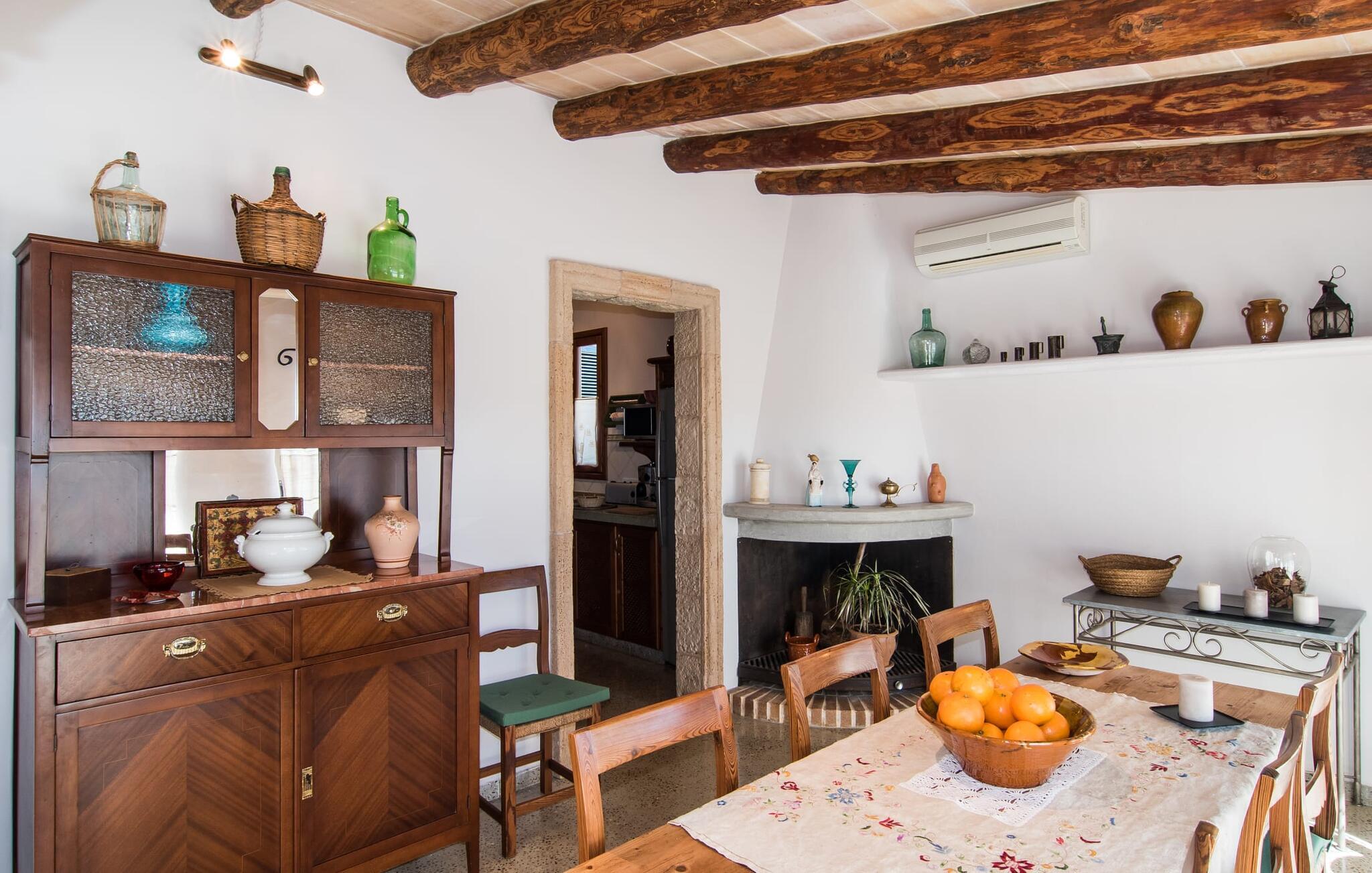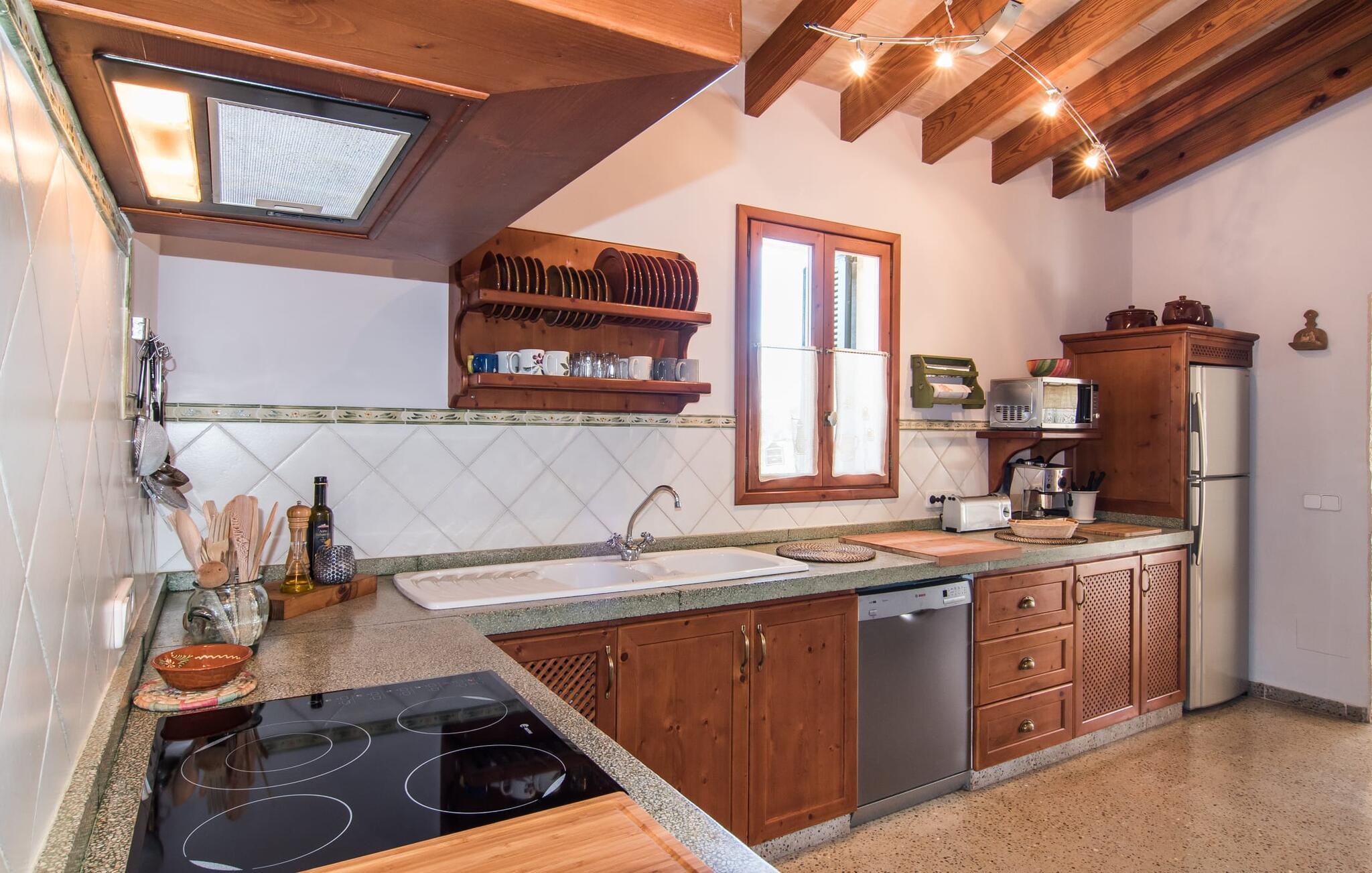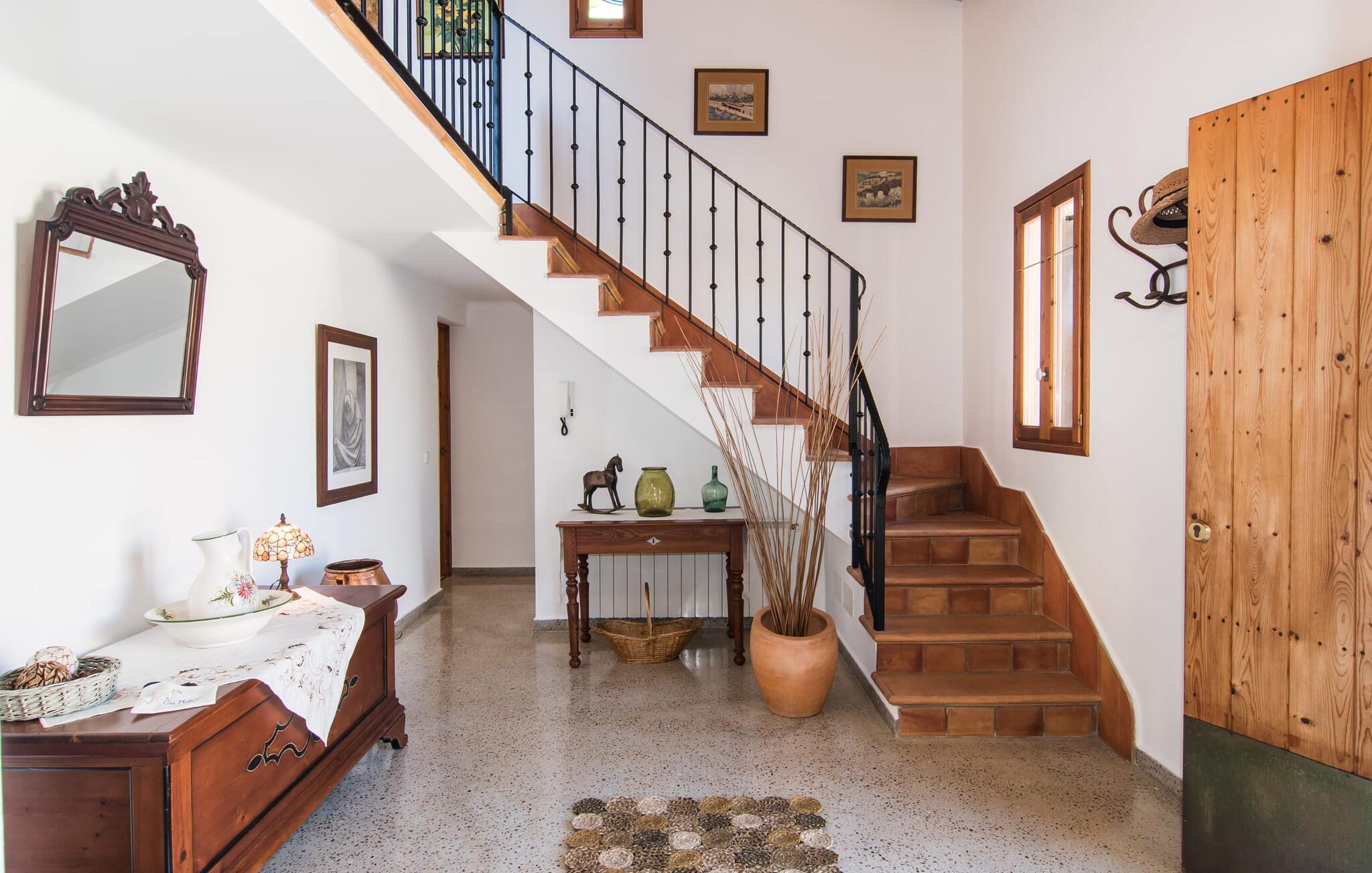 Villa "Can Matxet" er et perfekt eksempel på et mallorcansk feriehus, der kombinerer autentisk charme med moderne komfort. Villaen ligger på en let skrånende grund omgivet af en lav bakke og byder på en fantastisk udsigt fra adskillige udendørs siddepladser. Haven med mandel-, oliven- og citrustræer blander sig problemfrit ind i det naturlige landskab, selv inden for stenmuren. Slående sofaborde og robuste stenbænke er spredt ud over de solbeskinnede terrasser, mens liggestole i aluminium er det perfekte sted at slappe af efter en svømmetur i den azurblå pool. To cardio-maskiner er tilgængelige for fitness-entusiaster. Nyd grillet mad ved det moderne spisebord under den overdækkede terrasse. Tagterrassen byder på en uforglemmelig udsigt over landskabet, perfekt til stjernekiggeri, mens I lytter til de beroligende lyde fra græshopperne og mærker den varme brise. Indenfor fortsætter villaen med at imponere med sin blanding af lyse gulve, synlige murværker og træelementer. De rummelige opholds- og spiseområder suppleres af et separat køkken med kaffebrune møbler. Tre dobbeltværelser deler to stilfulde badeværelser, hvoraf det ene har badekar. Den øverste etage byder på endnu et rum, der er ideelt som lounge eller kontor. Villaen er beliggende i den rolige østlige del af øen i det blidt bølgende landskab omkring Sant Llorenc. Middelalderbyen Artà med sit landmandsmarked om tirsdagen og Manacor, Mallorcas næststørste by, er gode til shopping og ligger kun en kort køretur væk. Smukke sandstrande som Cala Marcal eller smukke naturlige strande som Cala Varques er kun 15 km væk.