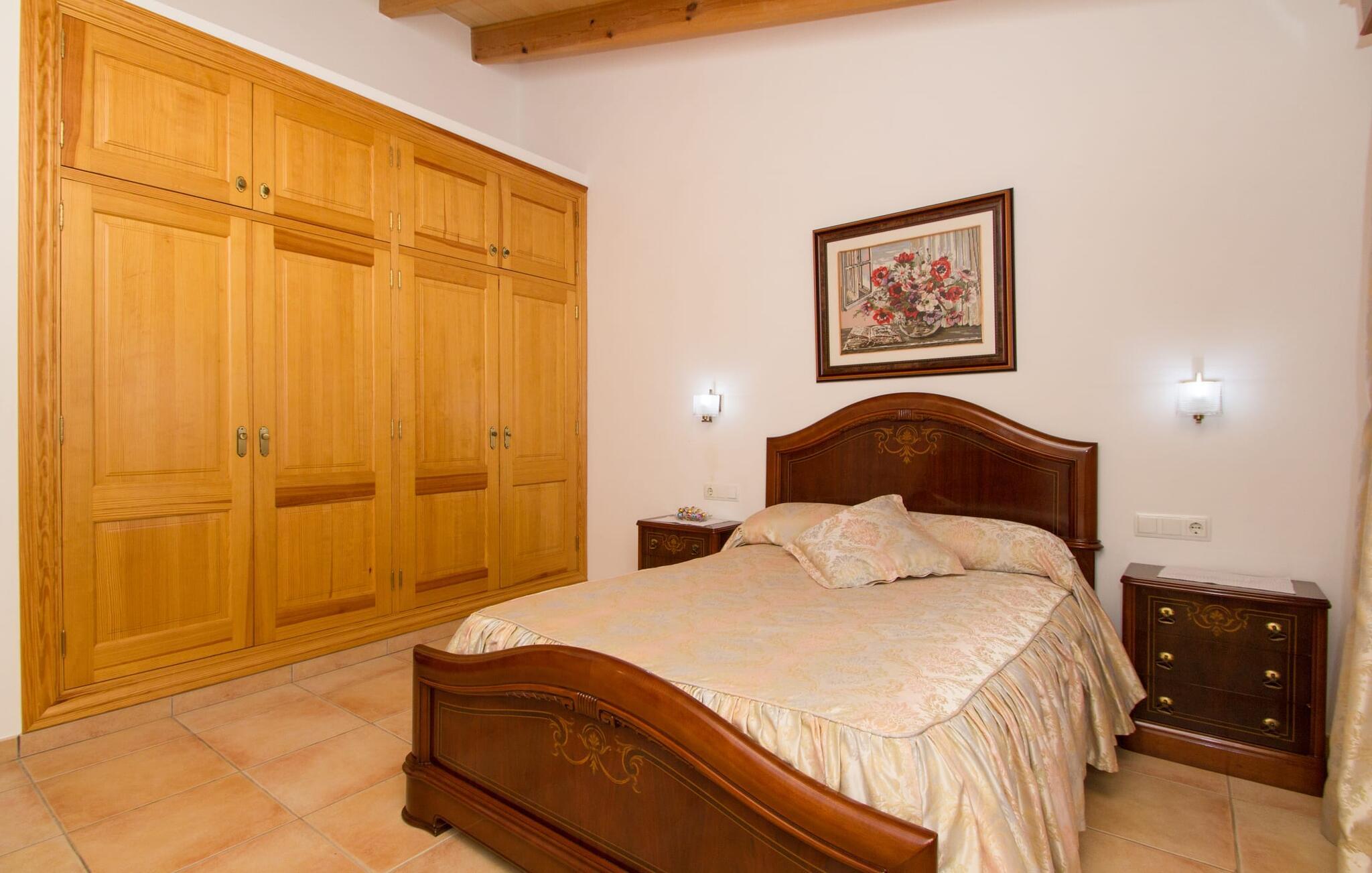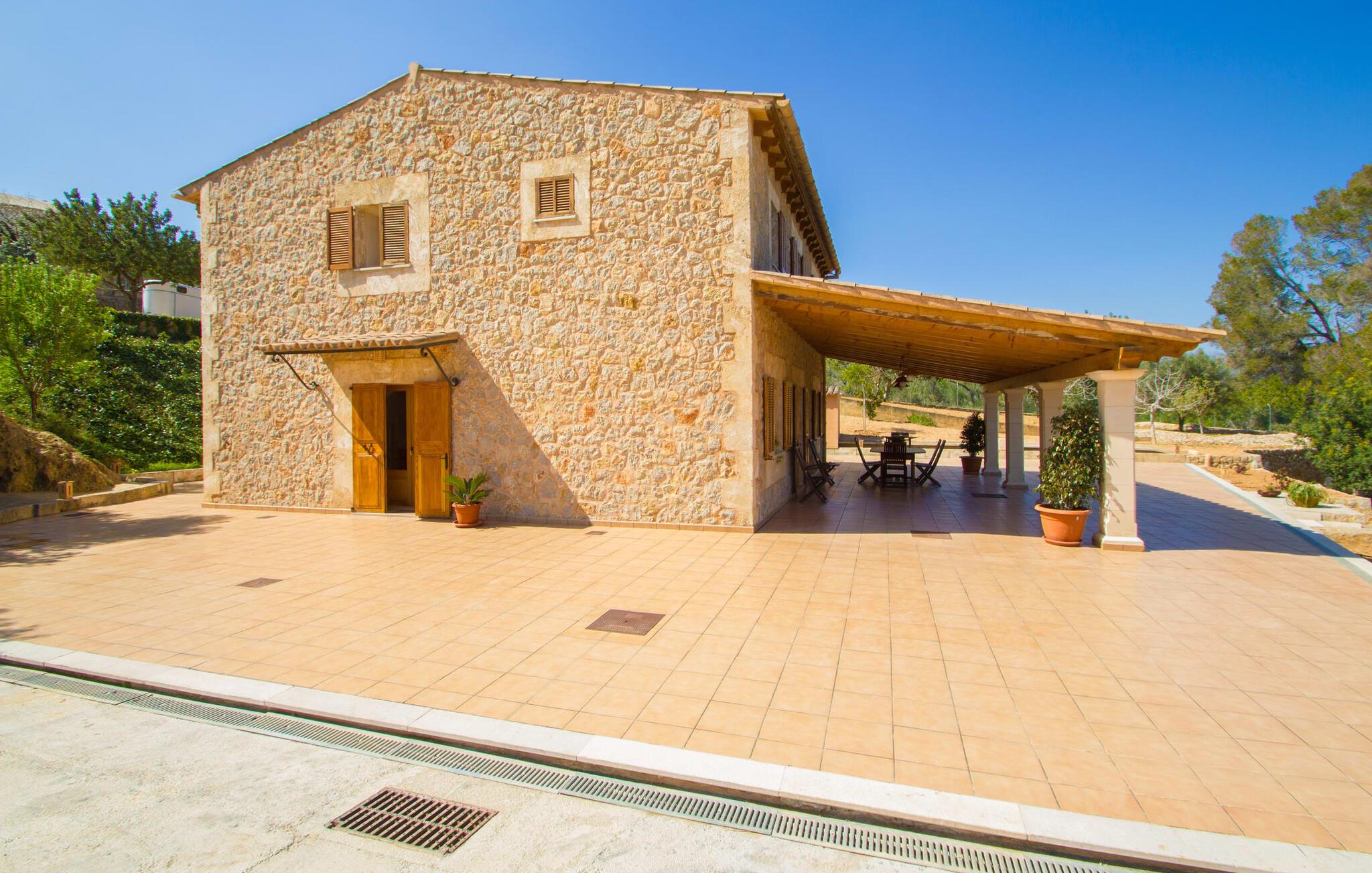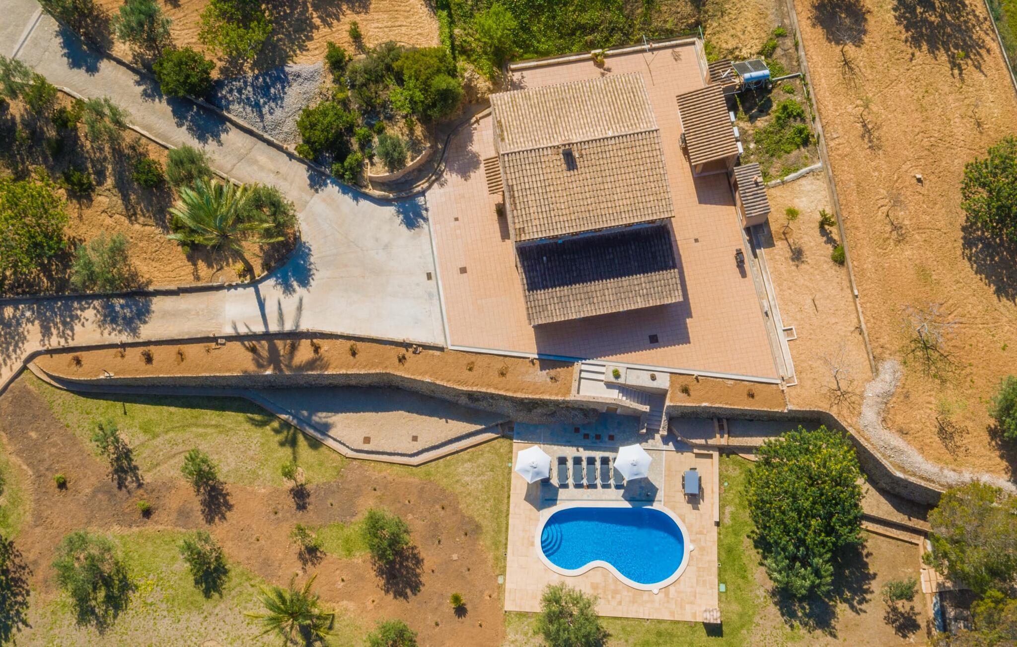 Rejsearrangører annoncerer ofte med billedet af en funklende blå pool omgivet af liggestole. Normalt skal I dele dette idylliske feriested med andre rejsende på udkig efter afslapning, hvilket i værste fald kan være forbundet med meget larm. I Villa "Can Mirlo" vil jeres dage være anderledes. I vil være omgivet af førsteklasses stil, og hvis I ønsker det, kan I nyde den flotte udsigt over det indre af Mallorca til bjergene mod nord. Poolterrassen ligger lige under huset. Et par stentrappe fører jer til vandet og den direkte tilstødende have. En bred vifte af træarter viser vejen her: Lad bare solen skinne og ellers nyd den rene tilværelse. Der er en overdækket veranda i direkte tilknytning til huset, hvor I kan afslutte dagen om aftenen med en flaske vin. Takket være et udendørs badeværelse kan I fuldt ud nyde den milde ø-luft fra morgen til aften. Husets indretning undgår trendy hype. Ejerne har valgt en rustik, klar linje uden at ofre komforten. Om aftenen kan I se tv fra sofaen eller blot kigge ind i den knitrende pejs. Dette værelse kombinerer ophold, madlavning og spisning. Derfor er det det rigtige sted for et afslappet samvær i en venlig atmosfære. Med sin arbejdsflade, der rager ud i rummet, byder køkkenet på plads nok til at tilberede selv komplicerede retter sammen. I stueetagen er der et dobbeltværelse med en dobbeltseng. Rummets naturstensvæg med en indlejret halvmåne sikrer et særligt niveau af komfort. De to andre soveværelser, det ene også med en dobbeltseng og det andet med to enkeltsenge, er på øverste etage. På denne etage kan I også være vært for socialt samvær i en åben lounge lige ved siden af trappeopgangen. Beboerne på øverste etage har også adgang til et badekar på badeværelset - et perfekt sted at afslutte dagen i en afslappet atmosfære og derefter nyde en afslappende søvn. Den statelige stenbrudsvilla "Can Mirlo" er beliggende i en vidunderlig, rustik, afsondret beliggenhed 2,5 km vest for den maleriske by Santa Maria. I bor i det indre af øen omgivet af natur. Dette giver jer adskillige udflugtsmuligheder: enten gå på shopping i det glitrende Palma, omkring 20 km væk, eller nyd de idylliske strande på sydkysten, herunder Passeig de Molinar (17 km) eller Cuidad Jardin (18 km). Bemærk venligst, at denne ejendom ikke accepterer ungdomsgrupper eller polterabender. En ungdomsgruppe på denne ejendom består af personer på 27 år eller derunder. Book ikke denne ejendom, hvis I er en ungdomsgruppe eller polterabend, da jeres reservation vil blive afvist, når den er booket, hvilket også kan være tilfældet ved ankomst til ejendommen eller under jeres ophold, og I vil ikke modtage en refusion