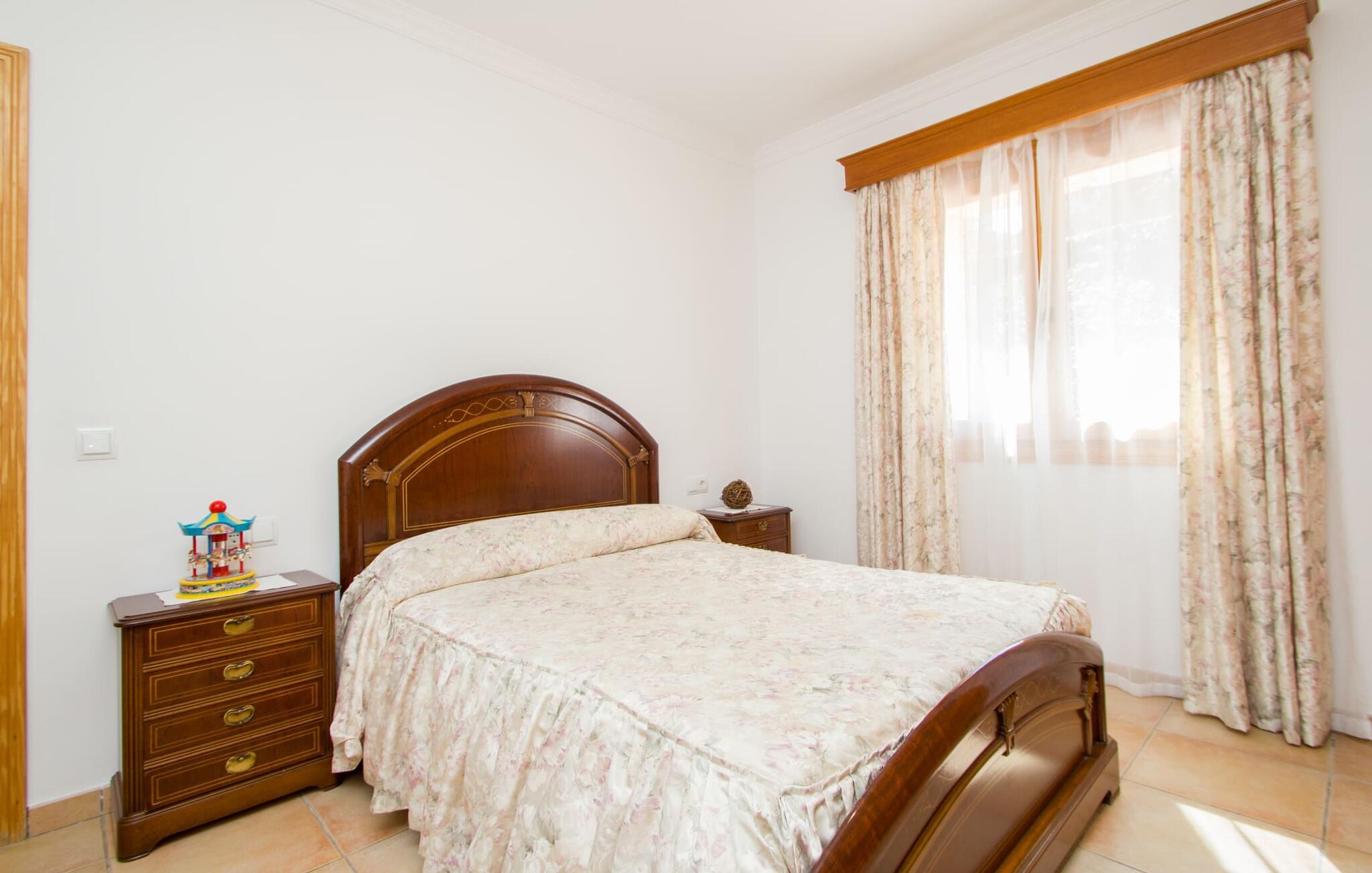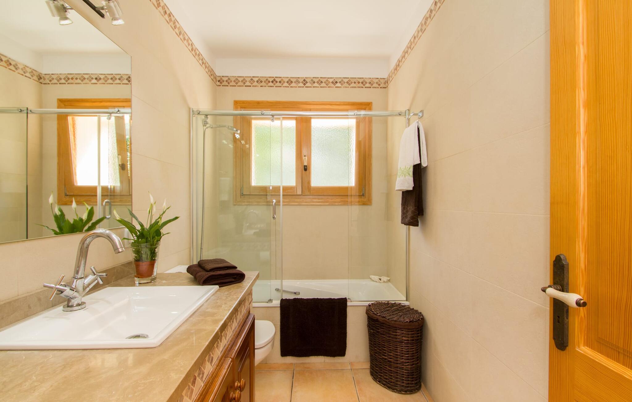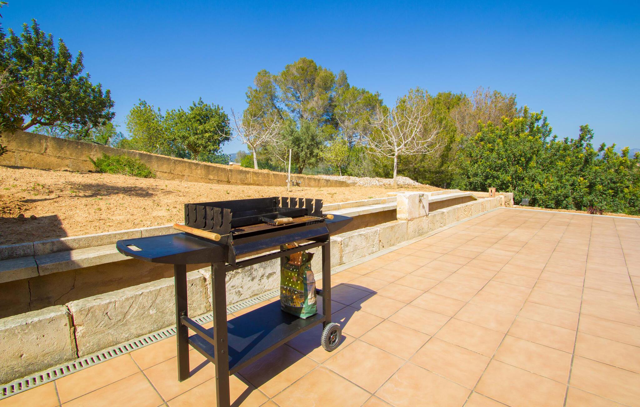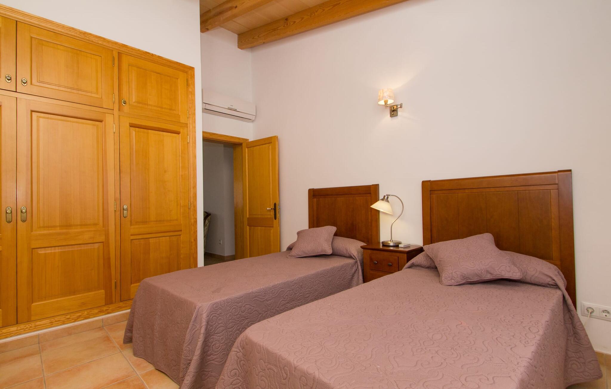Rejsearrangører annoncerer ofte med billedet af en funklende blå pool omgivet af liggestole. Normalt skal I dele dette idylliske feriested med andre rejsende på udkig efter afslapning, hvilket i værste fald kan være forbundet med meget larm. I Villa "Can Mirlo" vil jeres dage være anderledes. I vil være omgivet af førsteklasses stil, og hvis I ønsker det, kan I nyde den flotte udsigt over det indre af Mallorca til bjergene mod nord. Poolterrassen ligger lige under huset. Et par stentrappe fører jer til vandet og den direkte tilstødende have. En bred vifte af træarter viser vejen her: Lad bare solen skinne og ellers nyd den rene tilværelse. Der er en overdækket veranda i direkte tilknytning til huset, hvor I kan afslutte dagen om aftenen med en flaske vin. Takket være et udendørs badeværelse kan I fuldt ud nyde den milde ø-luft fra morgen til aften. Husets indretning undgår trendy hype. Ejerne har valgt en rustik, klar linje uden at ofre komforten. Om aftenen kan I se tv fra sofaen eller blot kigge ind i den knitrende pejs. Dette værelse kombinerer ophold, madlavning og spisning. Derfor er det det rigtige sted for et afslappet samvær i en venlig atmosfære. Med sin arbejdsflade, der rager ud i rummet, byder køkkenet på plads nok til at tilberede selv komplicerede retter sammen. I stueetagen er der et dobbeltværelse med en dobbeltseng. Rummets naturstensvæg med en indlejret halvmåne sikrer et særligt niveau af komfort. De to andre soveværelser, det ene også med en dobbeltseng og det andet med to enkeltsenge, er på øverste etage. På denne etage kan I også være vært for socialt samvær i en åben lounge lige ved siden af trappeopgangen. Beboerne på øverste etage har også adgang til et badekar på badeværelset - et perfekt sted at afslutte dagen i en afslappet atmosfære og derefter nyde en afslappende søvn. Den statelige stenbrudsvilla "Can Mirlo" er beliggende i en vidunderlig, rustik, afsondret beliggenhed 2,5 km vest for den maleriske by Santa Maria. I bor i det indre af øen omgivet af natur. Dette giver jer adskillige udflugtsmuligheder: enten gå på shopping i det glitrende Palma, omkring 20 km væk, eller nyd de idylliske strande på sydkysten, herunder Passeig de Molinar (17 km) eller Cuidad Jardin (18 km). Bemærk venligst, at denne ejendom ikke accepterer ungdomsgrupper eller polterabender. En ungdomsgruppe på denne ejendom består af personer på 27 år eller derunder. Book ikke denne ejendom, hvis I er en ungdomsgruppe eller polterabend, da jeres reservation vil blive afvist, når den er booket, hvilket også kan være tilfældet ved ankomst til ejendommen eller under jeres ophold, og I vil ikke modtage en refusion