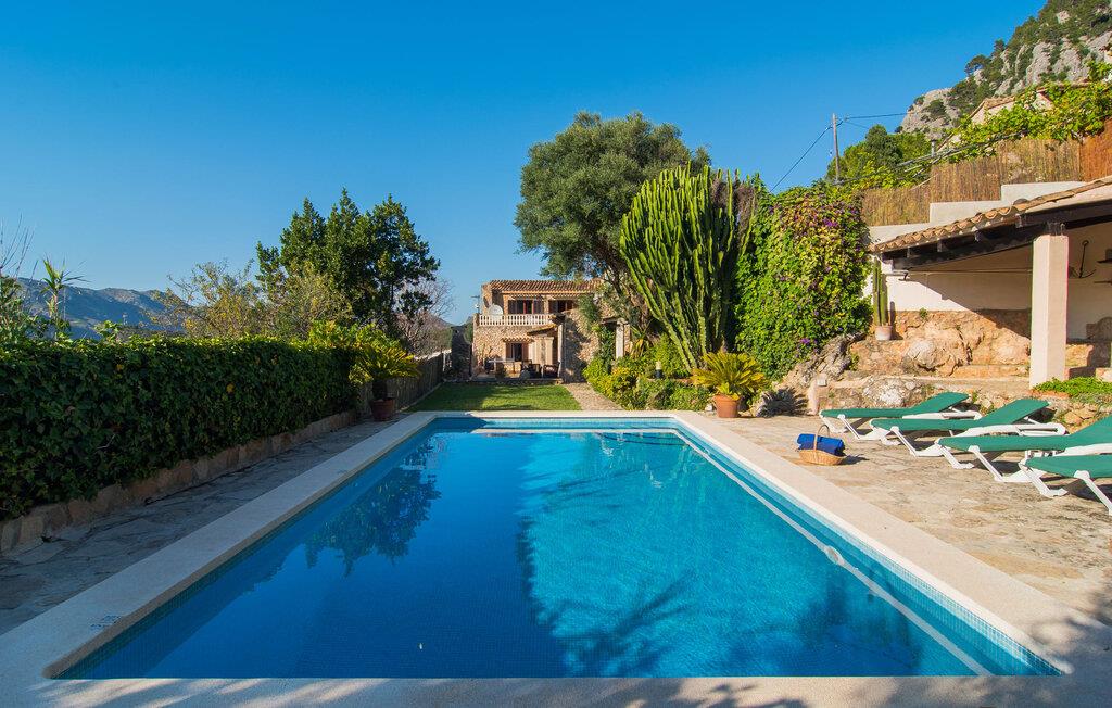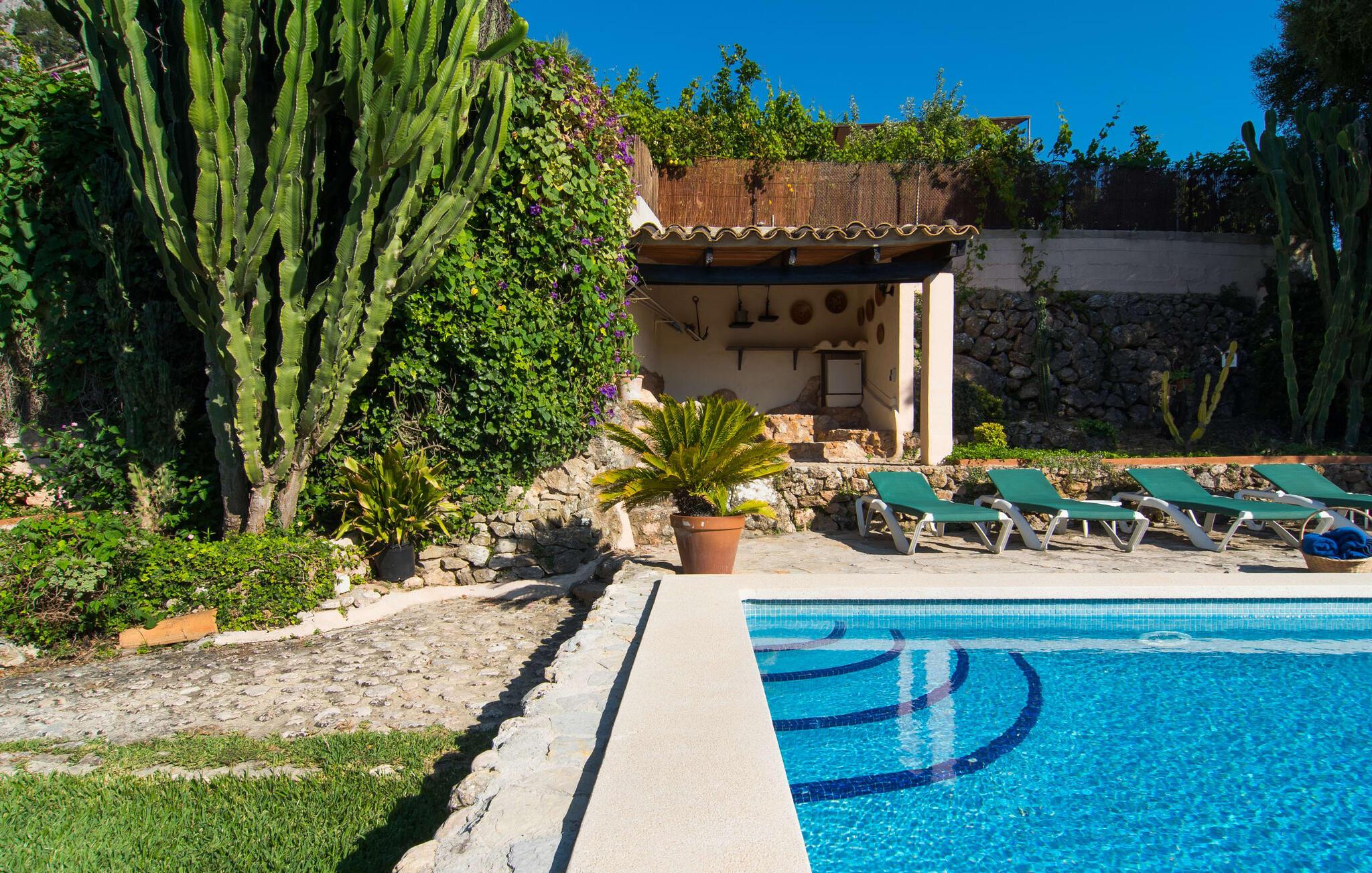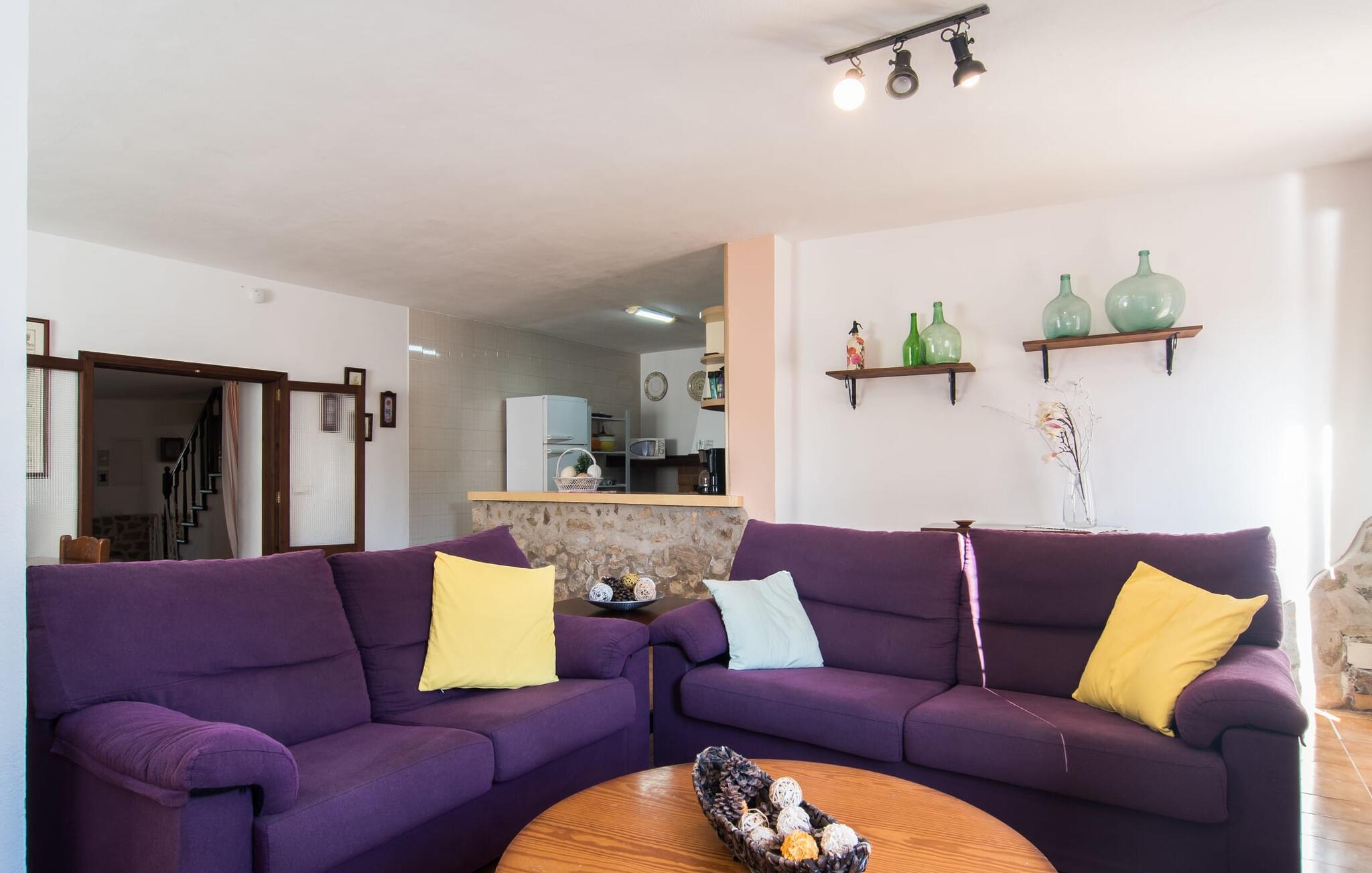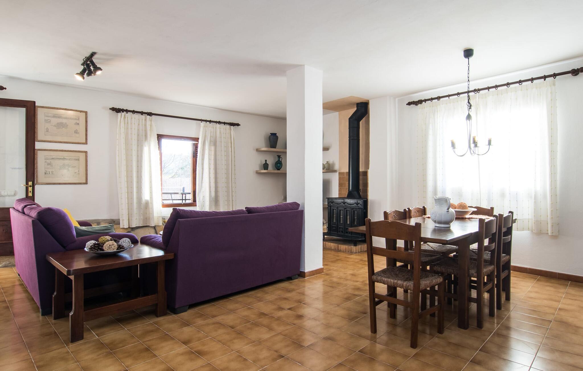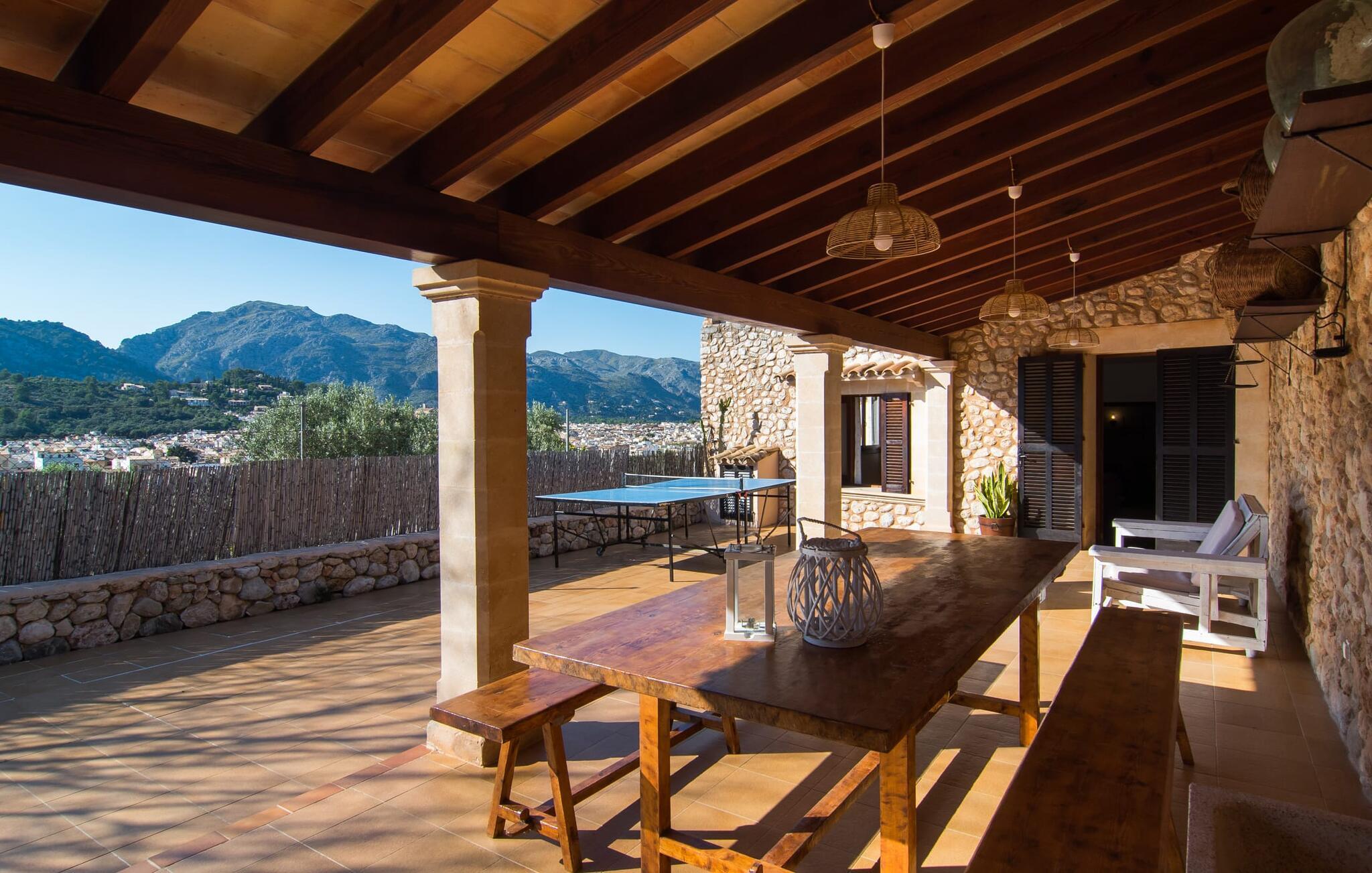 Omgivet af frodig middelhavsflora skinner villaen "Can Moragues" på en yderst charmerende måde med sine kontrasterende naturtoner og byder den nytilkomne velkommen. Udendørsområdet byder på smukke små stier, områder, trapper og stengærder langs frodige græsplæner og blomsterbede. En romantisk pergola, foret til venstre og højre med søjler og en lav mur, fører til hovedindgangen til huset. Udeområdets hjerte er den 32 m², let forhøjede swimmingpool, som er flisebelagt med dekorative blå mosaiksten og er meget let tilgængelig via en bred trappe. I kan slappe af af hjertens lyst på i alt fem komfortable liggestole under den dybblå middelhavshimmel og bare slappe af. En overdækket terrasse, tilgængelig via få trin, giver mulighed for at blive hængende i den luftige skygge, mens I nyder den vidunderlige udsigt over Pollença fra et lidt lavere niveau. Afhængigt af tidspunktet på dagen finder I også skøn naturlig skygge ved poolen. Tættere på huset når man den alsidige terrasse, som er halvt åben og halvt overdækket. I den sidste del er der i det væsentlige en udendørs stue, hvori der er en hyggelig siddegruppe med polyrattan møbler på den ene side og lige ved siden af et solidt spisebord til fællesspisning. Den nærliggende murede grill og udendørs vandforsyning giver jer mulighed for at tilberede og tilberede måltider udendørs, hvis I ønsker det. Husvæggen i natursten skaber i kombination med de smukke fliser og træbjælkeloftet en særlig behagelig stemning i dette område. Den udendørs terrasse tilbyder et sted at solbade, og der er endda et bordtennisbord. Dette giver sportsinteresserede mulighed for at blive aktive. Inde i villaen præsenteres den besøgende for en stor åben stue/spisestue med et tilstødende køkken, løst adskilt af en disk. Et hyggeligt sofahjørne inviterer jer til at slappe af og slappe af. Her kan I roligt læse en god bog eller blive underholdt af en film, da fjernsynet også er bekvemt placeret her. Spisebordet lige ved siden af er ideelt til sofistikeret indendørs spisning. Der er ingen lange rejser, fordi køkkenet ligger lige ved siden af. Her finder I alle de moderne faciliteter I har brug for til hverdagsbrug, herunder en kedel og en filterkaffemaskine. Det giver endda plads til et ekstra lille spisebord. Et andet ret rummeligt fællesrum med siddepladser giver mulighed for at trække sig tilbage og finde et privat sted, selv når man rejser med en større gruppe. Medfølgende børn vil helt sikkert nyde at lege her. Fire komfortabelt møblerede værelser med aircondition tilbyder en vidunderlig ramme for en afslappende søvn. Badeværelserne er venlige og funktionelt indrettede. Et strygejern og en hårtørrer er også tilgængelige i huset, så I behøver ikke at tage dem med. Den attraktive beliggenhed af denne villa kan være landlig, men havet er kun et par minutters kørsel væk. Sandstrandene omkring Port Pollença er fremragende og har en lavvandet indgang til vandet. Port de Pollença byder på en smuk promenade langs stranden og havnen med butikker, barer og restauranter. Kunne I tænke jer at tilbringe aftenen et andet sted end den smukke villa, finder I her et absolut seværdigt alternativ. Villaen "Can Moragues" er beliggende i en smuk bjergskråning i udkanten af Pollença. Det ligger på en frodig, grøn ejendom og er indrettet med stor sans for detaljer. Port de Pollença ligger 9 km derfra. Denne lille kystby imponerer med sin smukke promenade, som indbyder til at slentre og besøge de talrige caféer. Sandstrandene kan nås fra feriehuset på ingen tid. Bemærk venligst, at denne ejendom ikke accepterer ungdomsgrupper eller polterabender. En ungdomsgruppe på denne ejendom består af personer på 25 år eller derunder. Book ikke denne ejendom, hvis I er en ungdomsgruppe eller polterabend, da jeres reservation vil blive afvist, når den er booket, hvilket også kan være tilfældet ved ankomst til ejendommen eller under jeres ophold, og I vil ikke modtage en refusion