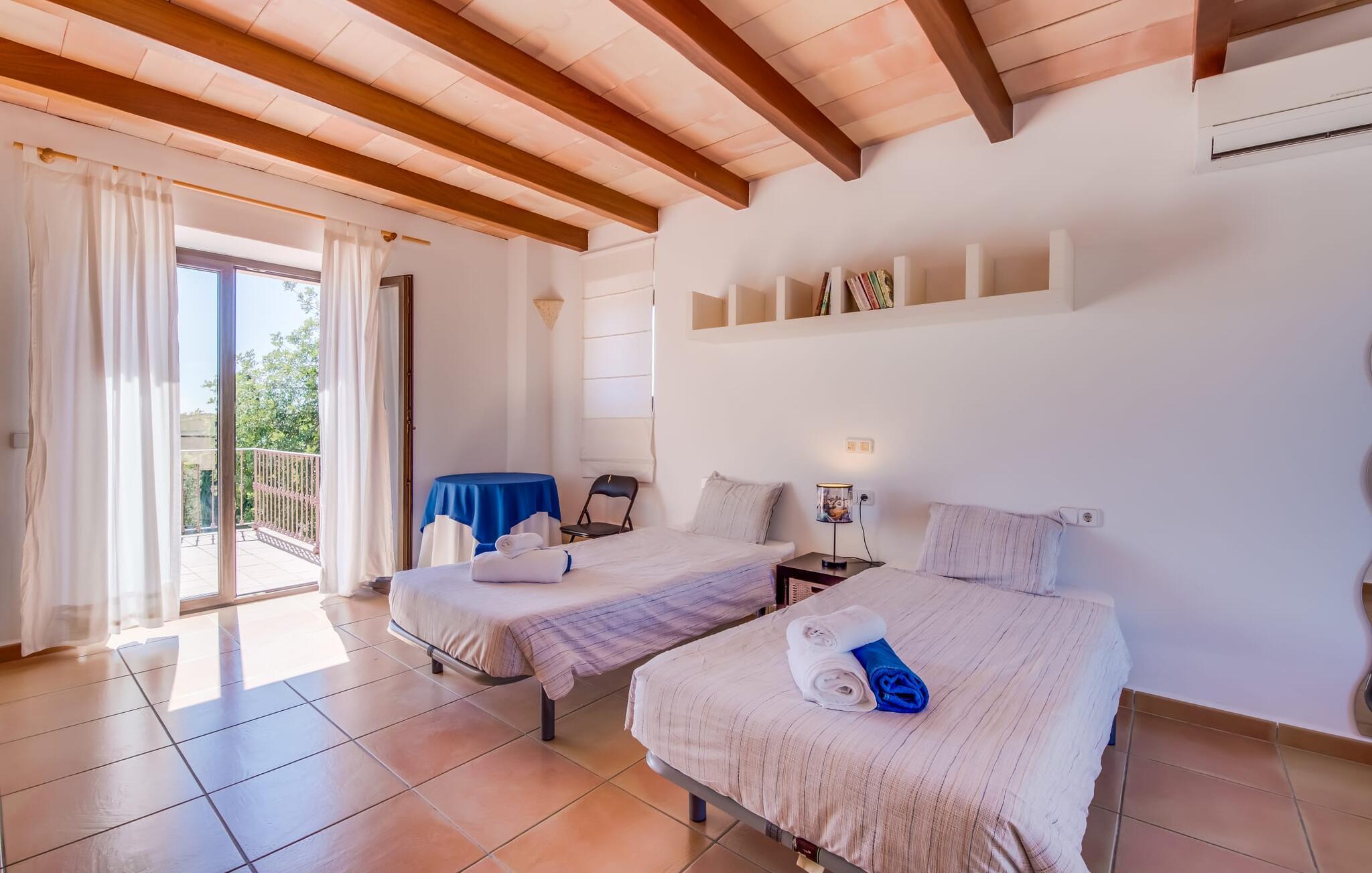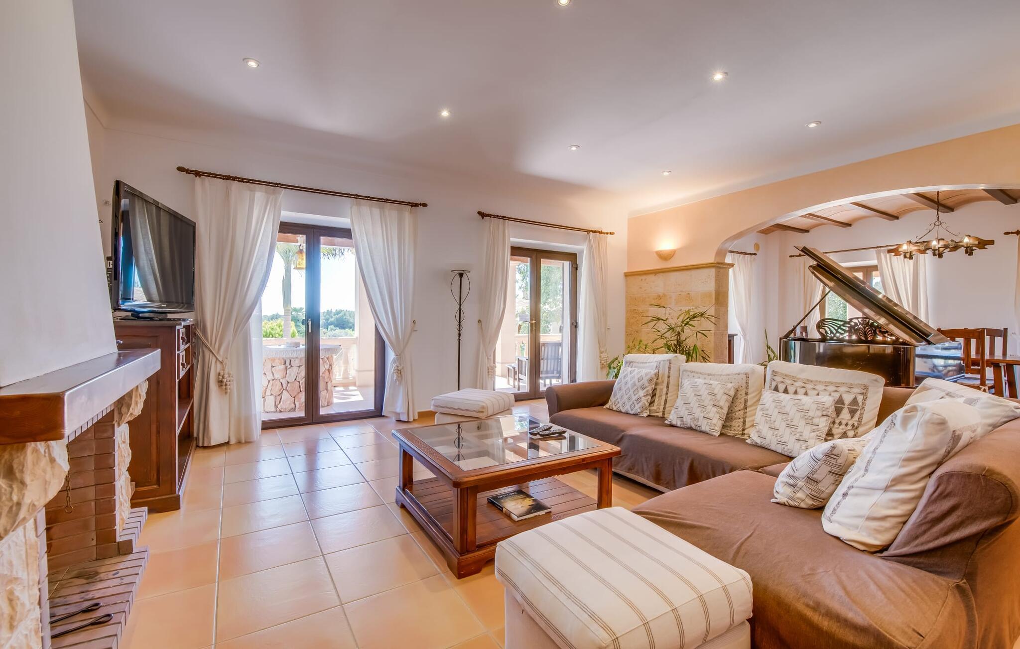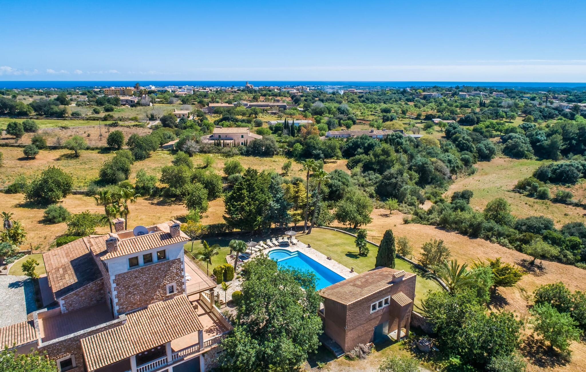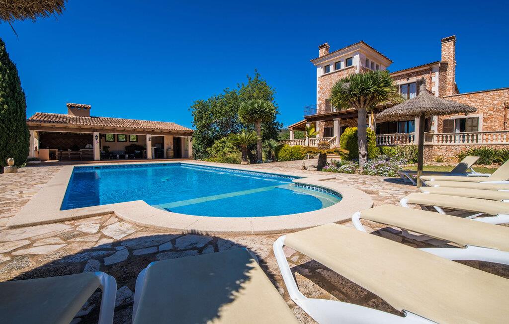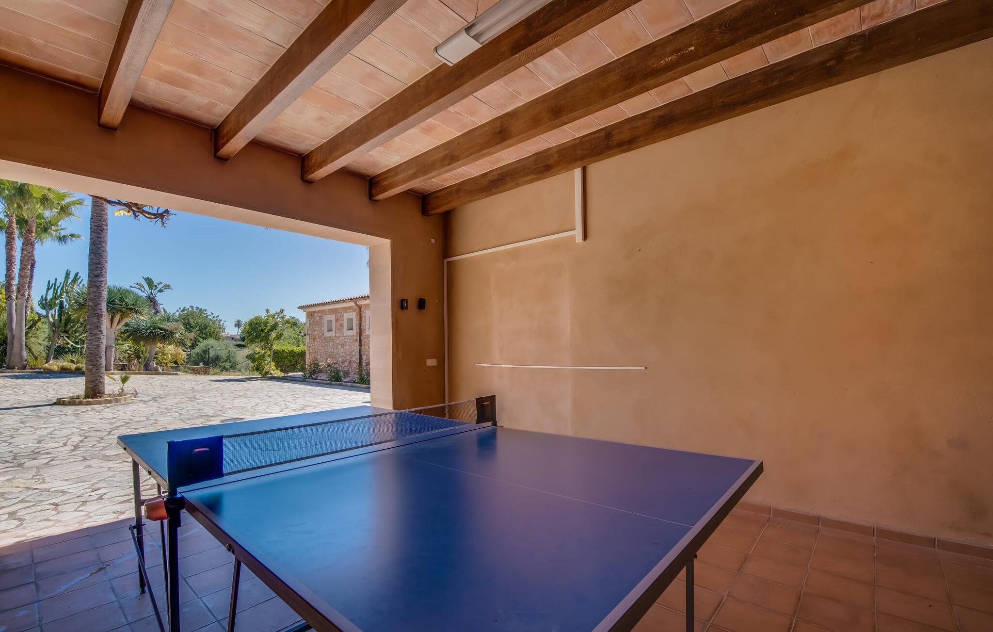 "Villa Can Palleta Nou" er et fantastisk naturstenshus med et imponerende tårn og store terrasseområder, der tilbyder både solrige og skyggefulde steder med udsigt over haven. Slap af ved den store pool på den brolagte terrasse under en parasol eller nyd jeres måltider i det udendørs køkken med spisebord og komfortabelt siddeområde, mens I ser på det smukke grønne område. Den let skrånende pool er ideel til børn, som også har plads nok til at lege på græsplænen eller nyde et spil bordtennis. Denne rummelige villa har et varmt og indbydende interiør domineret af brunt træ og naturlige toner. I stueplan er der et veludstyret køkken, som løber ud i en mindre spiseplads med en charmerende muret pejs. En større spisestue har en stor lysekrone og et slående sort klaver. Stuen byder på en behagelig sofa til afslappende aftener ved pejsen eller foran fjernsynet. Stueetagen har tre soveværelser og fire moderne badeværelser, mens der ovenpå er yderligere to soveværelser og et badeværelse, hvoraf det ene har jacuzzi til ultimativ afslapning efter træning i fitnesscenteret i tårnrummet. Villaen “Can Palleta Nou” nær S'Horta, i den smukke sydlige del af øen, ligger ca. 1 km fra den idylliske landsby Calonge med butikker og restauranter. Den lille by S'Horta med dens supermarkeder, en café og den imponerende kirke Esglesia Sant Isidre ligger 2,6 km derfra. Den nærmeste strand ligger kun ca. 5 km væk. Aircondition i ejendommen er inkluderet i prisen, men dets brug er begrænset til kl. 21.00 til 07.00. Gebyret afregnes herefter kontant på stedet.