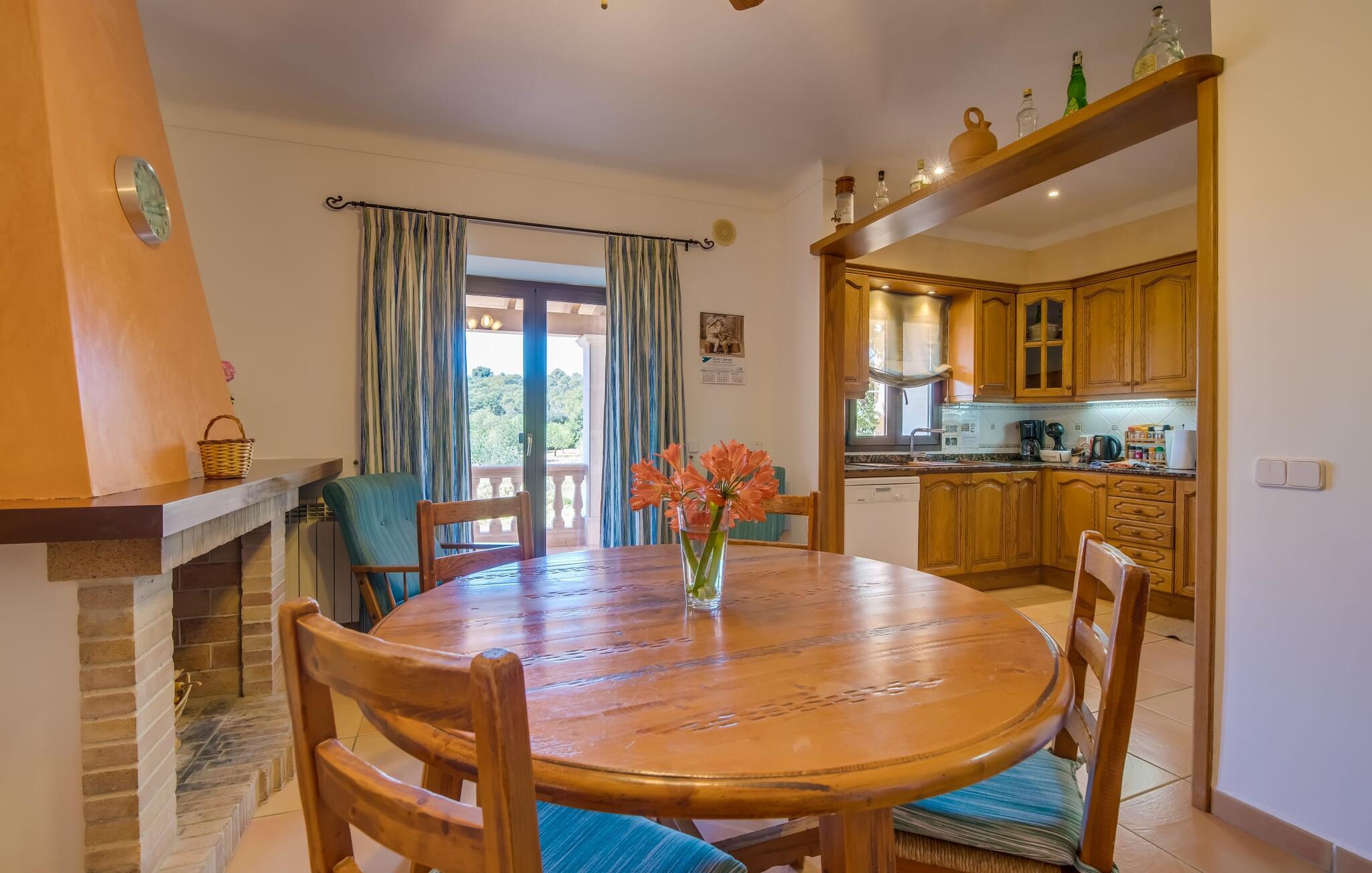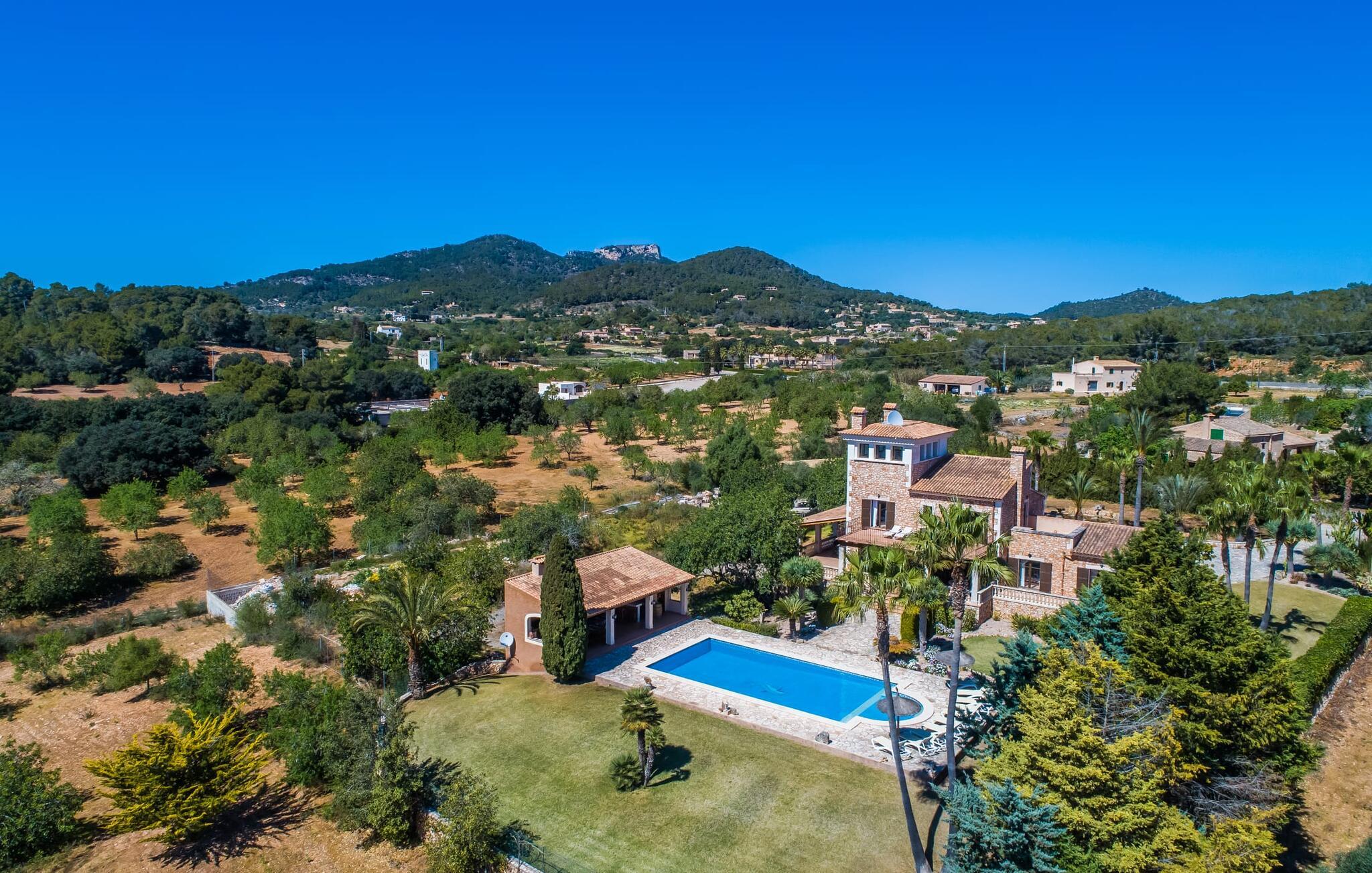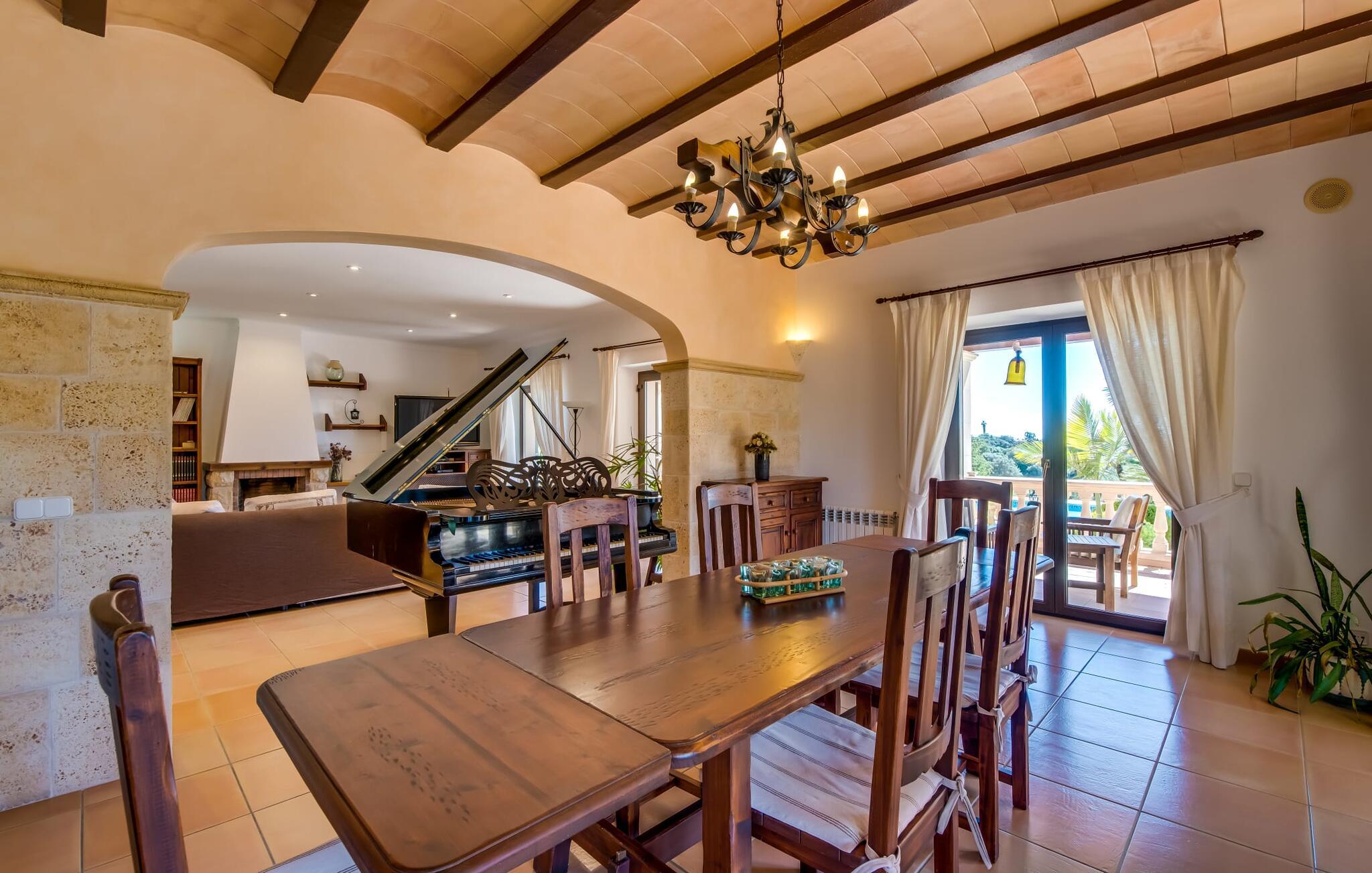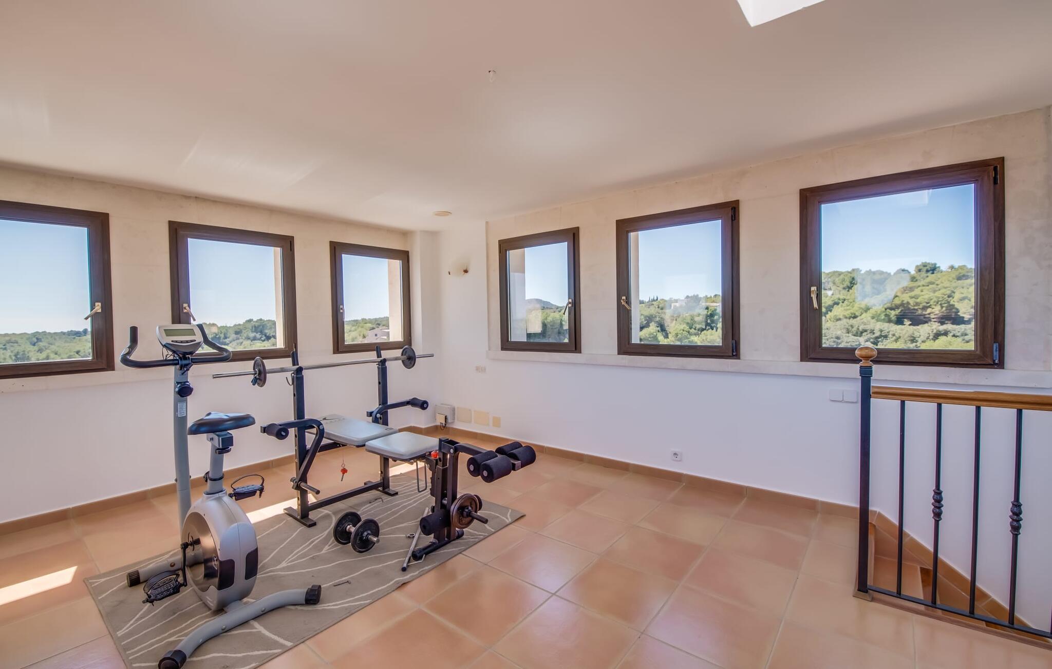 "Villa Can Palleta Nou" er et fantastisk naturstenshus med et imponerende tårn og store terrasseområder, der tilbyder både solrige og skyggefulde steder med udsigt over haven. Slap af ved den store pool på den brolagte terrasse under en parasol eller nyd jeres måltider i det udendørs køkken med spisebord og komfortabelt siddeområde, mens I ser på det smukke grønne område. Den let skrånende pool er ideel til børn, som også har plads nok til at lege på græsplænen eller nyde et spil bordtennis. Denne rummelige villa har et varmt og indbydende interiør domineret af brunt træ og naturlige toner. I stueplan er der et veludstyret køkken, som løber ud i en mindre spiseplads med en charmerende muret pejs. En større spisestue har en stor lysekrone og et slående sort klaver. Stuen byder på en behagelig sofa til afslappende aftener ved pejsen eller foran fjernsynet. Stueetagen har tre soveværelser og fire moderne badeværelser, mens der ovenpå er yderligere to soveværelser og et badeværelse, hvoraf det ene har jacuzzi til ultimativ afslapning efter træning i fitnesscenteret i tårnrummet. Villaen “Can Palleta Nou” nær S'Horta, i den smukke sydlige del af øen, ligger ca. 1 km fra den idylliske landsby Calonge med butikker og restauranter. Den lille by S'Horta med dens supermarkeder, en café og den imponerende kirke Esglesia Sant Isidre ligger 2,6 km derfra. Den nærmeste strand ligger kun ca. 5 km væk. Aircondition i ejendommen er inkluderet i prisen, men dets brug er begrænset til kl. 21.00 til 07.00. Gebyret afregnes herefter kontant på stedet.